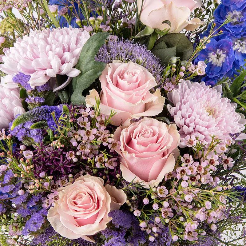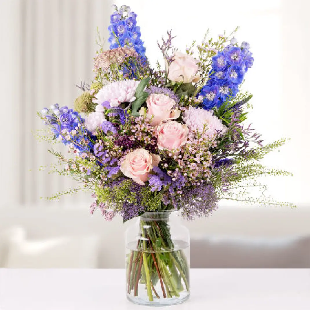 An exclusive, unique arrangement designed especially with surprises in mind. The intense blue larkspurs are proudly captivating, and are sure to turn heads. Also called Delphinium, this plant gained its name thanks to its dolphin-shaped flowers, which make it a truly exotic and greatly coveted bloom. The fine stems of the purple limonium add a delicate and slightly wild touch, while elegant roses and anastasias give the arrangement an uplifting accent, bringing a magical sensation of balance.