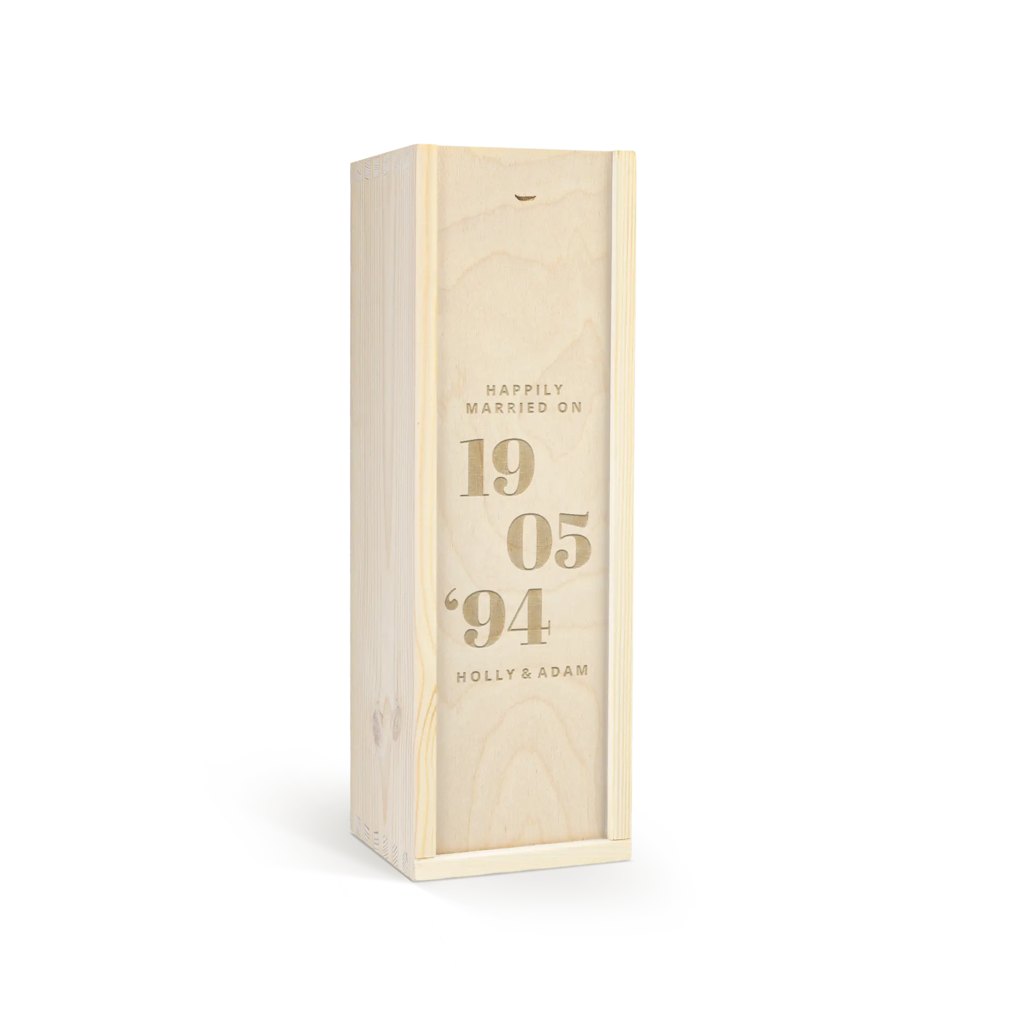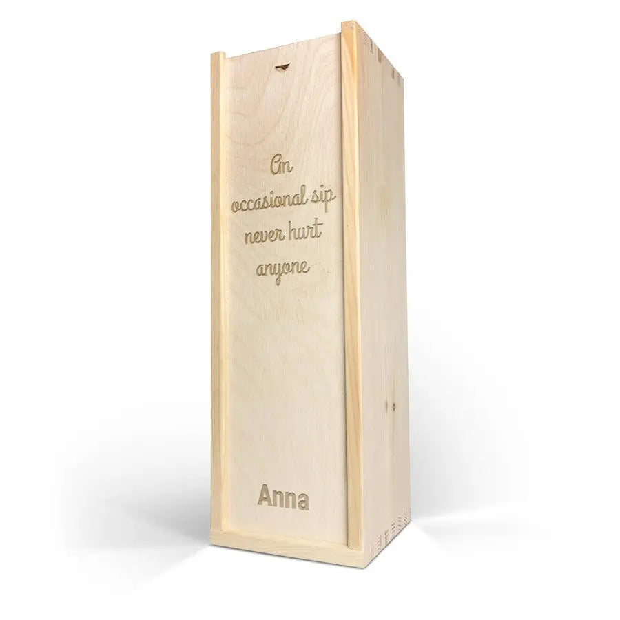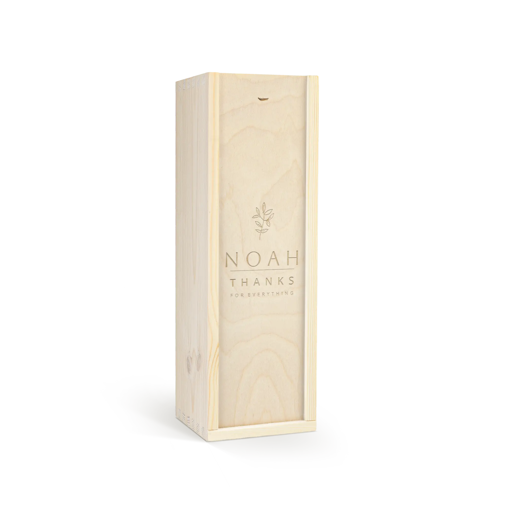 Delicious Maison de la Surprise wine in deluxe wooden case featuring the name and/or text of your choice. Create yours now!More information on the deluxe wooden case:Personalisation: with name and/or textPersonalisation placement: on wooden case lidPersonalisation method: high-quality laser-engravingCase dimensions: 36.5 x 12 x 11 cmLid dimensions: 35.6 x 10.2 x 0.3 cmAdditional information: the deluxe wooden case is made with FSC-certified woodMore information on the wine:Brand: Maison de la SurpriseType: whiteContents: 750 mlCountry of origin: FranceGrape: ChardonnayCharacter: Maison de la Surprise Chardonnay has notes of jasmine, white peach and citrus. Pairs well with salads and seafood.