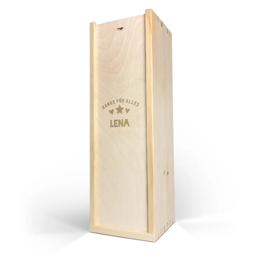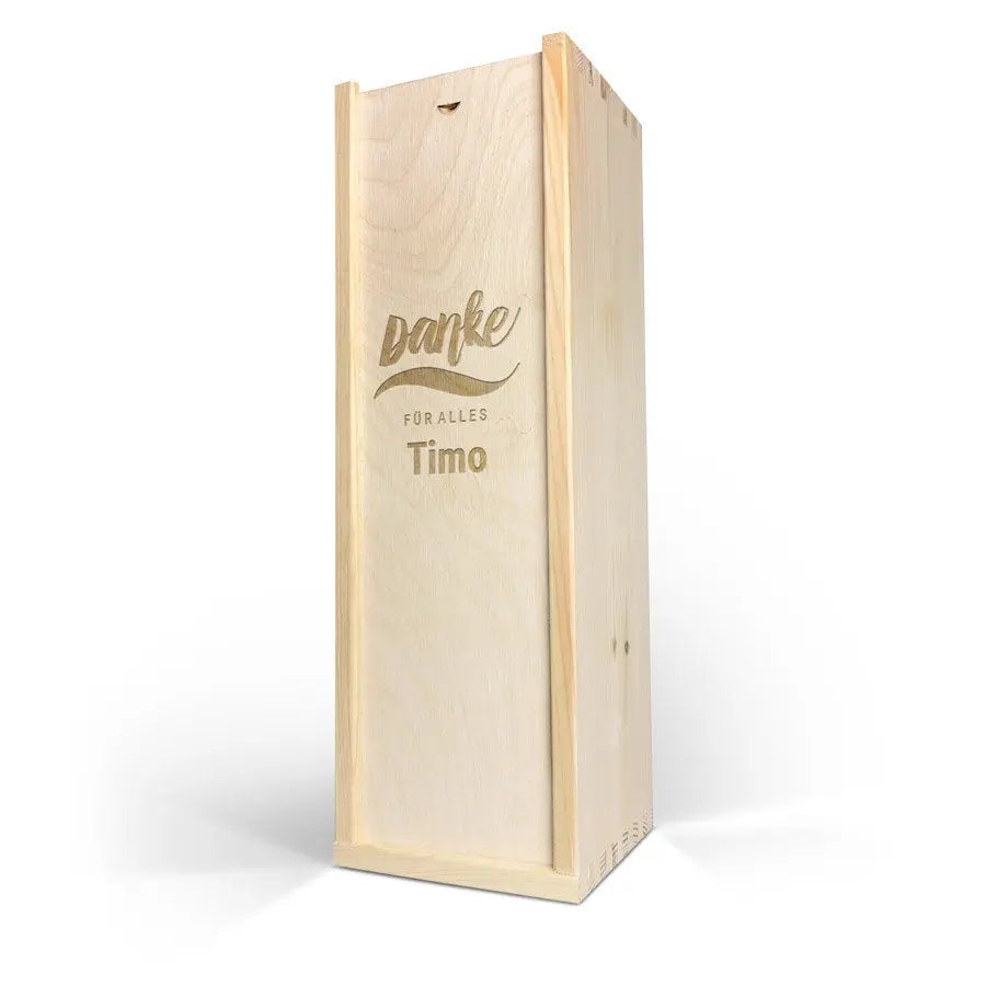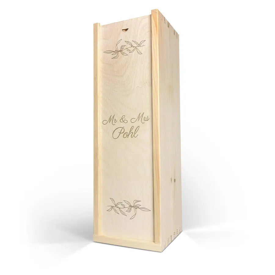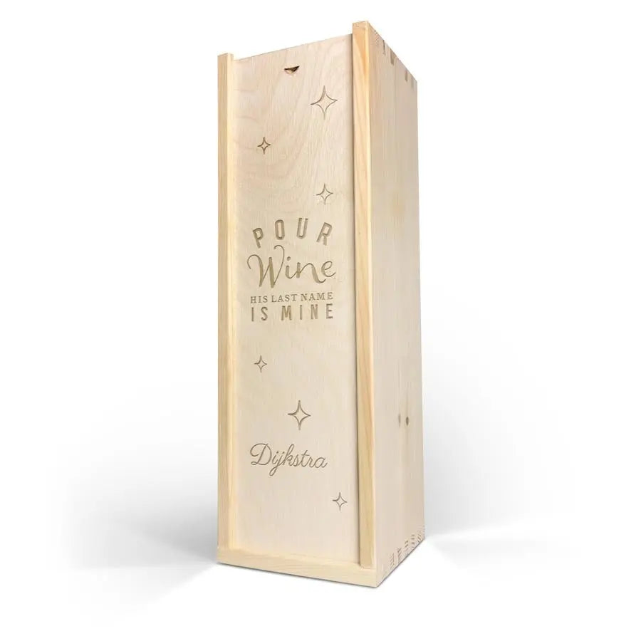 Delicious Maison de la Surprise wine in deluxe wooden case featuring the name and/or text of your choice. Create yours now!More information on the deluxe wooden case:Personalisation: with name and/or textPersonalisation placement: on wooden case lidPersonalisation method: high-quality laser-engravingCase dimensions: 36.5 x 12 x 11 cmLid dimensions: 35.6 x 10.2 x 0.3 cmAdditional information: the deluxe wooden case is made with FSC-certified woodMore information on the wine:Brand: Maison de la SurpriseType: whiteContents: 750 mlCountry of origin: FranceGrape: ChardonnayCharacter: Maison de la Surprise Chardonnay has notes of jasmine, white peach and citrus. Pairs well with salads and seafood.