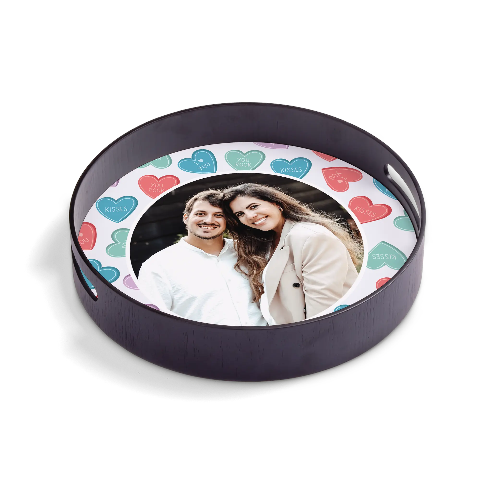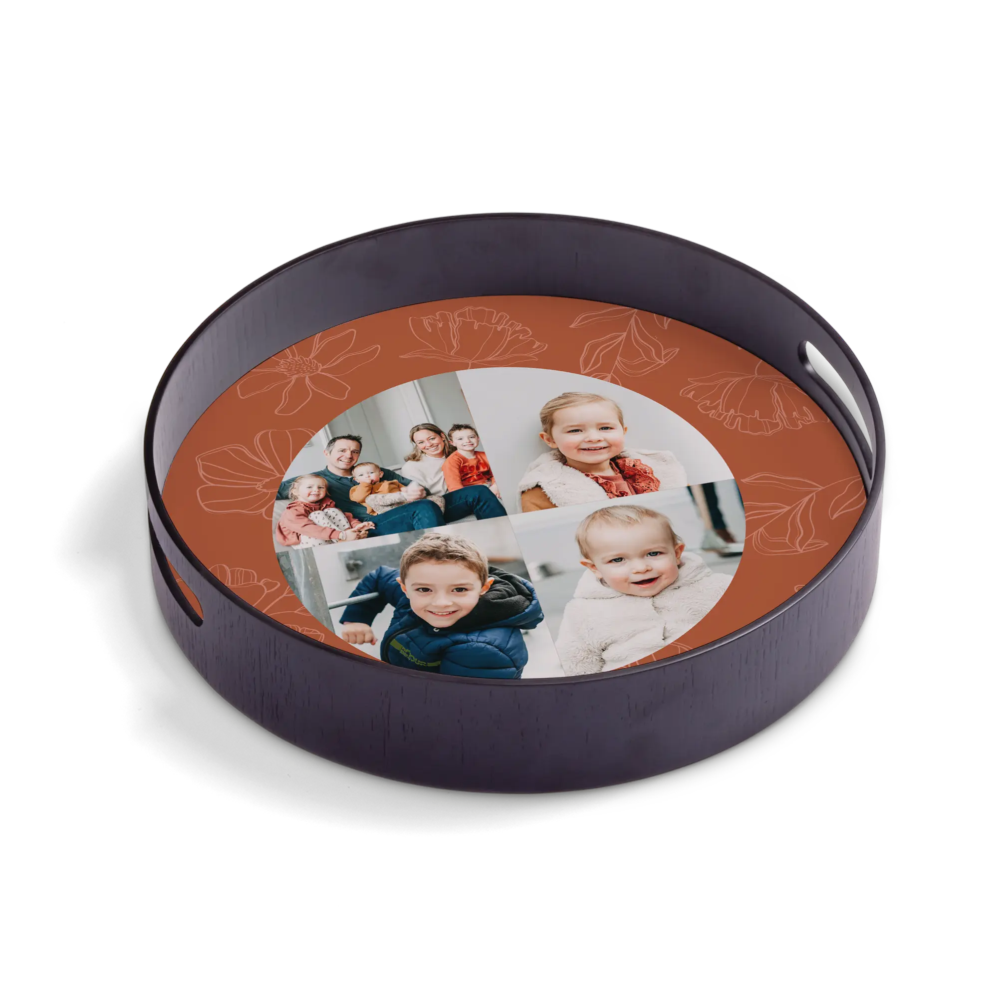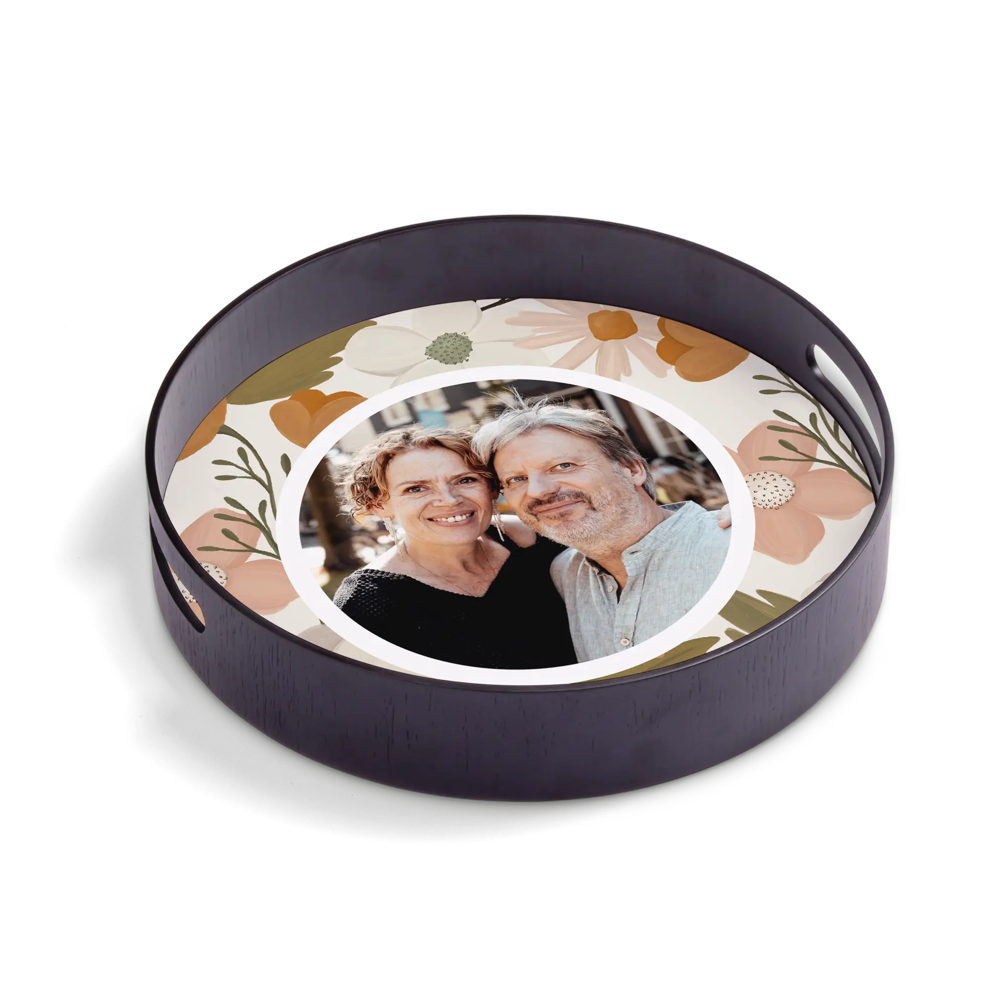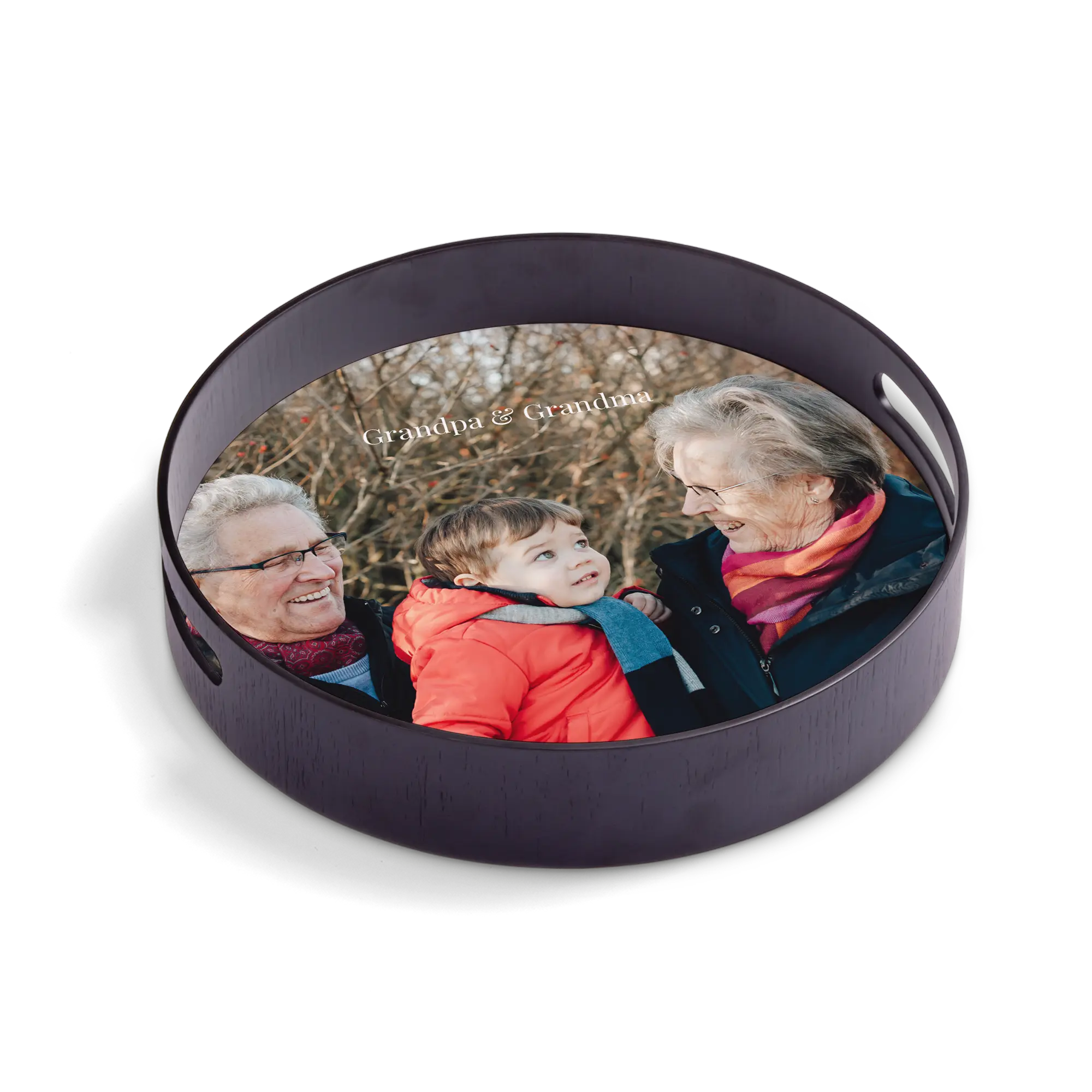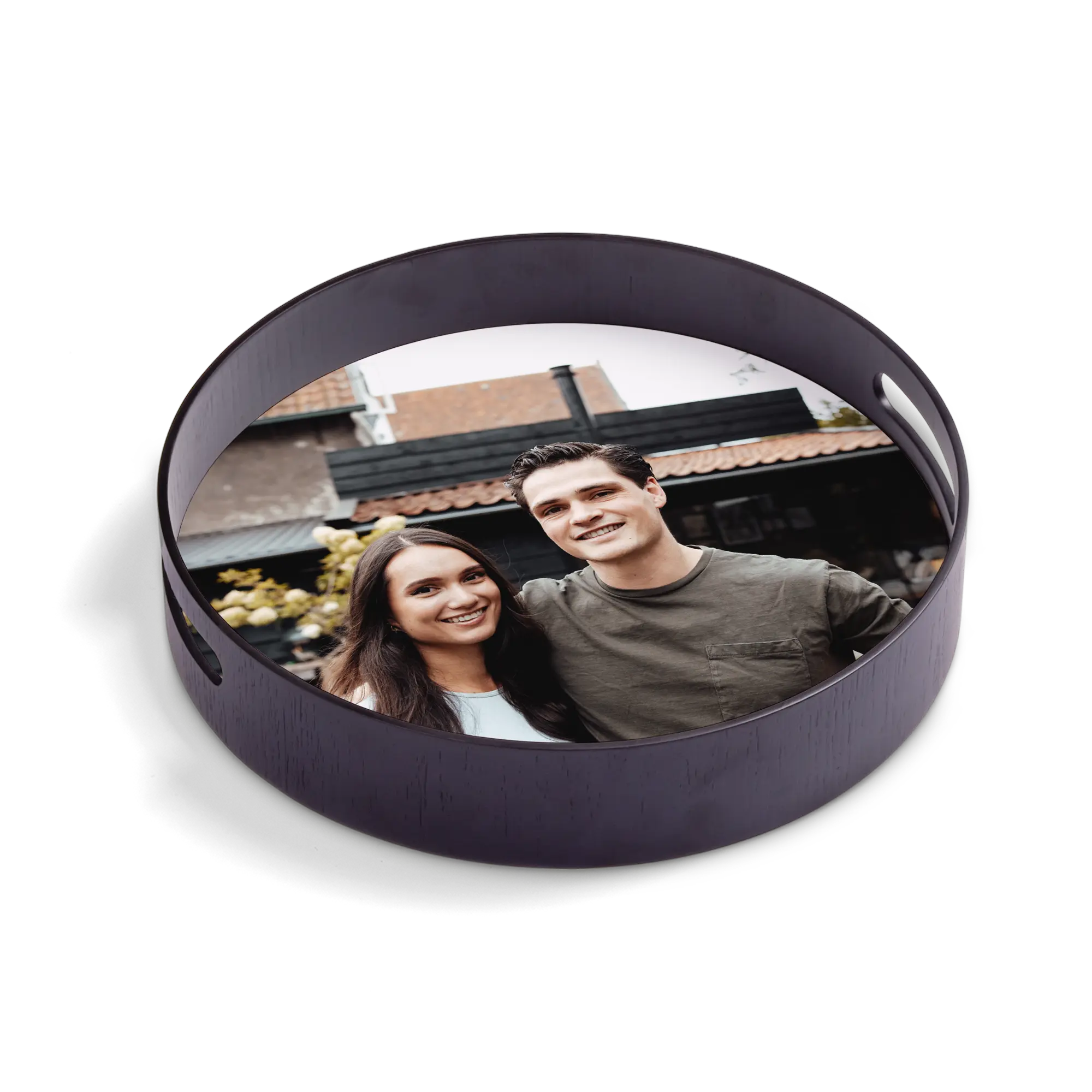 Deluxe wooden frame with a personalised high-quality hardboard base featuring the photo, name, logo and/or text of your choice!More information on the personalised serving tray:Shape: roundColour: blackMaterial: deluxe wooden frame (pine wood) with high-quality hardboard baseFinish: glossyDimensions: 30 x 30 x 5 cmPersonalisation: with photo, name, logo or collagePrint: picture-perfect and in full colour