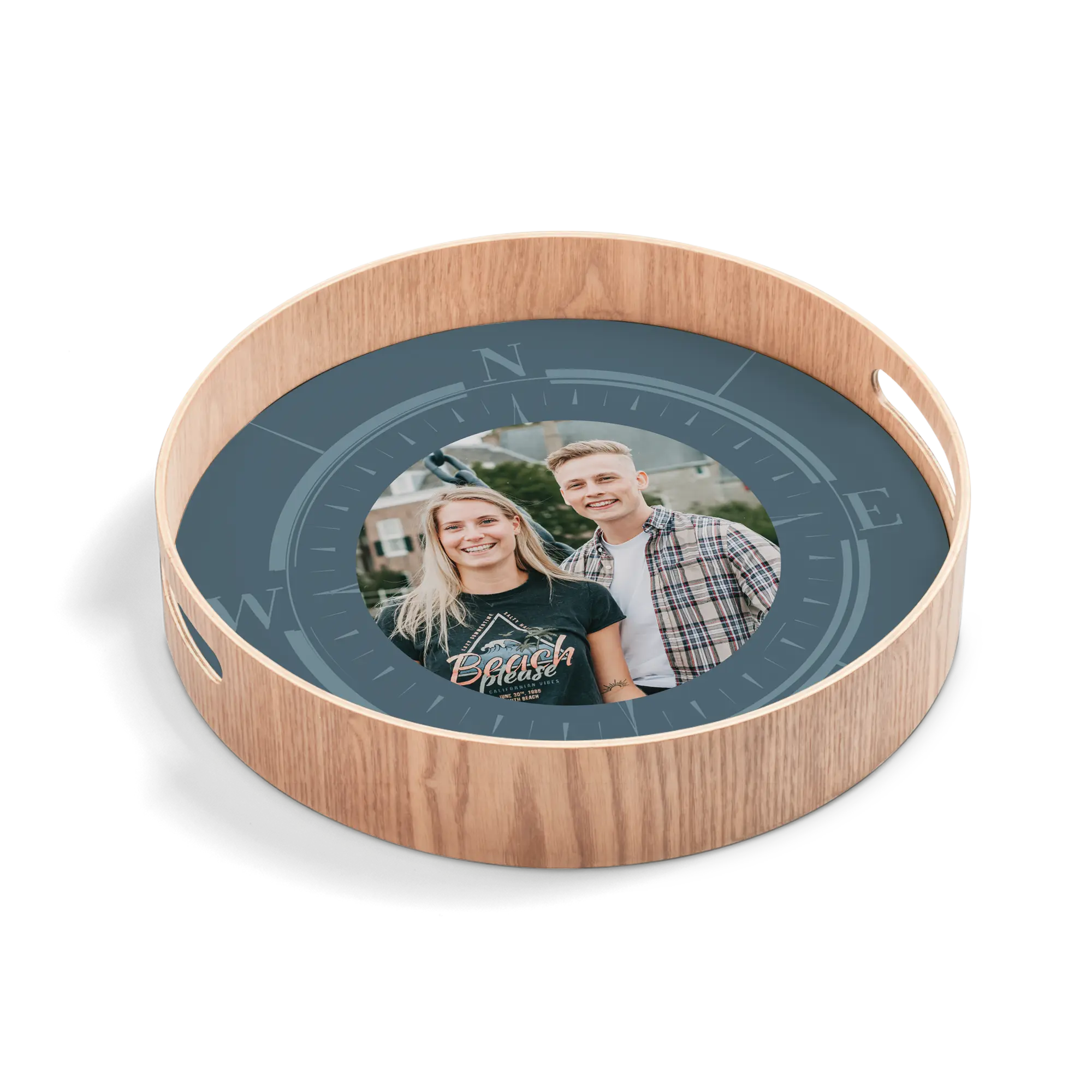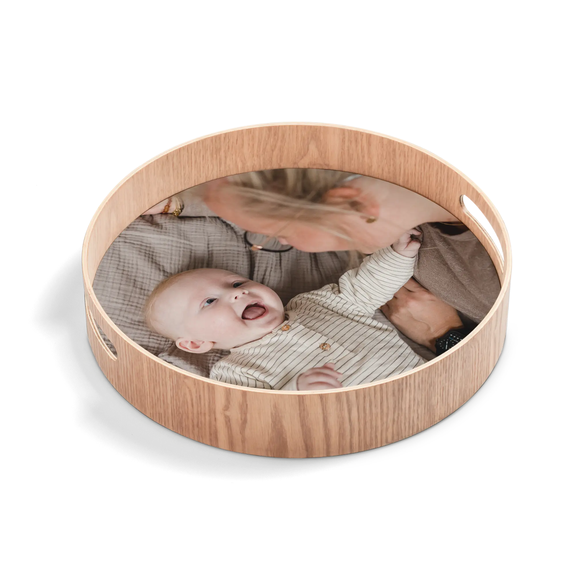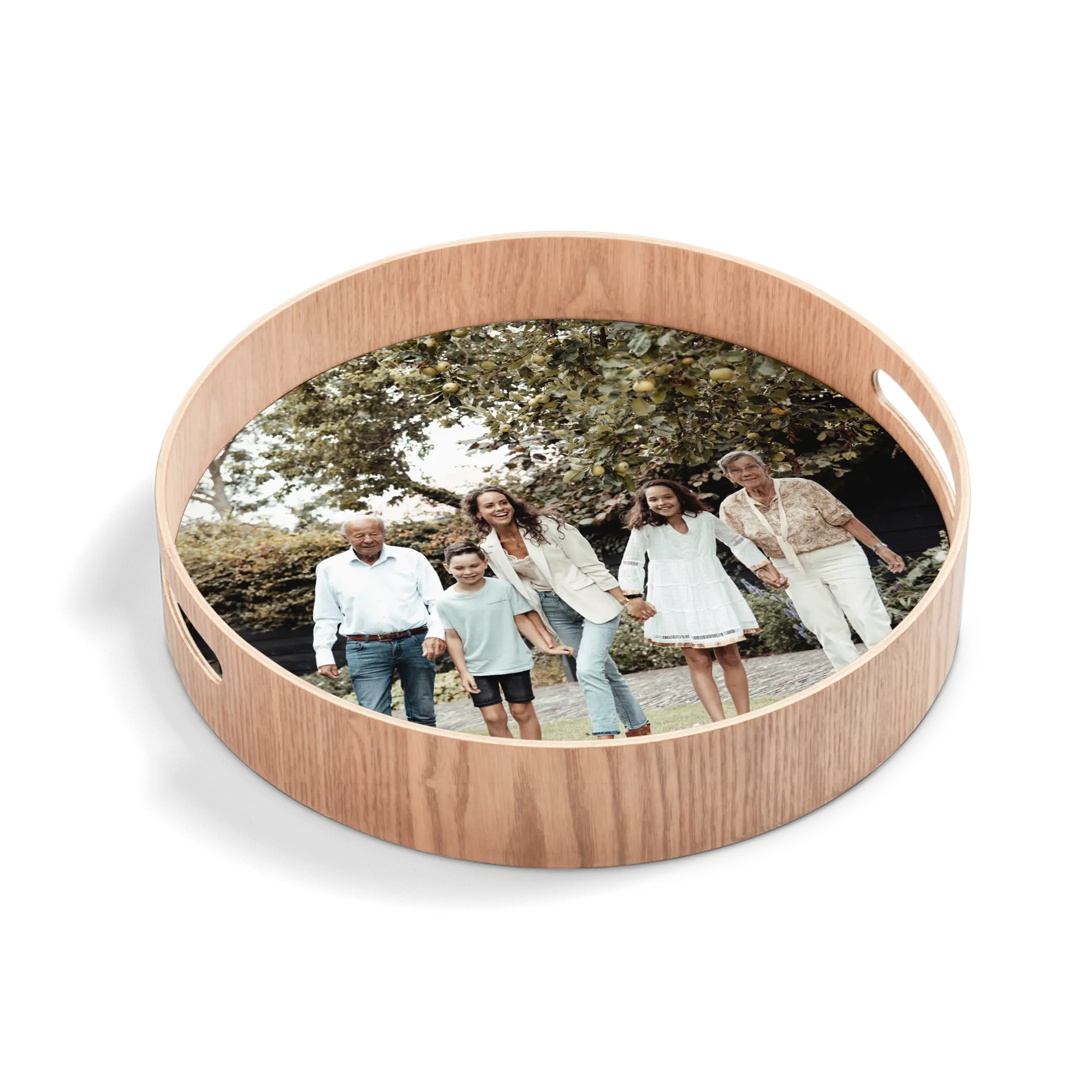 Deluxe wooden frame with a personalised high-quality hardboard base featuring the photo, name, logo and/or text of your choice!More information on the personalised serving tray:Shape: roundColour: wood Material: deluxe wooden frame (pine wood) with high-quality hardboard baseFinish: glossyDimensions: 30 x 30 x 5 cmPersonalisation: with photo, name, logo or collagePrint: picture-perfect and in full colour