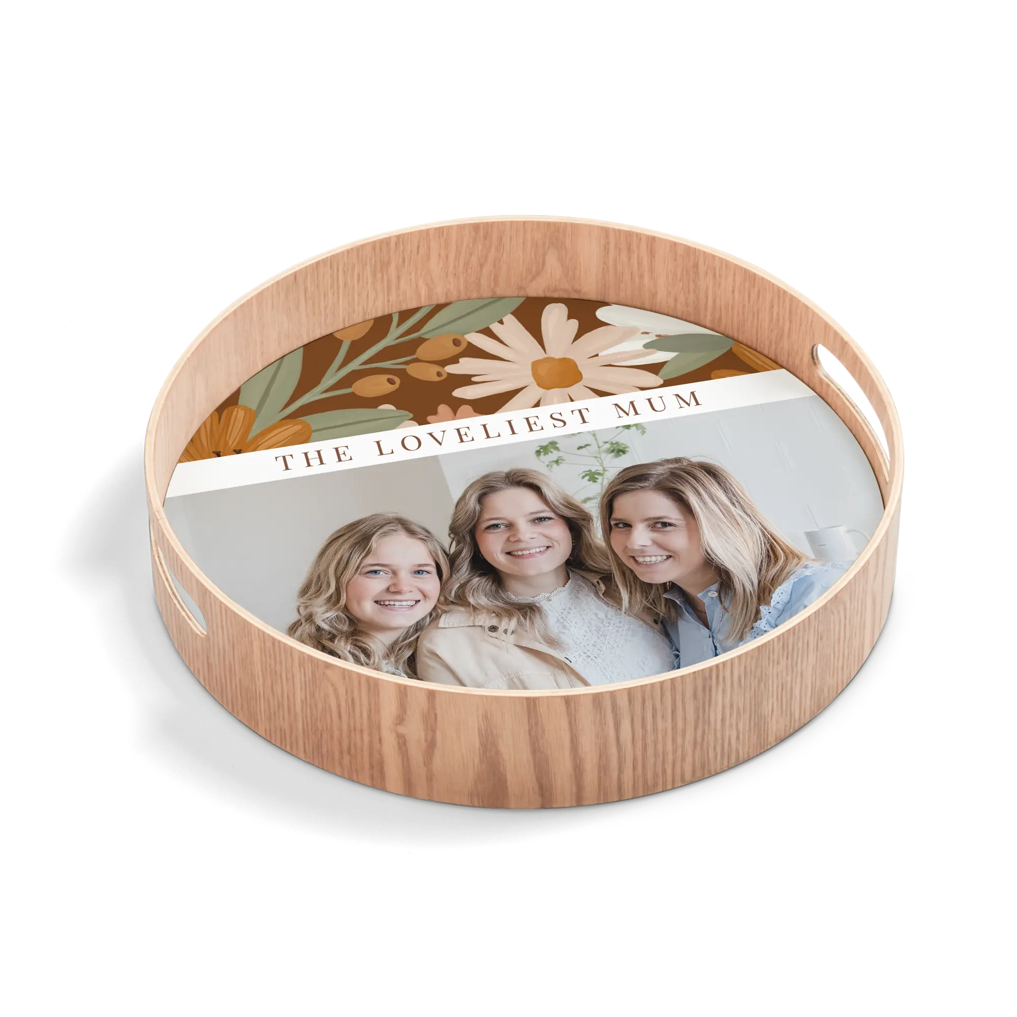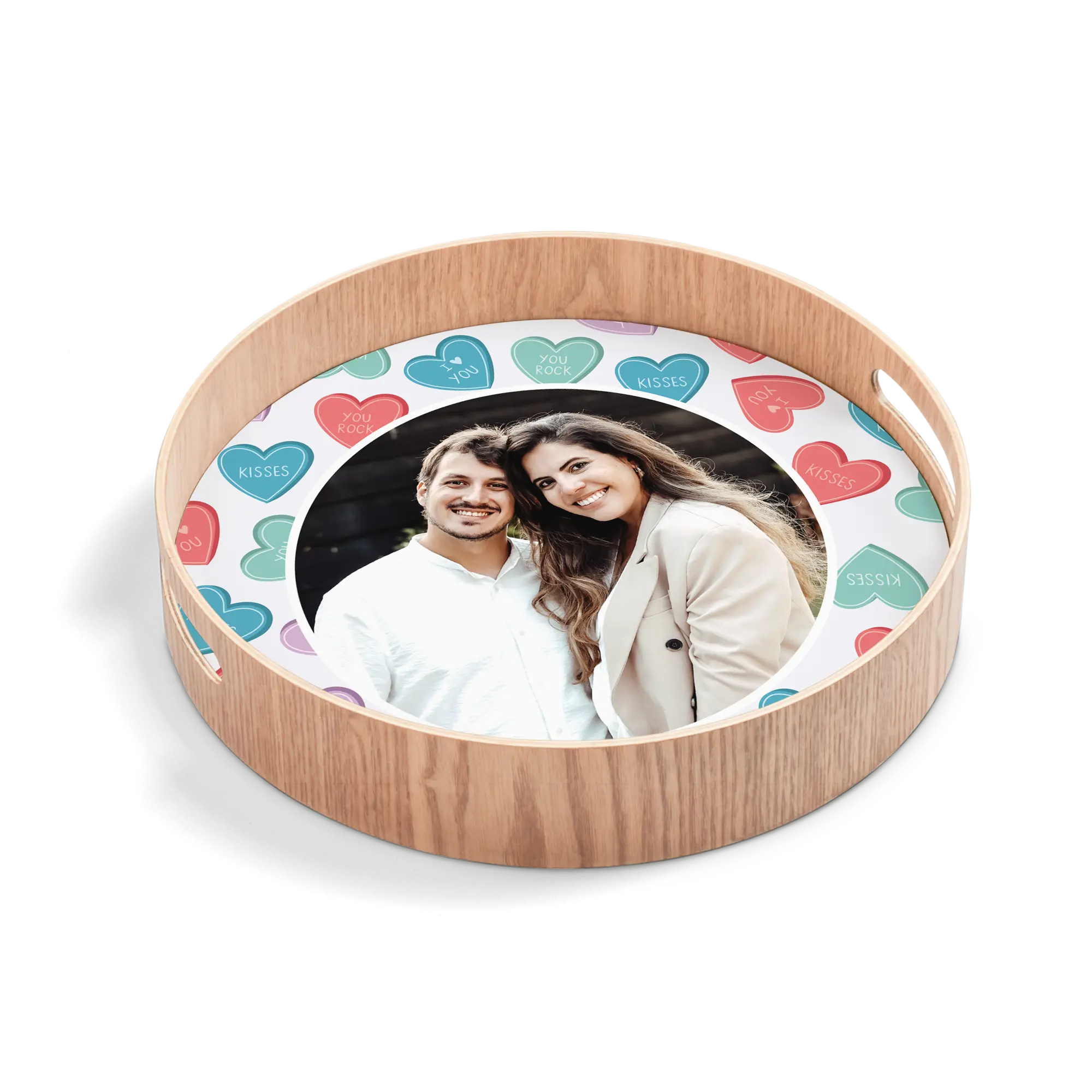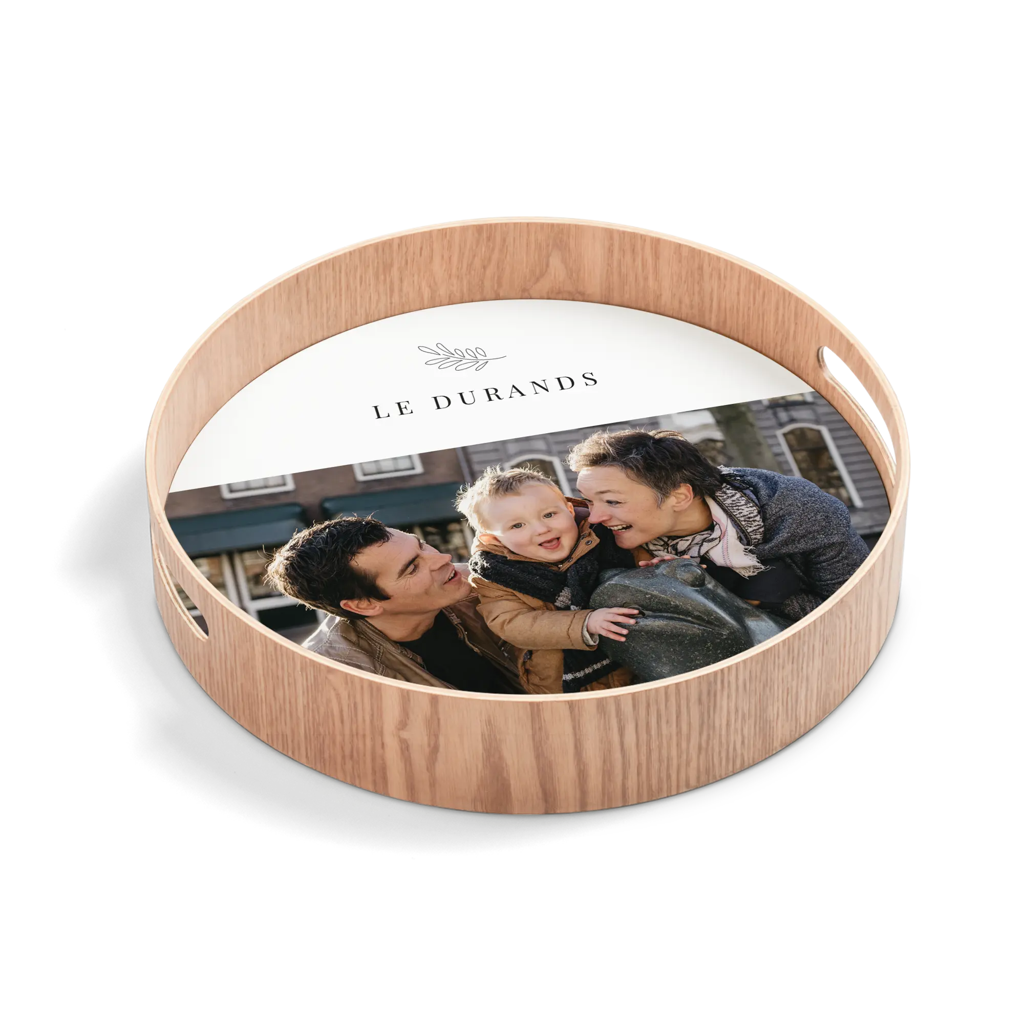 Deluxe wooden frame with a personalised high-quality hardboard base featuring the photo, name, logo and/or text of your choice!More information on the personalised serving tray:Shape: roundColour: wood Material: deluxe wooden frame (pine wood) with high-quality hardboard baseFinish: glossyDimensions: 30 x 30 x 5 cmPersonalisation: with photo, name, logo or collagePrint: picture-perfect and in full colour