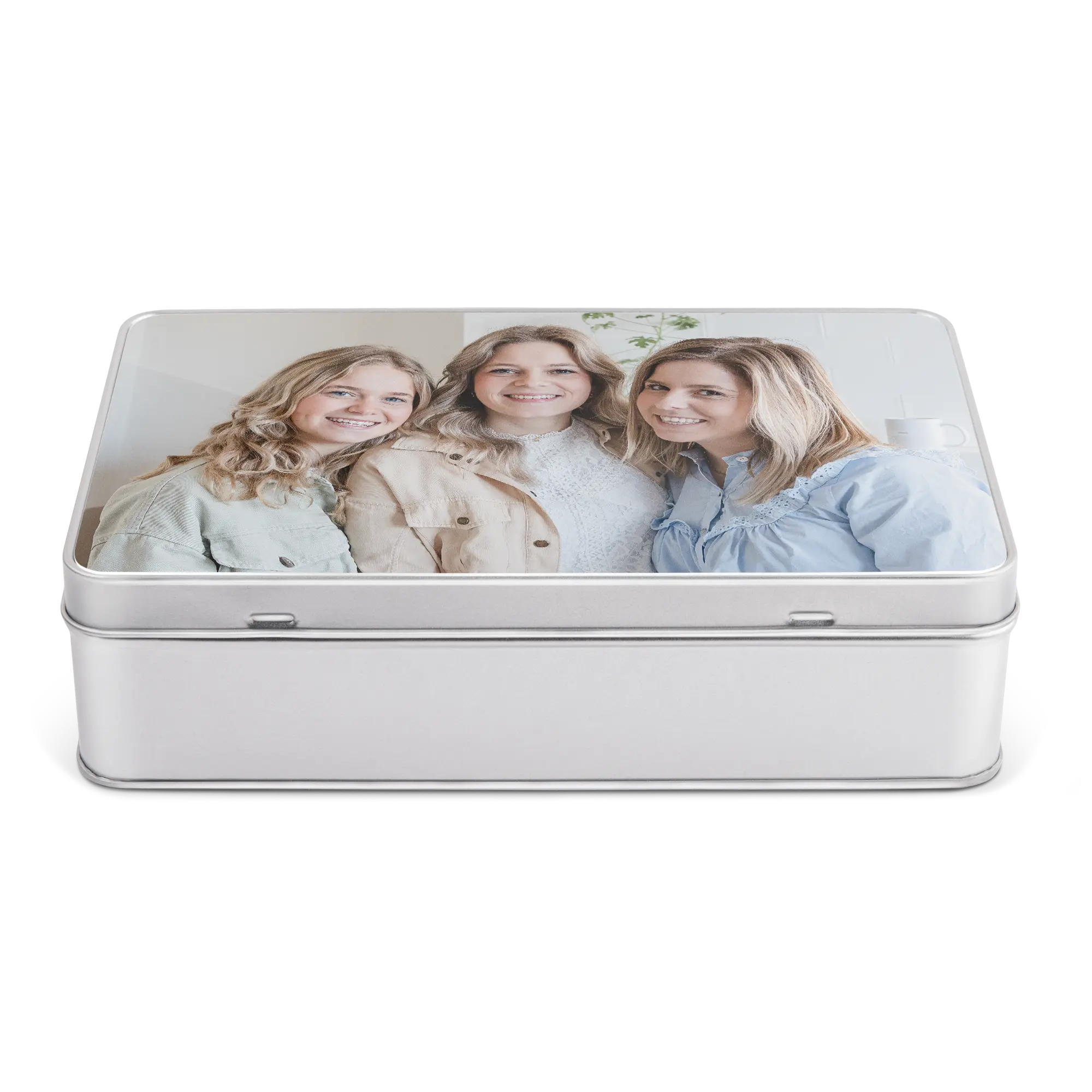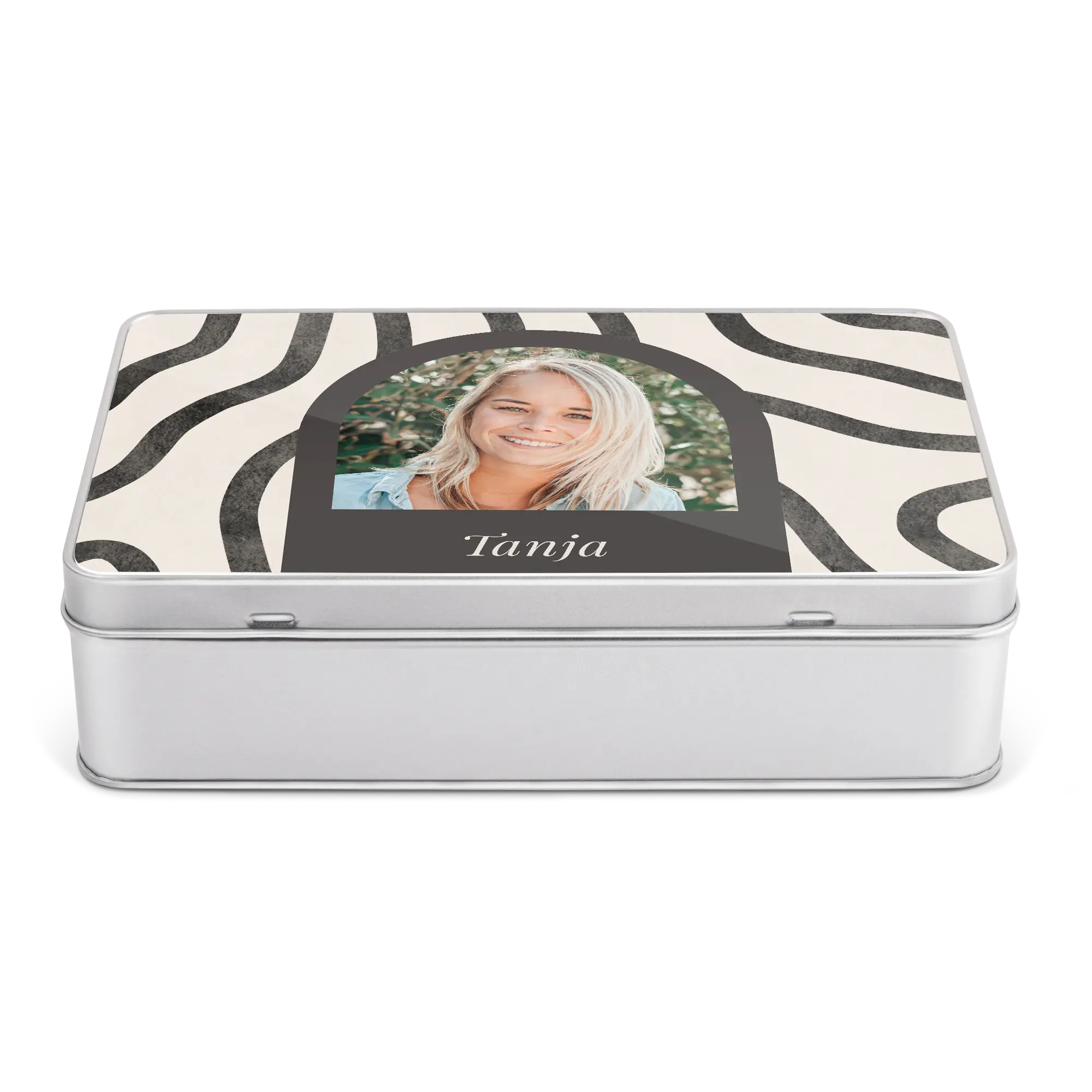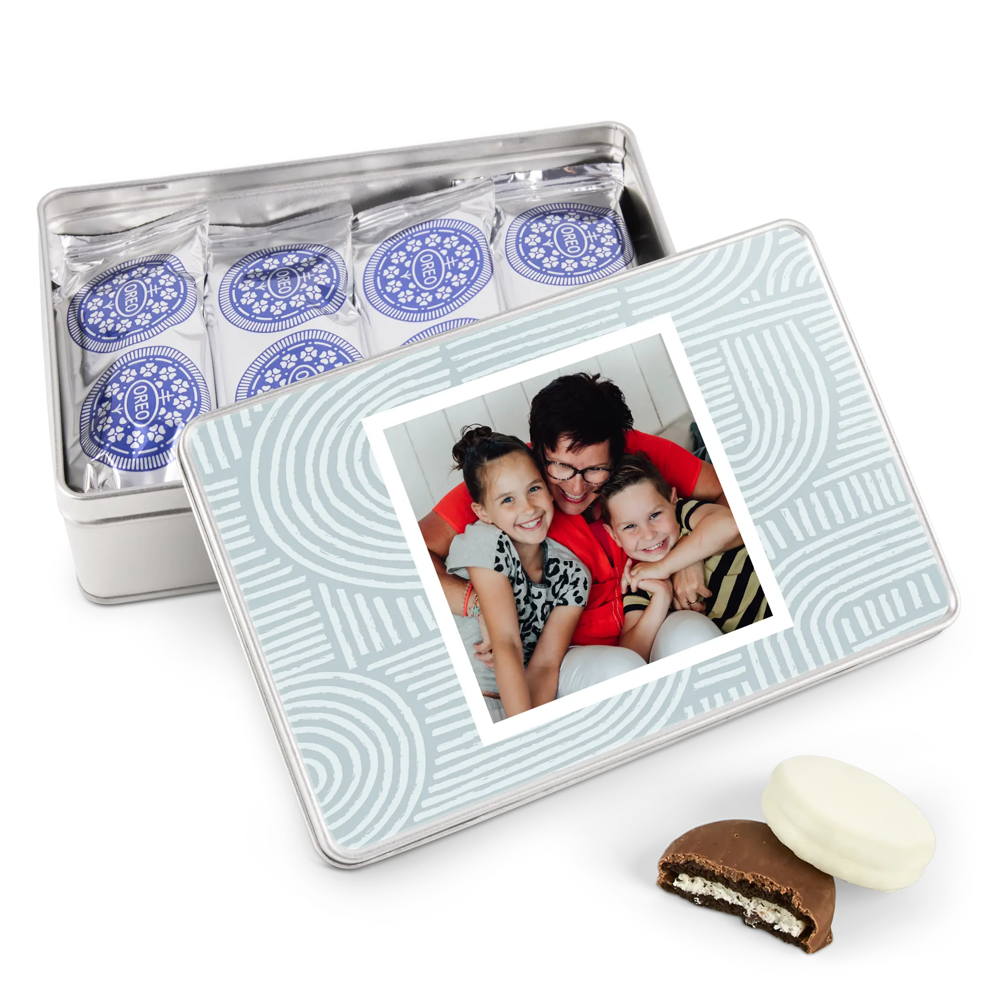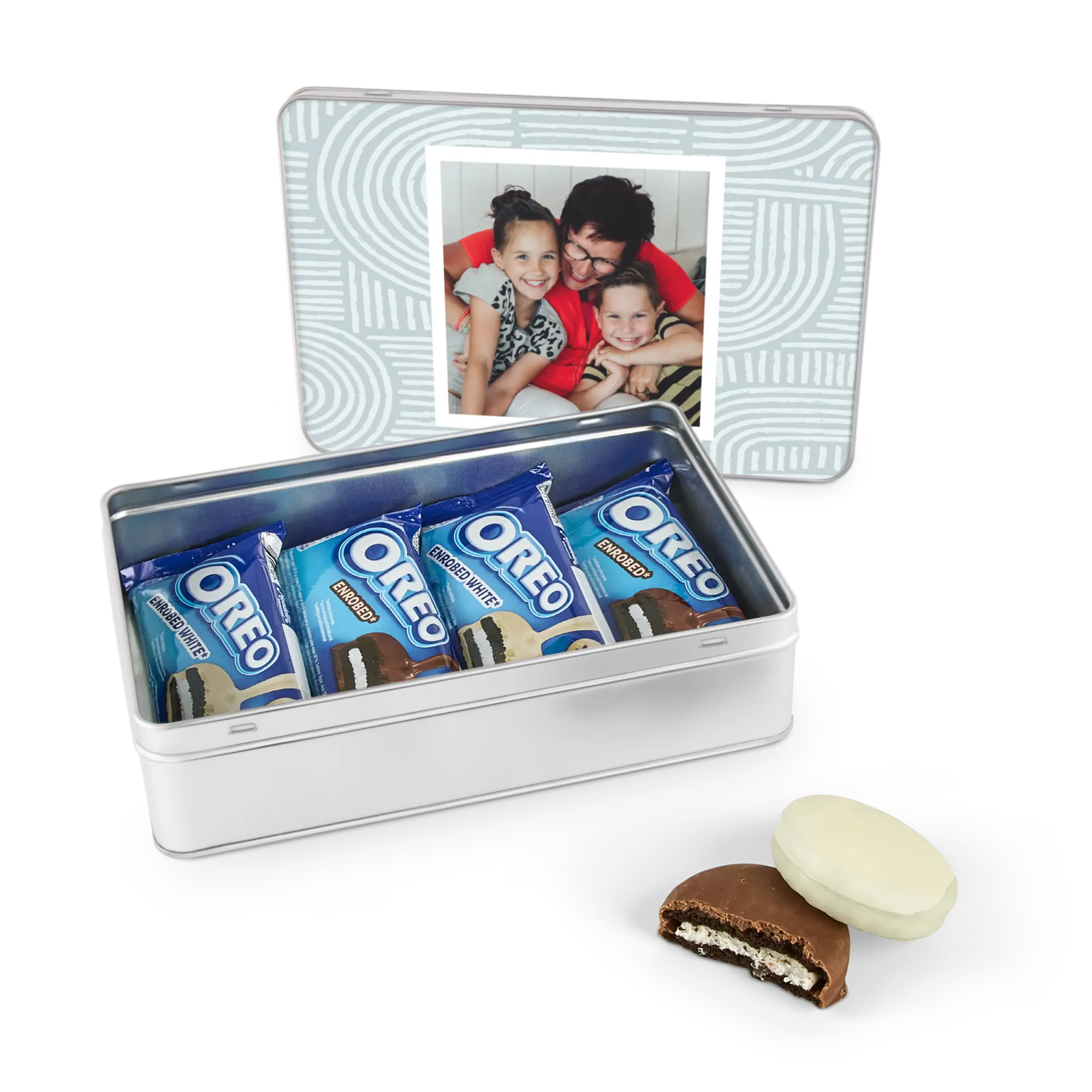 Super cool storage tin with photo and/or name! Filled with delicious Oreo covered with a layer of chocolate.More information about the gift tin:Shape: rectangleMaterial: tinDimensions: 20 x 12.5 x 5 cmContents: Oreo enrobed & Oreo enrobed whiteWeight: 170 grPersonalisation: photo and/or text on aluminum plate on the lidExtra: hand wash recommendedOreo Cookies covered with milk chocolate:Ingredients : Sugar, WHEAT flour , palm oil, shea fat, skimmed cocoa powder 4.5%, rapeseed oil, skimmed MILK POWDER , WHEAT STARCH , lactose (from MILK ), glucose-fructose syrup, emulsifiers ( SOYA lecithin , E492, sunflower lecithin, E476), ammonium carbonate (potassium carbonates). , sodium carbonates), salt, flavourings.Allergens: contains milk, soy, wheat, gluten-containing grains. Cocoa biscuits (38%) with vanilla flavored filling (19%), coated with a milk chocolate flavored glaze (43%).Oreo cookies covered with white chocolate:Ingredients : Sugar, WHEAT flour , palm oil, shea fat, rapeseed oil, skimmed MILK powder, skimmed cocoa powder 2%, WHEAT STARCH , lactose (from MILK ), whey powder (from MILK ), glucose-fructose syrup, MILK FAT , emulsifiers ( SOYA lecithin), sunflower lecithin, E492, raising agents. (potassium carbonates, ammonium carbonates, sodium carbonates), salt, flavors. Cocoa biscuits (38%) with vanilla flavored filling (19%), coated with a glaze (43%) with white chocolate flavor.Allergens: contains milk, soy, wheat, gluten-containing grains.Unfortunately, at tropical temperatures above 25 degrees, we cannot guarantee that you will receive your chocolate gift in perfect condition. Any questions? Please contact our customer service.Unfortunately, for technical reasons, it is not possible to print numbers, Cyrillic, Turkish or special characters.