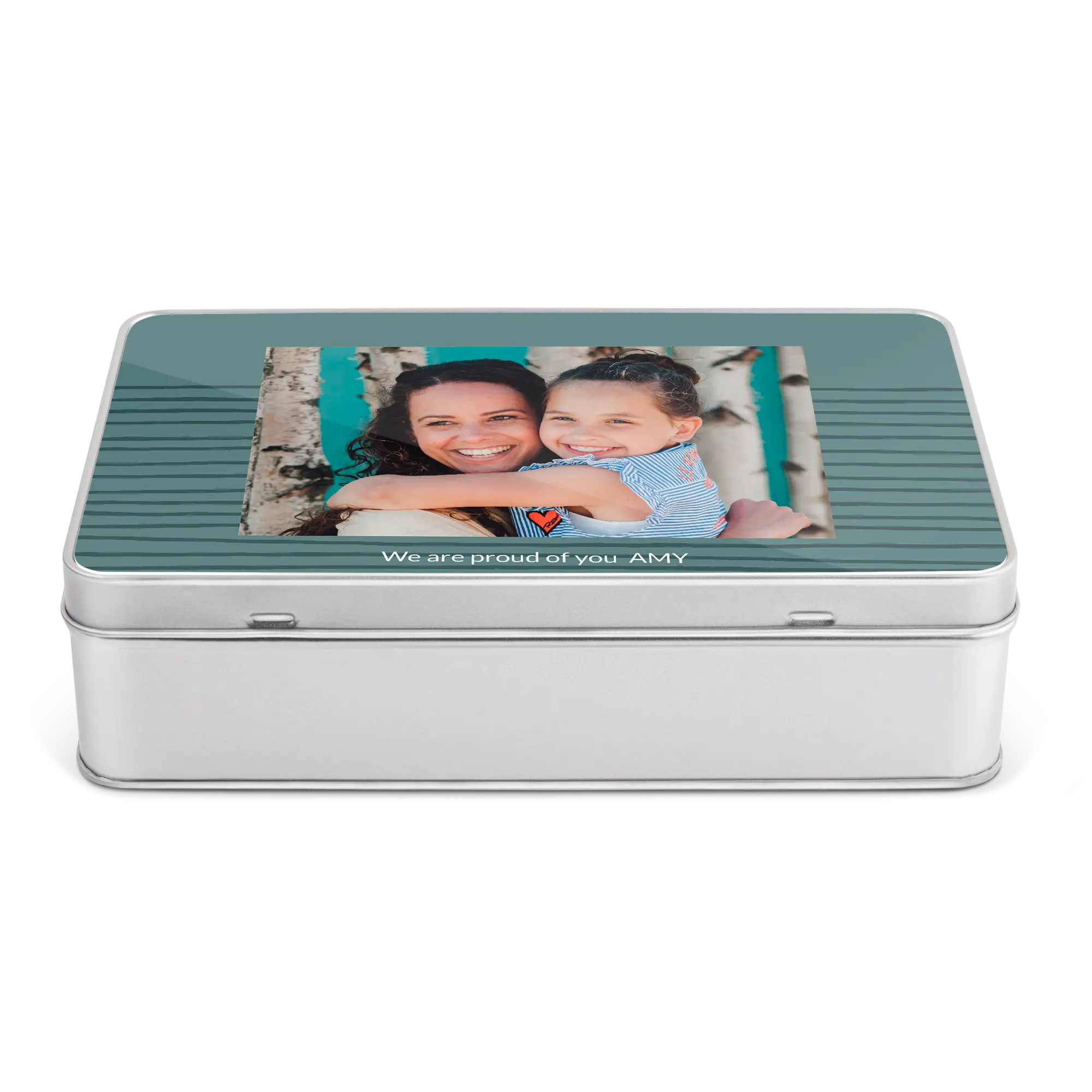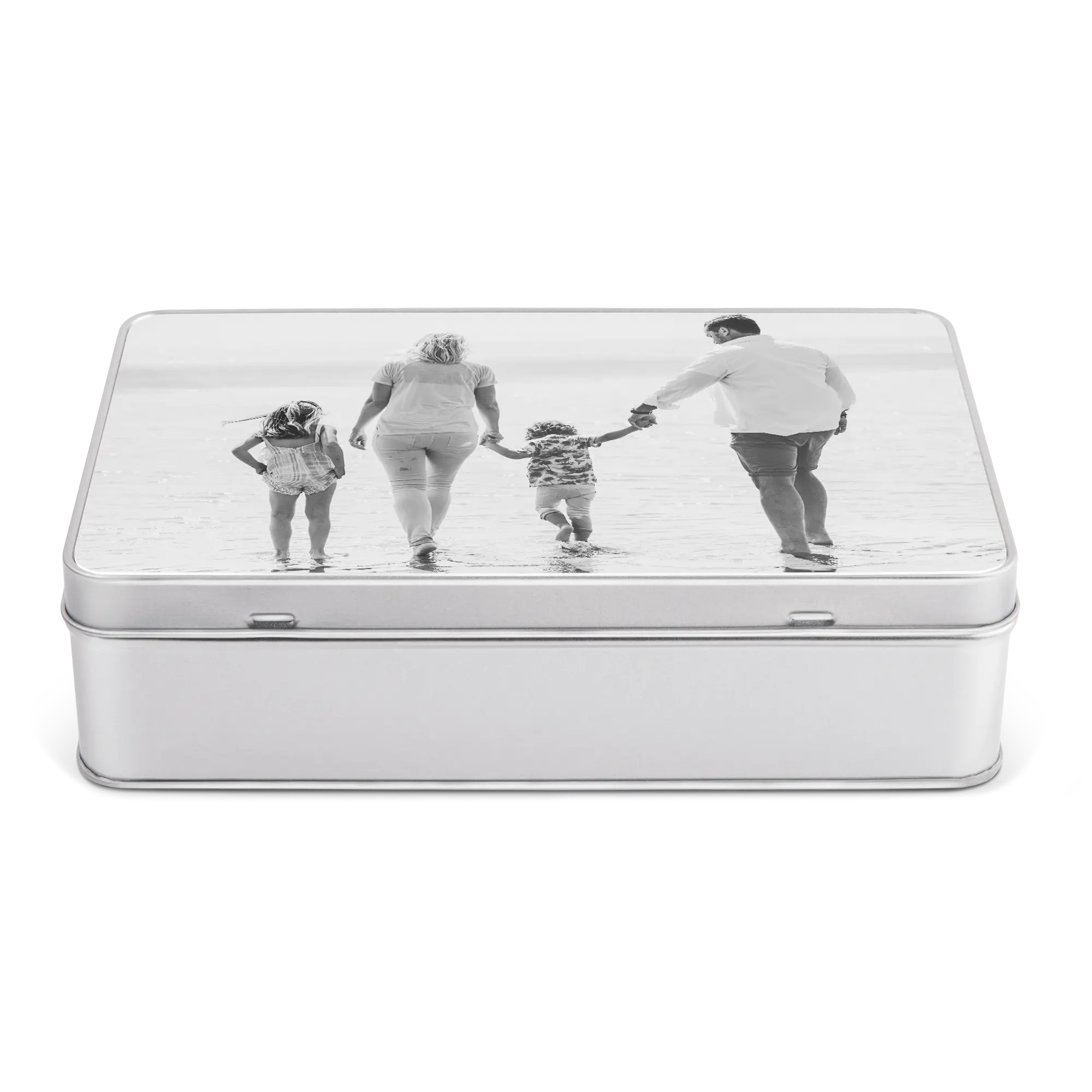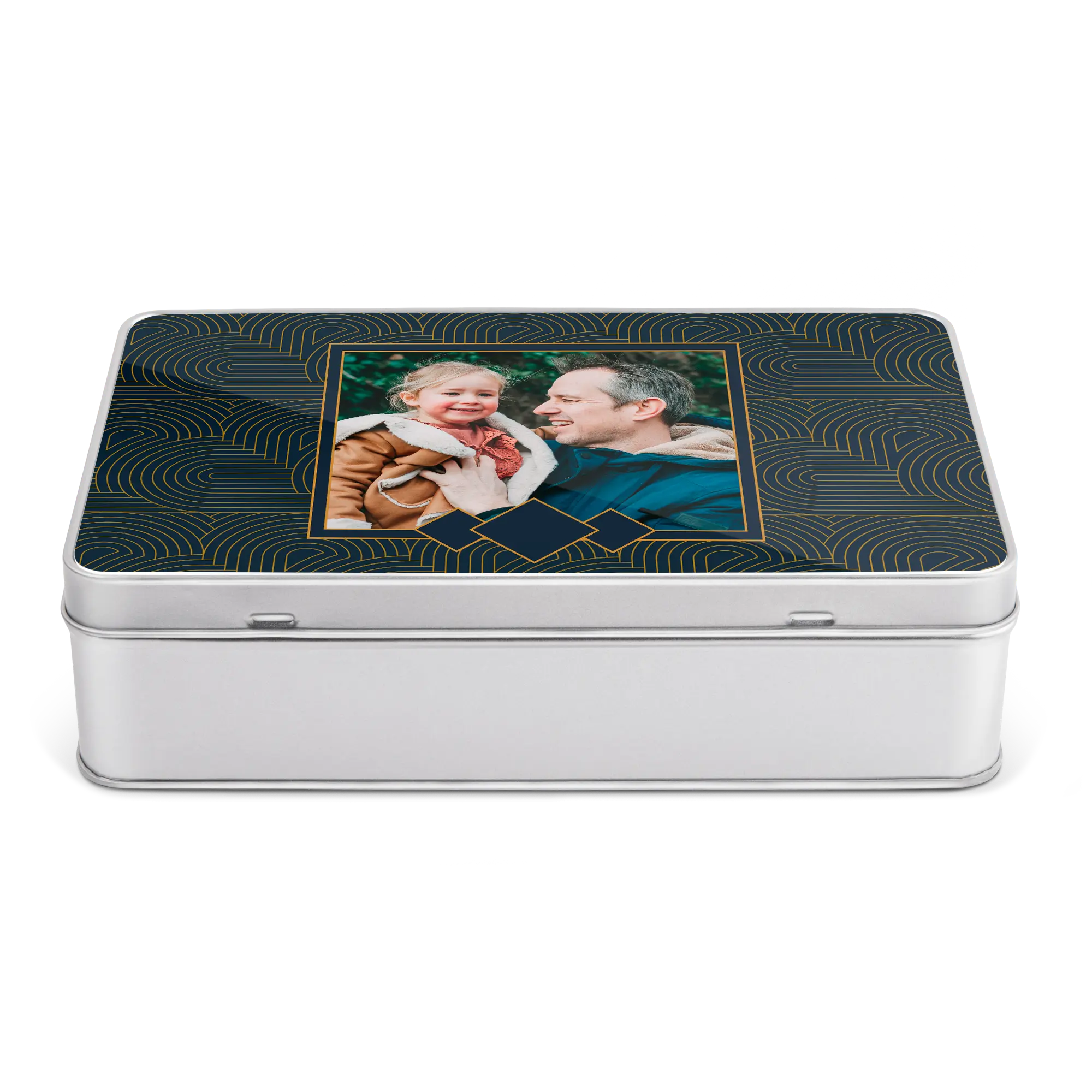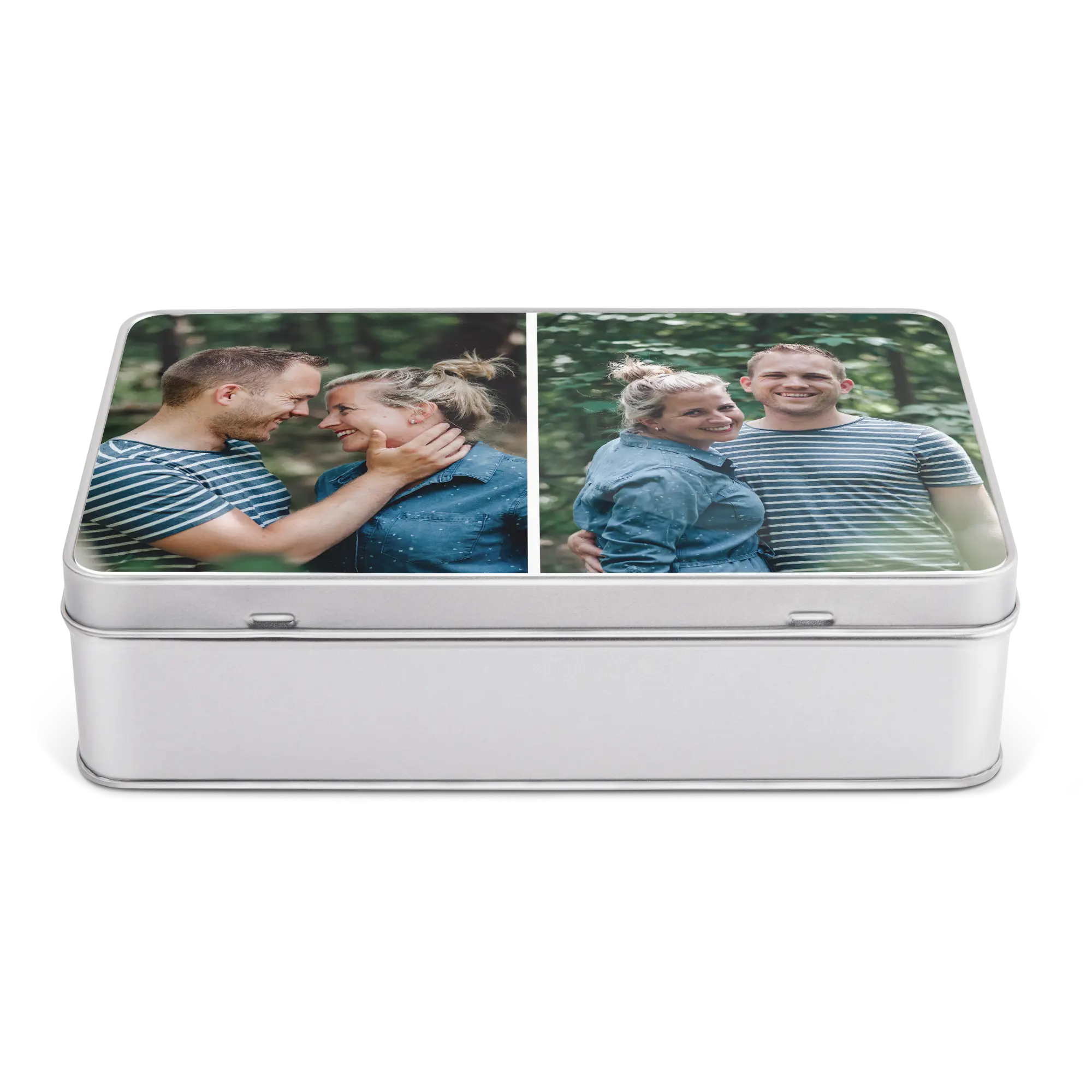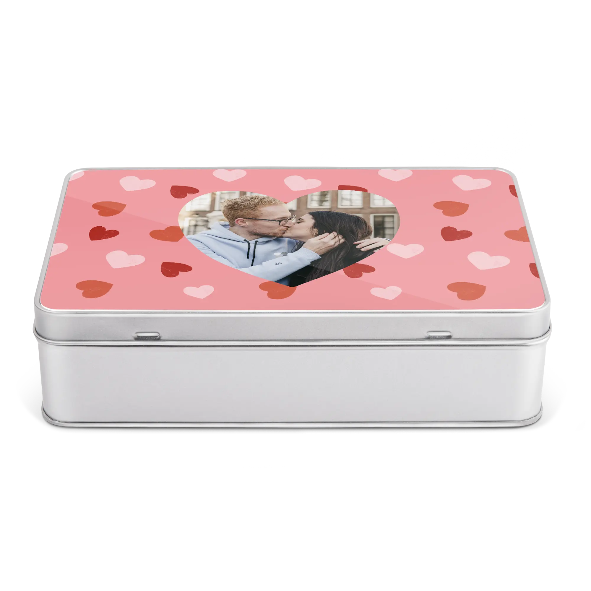 Super cool storage tin with photo and/or name! Filled with delicious Oreo covered with a layer of chocolate.More information about the gift tin:Shape: rectangleMaterial: tinDimensions: 20 x 12.5 x 5 cmContents: Oreo enrobed & Oreo enrobed whiteWeight: 170 grPersonalisation: photo and/or text on aluminum plate on the lidExtra: hand wash recommendedOreo Cookies covered with milk chocolate:Ingredients : Sugar, WHEAT flour , palm oil, shea fat, skimmed cocoa powder 4.5%, rapeseed oil, skimmed MILK POWDER , WHEAT STARCH , lactose (from MILK ), glucose-fructose syrup, emulsifiers ( SOYA lecithin , E492, sunflower lecithin, E476), ammonium carbonate (potassium carbonates). , sodium carbonates), salt, flavourings.Allergens: contains milk, soy, wheat, gluten-containing grains. Cocoa biscuits (38%) with vanilla flavored filling (19%), coated with a milk chocolate flavored glaze (43%).Oreo cookies covered with white chocolate:Ingredients : Sugar, WHEAT flour , palm oil, shea fat, rapeseed oil, skimmed MILK powder, skimmed cocoa powder 2%, WHEAT STARCH , lactose (from MILK ), whey powder (from MILK ), glucose-fructose syrup, MILK FAT , emulsifiers ( SOYA lecithin), sunflower lecithin, E492, raising agents. (potassium carbonates, ammonium carbonates, sodium carbonates), salt, flavors. Cocoa biscuits (38%) with vanilla flavored filling (19%), coated with a glaze (43%) with white chocolate flavor.Allergens: contains milk, soy, wheat, gluten-containing grains.Unfortunately, at tropical temperatures above 25 degrees, we cannot guarantee that you will receive your chocolate gift in perfect condition. Any questions? Please contact our customer service.Unfortunately, for technical reasons, it is not possible to print numbers, Cyrillic, Turkish or special characters.