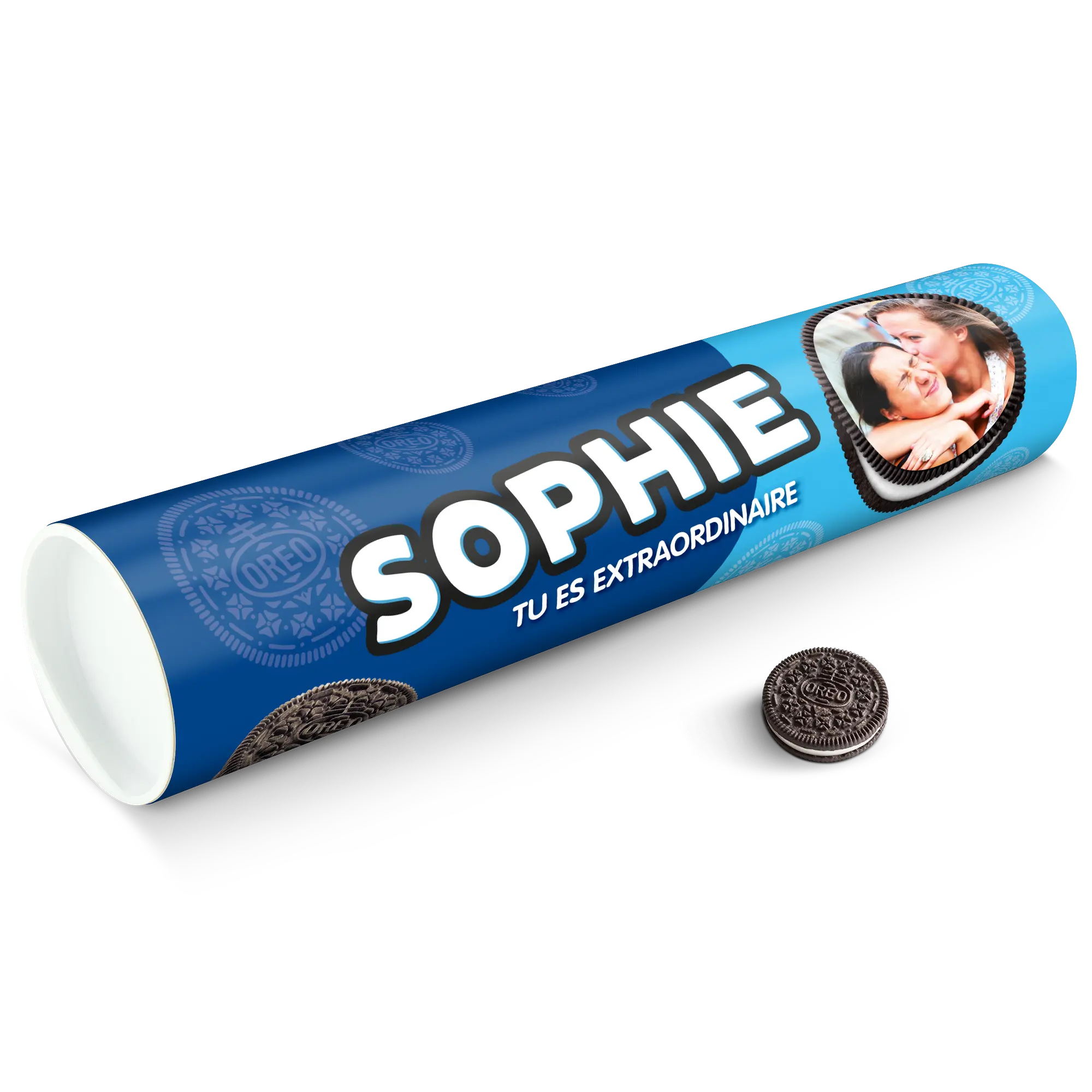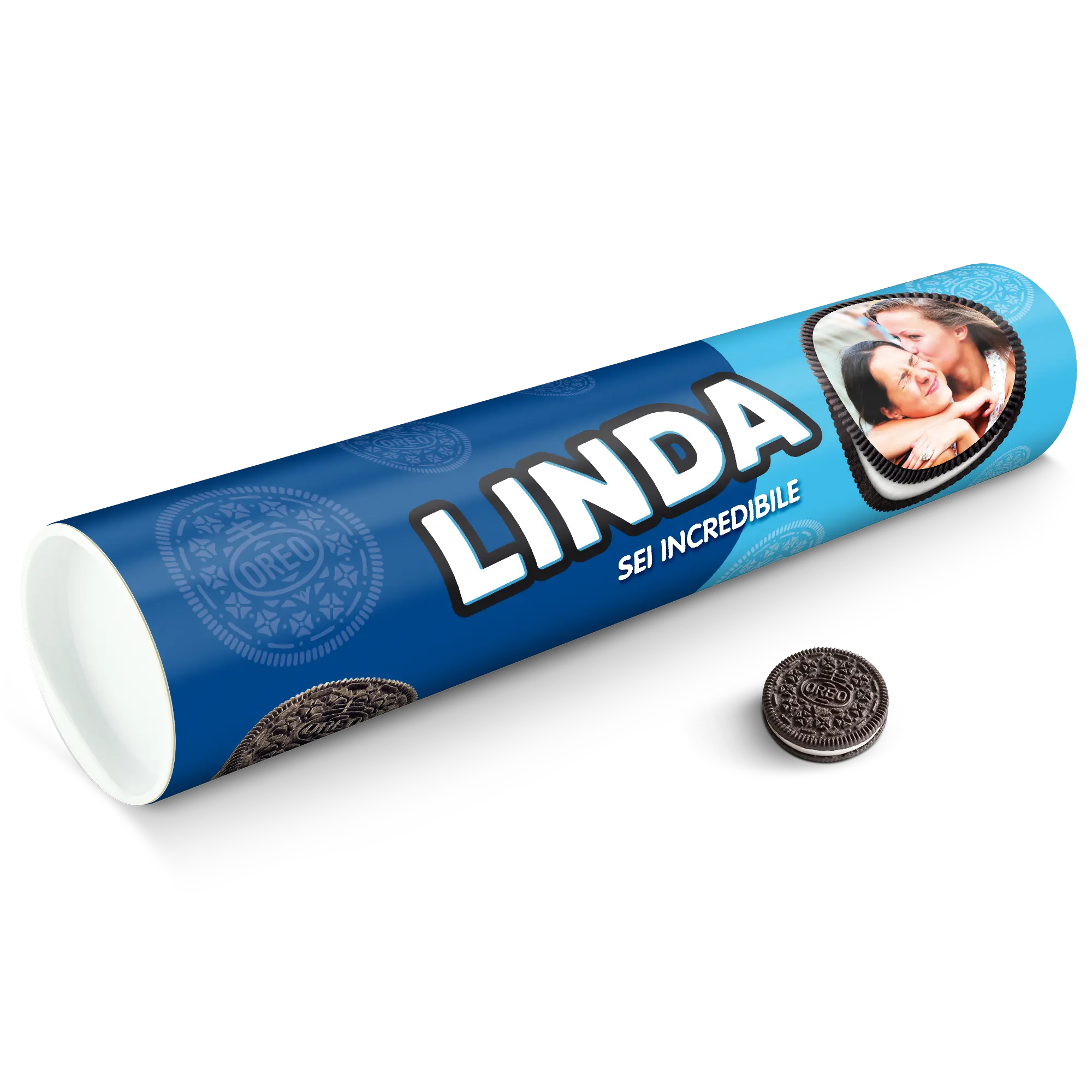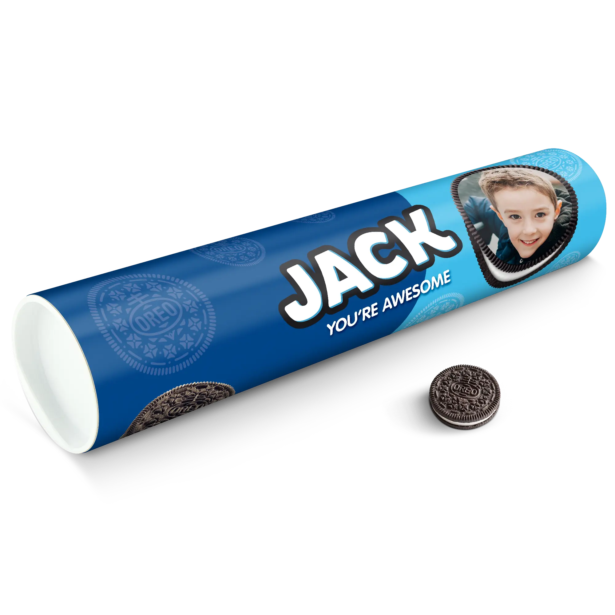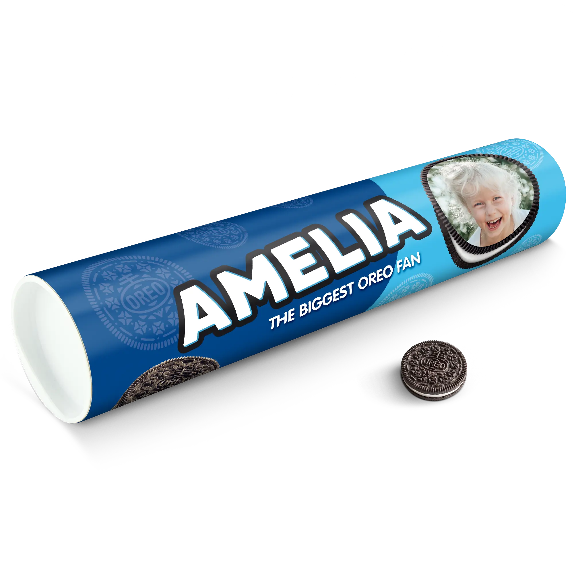 Personalised XXL Oreo Gift Tube featuring your photo, name & personal message. Full of delicious Oreo cookies!More information on the XXL Oreo Gift Tube:Number of packets included: 6 packets of Oreo Original (14 cookies in each packet)Tube dimensions: 38.2 x 10.4 cmWeight: 1000 gramsPersonalisation: photo, name and/or personal messagePrint: picture-perfect and in full colourCHOCOLATE FLAVOUR SANDWICH BISCUITS WITH A VANILLA FLAVOUR FILLING (29%). Ingredients: wheat flour, sugar, palm oil, rapeseed oil, fat reduced cocoa powder 4,3%, wheat starch, glucose-fructose syrup, raising agents (ammonium carbonates, potassium carbonates, sodium carbonates), salt, emulsifier (soy lecithin), acidity regulator (sodium hydroxide), flavouring.Allergen information:Contains soy, gluten-containing cereals, wheat. May contain traces of milk. Please note:For technical reasons, it is not possible to use Cyrillic, Asian, Greek or special characters.