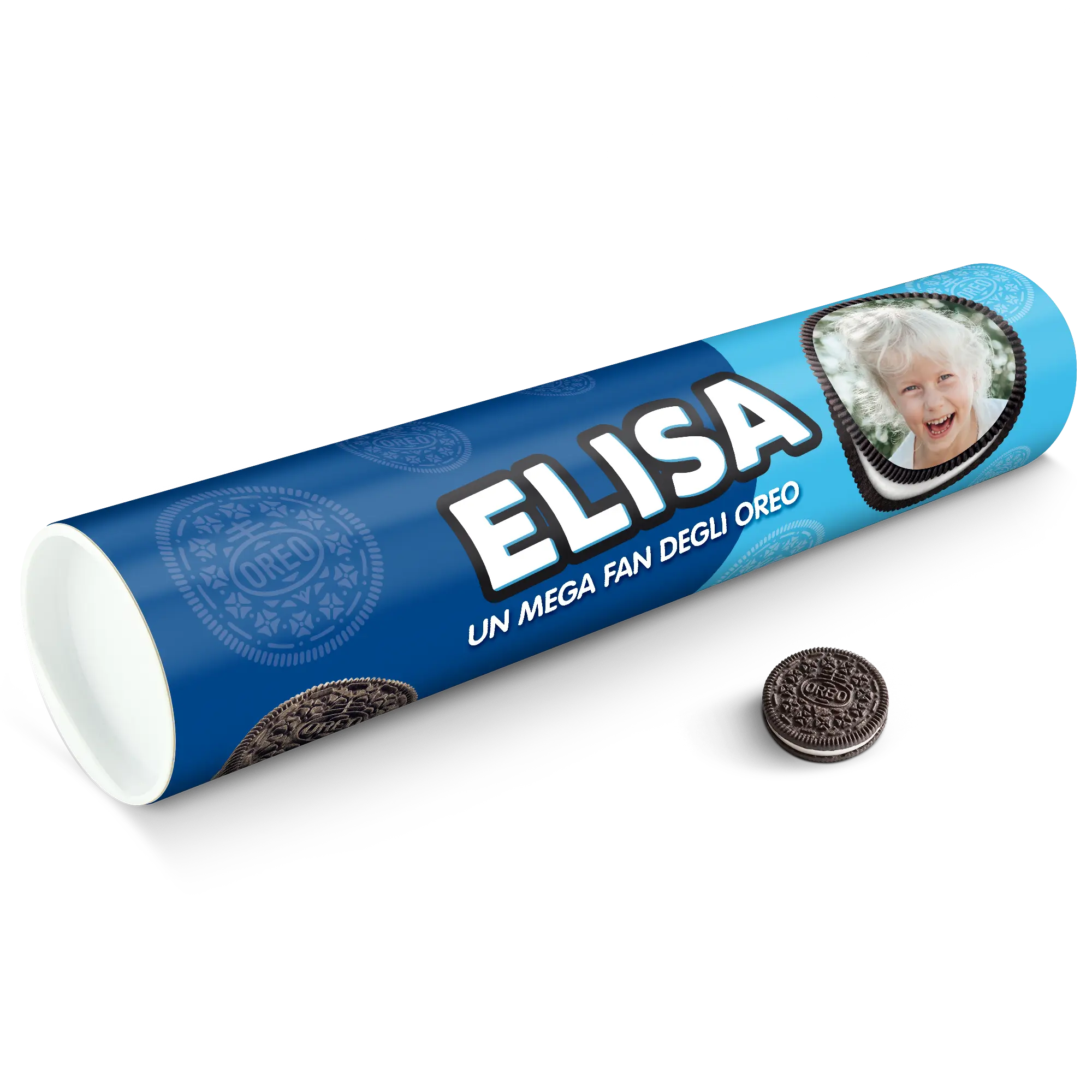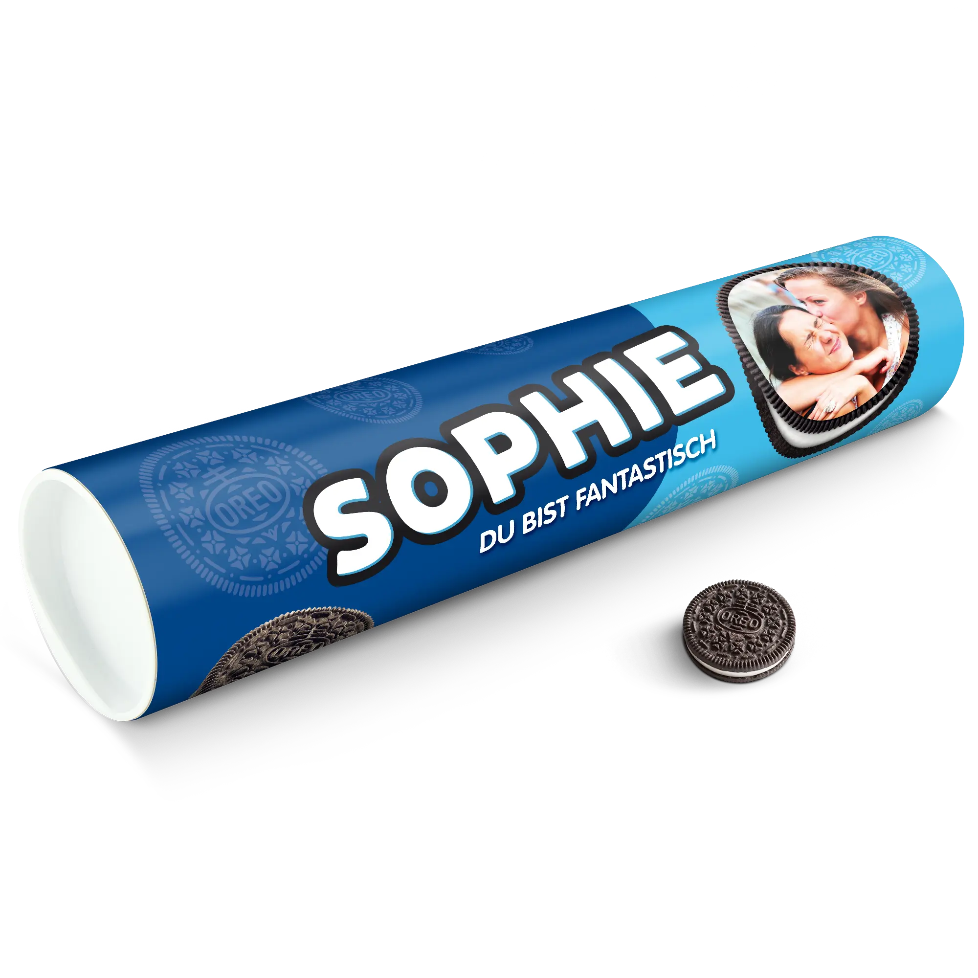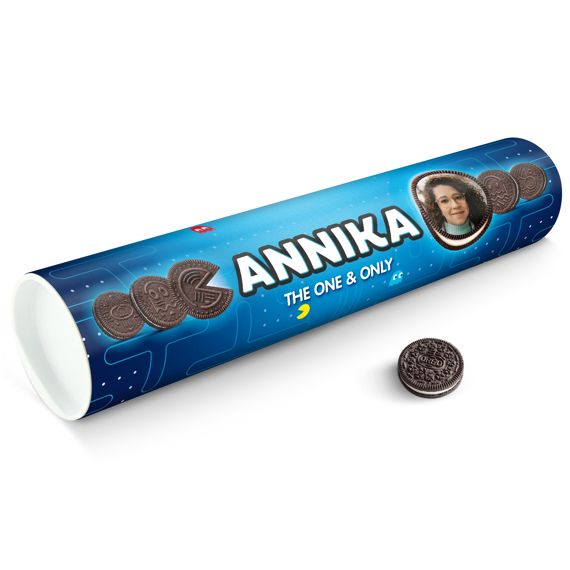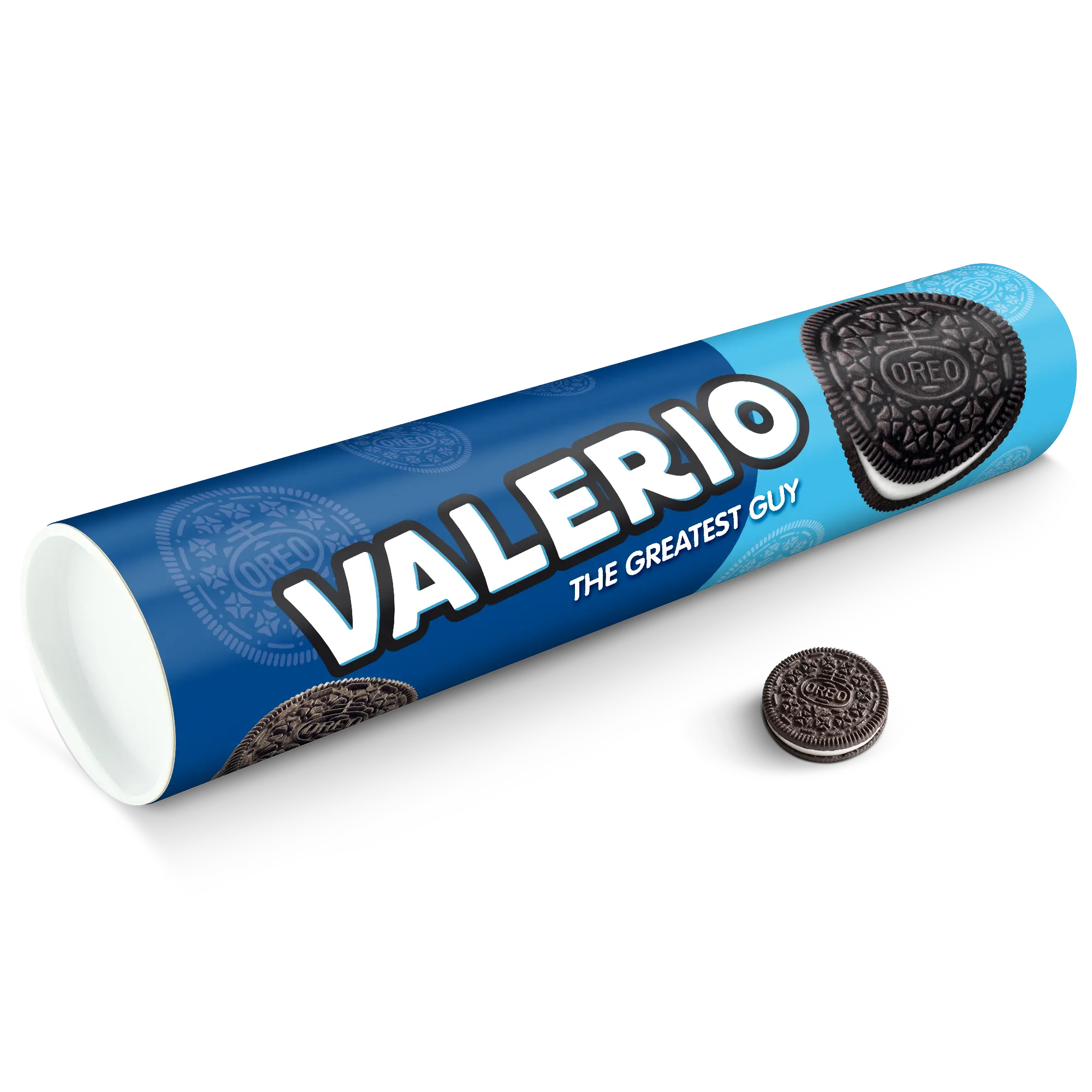Personalised XXL Oreo Gift Tube featuring your photo, name & personal message. Full of delicious Oreo cookies!More information on the XXL Oreo Gift Tube:Number of packets included: 6 packets of Oreo Original (14 cookies in each packet)Tube dimensions: 38.2 x 10.4 cmWeight: 1000 gramsPersonalisation: photo, name and/or personal messagePrint: picture-perfect and in full colourCHOCOLATE FLAVOUR SANDWICH BISCUITS WITH A VANILLA FLAVOUR FILLING (29%). Ingredients: wheat flour, sugar, palm oil, rapeseed oil, fat reduced cocoa powder 4,3%, wheat starch, glucose-fructose syrup, raising agents (ammonium carbonates, potassium carbonates, sodium carbonates), salt, emulsifier (soy lecithin), acidity regulator (sodium hydroxide), flavouring.Allergen information:Contains soy, gluten-containing cereals, wheat. May contain traces of milk. Please note:For technical reasons, it is not possible to use Cyrillic, Asian, Greek or special characters.