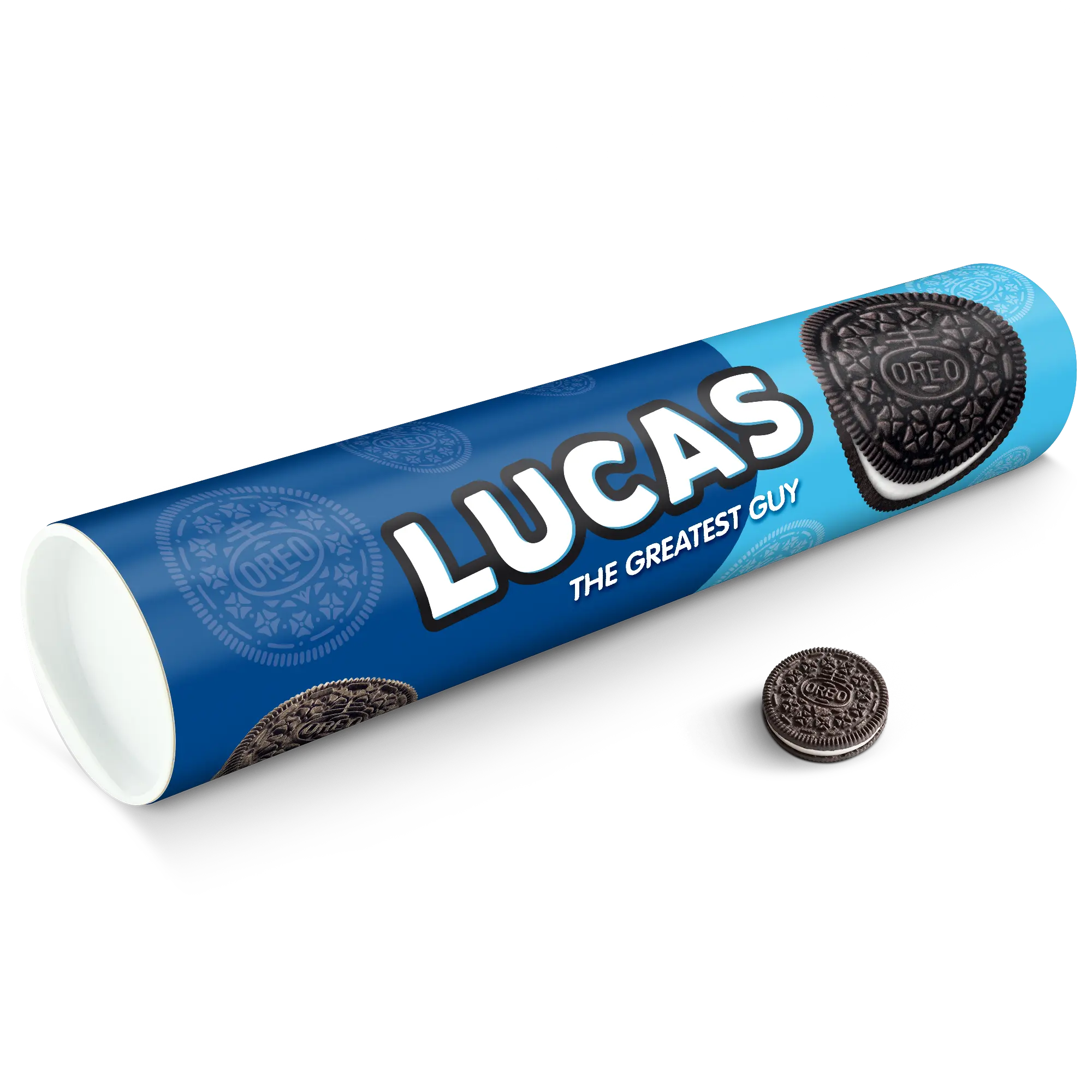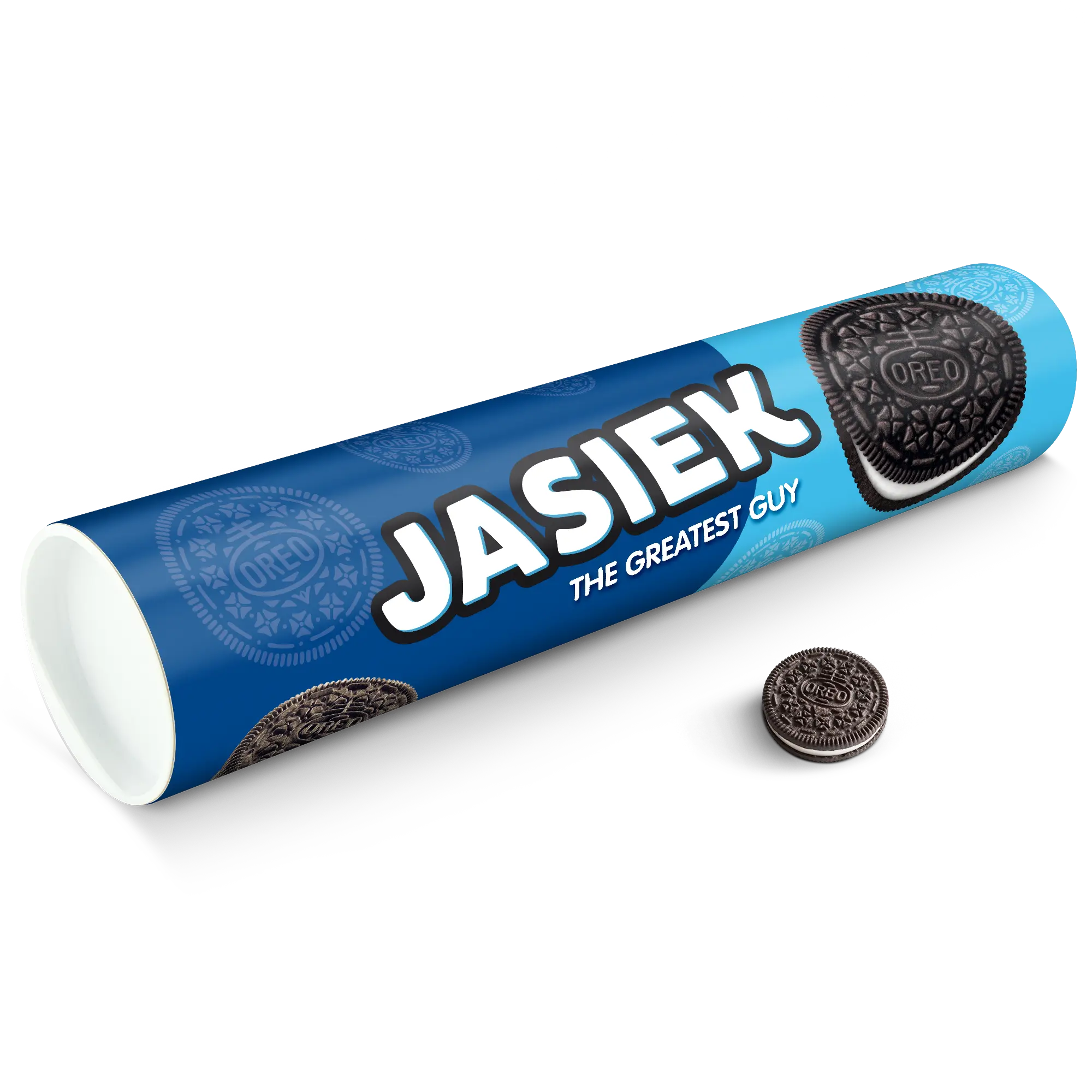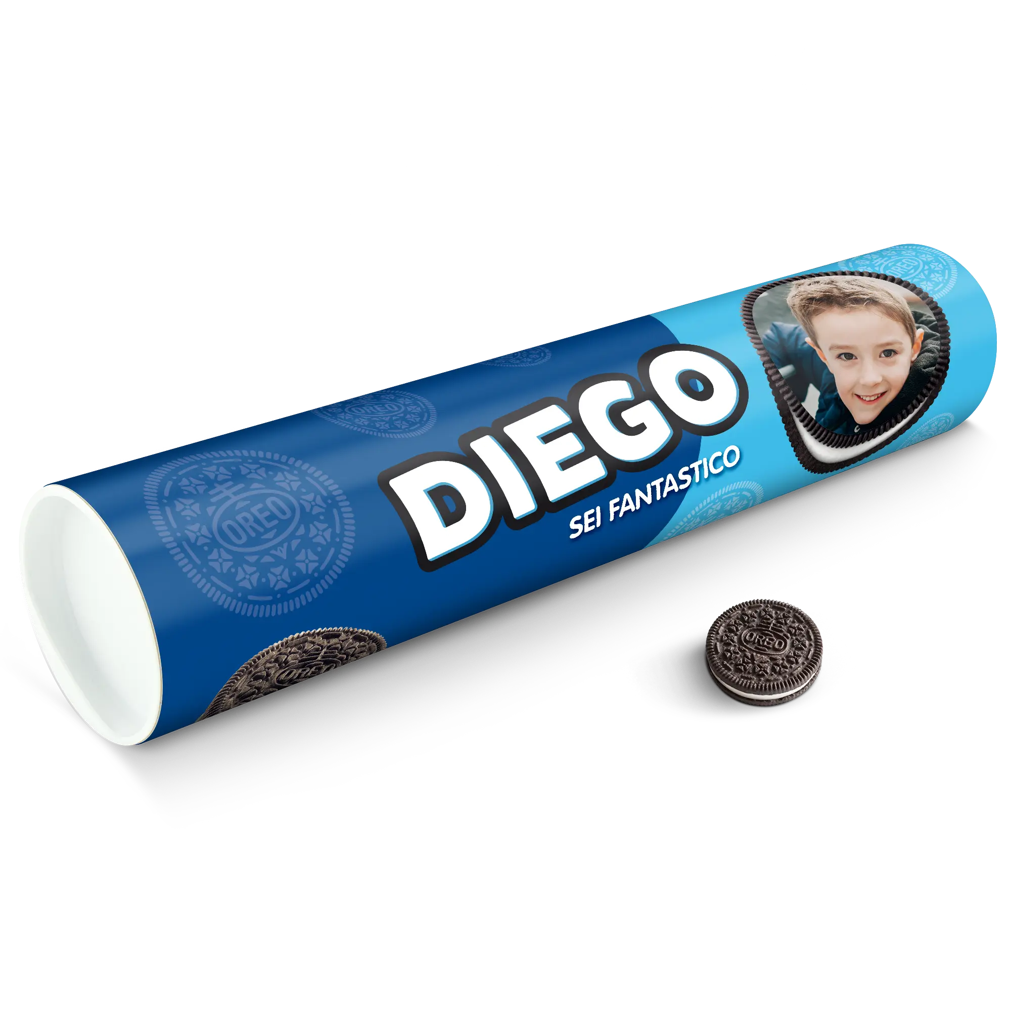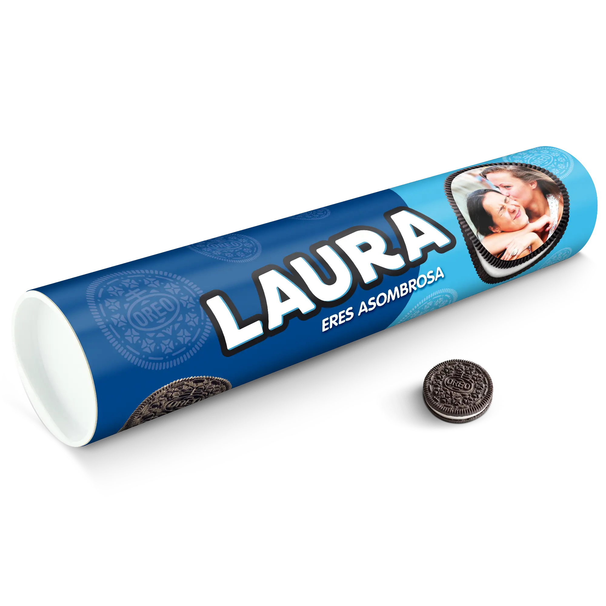 Personalised XXL Oreo Gift Tube featuring your photo, name & personal message. Full of delicious Oreo cookies!More information on the XXL Oreo Gift Tube:Number of packets included: 6 packets of Oreo Original (14 cookies in each packet)Tube dimensions: 38.2 x 10.4 cmWeight: 1000 gramsPersonalisation: photo, name and/or personal messagePrint: picture-perfect and in full colourCHOCOLATE FLAVOUR SANDWICH BISCUITS WITH A VANILLA FLAVOUR FILLING (29%). Ingredients: wheat flour, sugar, palm oil, rapeseed oil, fat reduced cocoa powder 4,3%, wheat starch, glucose-fructose syrup, raising agents (ammonium carbonates, potassium carbonates, sodium carbonates), salt, emulsifier (soy lecithin), acidity regulator (sodium hydroxide), flavouring.Allergen information:Contains soy, gluten-containing cereals, wheat. May contain traces of milk. Please note:For technical reasons, it is not possible to use Cyrillic, Asian, Greek or special characters.