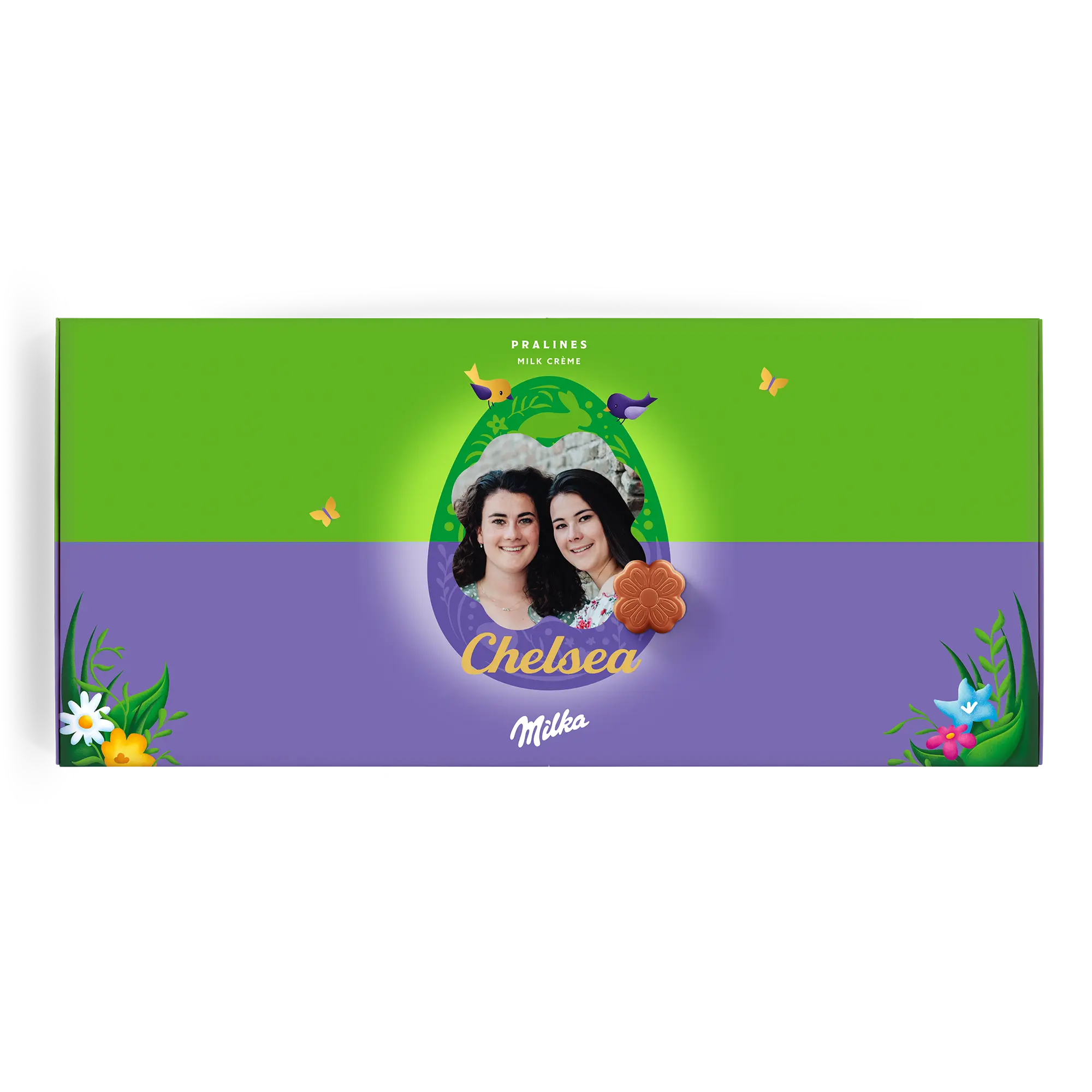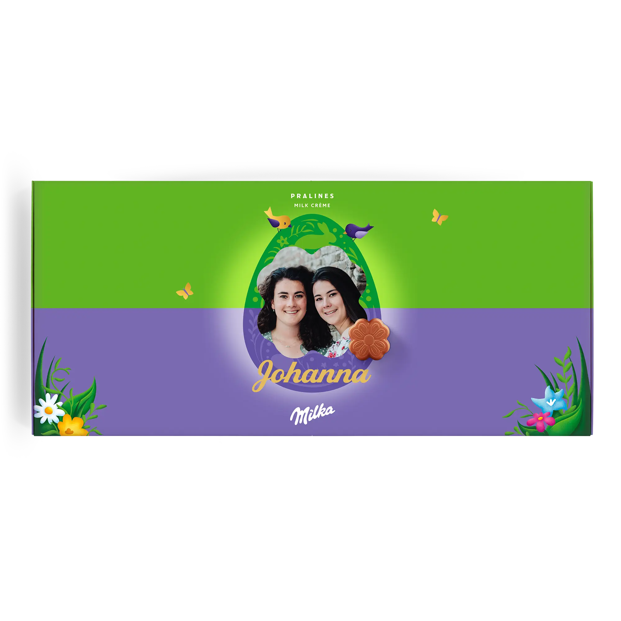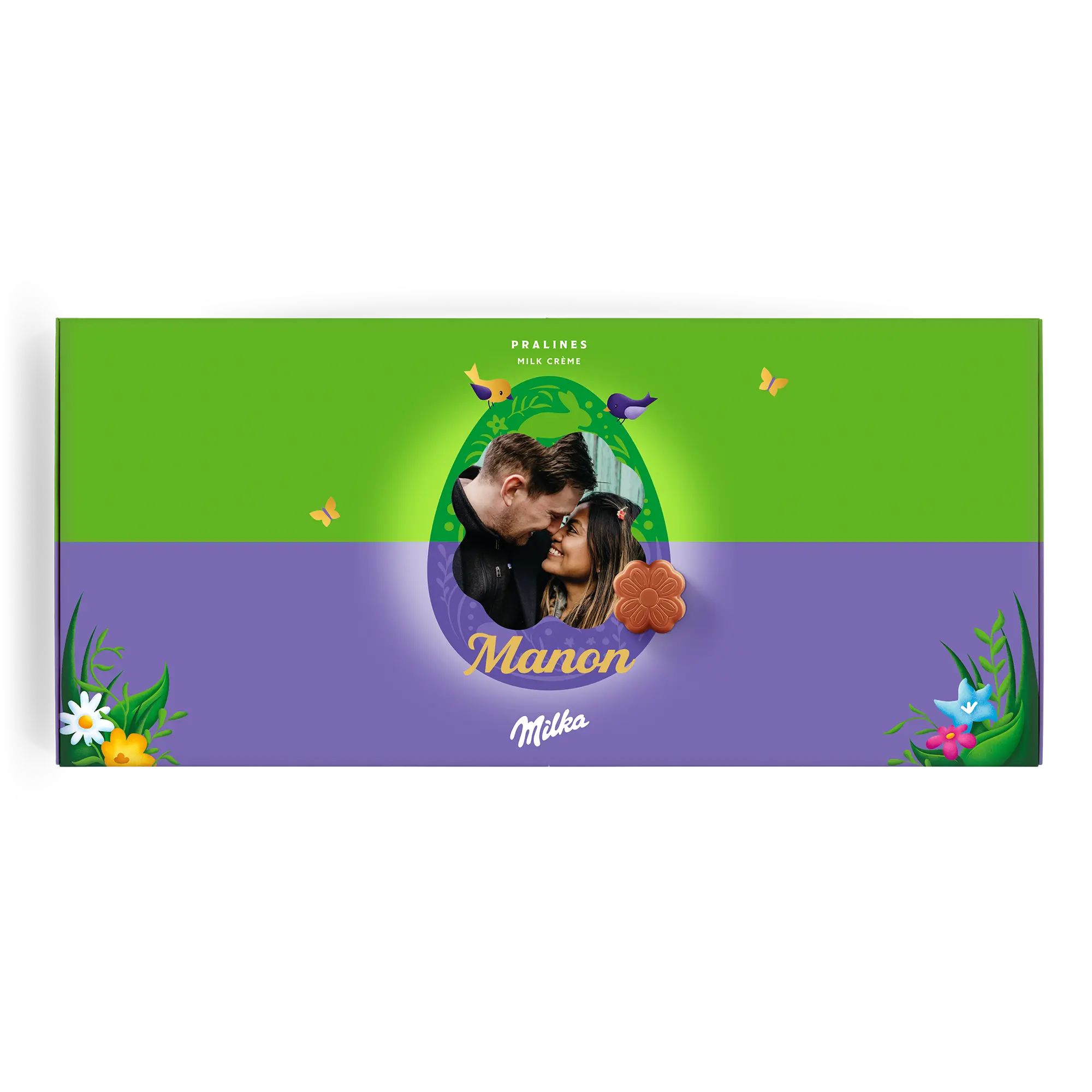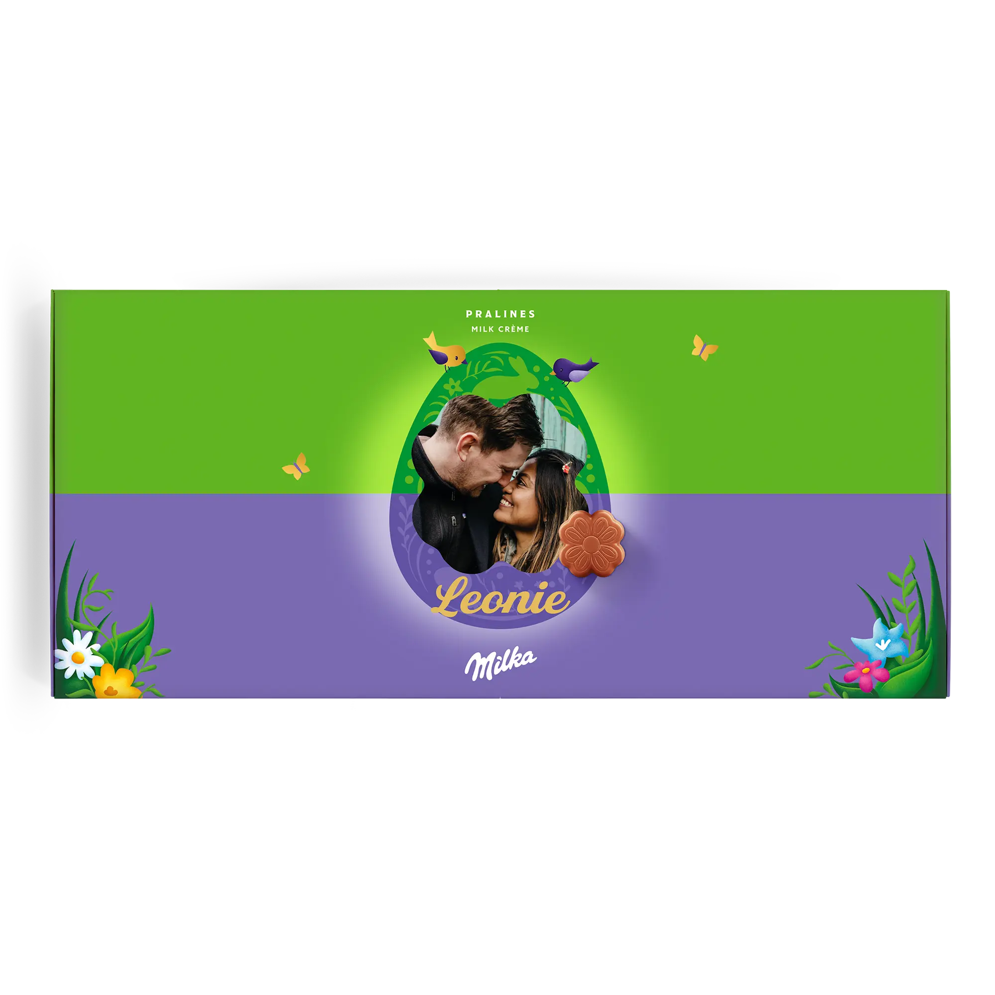 Special Say it with Milka chocolate box for Easter. Delicious pralines with name, photo and a personal message. Surprise your loved ones!More information on the Milka Easter gift:Chocolate: Alpine milk chocolate with cream fillingPraline shape: flowersAmount of pralines: 40Weight: 220 gramsDimensions: 38.7 x 17.6 x 2.4 cmPersonalisation: photo, name and personal messagePrint: picture perfect and in full colourIngredients: Sugar, palm oil, cocoa butter, skimmed MILK POWDER, whey powder (from MILK), cocoa mass, MILK FAT, emulsifiers (SOY lecithin, E476), HAZELNUT PASTE, flavourings. 7% skimmed milk powder in the milk cream filling.Allergens: Contains hazelnuts, milk and soy. May contain other nuts and gluten.Good to know:When the outside temperature is 25 degrees Celsius or above we will not be able to guarantee the quality of the chocolate. If you have any questions regarding your chocolate orders please contact our customer service team.For technical reasons, it is not possible to process Cyrillic, Turkish, Arabic, Asian or special characters.