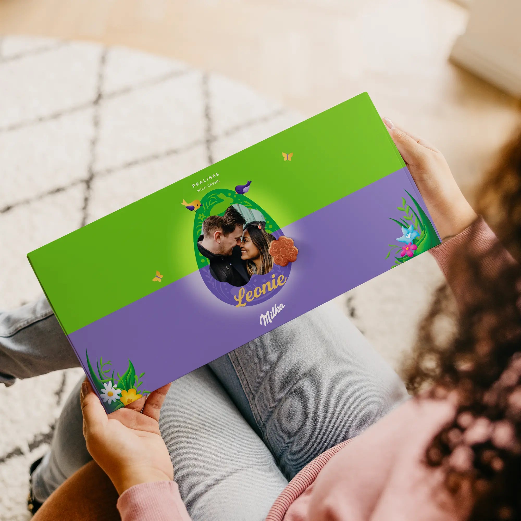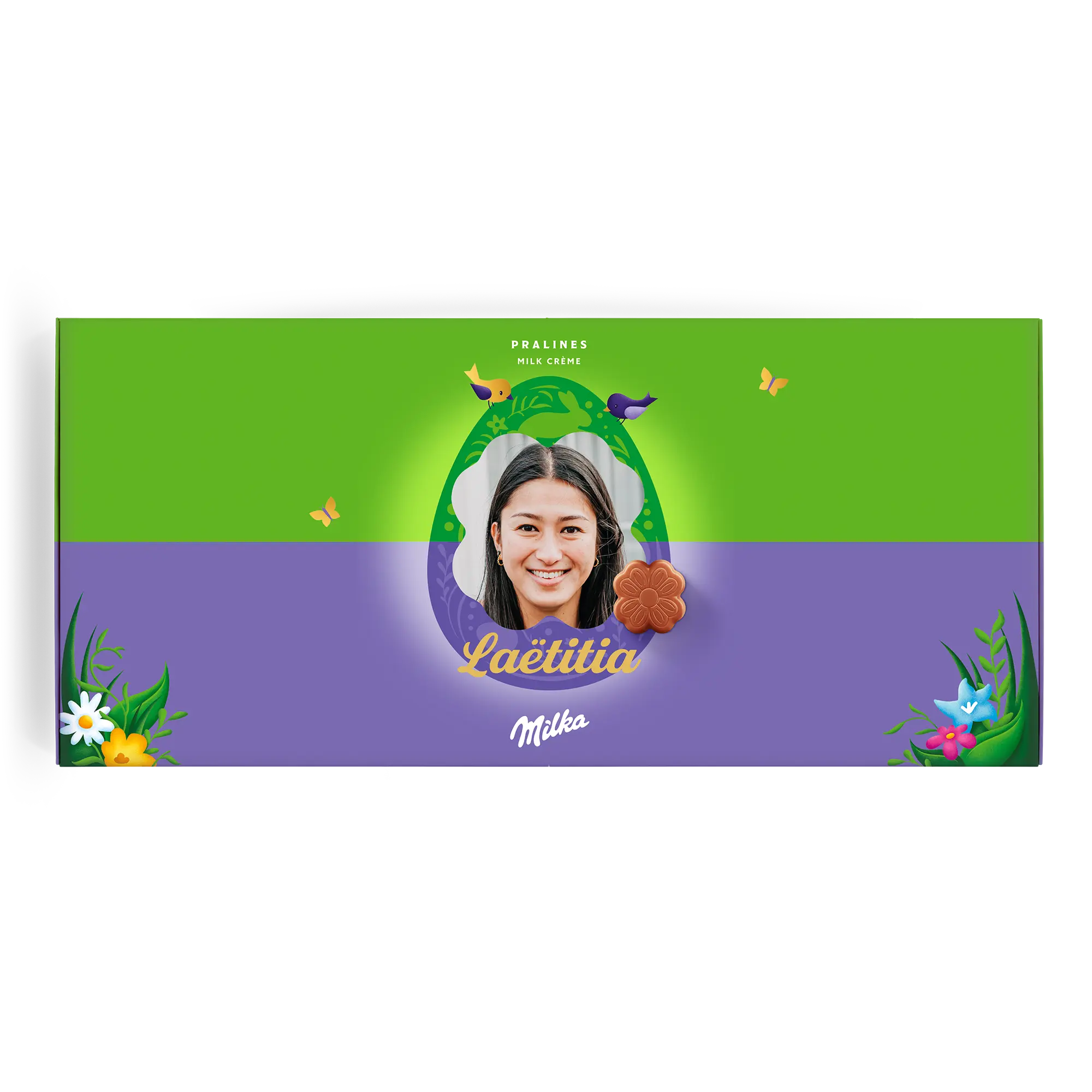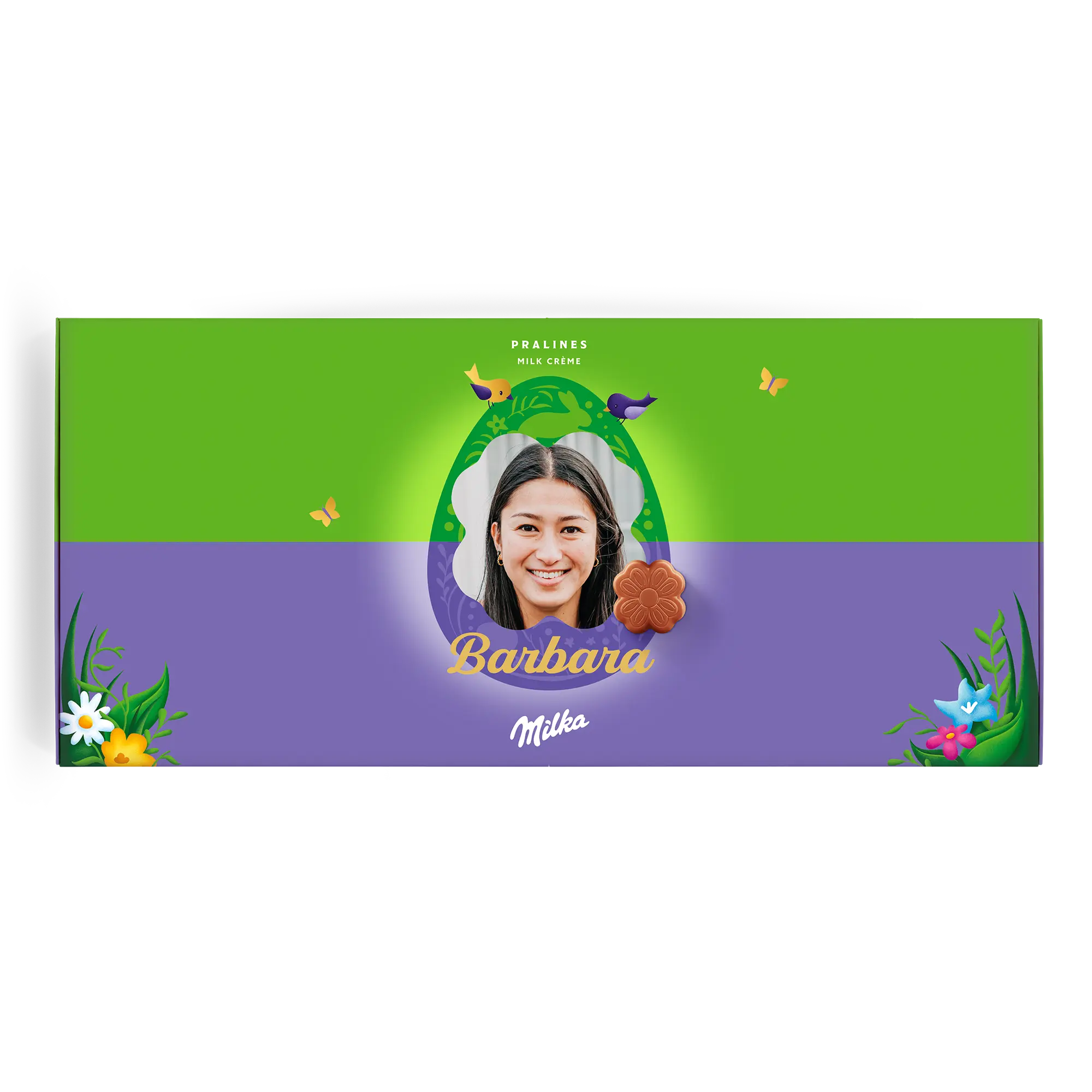 Special Say it with Milka chocolate box for Easter. Delicious pralines with name, photo and a personal message. Surprise your loved ones!More information on the Milka Easter gift:Chocolate: Alpine milk chocolate with cream fillingPraline shape: flowersAmount of pralines: 40Weight: 220 gramsDimensions: 38.7 x 17.6 x 2.4 cmPersonalisation: photo, name and personal messagePrint: picture perfect and in full colourIngredients: Sugar, palm oil, cocoa butter, skimmed MILK POWDER, whey powder (from MILK), cocoa mass, MILK FAT, emulsifiers (SOY lecithin, E476), HAZELNUT PASTE, flavourings. 7% skimmed milk powder in the milk cream filling.Allergens: Contains hazelnuts, milk and soy. May contain other nuts and gluten.Good to know:When the outside temperature is 25 degrees Celsius or above we will not be able to guarantee the quality of the chocolate. If you have any questions regarding your chocolate orders please contact our customer service team.For technical reasons, it is not possible to process Cyrillic, Turkish, Arabic, Asian or special characters.