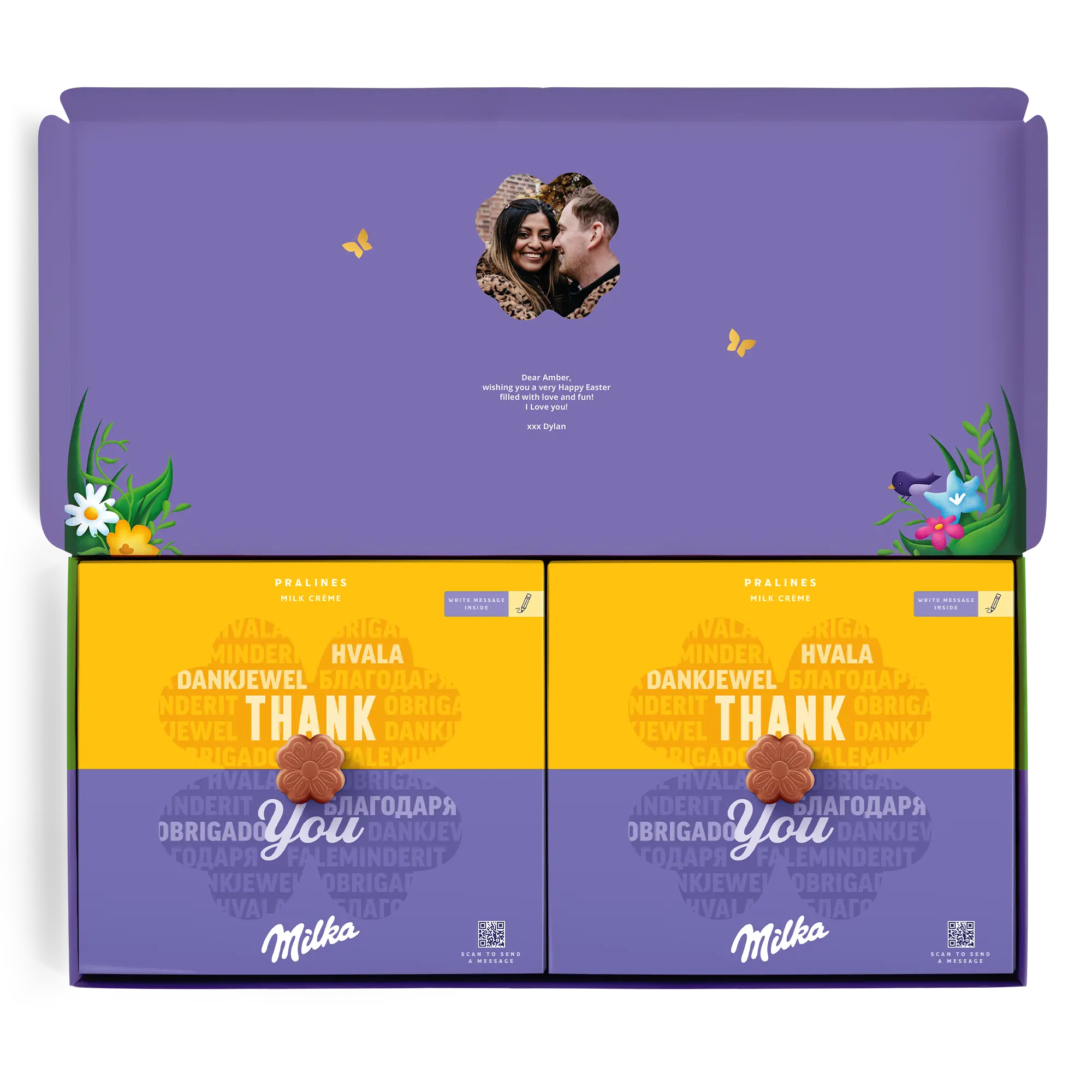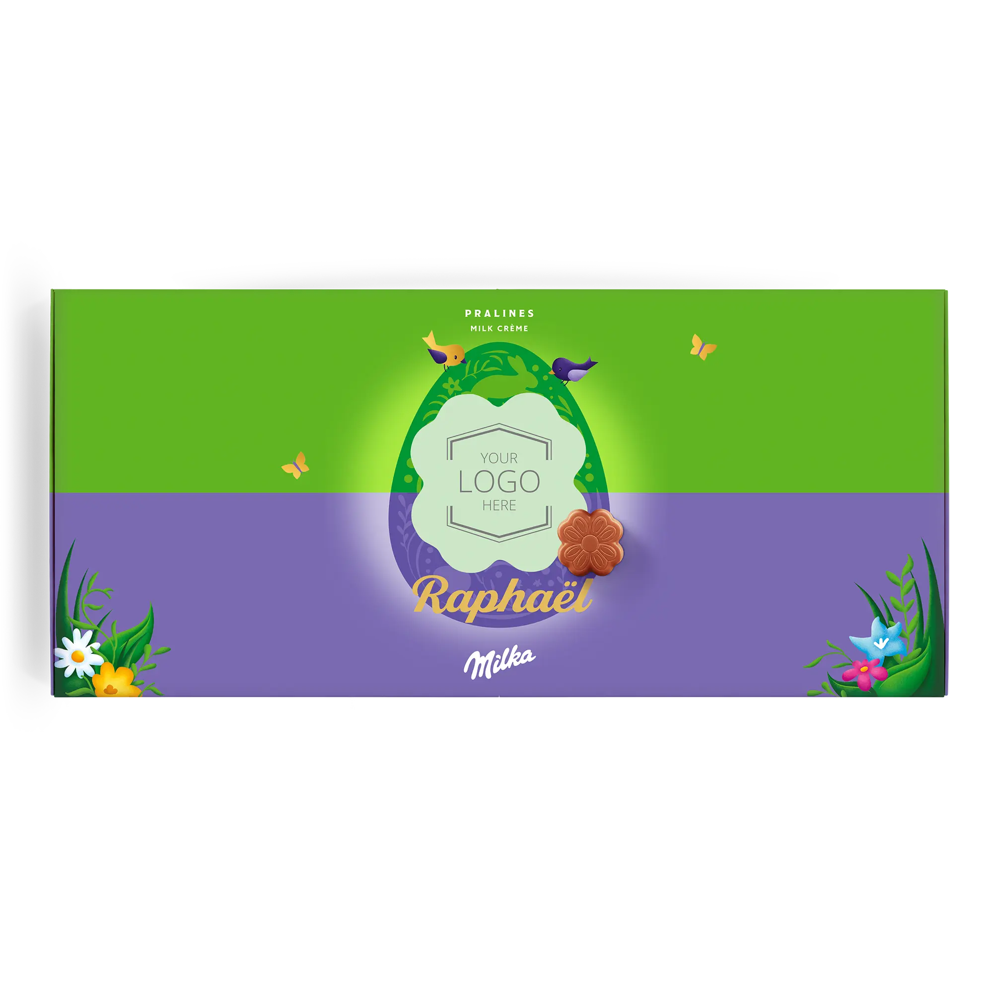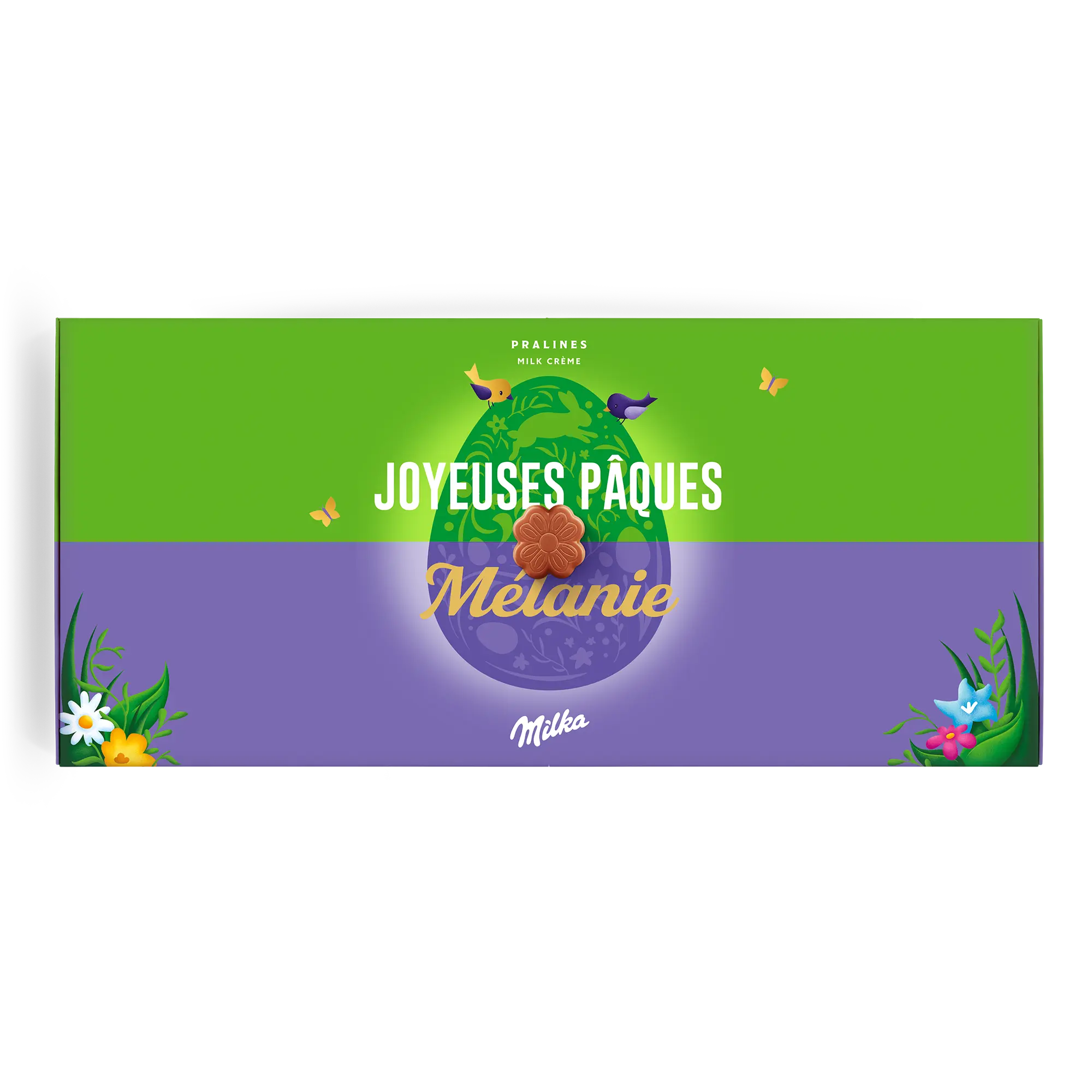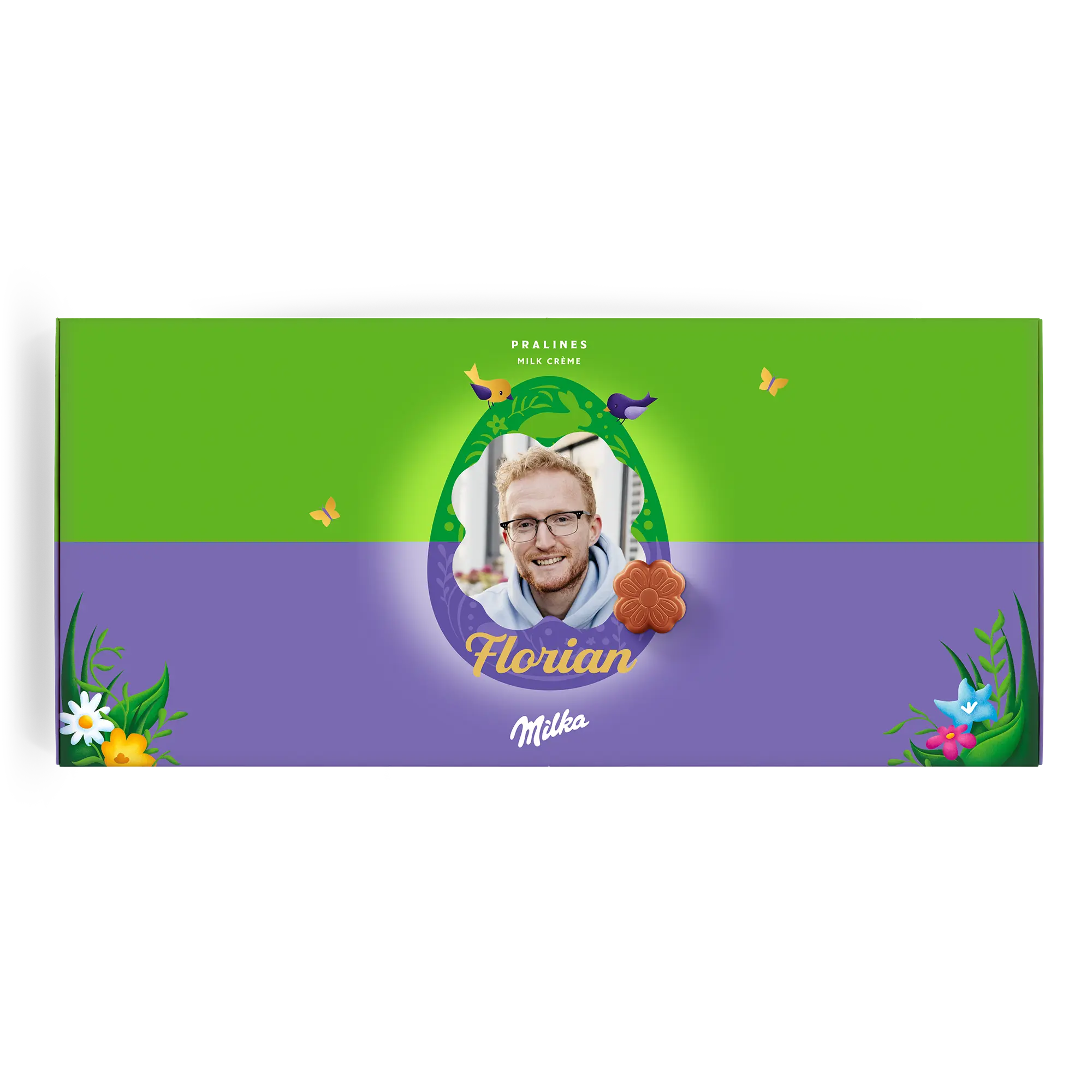Special Say it with Milka chocolate box for Easter. Delicious pralines with name, photo and a personal message. Surprise your loved ones!More information on the Milka Easter gift:Chocolate: Alpine milk chocolate with cream fillingPraline shape: flowersAmount of pralines: 40Weight: 220 gramsDimensions: 38.7 x 17.6 x 2.4 cmPersonalisation: photo, name and personal messagePrint: picture perfect and in full colourIngredients: Sugar, palm oil, cocoa butter, skimmed MILK POWDER, whey powder (from MILK), cocoa mass, MILK FAT, emulsifiers (SOY lecithin, E476), HAZELNUT PASTE, flavourings. 7% skimmed milk powder in the milk cream filling.Allergens: Contains hazelnuts, milk and soy. May contain other nuts and gluten.Good to know:When the outside temperature is 25 degrees Celsius or above we will not be able to guarantee the quality of the chocolate. If you have any questions regarding your chocolate orders please contact our customer service team.For technical reasons, it is not possible to process Cyrillic, Turkish, Arabic, Asian or special characters.