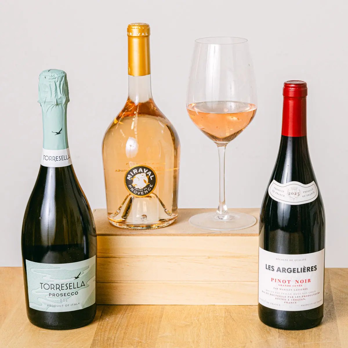 Give the gift of the unique flavors of a good wine with this exquisite set - a complex melody for the palate. An incredible combination for those who dare to try it all: from a bouquet of fresh fruit in the Miraval rosé to undertones of red berries and smoked nuances in the Les Argelières red. Compare their lingering aftertastes with the fresh acidity of the Montecillo white, and bring your wine tasting session to a close with the sparkling Torresella and its incredible aromatic notes.