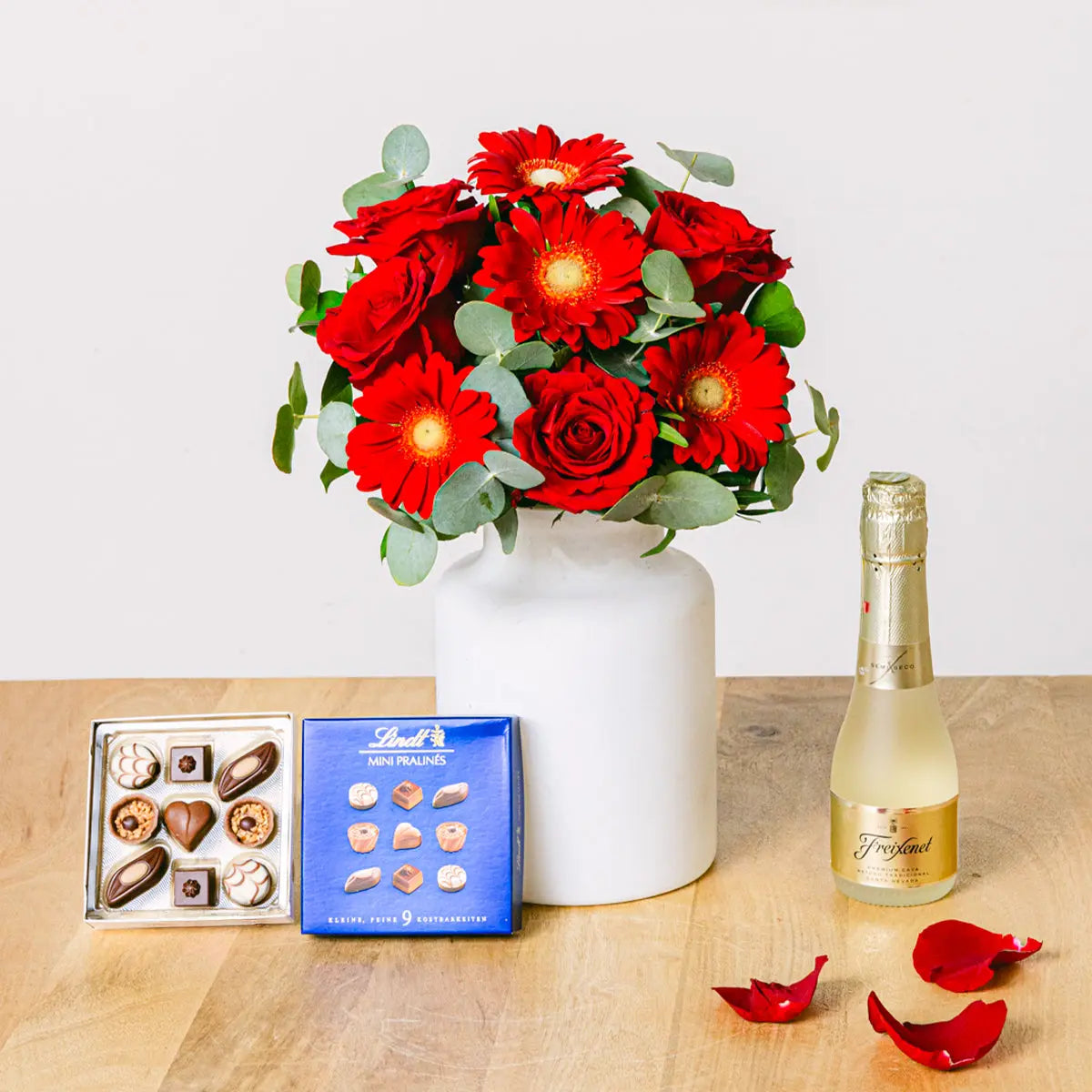Alongside the floral arrangement is a bottle of premium Freixenet cava. Known for its distinguished quality, this sparkling wine offers a fresh and refreshing taste, making it ideal for both large and small celebrations. Paired with a glass, it provides moments of shared joy and festivity. Adding a touch of indulgence, the gift set includes a selection of Mini Lindt Pralines. These gourmet chocolates, crafted by master chocolatiers, feature a variety of delicious flavors and textures, with each bite delivering a taste of luxury. This complete set is thoughtfully curated to bring joy and sophistication to birthdays, anniversaries, or any special moment worth celebrating. Share this high-quality gift with your loved ones and create unforgettable memories.