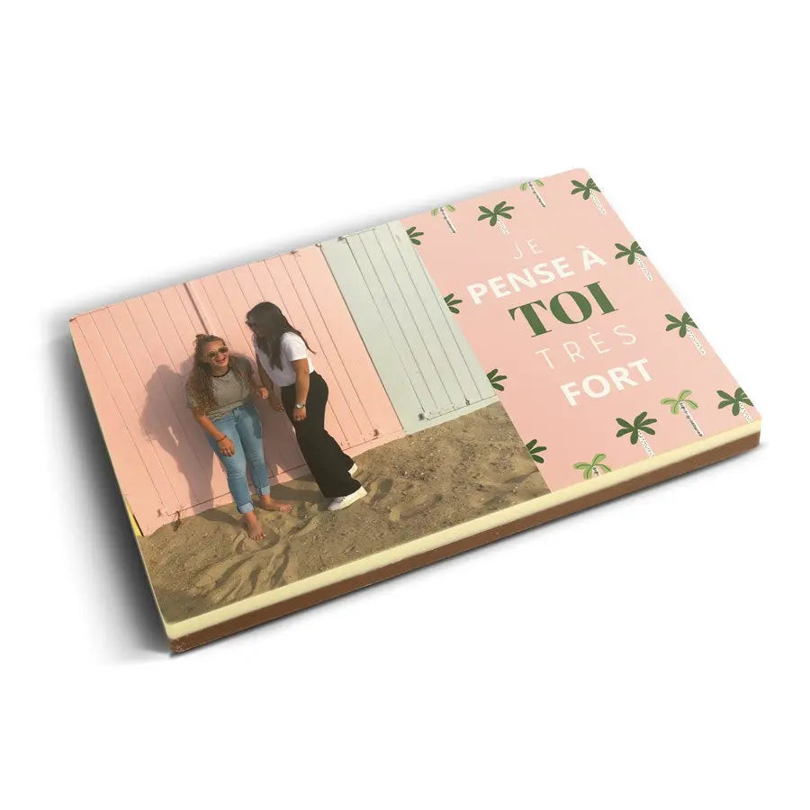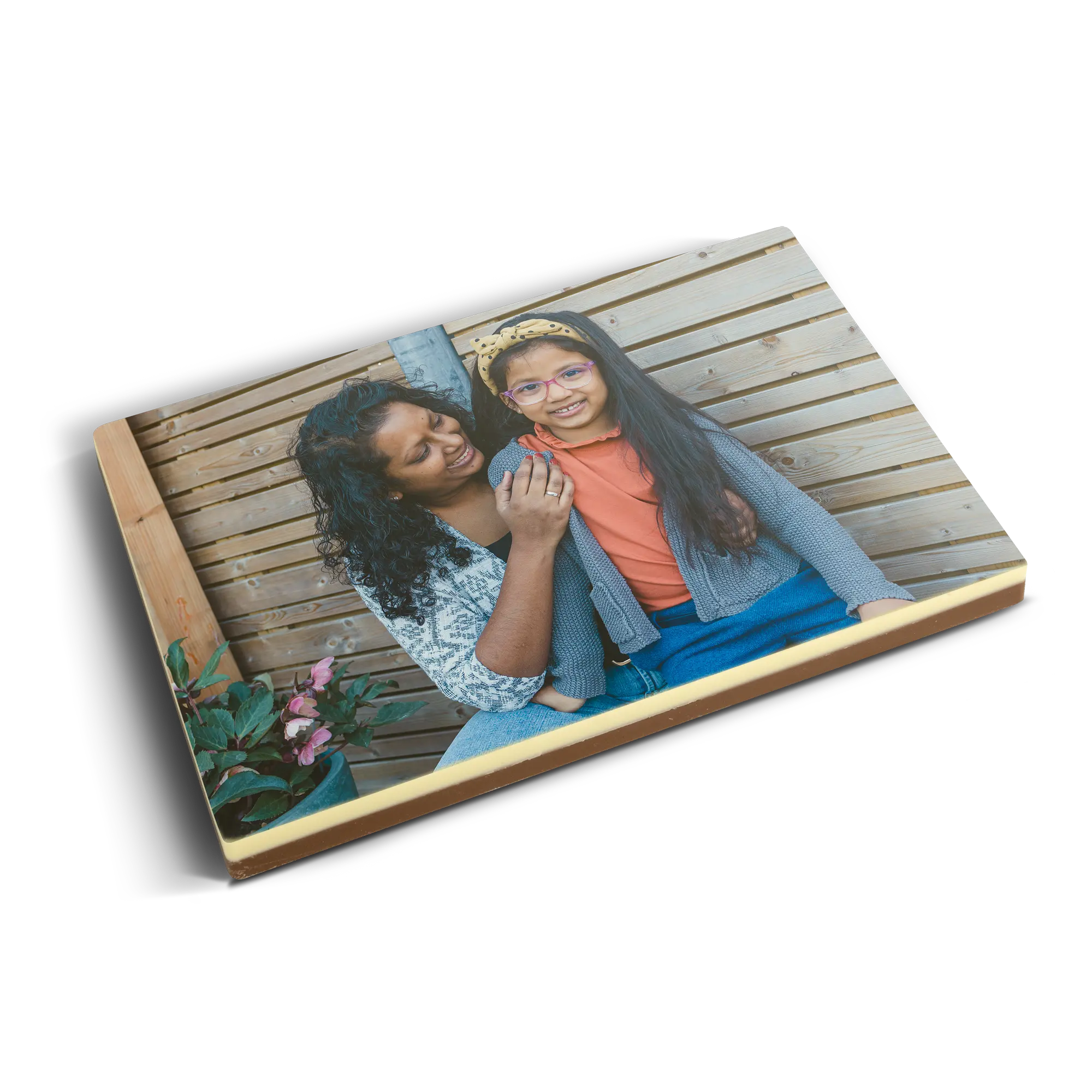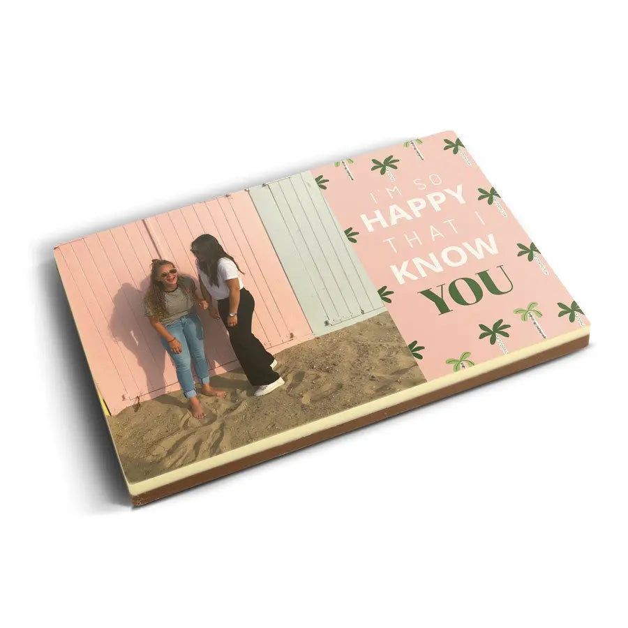 Your most beautiful photo on chocolate! 240 grams of delicious Callebaut chocolate printed with photo. The most fun chocolate gift!More information on the photo on chocolate:Chocolate flavour: milk with a white topcoat Size: 16.3 x 10.8 x 1.2 cm Weight: 240 grams of chocolatePersonalisation: printed with photo and logo Print: full-colour edible printIf temperatures are at 25°C or over, we would advise adding a cooling element to your order. Storage advice: Can be stored for up to 10 weeks in a cool, dark space at between 14-18°C. Allergy information: contains soy, milk and may contain traces of nuts.Ingredients:Milk chocolate: sugar, cocoa butter, full-fat powdered milk, cocoa mass, emulsifier (soy lecithin), natural vanilla aroma. At least 34% cocoa solids. White chocolate: sugar, cocoa butter, full-fat powdered milk, emulsifier (soy lecithin), natural vanilla aroma. At least 29% cocoa solids.