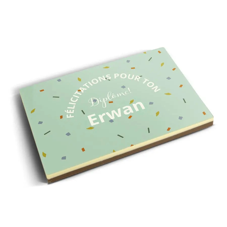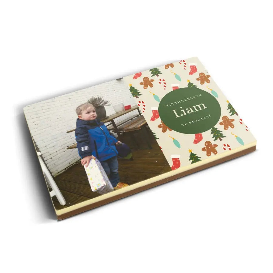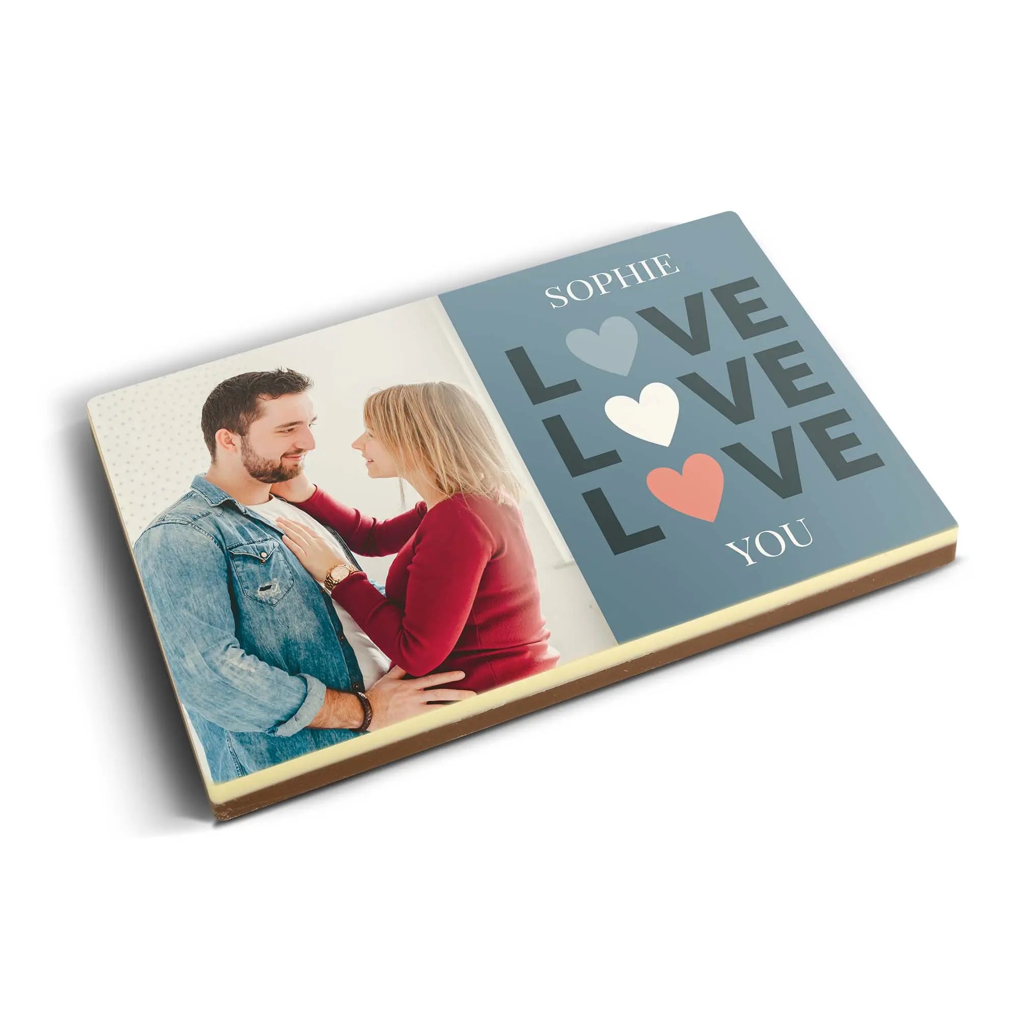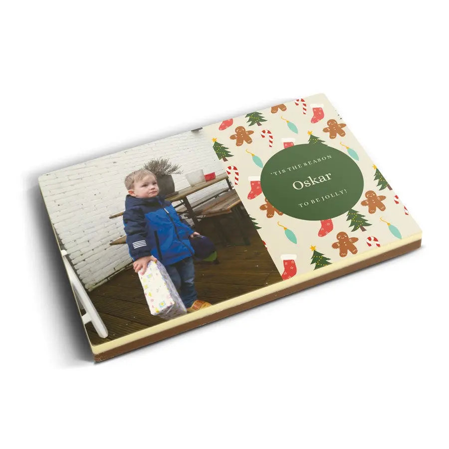 Your most beautiful photo on chocolate! 240 grams of delicious Callebaut chocolate printed with photo. The most fun chocolate gift!More information on the photo on chocolate:Chocolate flavour: milk with a white topcoat Size: 16.3 x 10.8 x 1.2 cm Weight: 240 grams of chocolatePersonalisation: printed with photo and logo Print: full-colour edible printIf temperatures are at 25°C or over, we would advise adding a cooling element to your order. Storage advice: Can be stored for up to 10 weeks in a cool, dark space at between 14-18°C. Allergy information: contains soy, milk and may contain traces of nuts.Ingredients:Milk chocolate: sugar, cocoa butter, full-fat powdered milk, cocoa mass, emulsifier (soy lecithin), natural vanilla aroma. At least 34% cocoa solids. White chocolate: sugar, cocoa butter, full-fat powdered milk, emulsifier (soy lecithin), natural vanilla aroma. At least 29% cocoa solids.