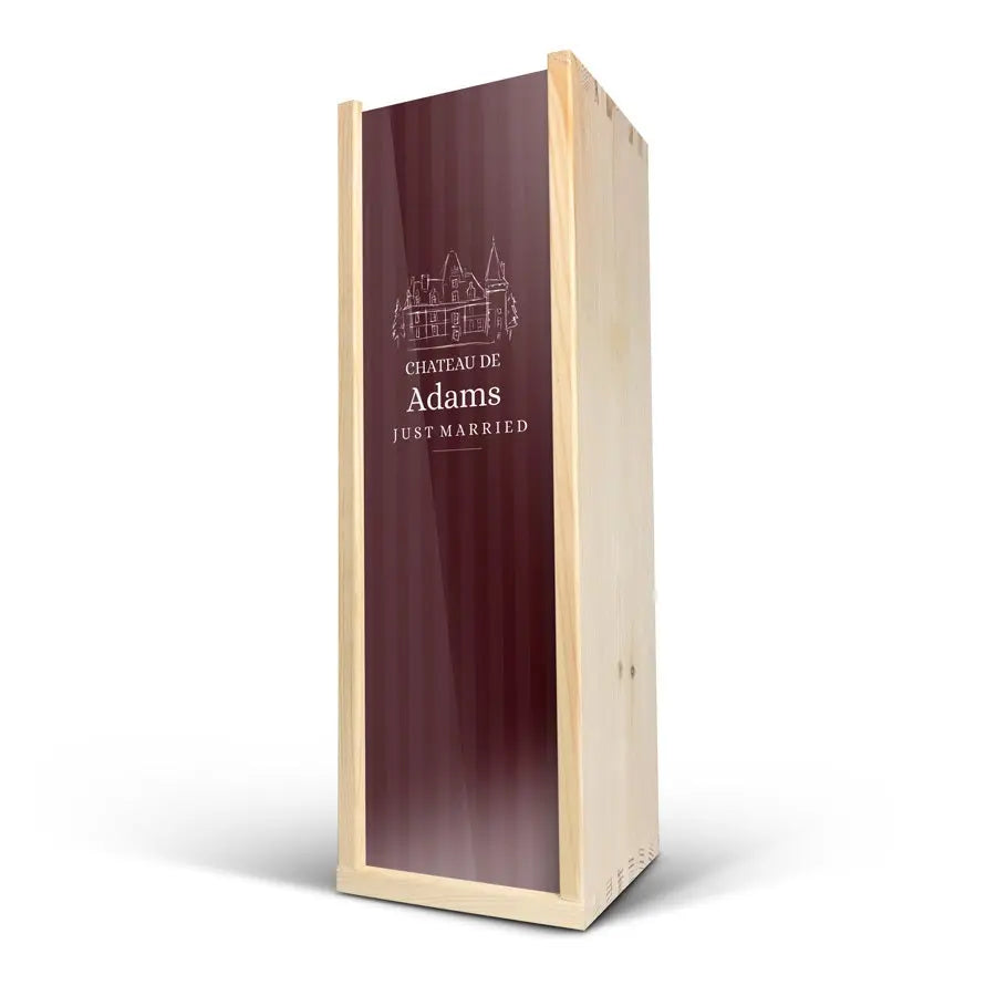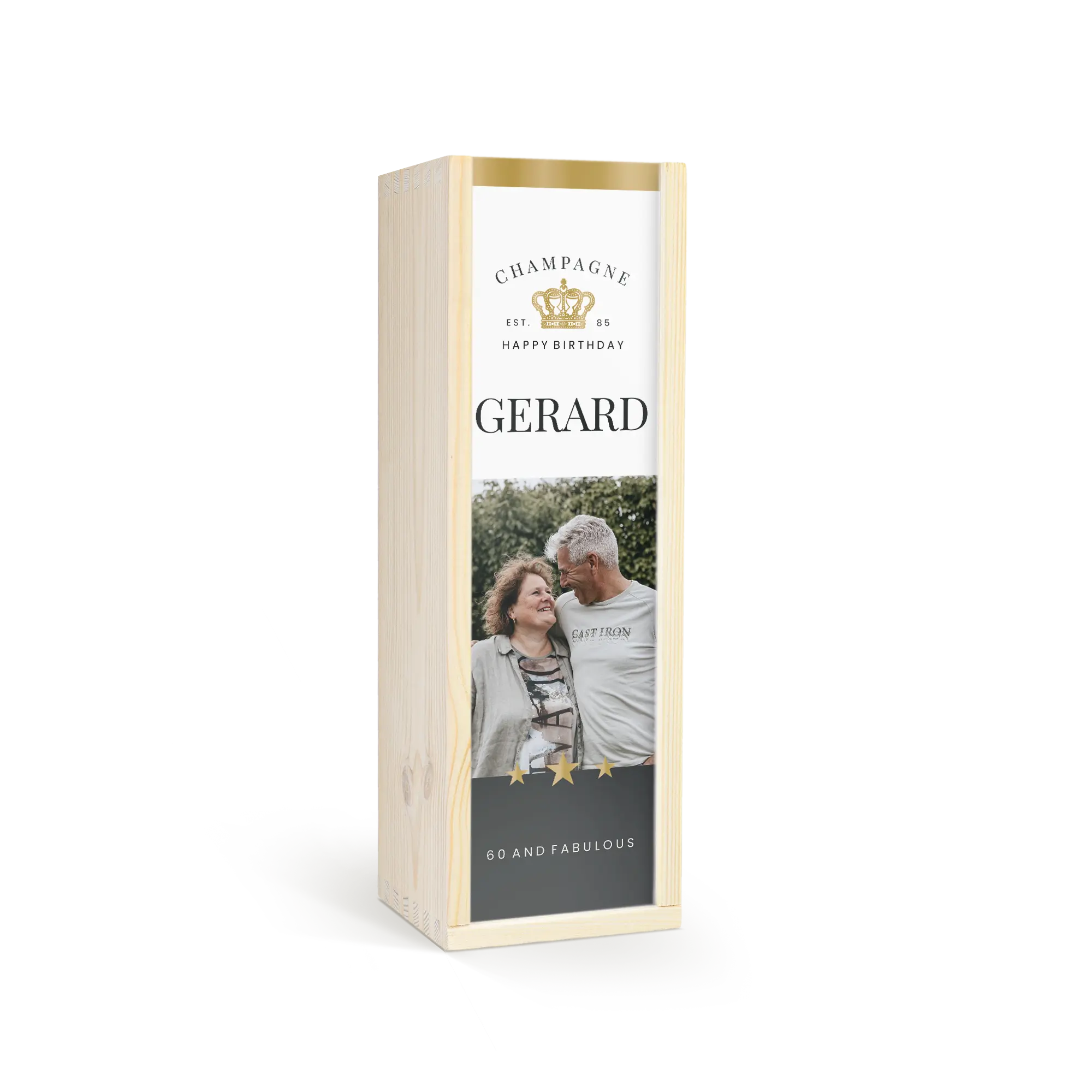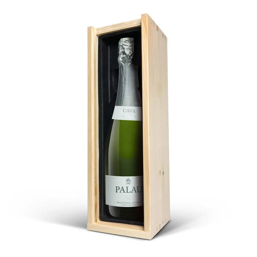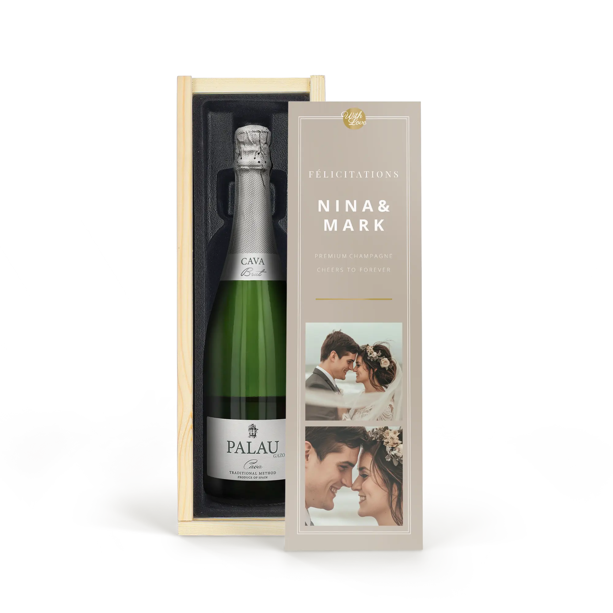 A delicious bottle of Cava Palau Gazo sparkling wine in engraved case. Personalise as you wish with your text in a unique design!More information on the luxurious wine case:Personalisation: with photo, name, logo or collagePersonalisation placement: on the cover of the wooden casePersonalisation method: high-quality engraving in the most beautiful coloursDimensions of the wooden case: 36,5 x 12 x 11 cmDimensions of the wooden lid: 35,6 x 10,5 x 0,3 cmThe wood of the case is FSC certified.More information about this champagne: Name: Cava Palau GazoWine type: CavaContent: 750 mlCountry: SpainGrape: Parellada, Macabeo, Xarel-LoCharacter: Fine bubbles, a soft, fruity flavour featuring aromas of green apples. A smooth, rounded aftertaste. Ideal for parties and receptions.