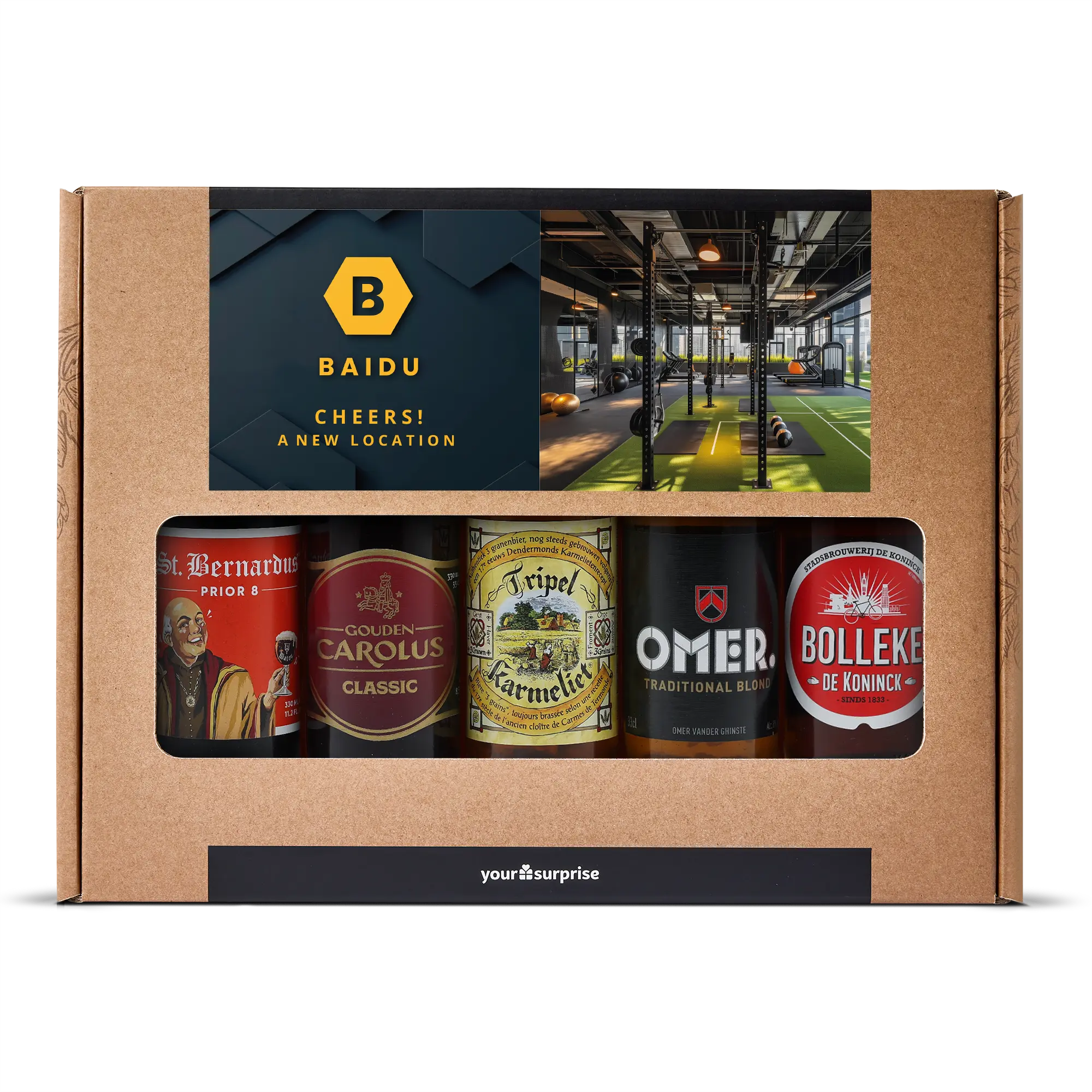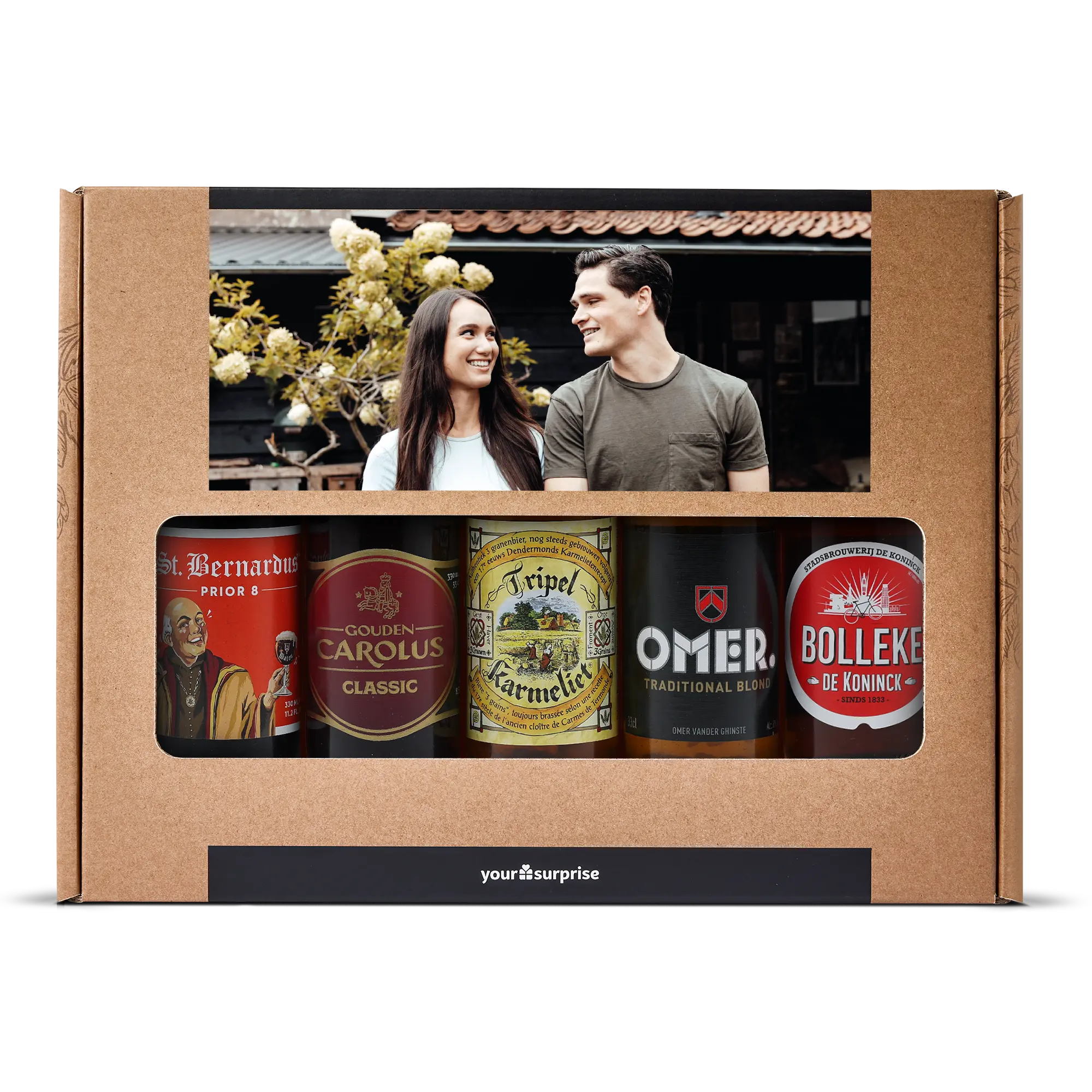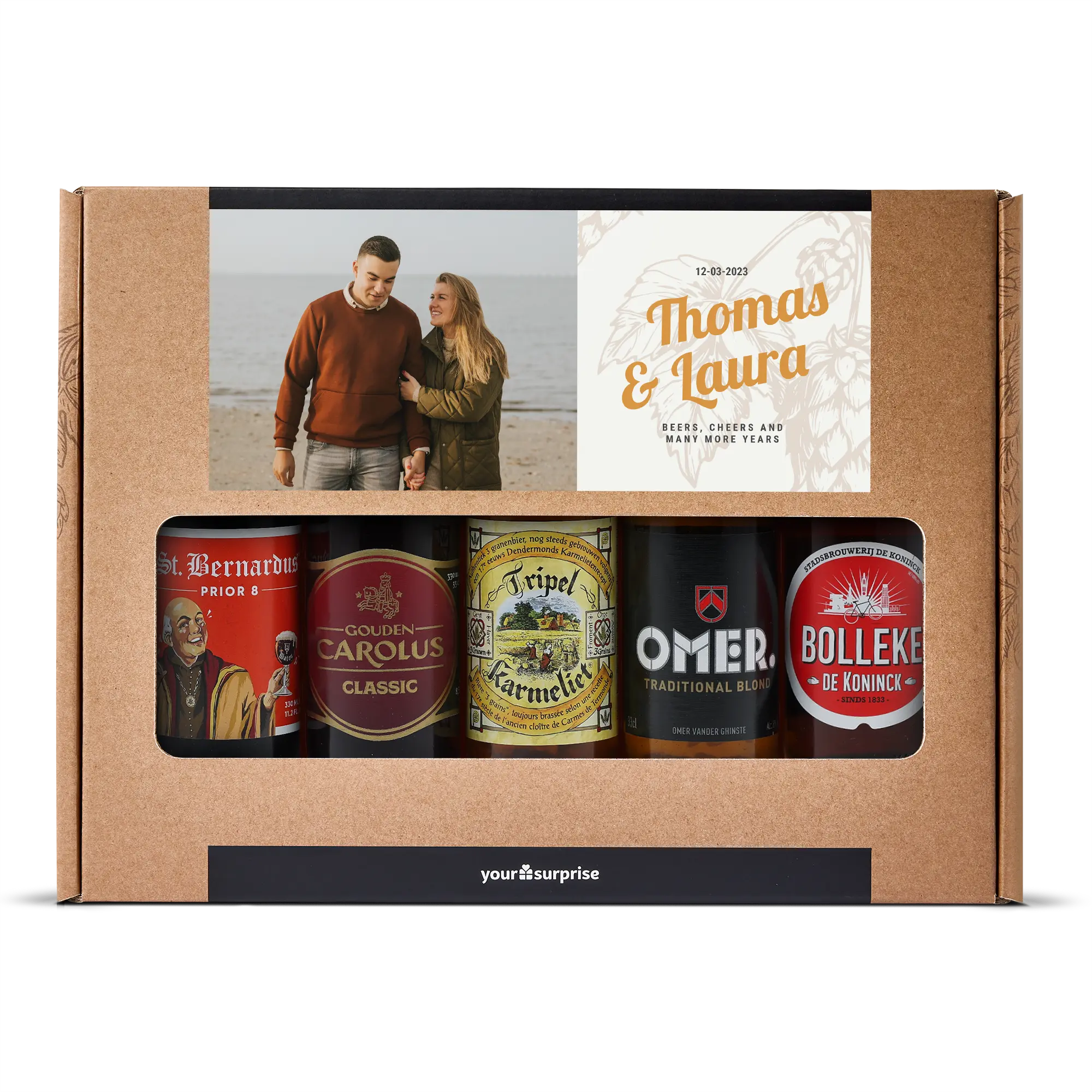 A delicious beer gift set with your own photo and text, filled with 5 different Belgian beers. With a personalised design!