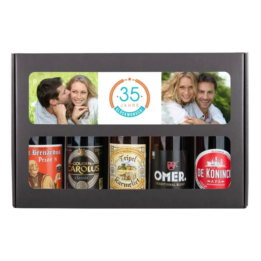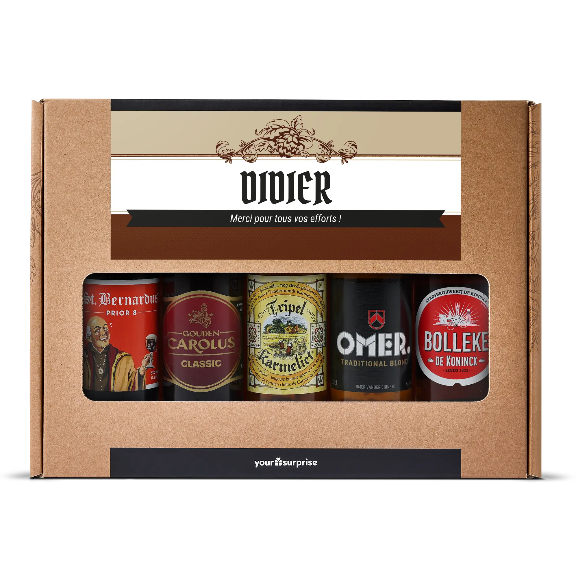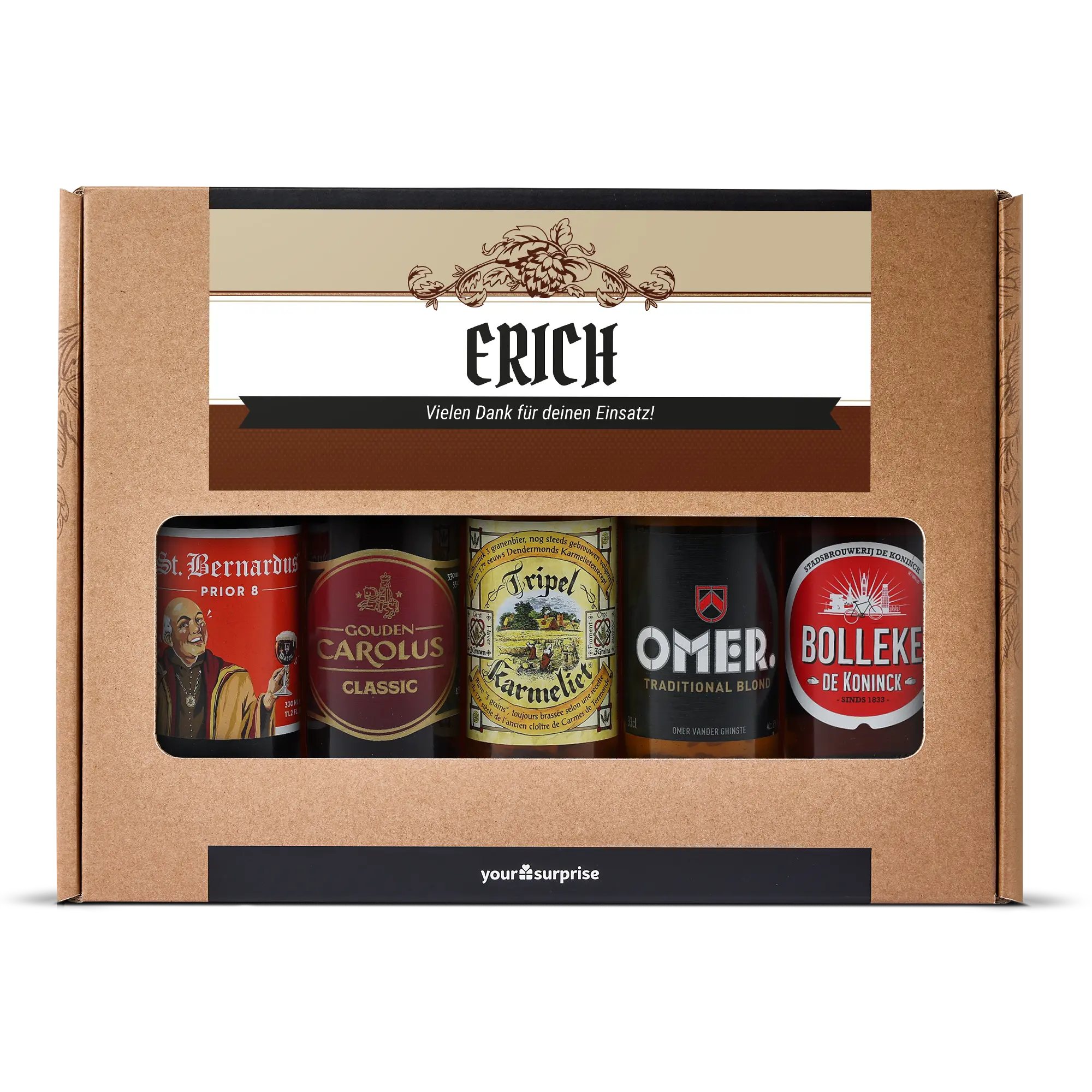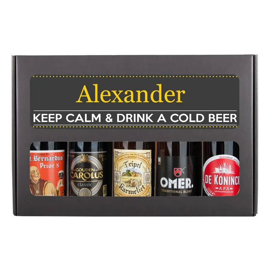 A delicious beer gift set with your own photo and text, filled with 5 different Belgian beers. With a personalised design!