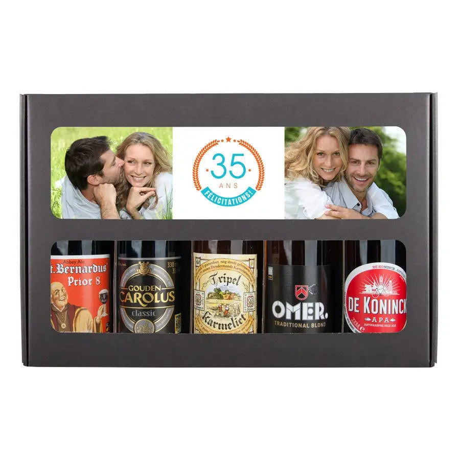 Complements:Assortment of five distinct Belgian beers, including St. Bernardus Prior 8, Gouden Carolus Classic, Tripel Karmeliet, Omer, and Bolleke De Koninck, all presented in a custom photo-printed box. (Optional: artisanal sausage, cheese cubes, dried fruits, and nuts for a complete tasting experience).