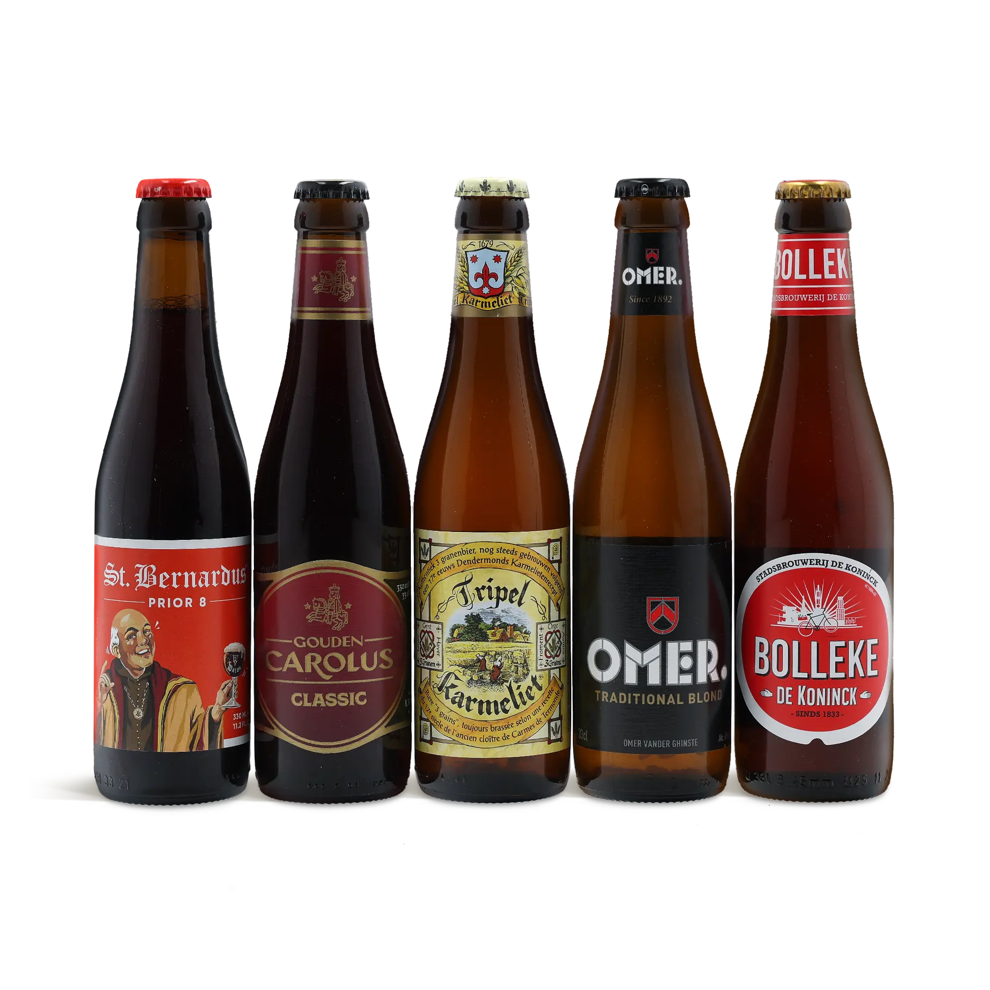 - Gift set contents: Gouden Carolus Classic (8.5%), St. Bernardus (8.0%), Omer (8.0%), Tripel Karmeliet (8.0%), De Koninck (5.0%).