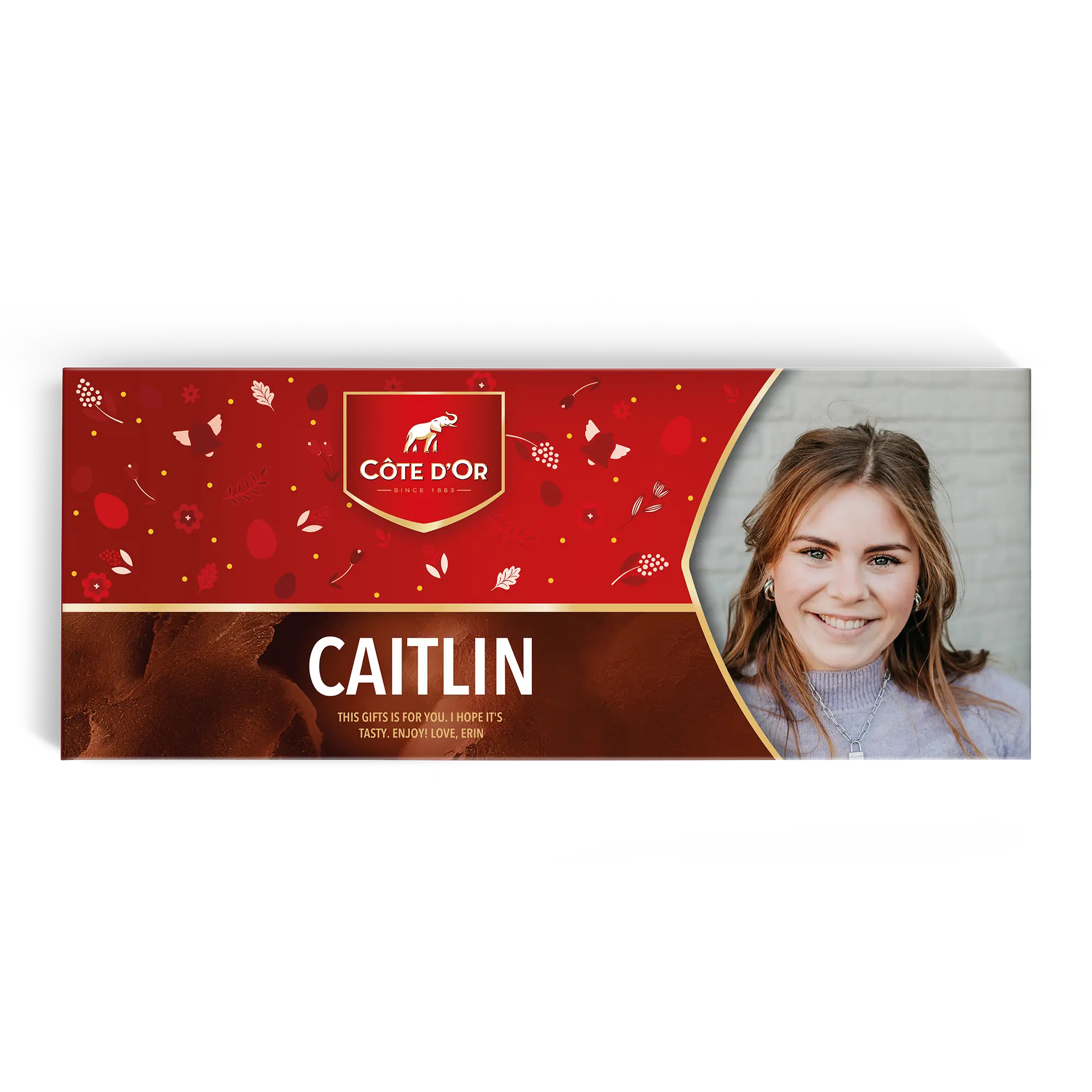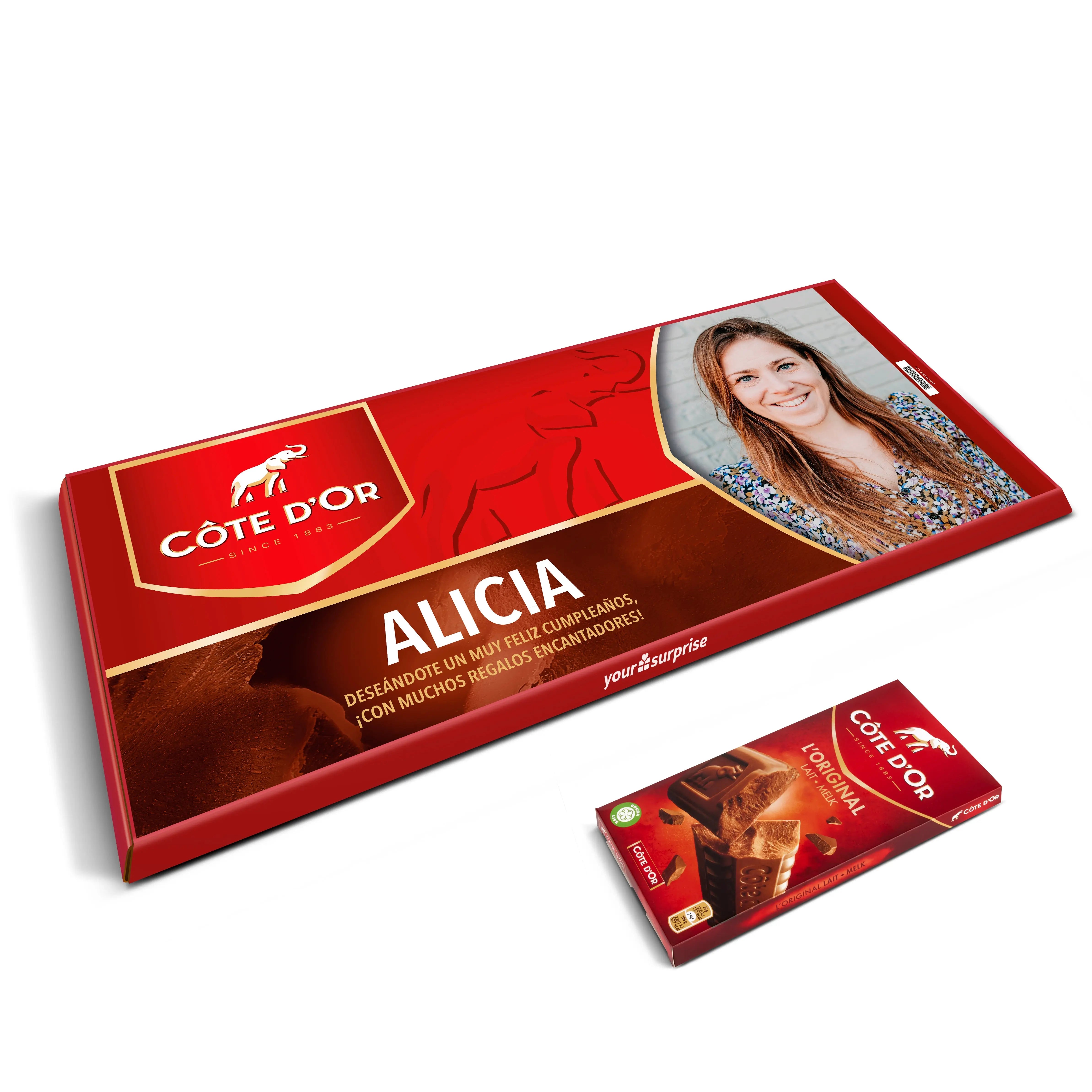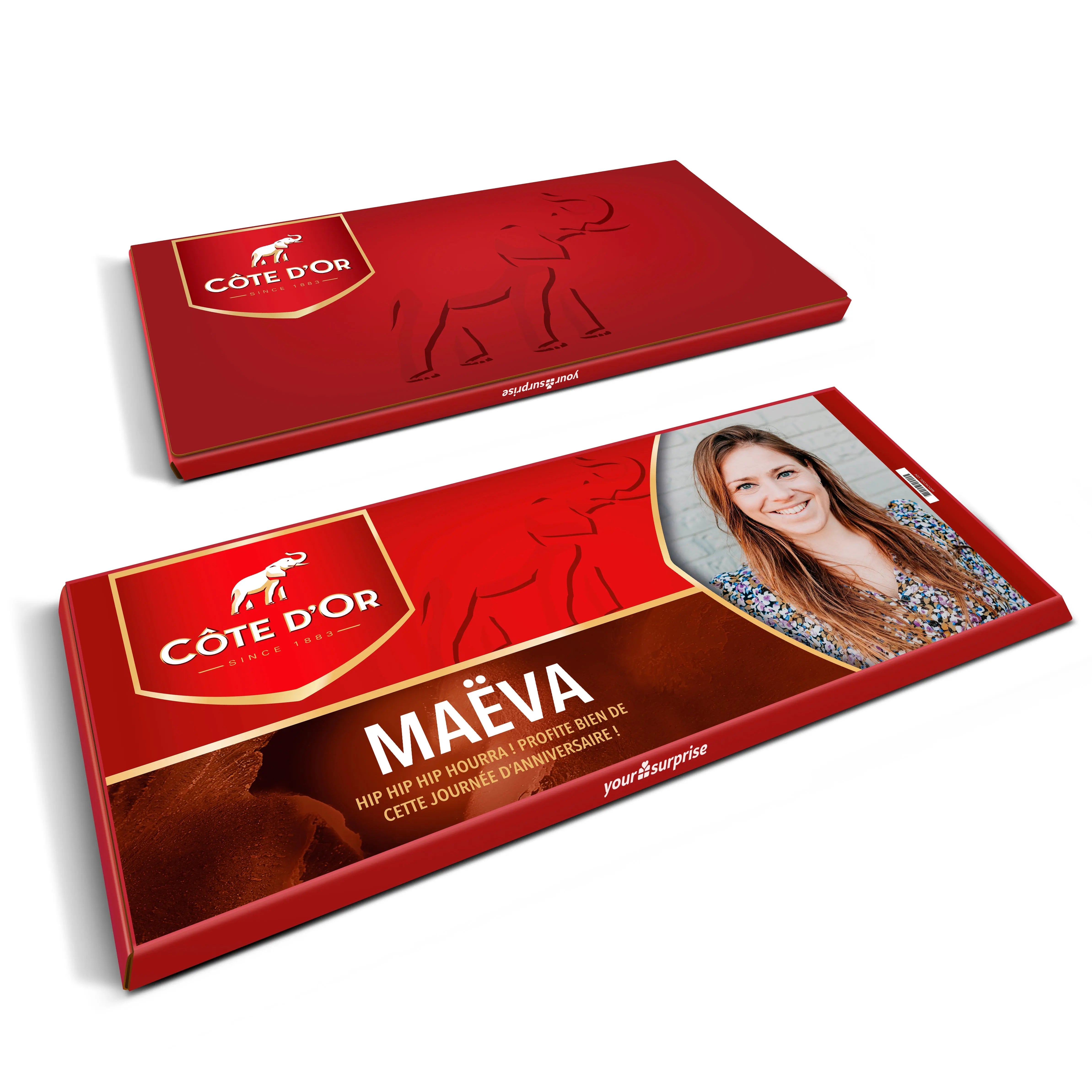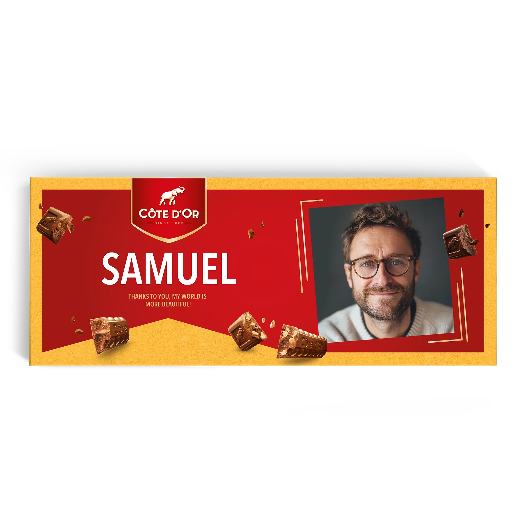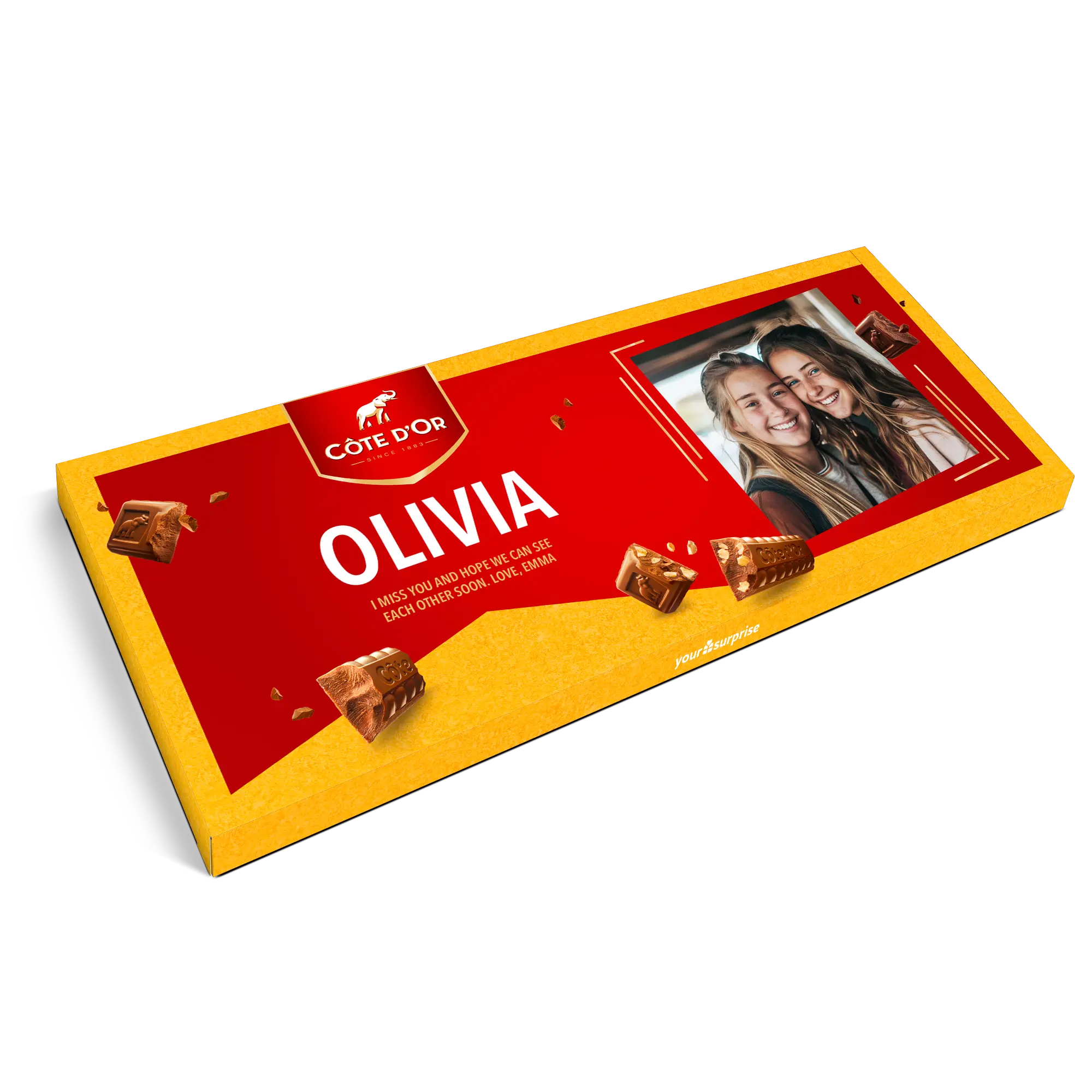 This XXL Côte d'Or Belgian chocolate bar contains no less than 5 bars of Côte d'Or chocolate. Truly unique with the photo and/or name of your choice!More information on the XXL Côte d'Or chocolate bar:Dimensions: 60 x 26 x 2 cmIncludes: 2 Côte d'Or L' Original Milk bars, 2 Côte d'Or Milk & Hazelnut bars and 1 Côte d'Or L' Original Dark bar (contents may vary!)Weight: 5 x 200 gramsPersonalisation: with name, photo and/or textPrint: picture perfect and in full colourAdditional information: For technical reasons, it is not possible to add Cyrillic, Greek, Asian, Arabic, Turkish or special characters.Important information: If a specific flavour is temporarily out of stock, we will fill the XXL Côte d'Or bar with other flavours.Côte d'Or L'Original MilkAt least 33% cocoa.Ingredients: Sugar, cocoa mass, skimmed milk powder, cocoa butter, whey powder (from milk), milk fat, emulsifier (soy lecithin), aromas.Allergens: May contain nuts.Côte d'Or L'Original DarkAt least 46% cocoa.Ingredients: Sugar, cocoa mass, cocoa butter, emulsifier (soy lecithin), aromas, full-fat milk powder.Allergens: May contain nuts.Côte d'Or L'Original Milk HazelnutAt least 33% cocoa.Ingredients: Sugar, cocoa mass, hazelnut (14%), skimmed milk powder, cocoa powder, whey powder (from milk), milk fat, emulsifier (soy lecithin), aromas.Allergens: May contain other nuts.Please note:When the outside temperature is 25 degrees Celsius or above we will not be able to guarantee the quality of the chocolate.