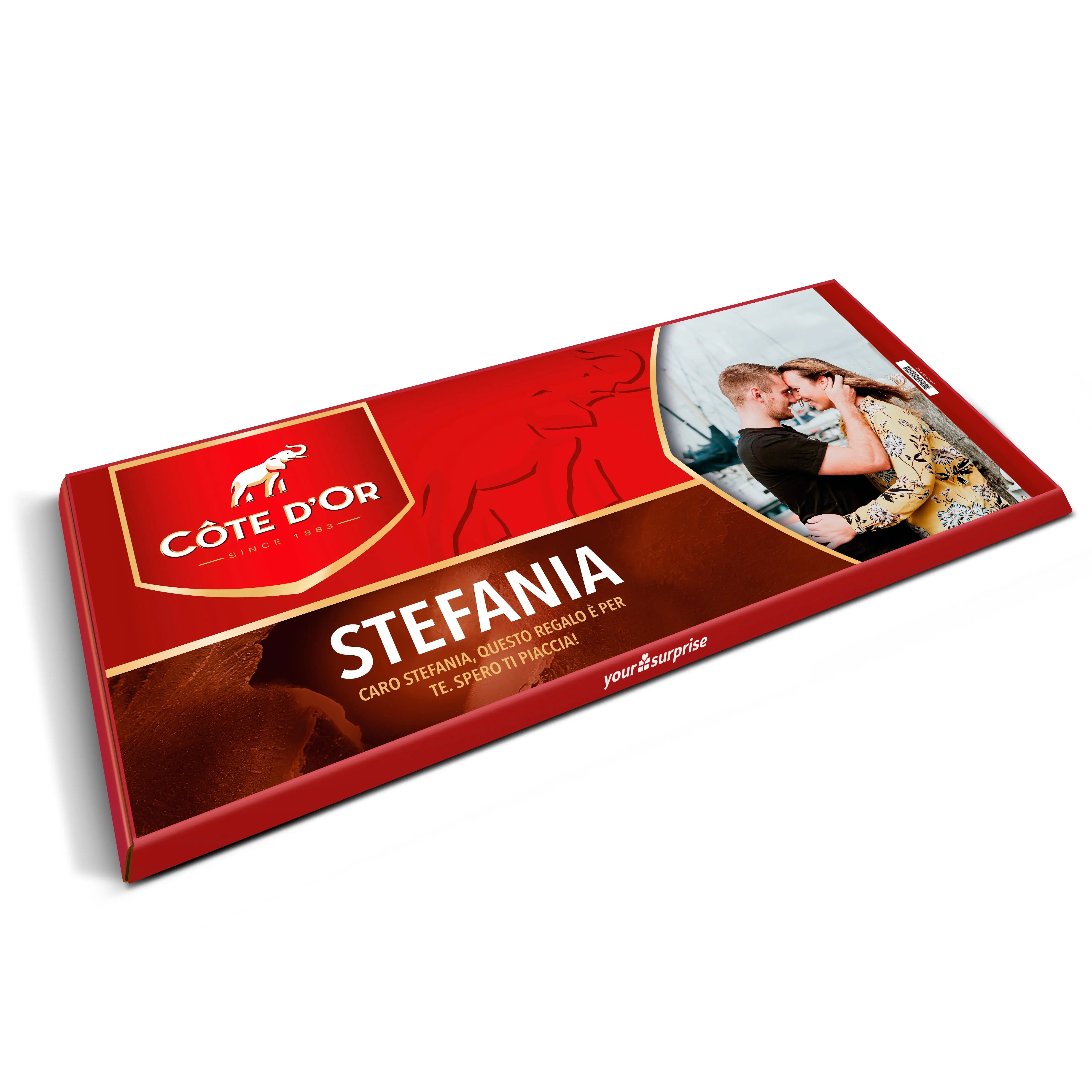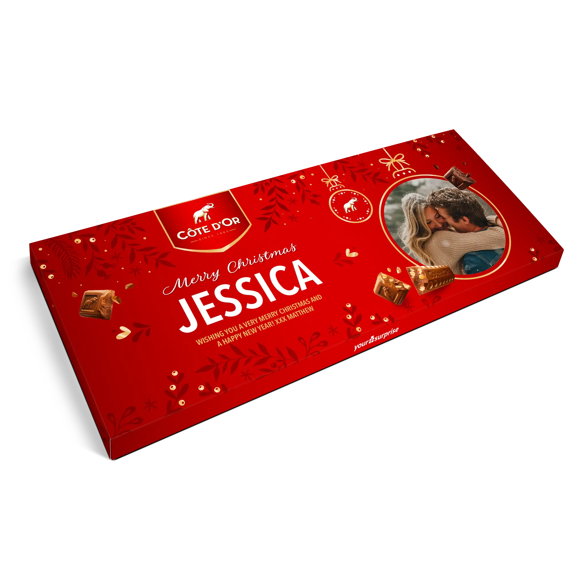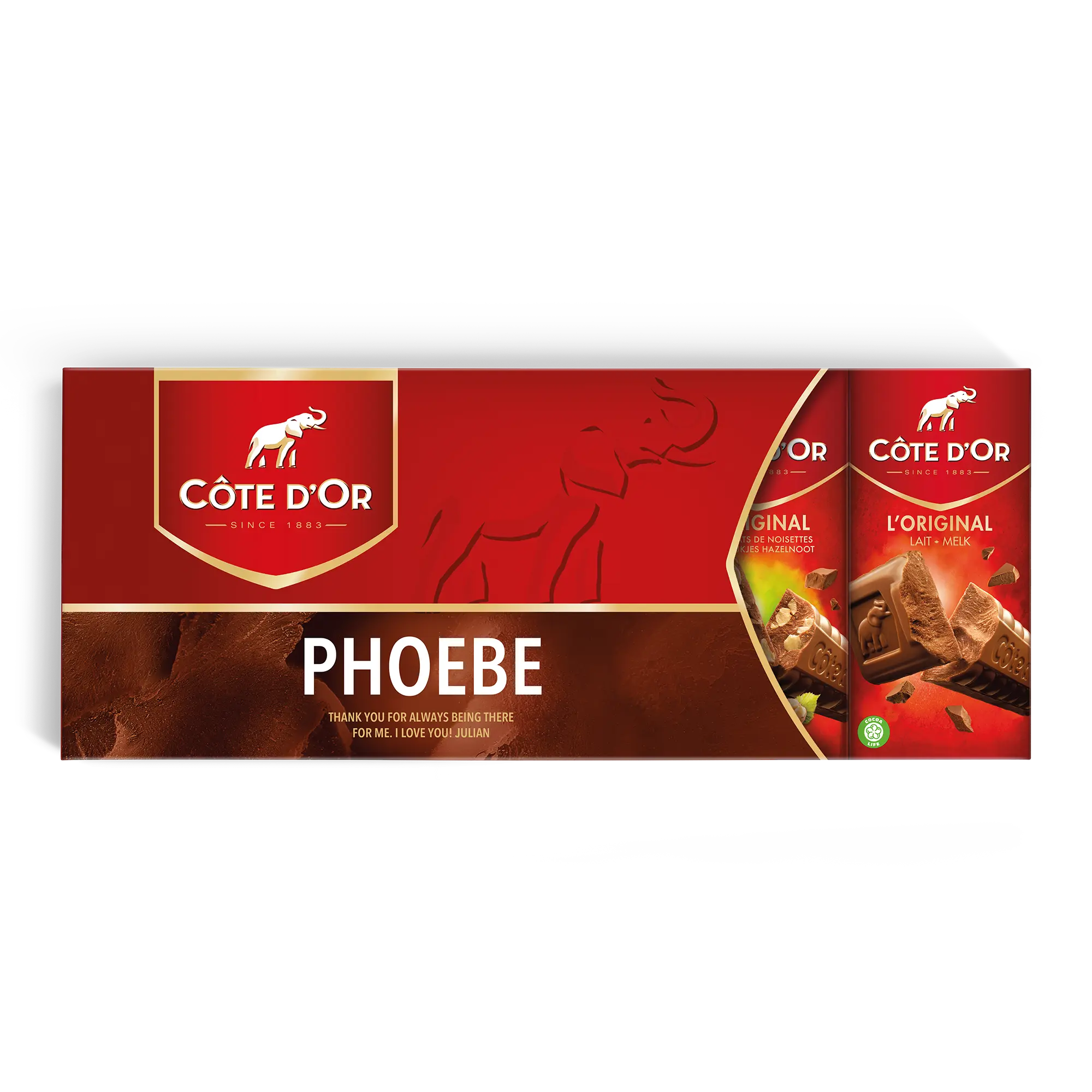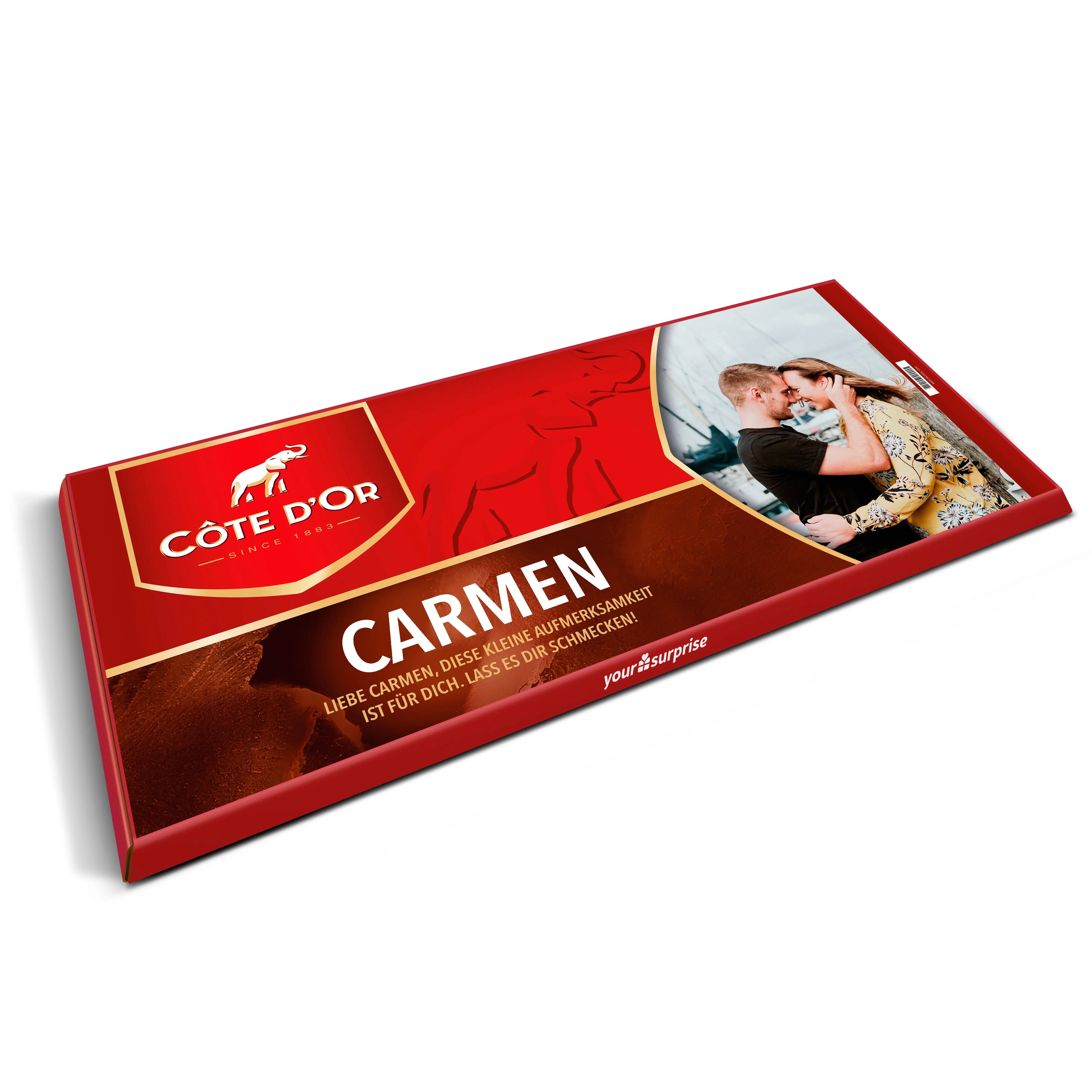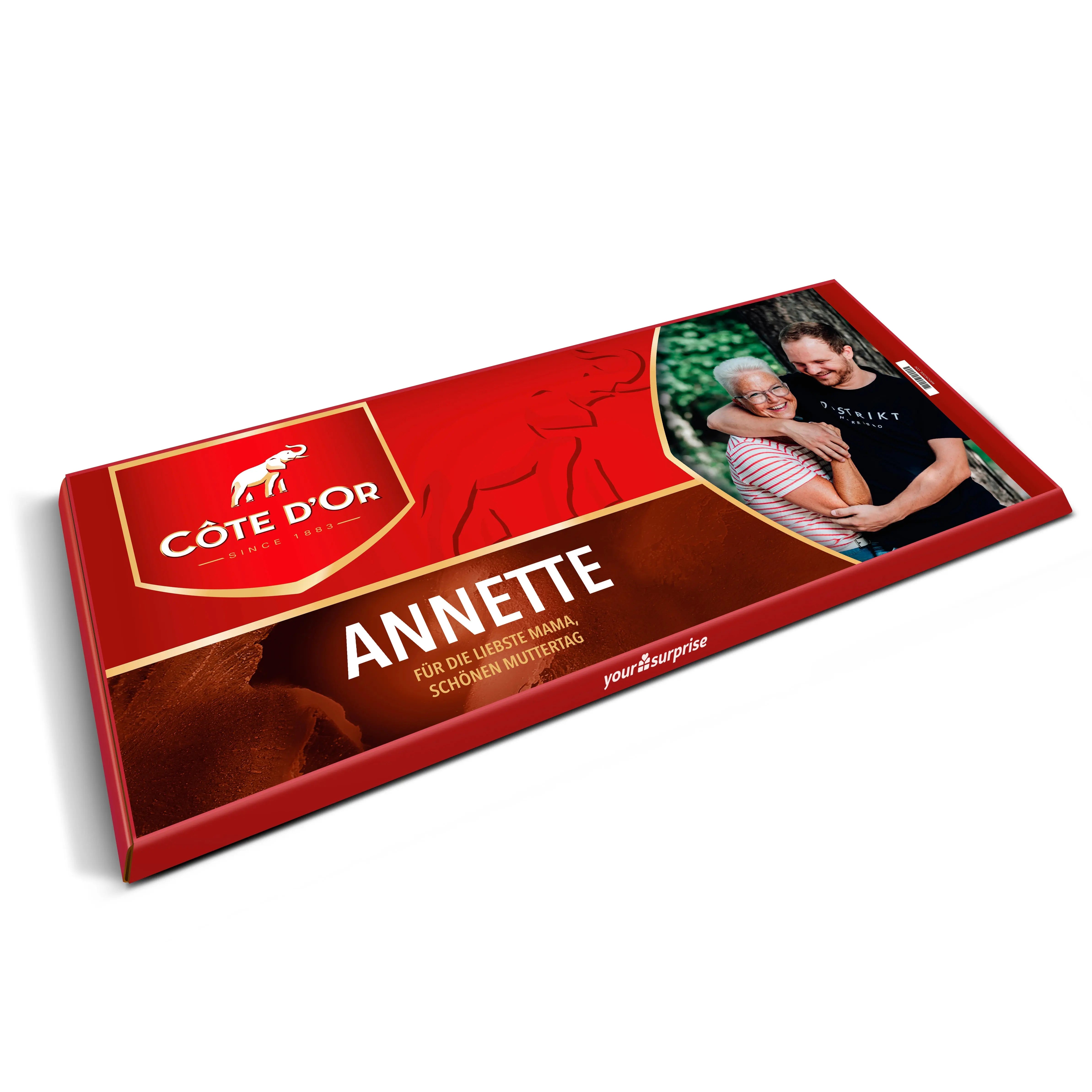 This XXL Côte d'Or Belgian chocolate bar contains no less than 5 bars of Côte d'Or chocolate. Truly unique with the photo and/or name of your choice!More information on the XXL Côte d'Or chocolate bar:Dimensions: 60 x 26 x 2 cmIncludes: 2 Côte d'Or L' Original Milk bars, 2 Côte d'Or Milk & Hazelnut bars and 1 Côte d'Or L' Original Dark bar (contents may vary!)Weight: 5 x 200 gramsPersonalisation: with name, photo and/or textPrint: picture perfect and in full colourAdditional information: For technical reasons, it is not possible to add Cyrillic, Greek, Asian, Arabic, Turkish or special characters.Important information: If a specific flavour is temporarily out of stock, we will fill the XXL Côte d'Or bar with other flavours.Côte d'Or L'Original MilkAt least 33% cocoa.Ingredients: Sugar, cocoa mass, skimmed milk powder, cocoa butter, whey powder (from milk), milk fat, emulsifier (soy lecithin), aromas.Allergens: May contain nuts.Côte d'Or L'Original DarkAt least 46% cocoa.Ingredients: Sugar, cocoa mass, cocoa butter, emulsifier (soy lecithin), aromas, full-fat milk powder.Allergens: May contain nuts.Côte d'Or L'Original Milk HazelnutAt least 33% cocoa.Ingredients: Sugar, cocoa mass, hazelnut (14%), skimmed milk powder, cocoa powder, whey powder (from milk), milk fat, emulsifier (soy lecithin), aromas.Allergens: May contain other nuts.Please note:When the outside temperature is 25 degrees Celsius or above we will not be able to guarantee the quality of the chocolate.