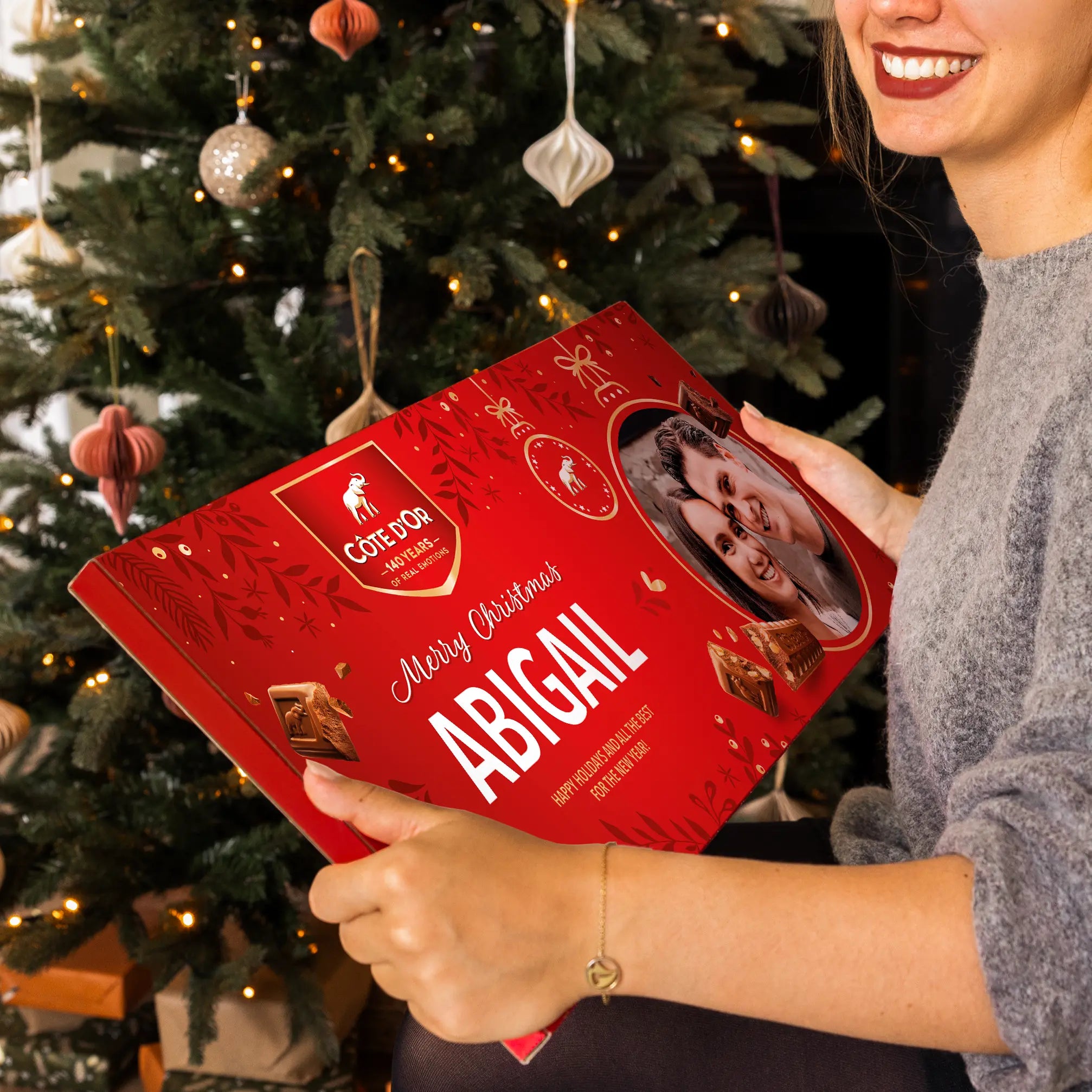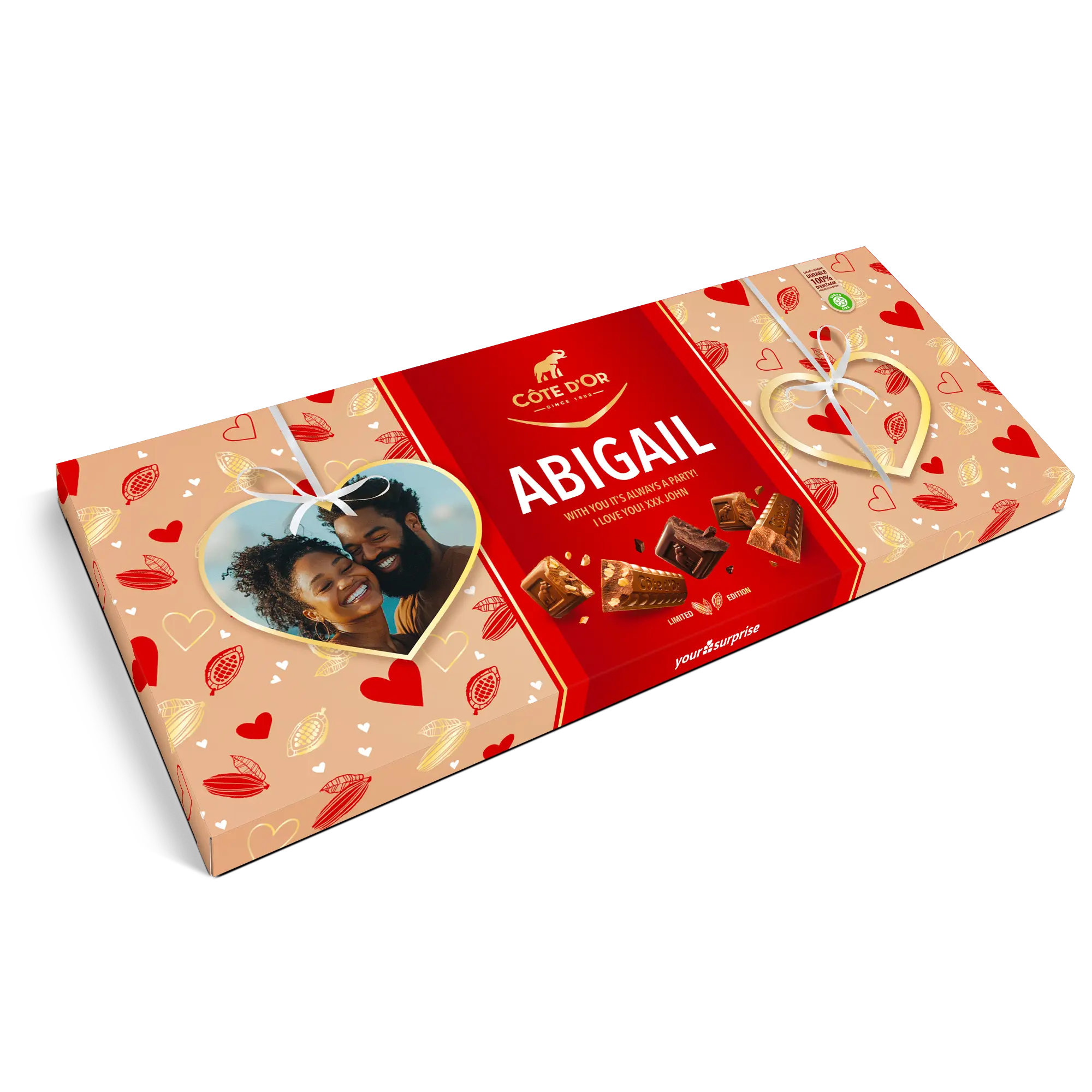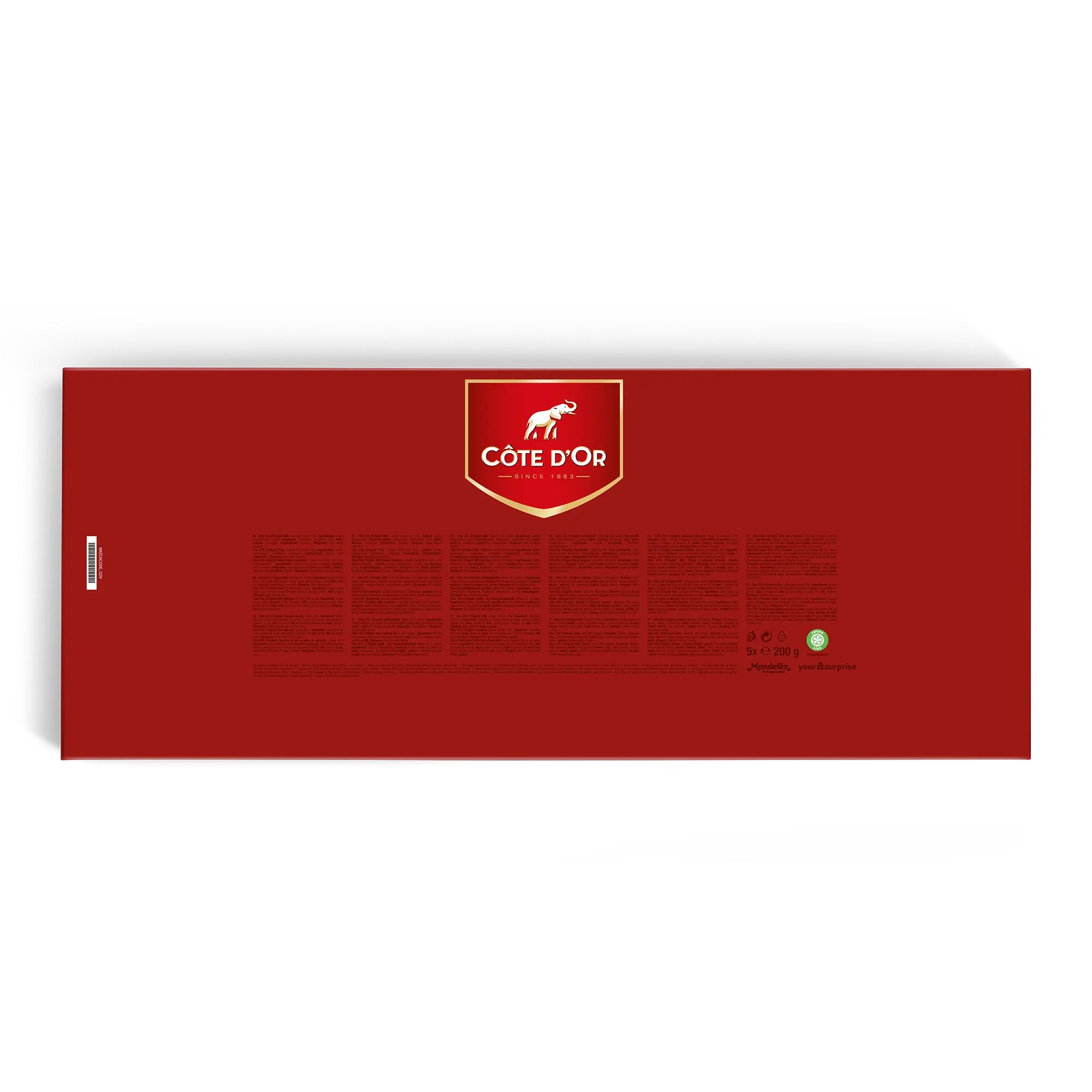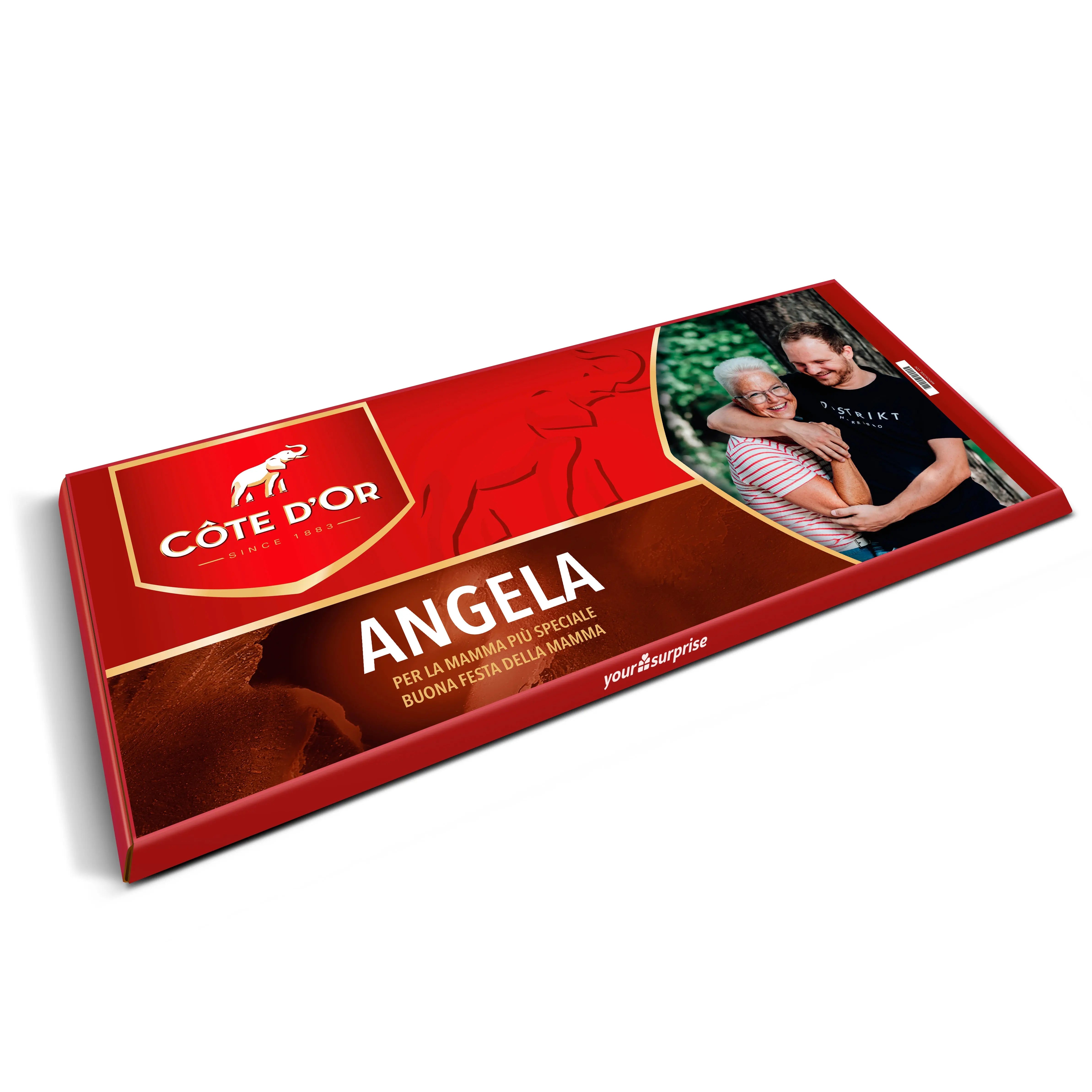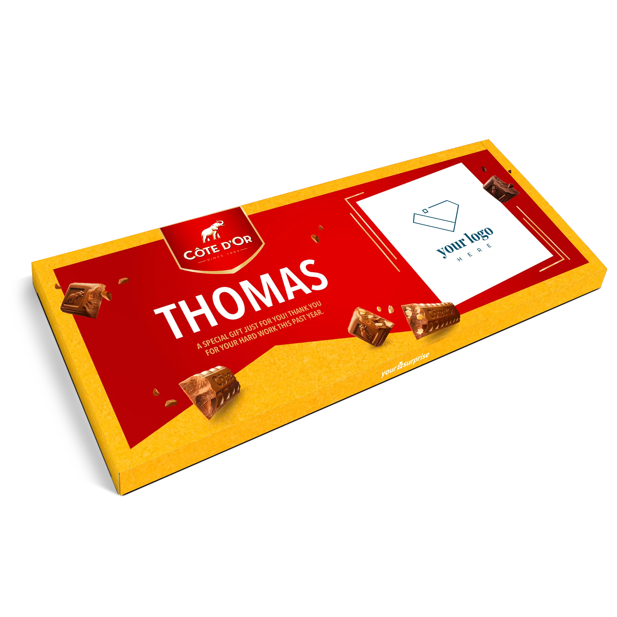 This XXL Côte d'Or Belgian chocolate bar contains no less than 5 bars of Côte d'Or chocolate. Truly unique with the photo and/or name of your choice!More information on the XXL Côte d'Or chocolate bar:Dimensions: 60 x 26 x 2 cmIncludes: 2 Côte d'Or L' Original Milk bars, 2 Côte d'Or Milk & Hazelnut bars and 1 Côte d'Or L' Original Dark bar (contents may vary!)Weight: 5 x 200 gramsPersonalisation: with name, photo and/or textPrint: picture perfect and in full colourAdditional information: For technical reasons, it is not possible to add Cyrillic, Greek, Asian, Arabic, Turkish or special characters.Important information: If a specific flavour is temporarily out of stock, we will fill the XXL Côte d'Or bar with other flavours.Côte d'Or L'Original MilkAt least 33% cocoa.Ingredients: Sugar, cocoa mass, skimmed milk powder, cocoa butter, whey powder (from milk), milk fat, emulsifier (soy lecithin), aromas.Allergens: May contain nuts.Côte d'Or L'Original DarkAt least 46% cocoa.Ingredients: Sugar, cocoa mass, cocoa butter, emulsifier (soy lecithin), aromas, full-fat milk powder.Allergens: May contain nuts.Côte d'Or L'Original Milk HazelnutAt least 33% cocoa.Ingredients: Sugar, cocoa mass, hazelnut (14%), skimmed milk powder, cocoa powder, whey powder (from milk), milk fat, emulsifier (soy lecithin), aromas.Allergens: May contain other nuts.Please note:When the outside temperature is 25 degrees Celsius or above we will not be able to guarantee the quality of the chocolate.