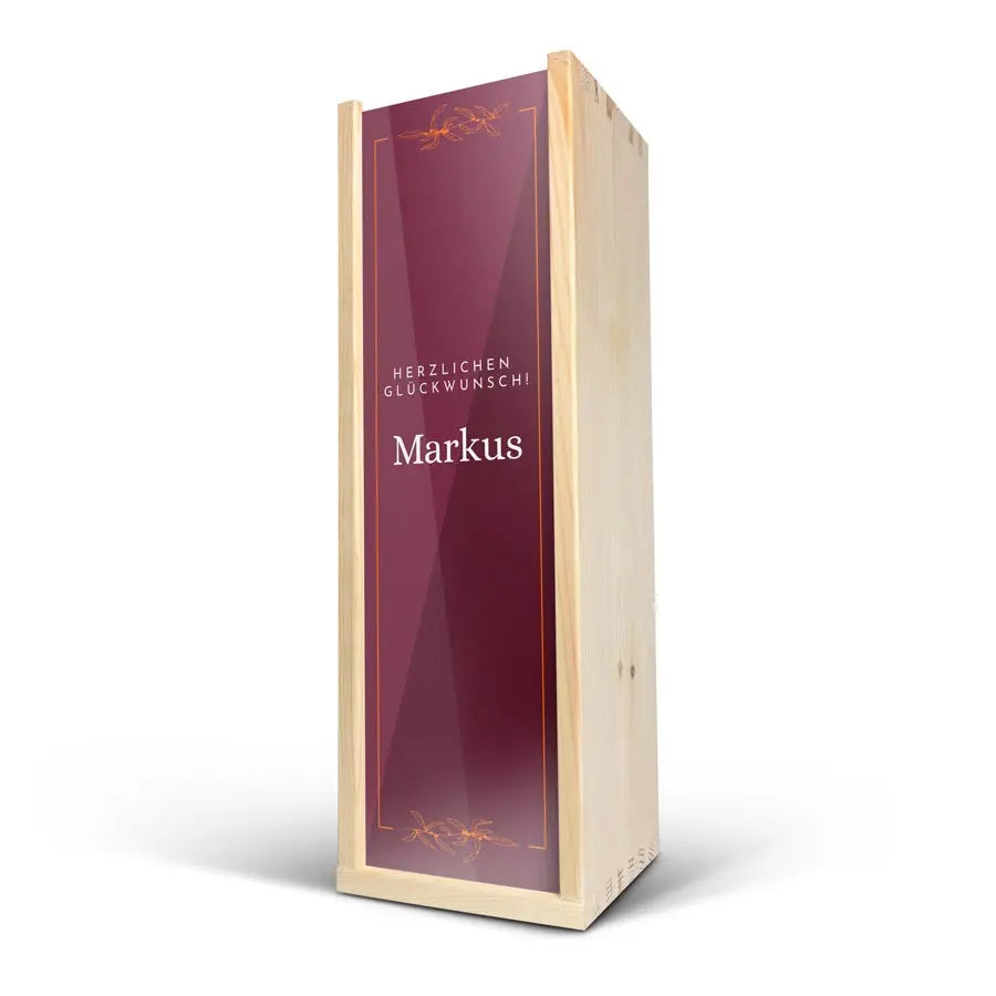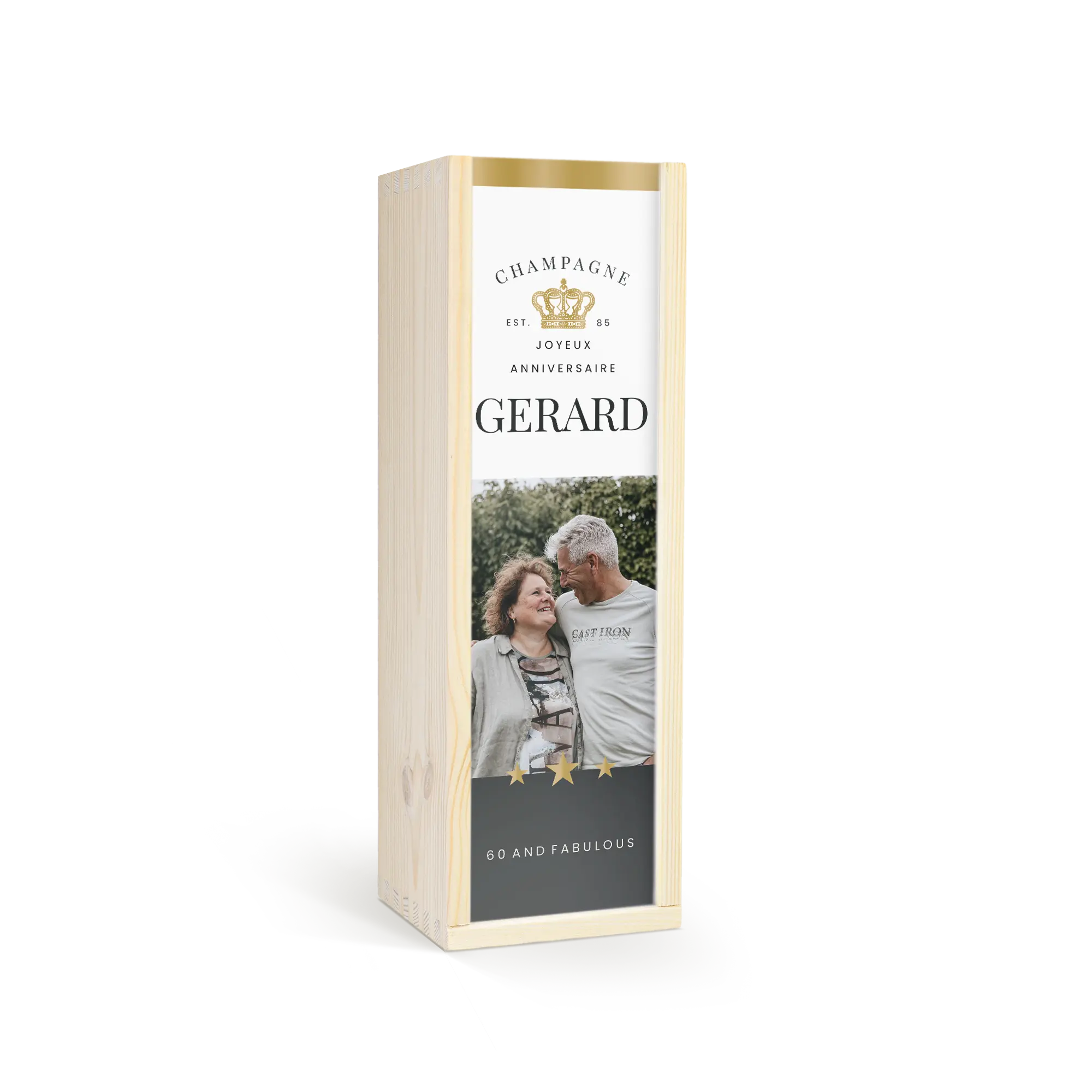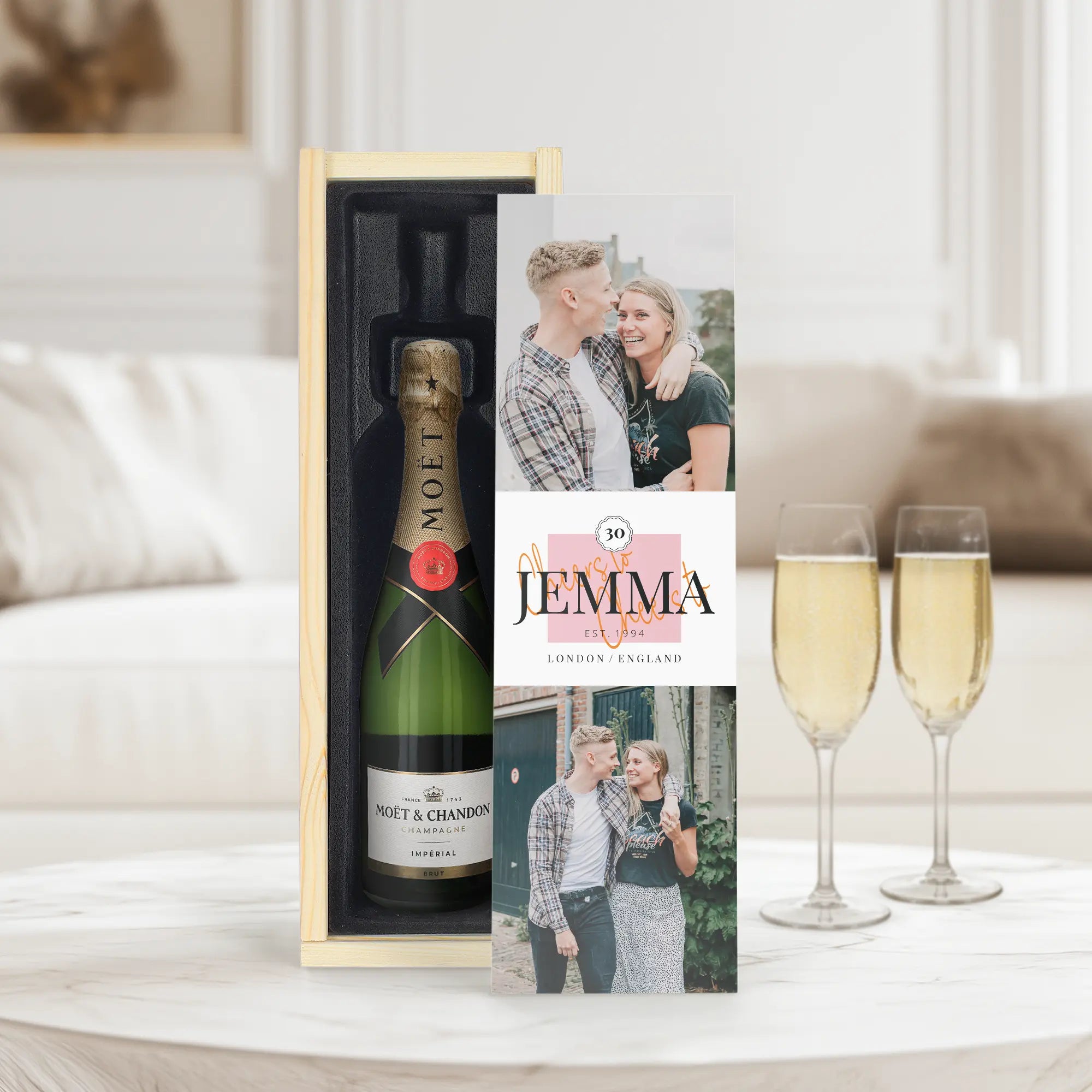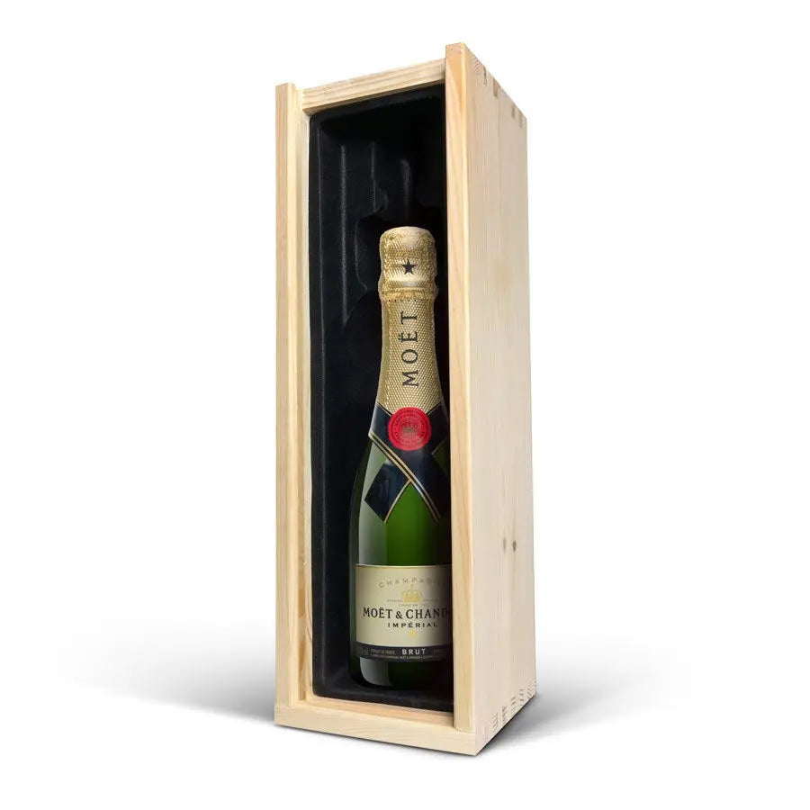 A delicious bottle of real Moët & Chandon champagne in an engraved wooden case with your name or text. Various bottle sizes available!