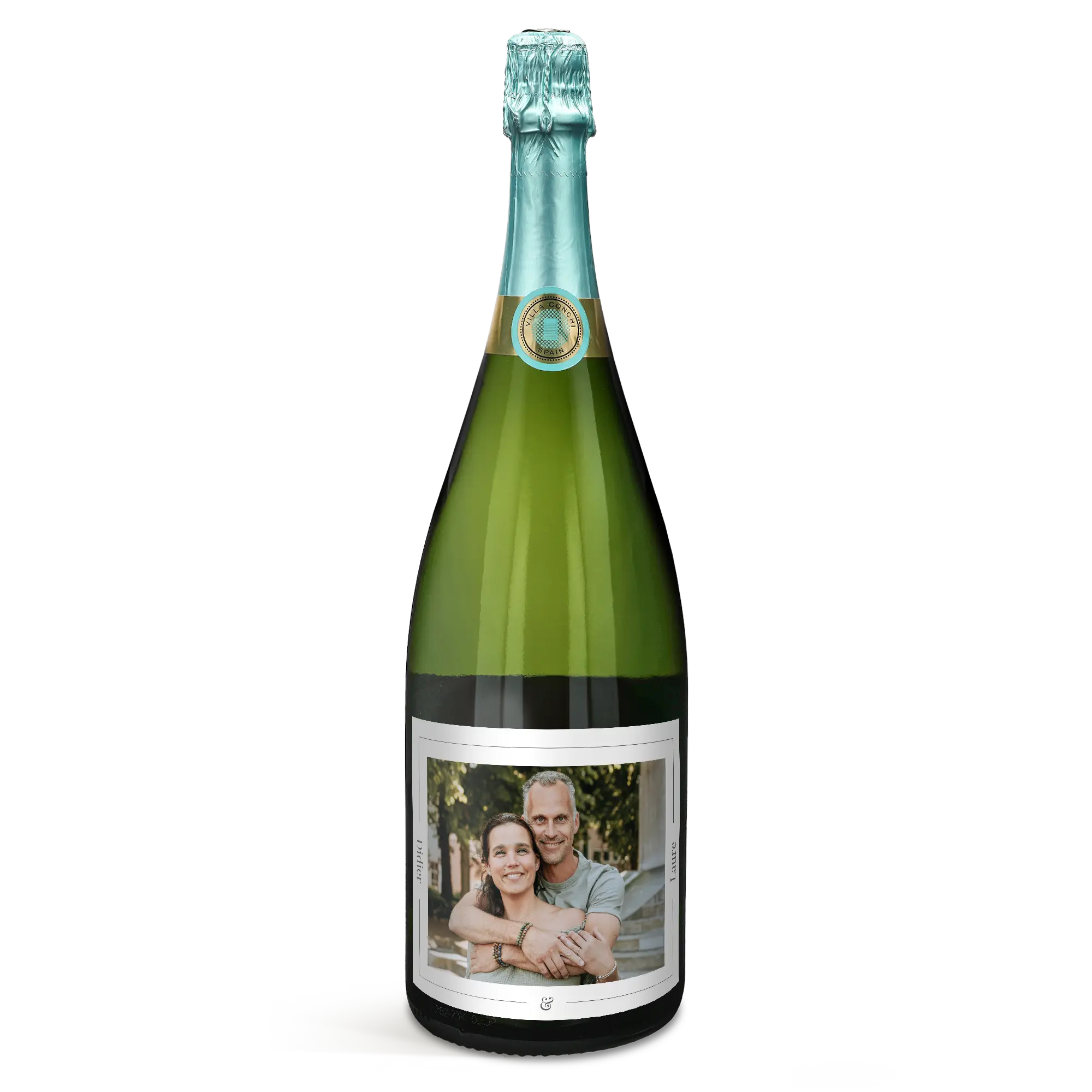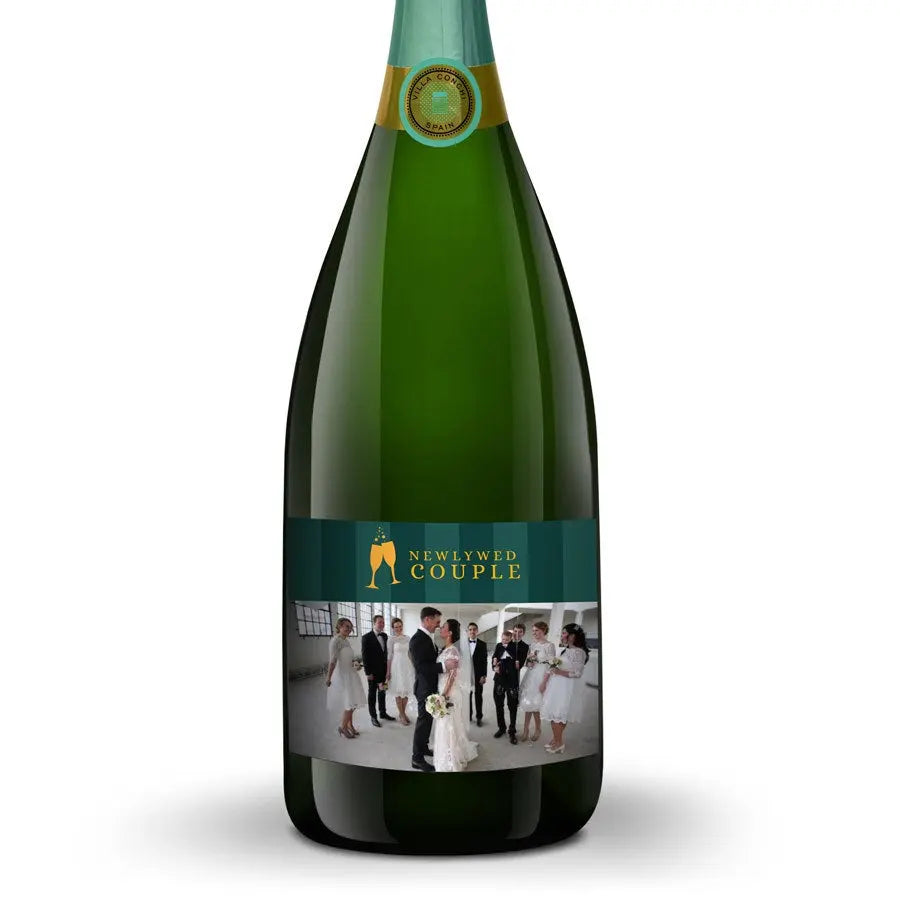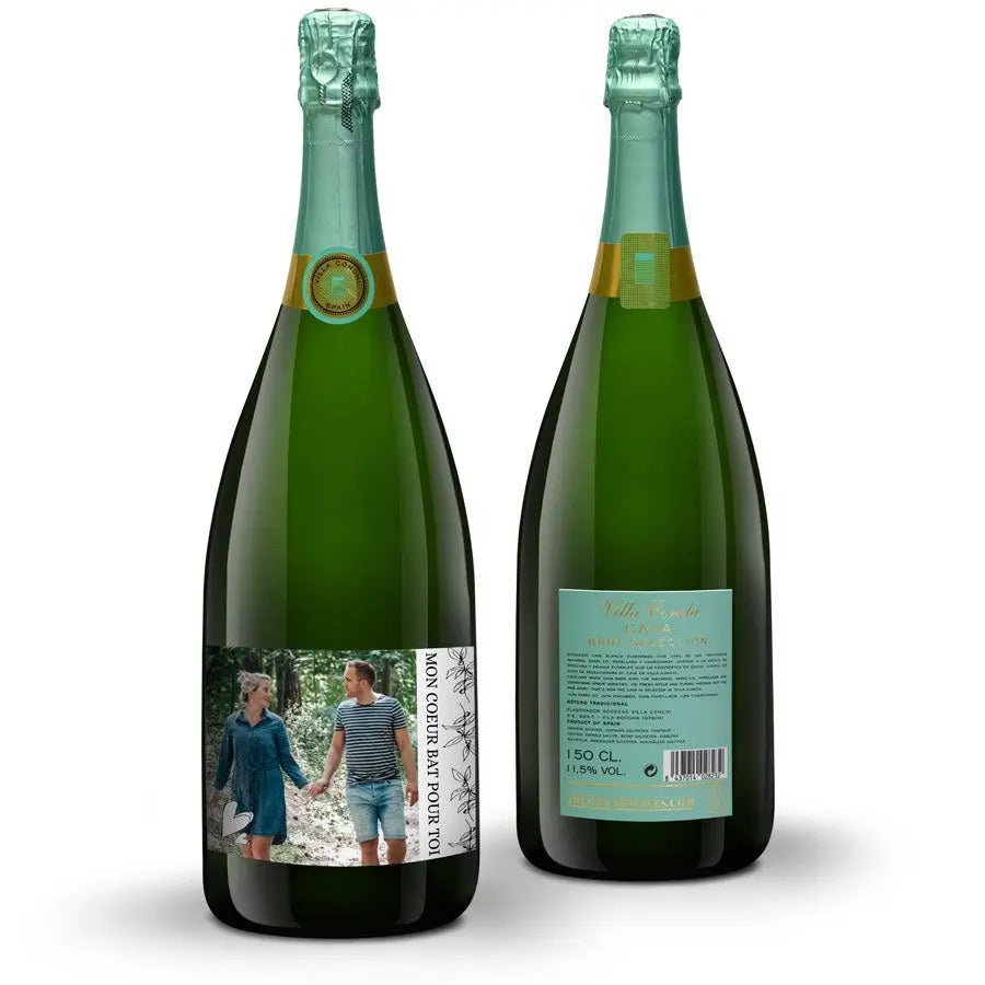 A delicious bottle of Villa Conchi cava with personalised label featuring your design. Picture perfect and in full colour!More information on the personalised label: Personalisation: with photo, name and/or logo Personalisation placement: fully covering the label Print: picture perfect and in full colour Extra: includes a luxurious wooden case More information on the sparkling wine: Brand: Villa Conchi Type: cava Contents: 1500 ml Country of origin: Spain Grape: Chardonnay, Macabeo, Parellada, Xarel-lo Character: Villa Conchi is fresh and has delicious fruity notes. Pairs well with salads, also lovely as an aperitif.