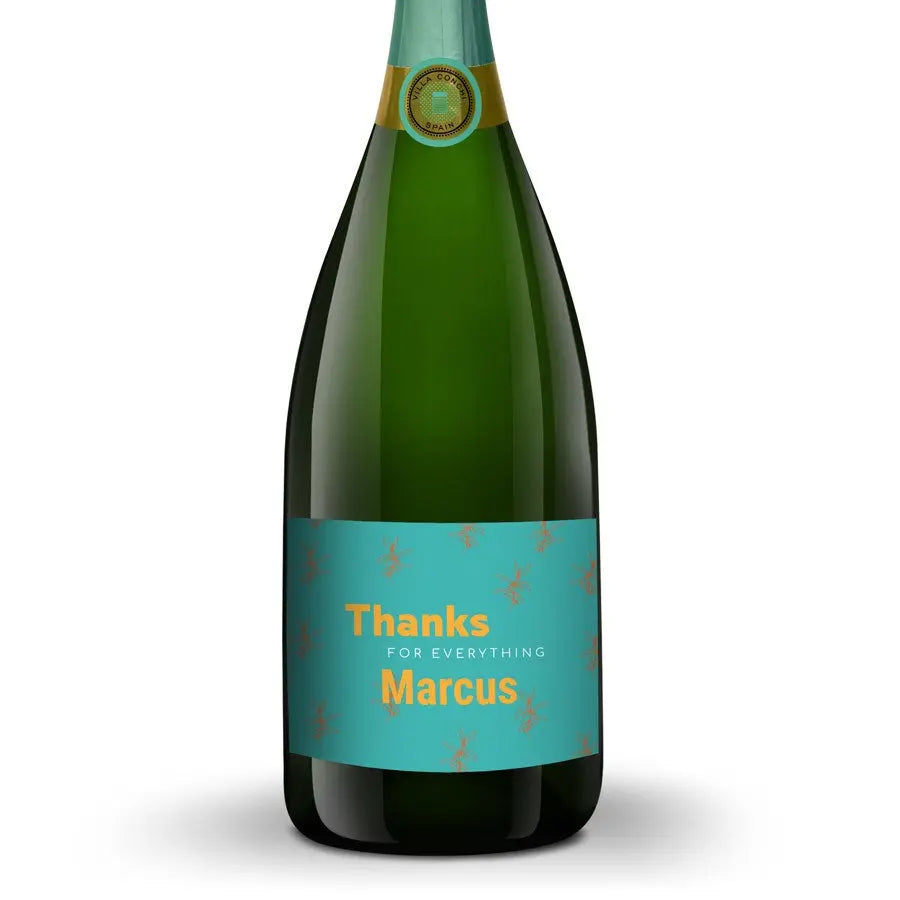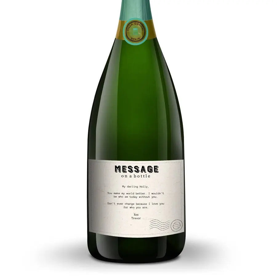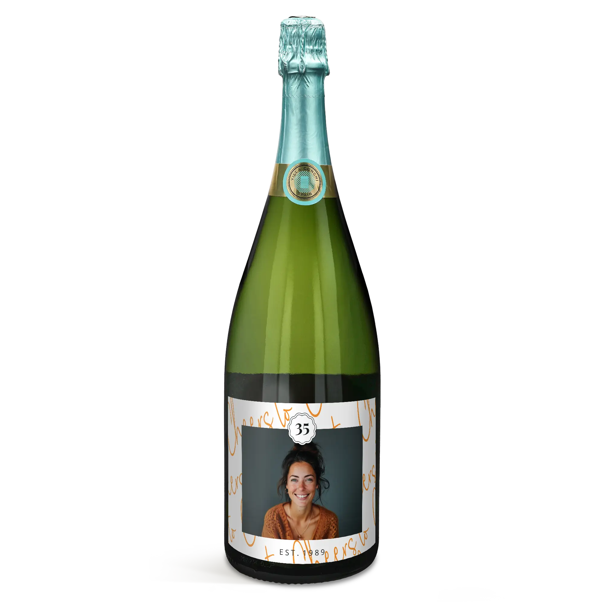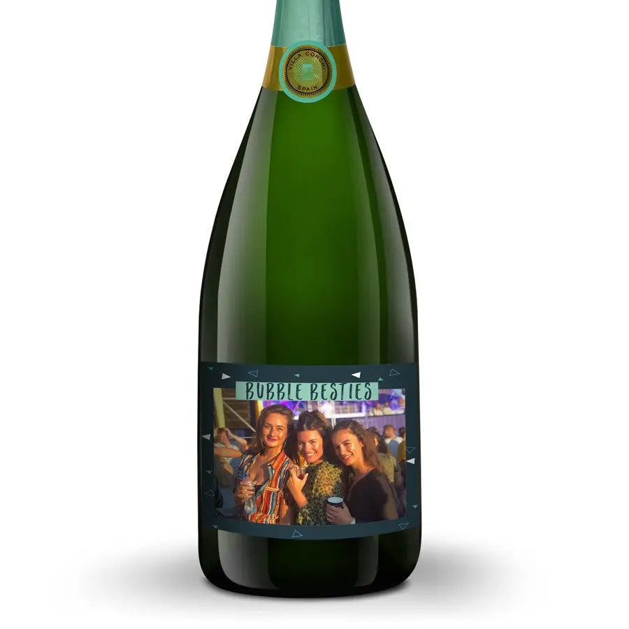 A delicious bottle of Villa Conchi cava with personalised label featuring your design. Picture perfect and in full colour!More information on the personalised label: Personalisation: with photo, name and/or logo Personalisation placement: fully covering the label Print: picture perfect and in full colour Extra: includes a luxurious wooden case More information on the sparkling wine: Brand: Villa Conchi Type: cava Contents: 1500 ml Country of origin: Spain Grape: Chardonnay, Macabeo, Parellada, Xarel-lo Character: Villa Conchi is fresh and has delicious fruity notes. Pairs well with salads, also lovely as an aperitif.