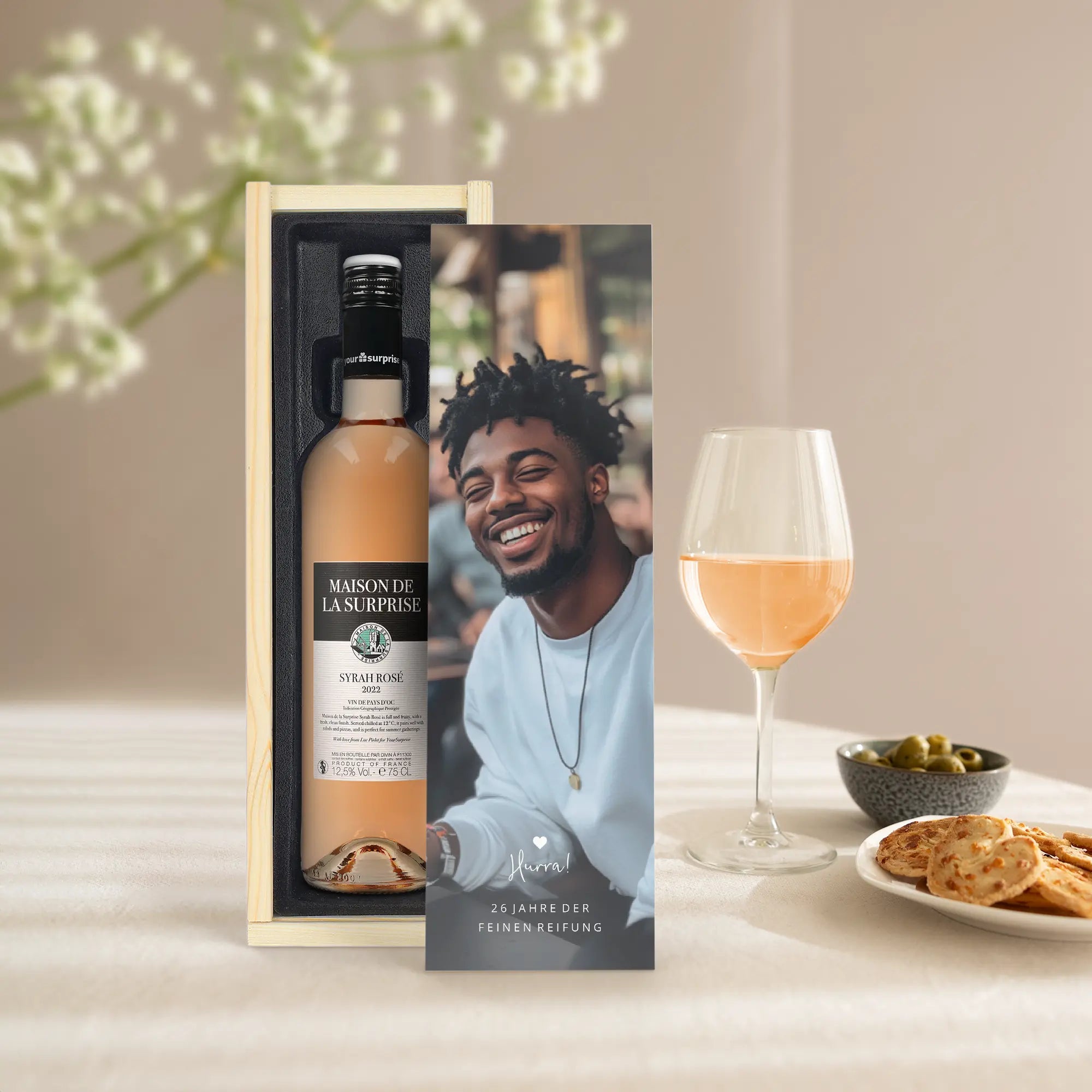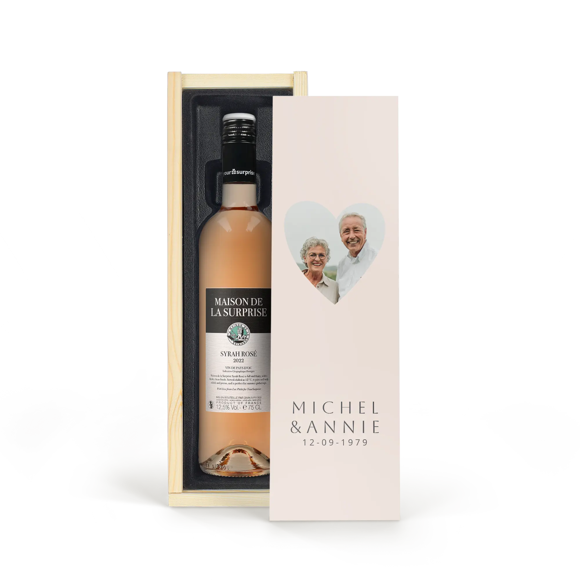 More information on the deluxe wooden case:Personalisation: with photo, text and/or logoPersonalisation placement: on wooden case lidPrint: picture-perfect and in full colourCase dimensions: 36.5 x 12 x 11 cmLid dimensions: 35.6 x 10.2 x 0.3 cmAdditional information: the deluxe wooden case is made with FSC-certified woodMore information on the wine:Brand: Maison de la SurpriseType: roséContents: 750 mlCountry of origin: FranceGrape: SyrahCharacter: Maison de la Surprise Syrah has notes of red fruit, raspberries and wild strawberries. Pairs well with light meals.