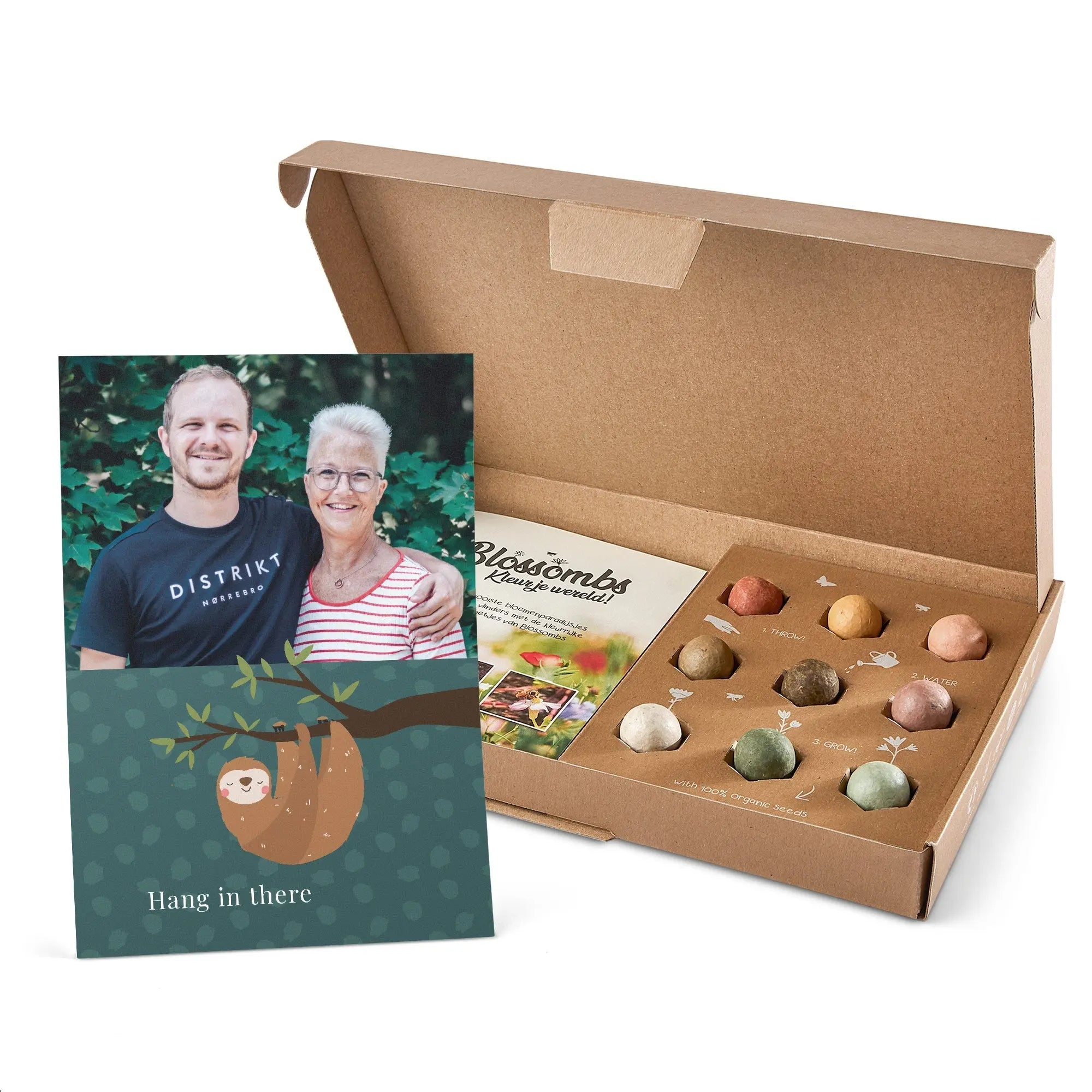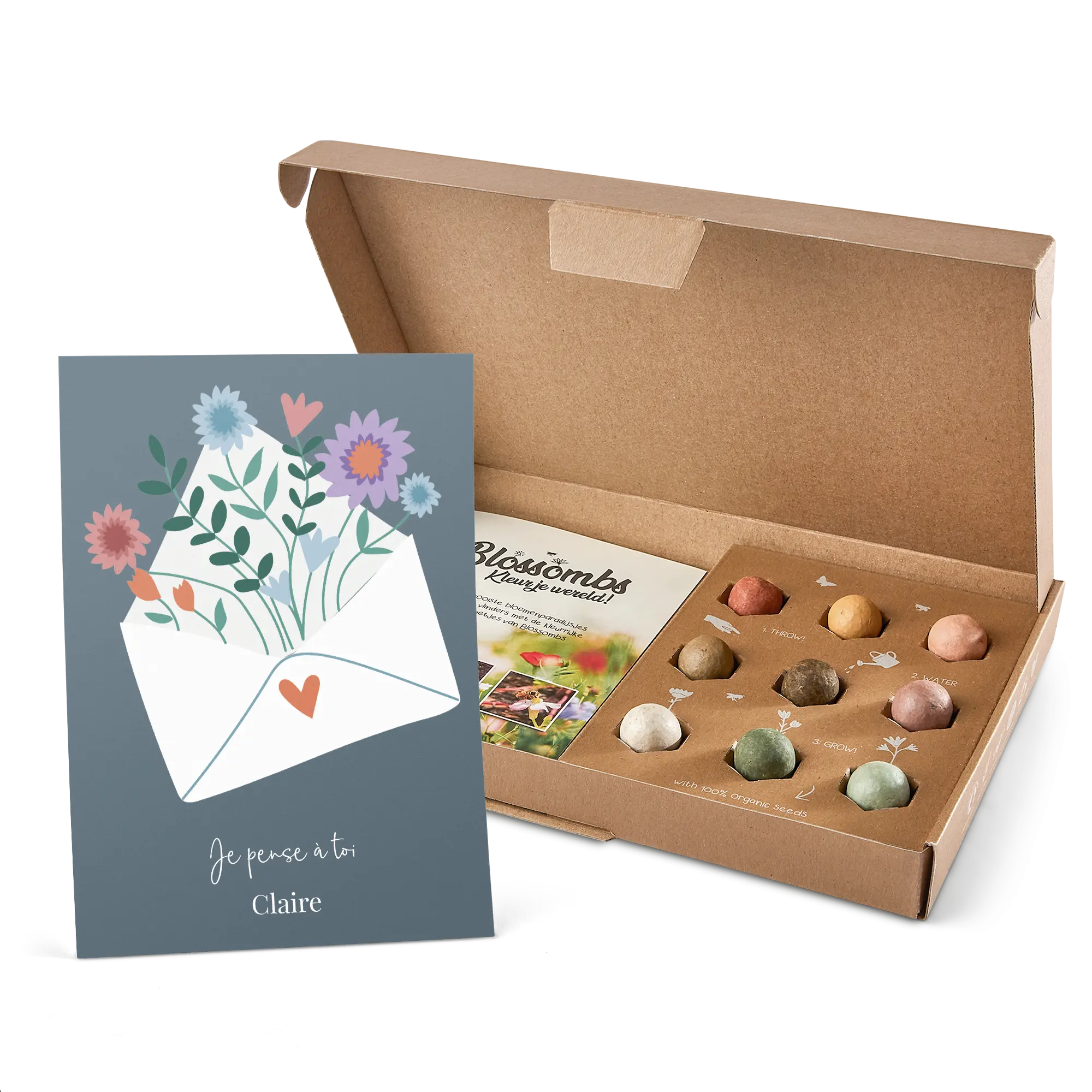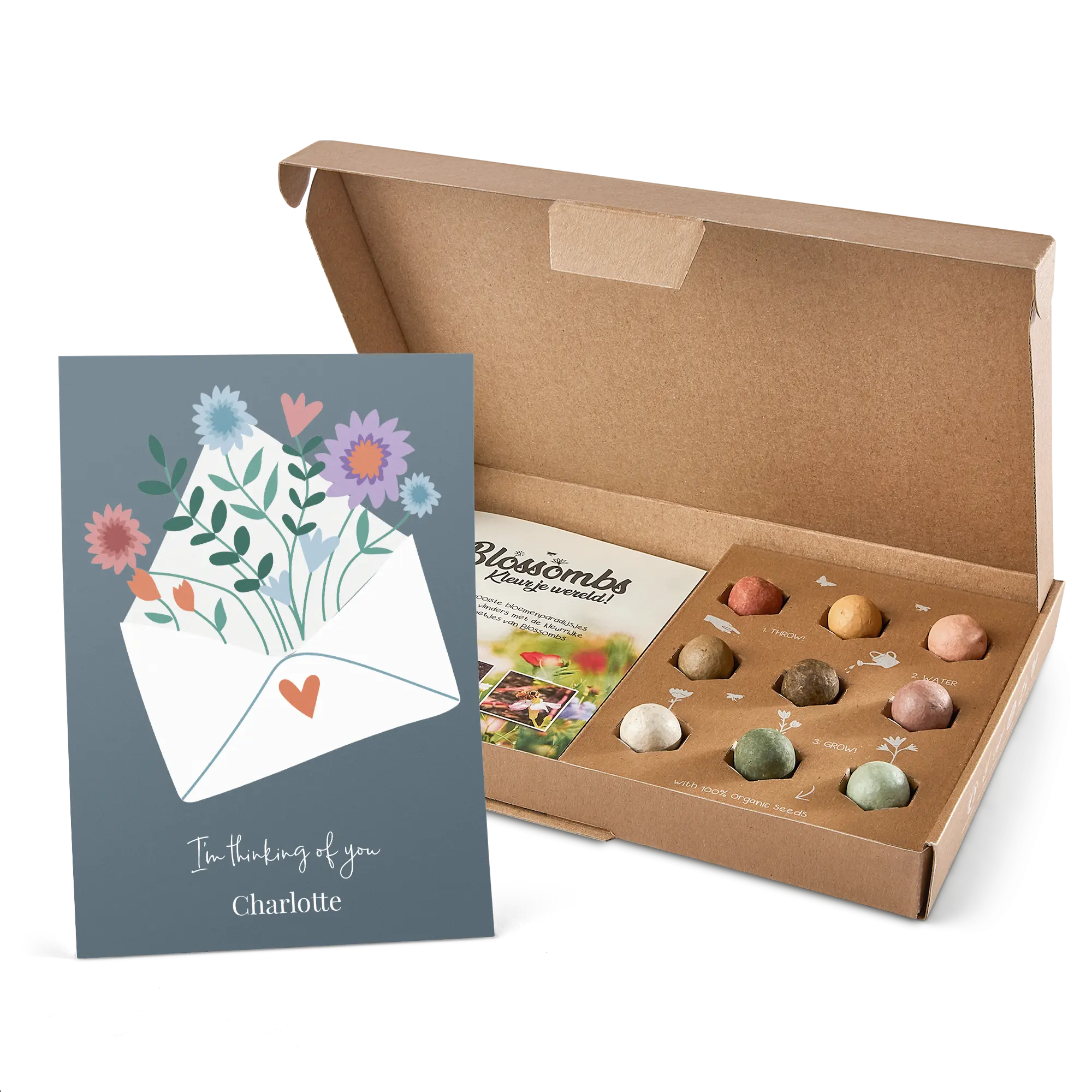 Wildflower seed bombs gift box with personalised greeting card. Create yours now!More information on the wildflower seed bombs:Brand: BlossombsNumber of seed bombs included: 9When to use: between March - SeptemberShelf life: 2 yearsMaterial: organic wildflower seeds and 100% organic ingredientsUse: outdoorsWeight: 150 gramsGift box dimensions: 24 x 16 x 2.6 cmAdditional information: it will take between 2 - 3 months for the wildflowers to grow, depending on when the seed bombs are used. More information on the greeting card:Type of card: postcard styleDimensions: 14.8 x 10.5 cmOrientation: landscapeFinish: deluxe matte finishPrint: picture-perfect and in full colourPersonalisation: with photo and/or textEnvelope: 1 white envelope includedFor technical reasons, it is not possible to use Cyrillic, Arabic, Asian, Greek or special characters.