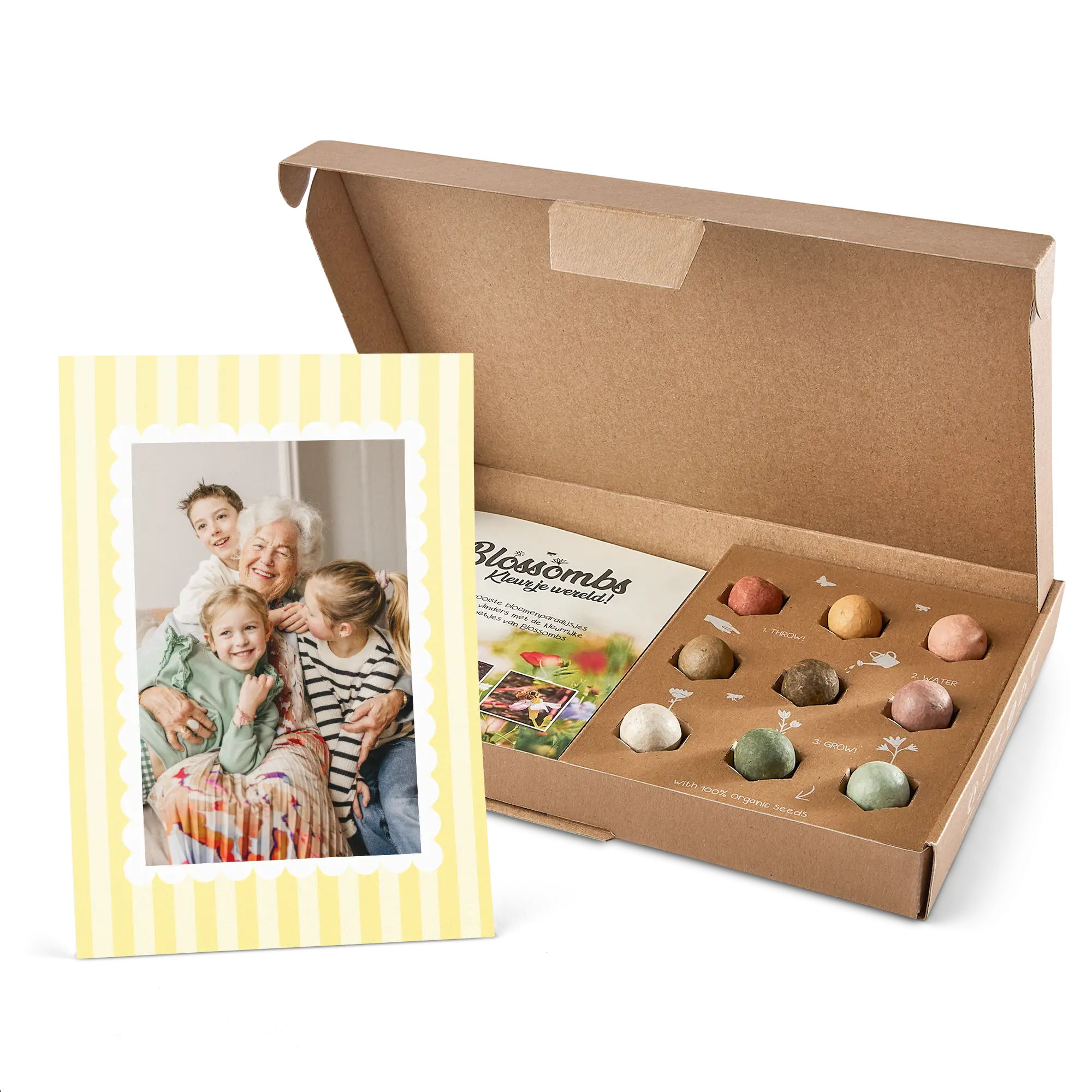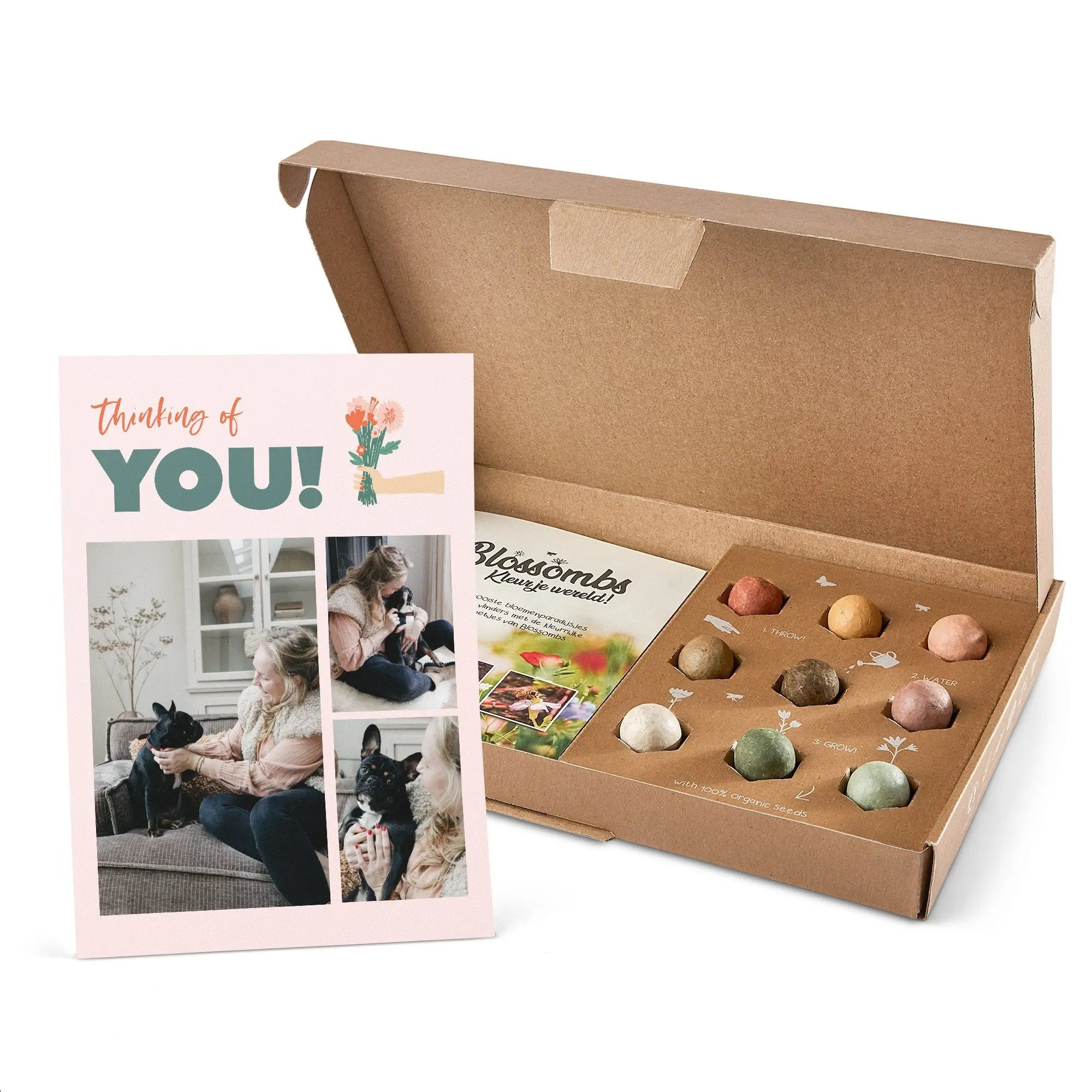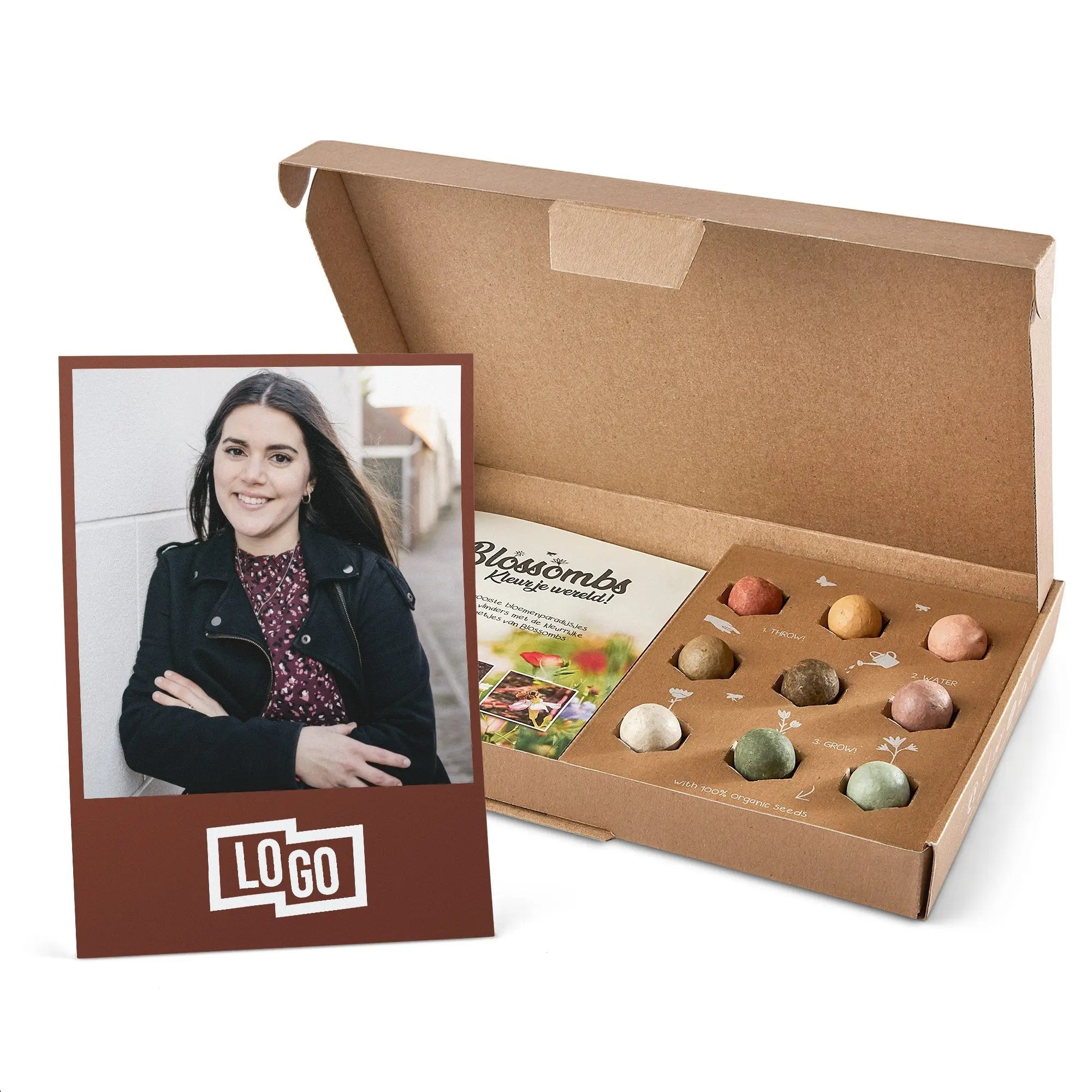 Wildflower seed bombs gift box with personalised greeting card. Create yours now!More information on the wildflower seed bombs:Brand: BlossombsNumber of seed bombs included: 9When to use: between March - SeptemberShelf life: 2 yearsMaterial: organic wildflower seeds and 100% organic ingredientsUse: outdoorsWeight: 150 gramsGift box dimensions: 24 x 16 x 2.6 cmAdditional information: it will take between 2 - 3 months for the wildflowers to grow, depending on when the seed bombs are used. More information on the greeting card:Type of card: postcard styleDimensions: 14.8 x 10.5 cmOrientation: landscapeFinish: deluxe matte finishPrint: picture-perfect and in full colourPersonalisation: with photo and/or textEnvelope: 1 white envelope includedFor technical reasons, it is not possible to use Cyrillic, Arabic, Asian, Greek or special characters.