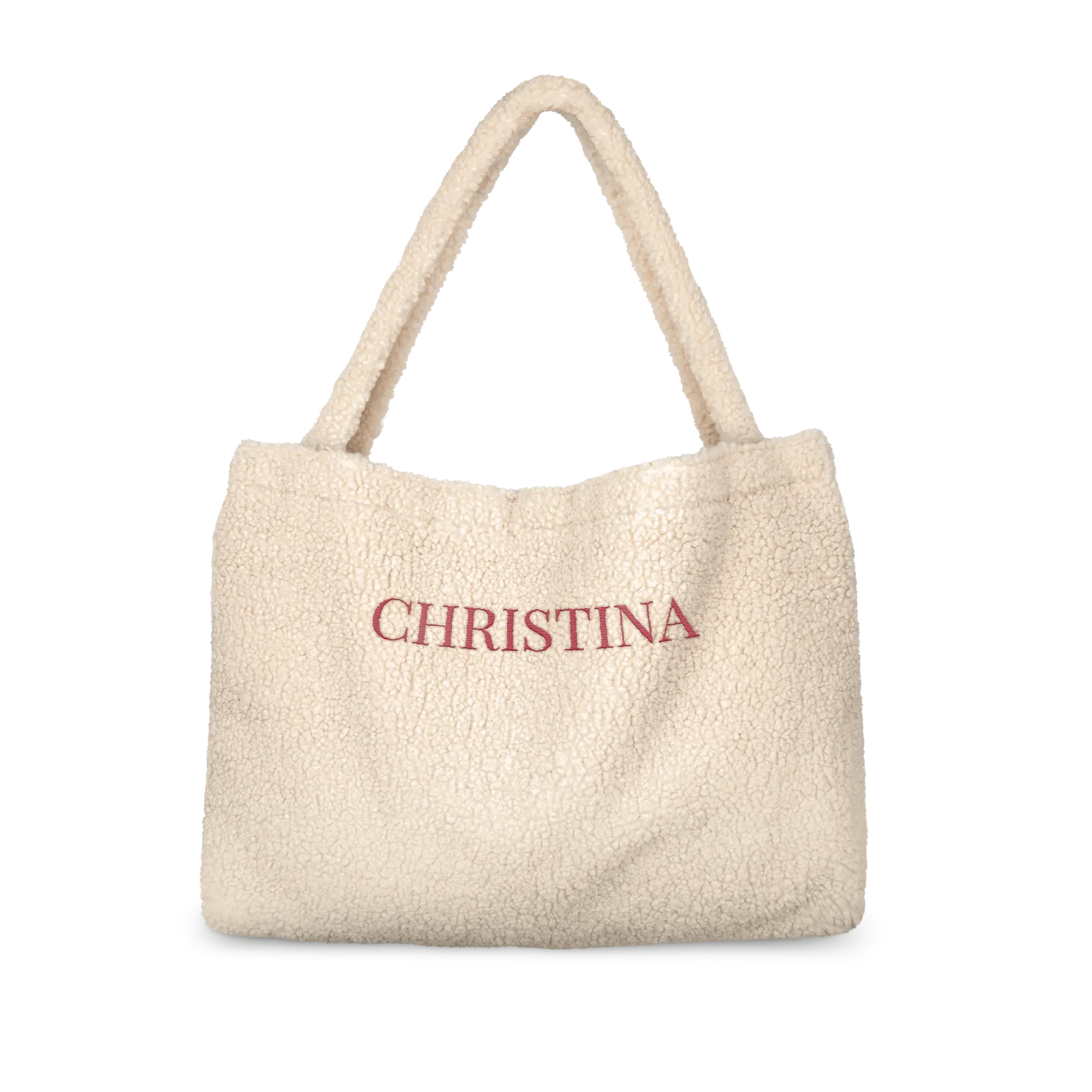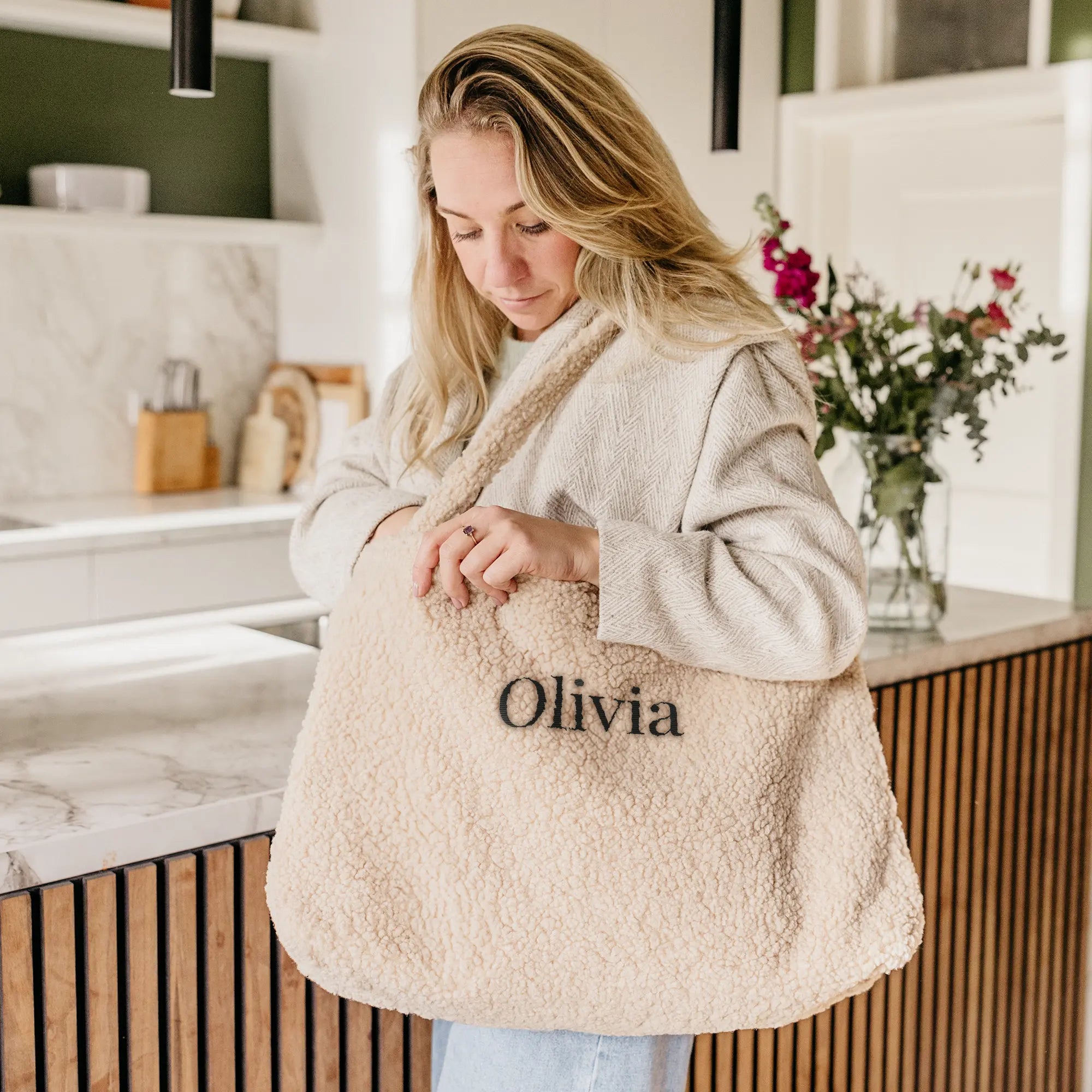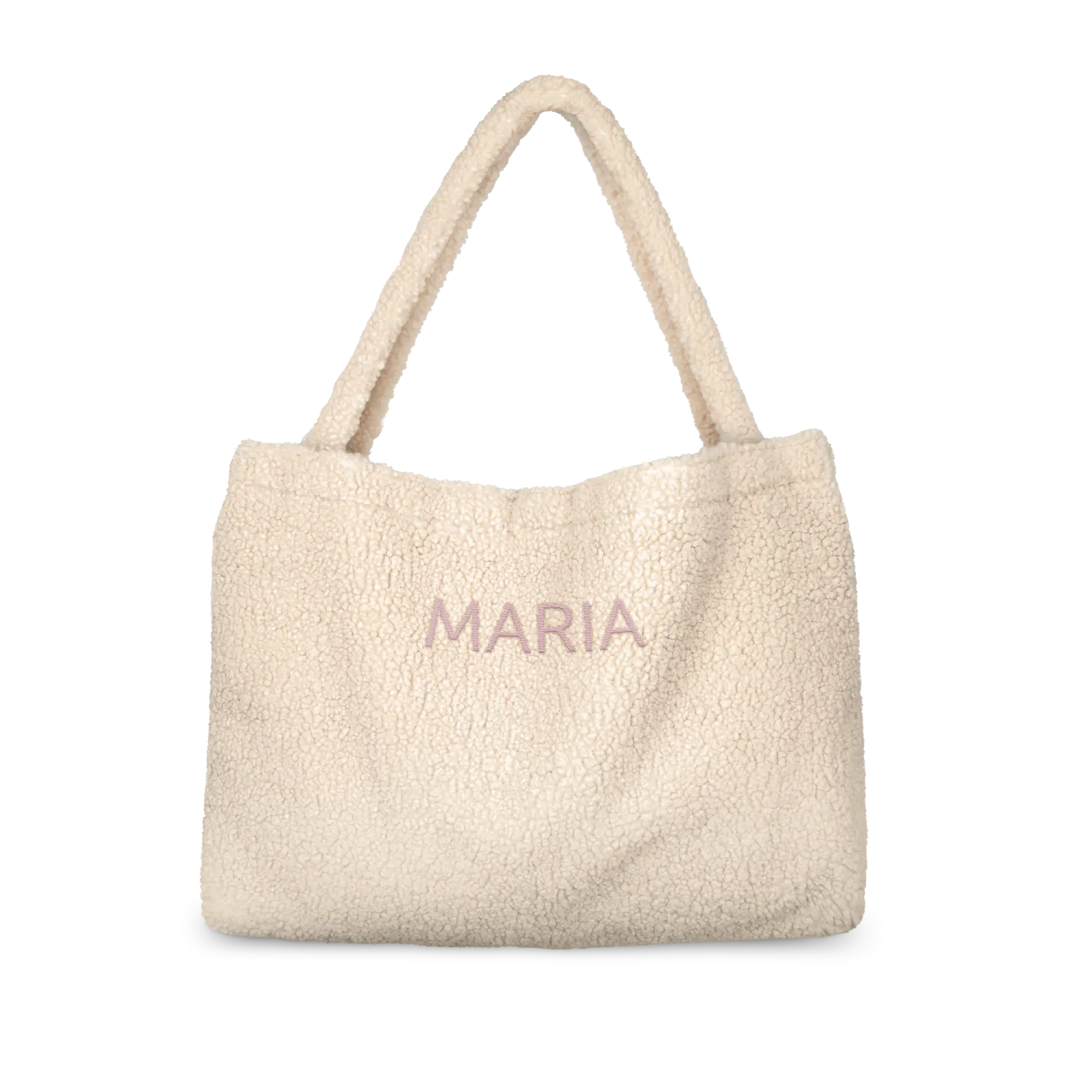 Surprise the ladies in your life with their very own teddy tote bag featuring the name, initials or text of your choice. Soft and practical!More information on the embroidered teddy tote bag:Material: 100% polyesterDimensions: 60 x 42 cmColour: beigePersonalisation: with name, initials or textPersonalisation method: high-quality embroideryAdditional information: main compartment with zip, internal compartment with zip, 2 long handlesWashing instructions: wipe down with a damp cloth, the bag is not water-resistant