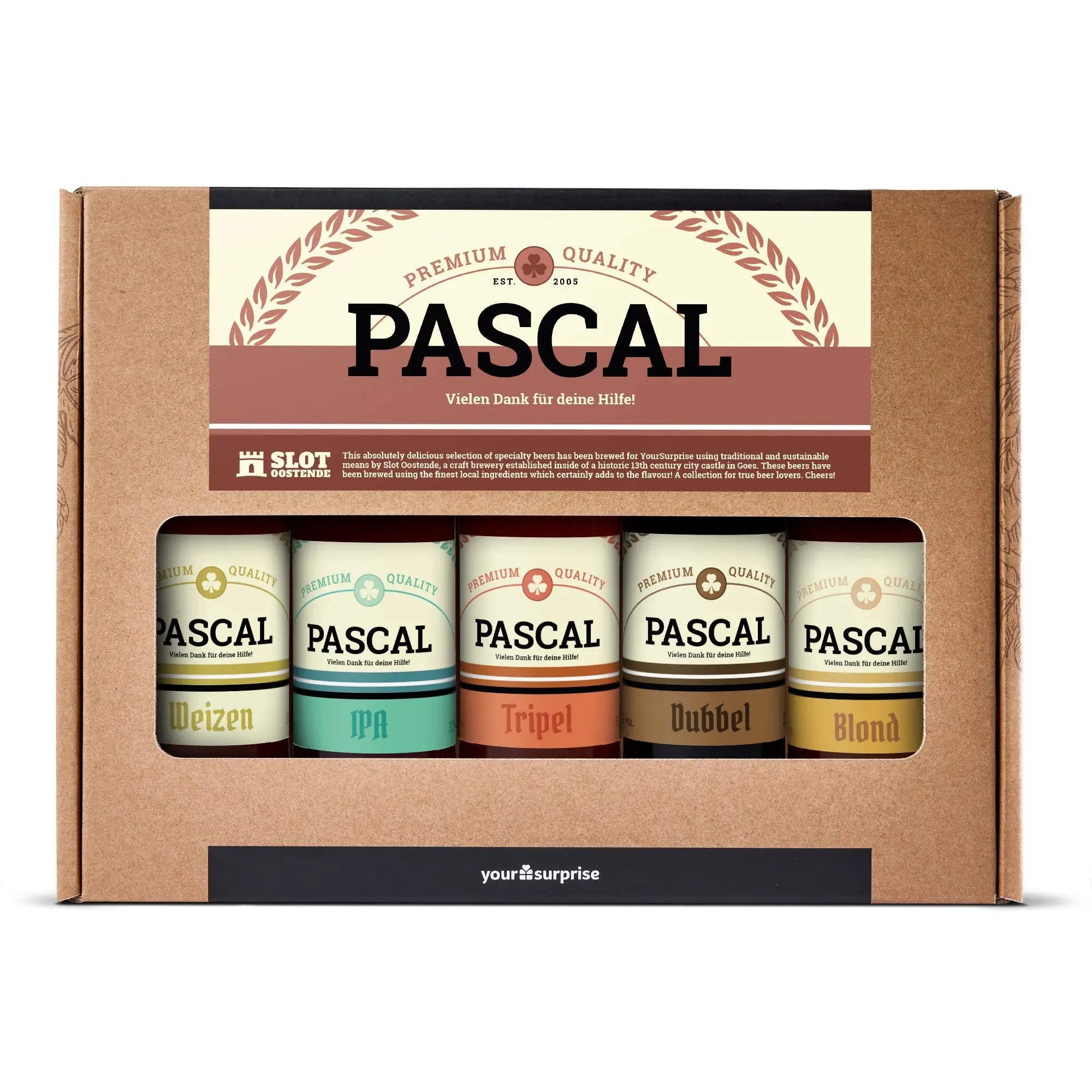 Surprise someone with a personalised gift set. A personalised gift box including 5 bottles. Truly unique, with name!More information on the personalised beer collection:Brewery: Slot OostendeNumber of bottles: 5Gift set dimensions: 40,1 x 29,4 x 7,4 cmPersonalisation: with namePrint: razor-sharp and in full colourPersonalisation placement: on the individual bottles and on the gift boxContents per bottle: 330 mlBeers in the set:Blond: fruity, bitter with a fresh grapefruit flavour (5%) Double: dryer than usual, so something a bit different (7%) Triple: spicy and full, a nice easy drink (8%) Weizen: delicious white beer with a German touch (4,5%) India Pale Ale: a hint of spices and very refreshing (6%) Allergy information: Contains gluten.