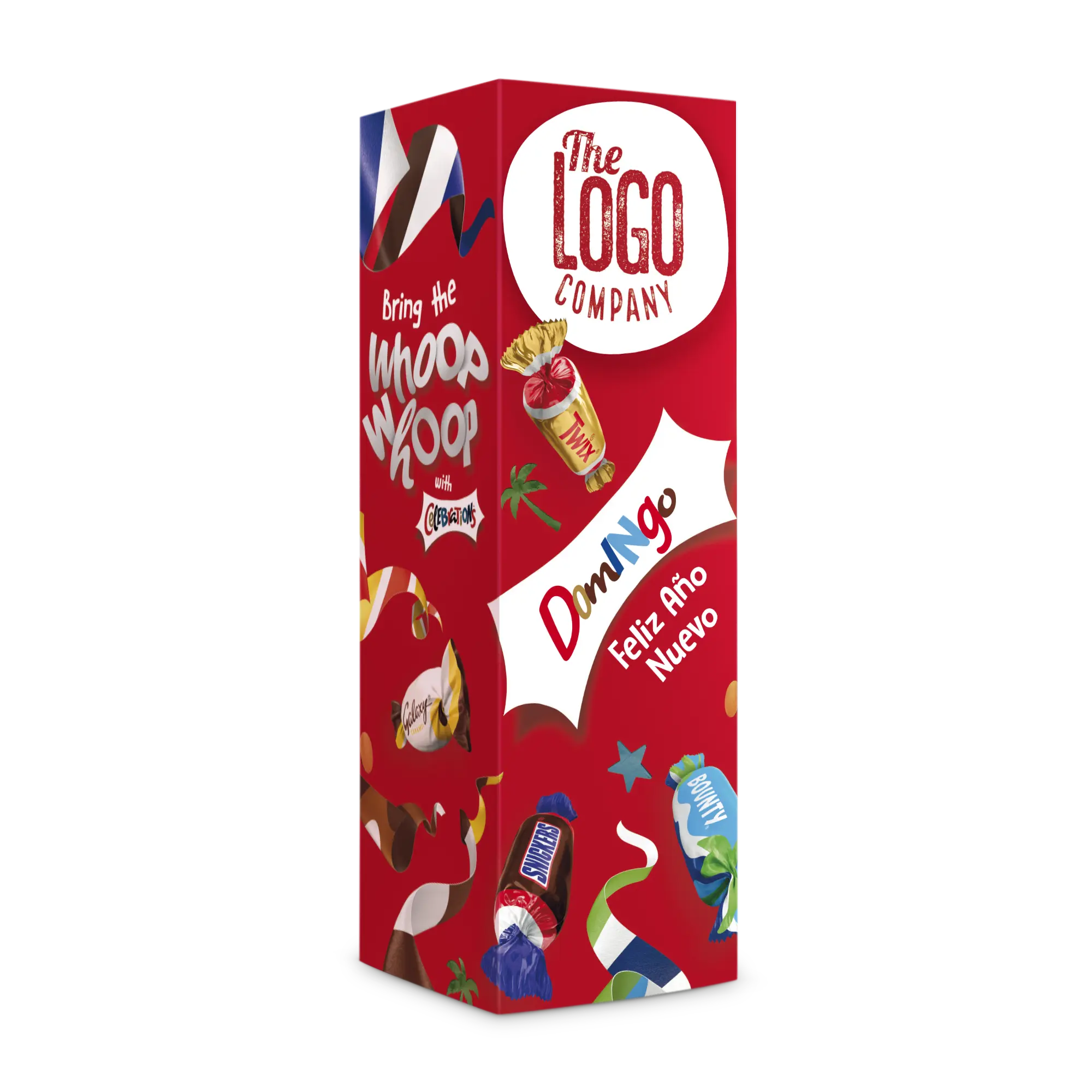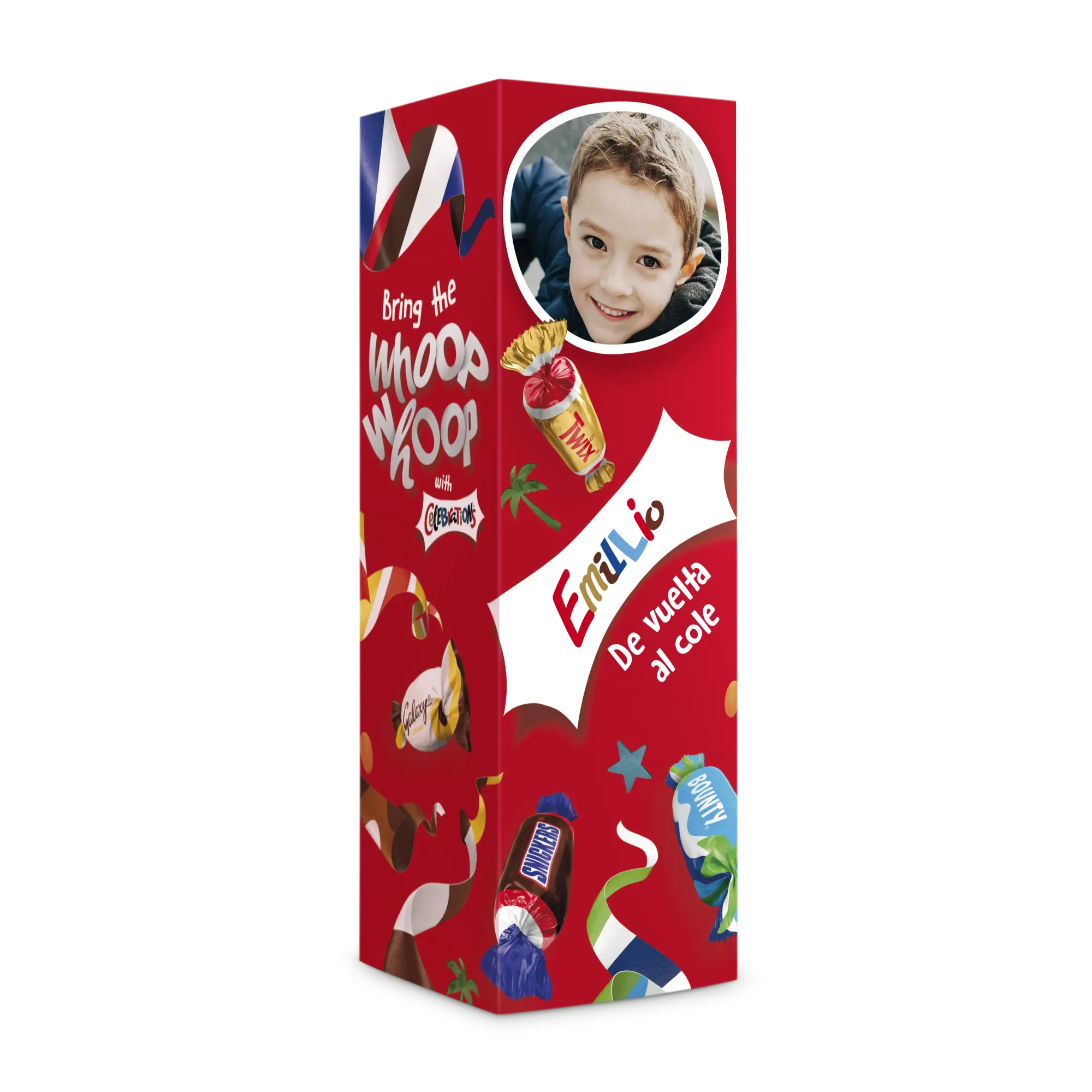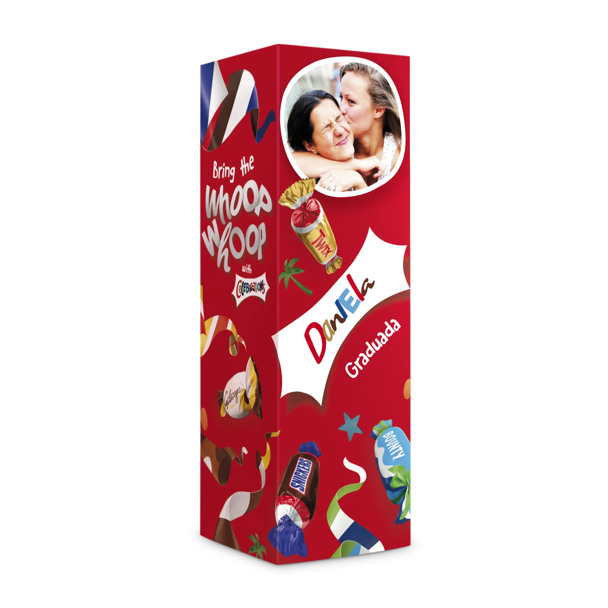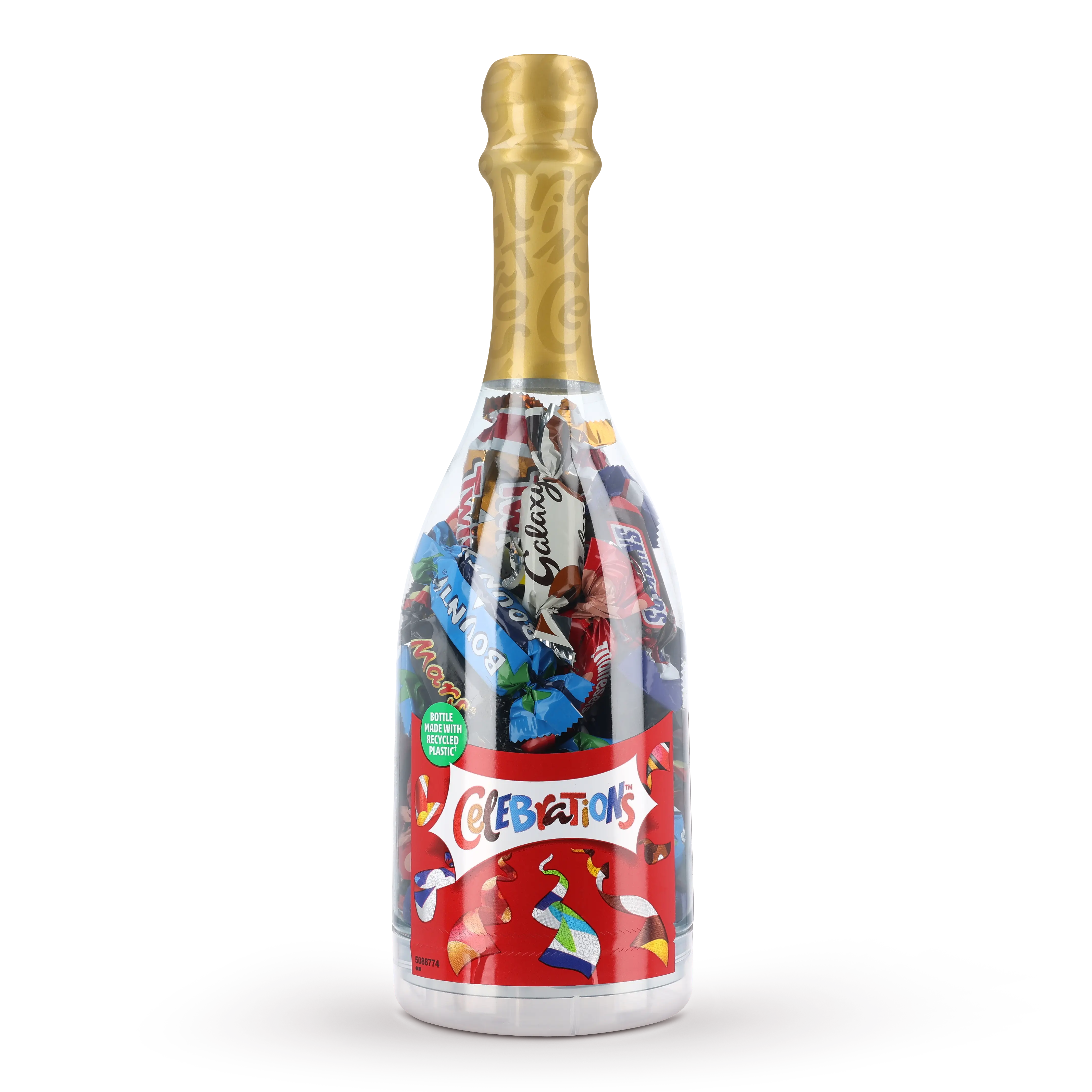 Give a fabulous bottle with an assortment of chocolates and personalise the gift box - create your own design!More information about the Celebrations bottle:Content: assortment of chocolates with milk chocolate filling, chocolate biscuitWeight: 296 gramsBottle dimensions: 28,3 x 9,2 cmGift box dimensions: 30 x 9,7 cmPersonalisation: name and theme on the sleeve, which is placed around the boxHigh quality full colour printingAdditional information: the condition of the product is not guaranteed in temperatures above 25 degrees.The font cannot be changedIngredients: sugar, glucose syrup, cocoa butter, skimmed MILK POWDER, cocoa mass, butterfat (from MILK), LACTOSE, palm fat, PEANUTS, coconut, whey powder (MILK), WHEY FLOUR, sunflower oil, WHOLE MILK POWDER, emulsifiers (SOYBEAN LECITHIN, E471), BARLEY EXTRACT, low fat cocoa, salt, humectant (glycerol), EGG PROTEIN POWDER, natural vanilla extract, raising agents (E341, E500, E501), MILK PROTEIN, WHEAT GLUTEN. (May contain: HAZELNUT, ALMOND, OATS). At least 25% cocoa.Allergen information: contains peanuts, soya, cereals containing gluten, barley, wheat, eggs, milk, lactoseMay contain: nuts, almonds, hazelnuts, oatsFor technical reasons, only letters and dashes can be used.