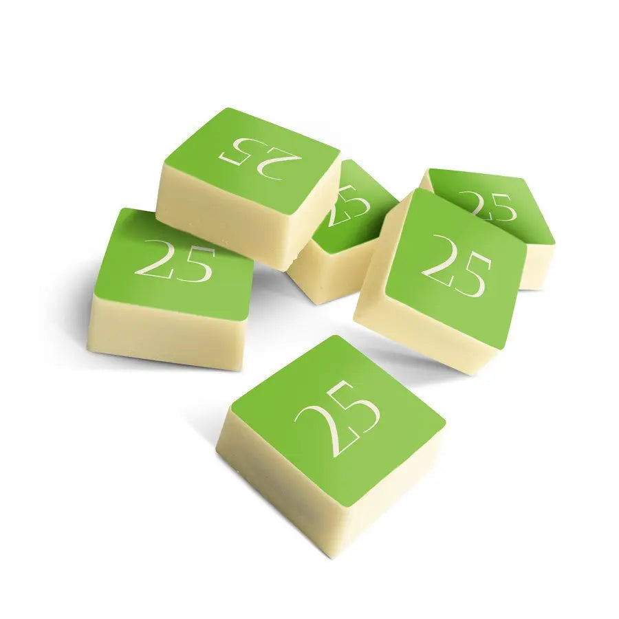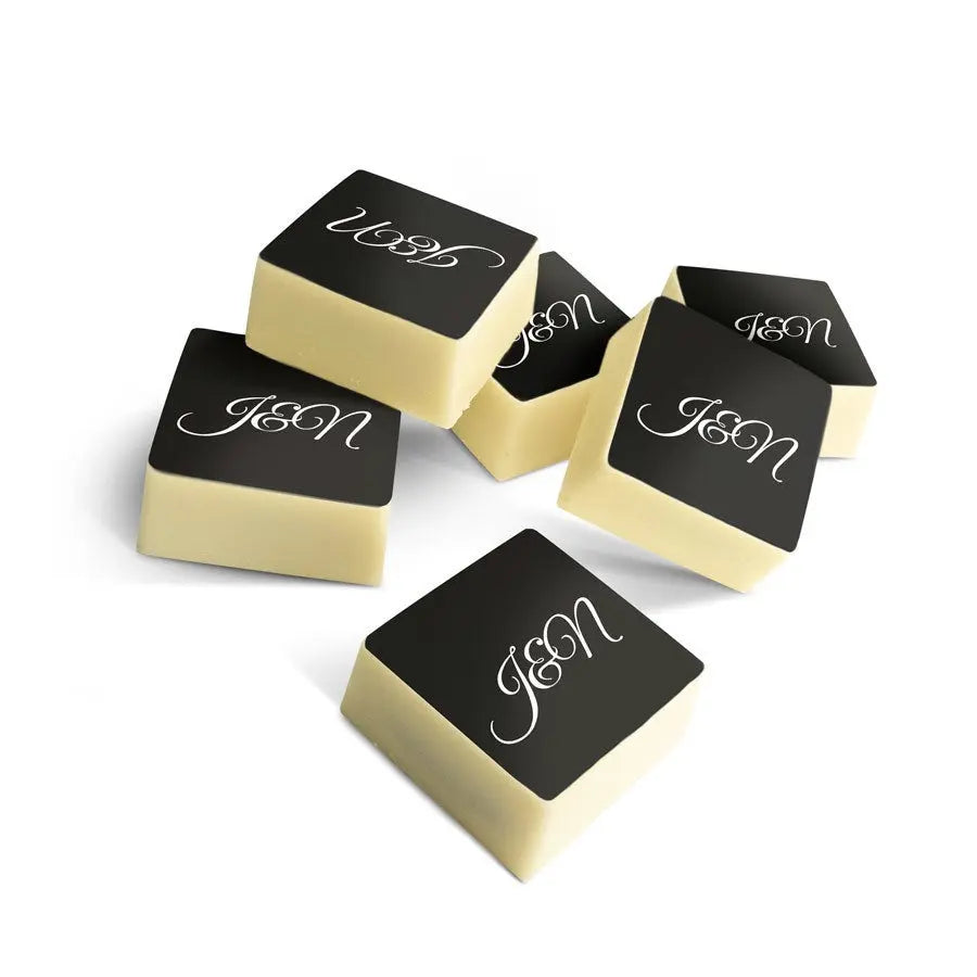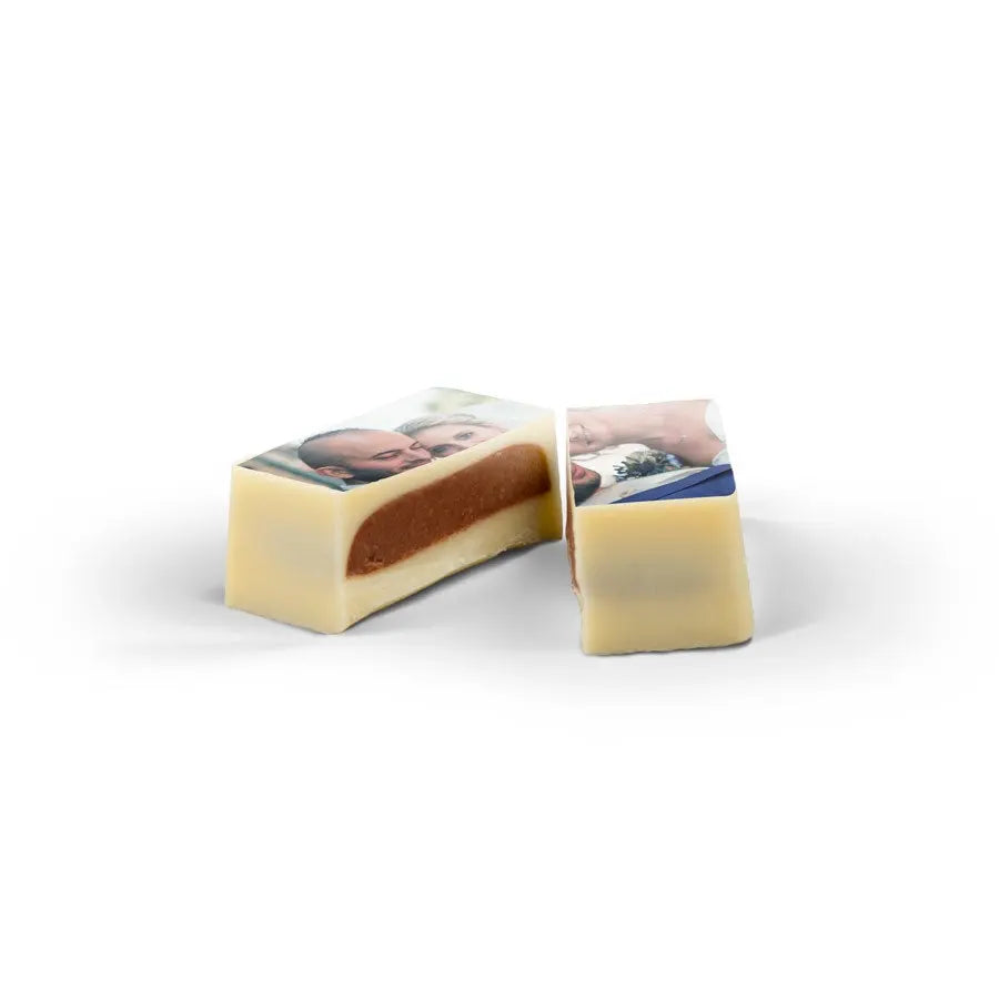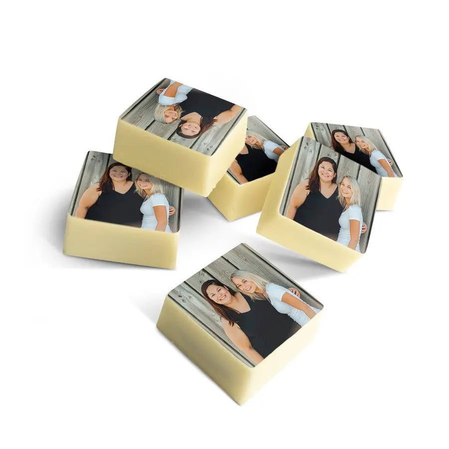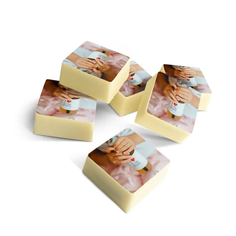More information on the personalised chocolate pralines:Quantity: set of 12, 24 or 48 chocolatesSize: 2,6 x 2,6 x 1,2 cm per chocolate, may vary slightly per chocolateChocolate: milk chocolate with a layer of white chocolate on the topShape: squareFilling: pralinePersonalisation: printed with photo or logoPrint: edible print in full colourWhen the outside temperature is 25 degrees Celsius or above we will not be able to guarantee the quality of the chocolate.Important: It is not possible to use different photos for each individual chocolateStorage advice: Can be stored for up to 10 weeks in a cool, dark space at between 14-18°C. Allergy information: contains soy, milk and may contain traces of nuts and gluten.Ingredients:Chocolate pralines with a hazelnut filling and edible print: sugar, hazelnuts, cocoa mass, cocoa butter, full-fat powdered milk, emulsifier (soy lecithin), natural vanilla aroma.Edible print: corn starch, modified starch: E1422, potato starch, water, powdered chicken protein, skimmed milk powder, olive oil, salt, humectant E422, emulsifier: E433, colouring: E102, E110, E122: may negatively affect activity or concentration in children, E133, E151Coating: E904