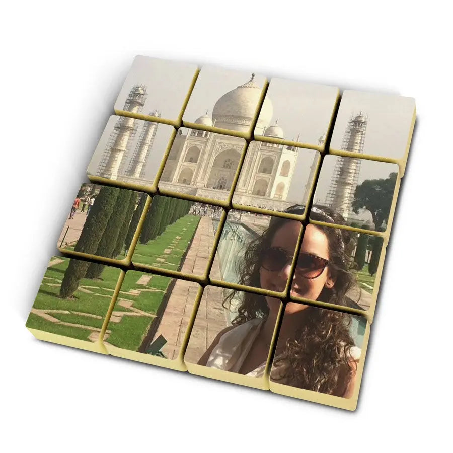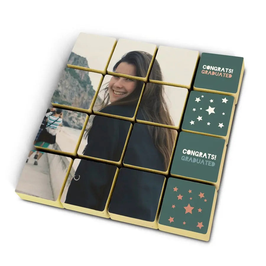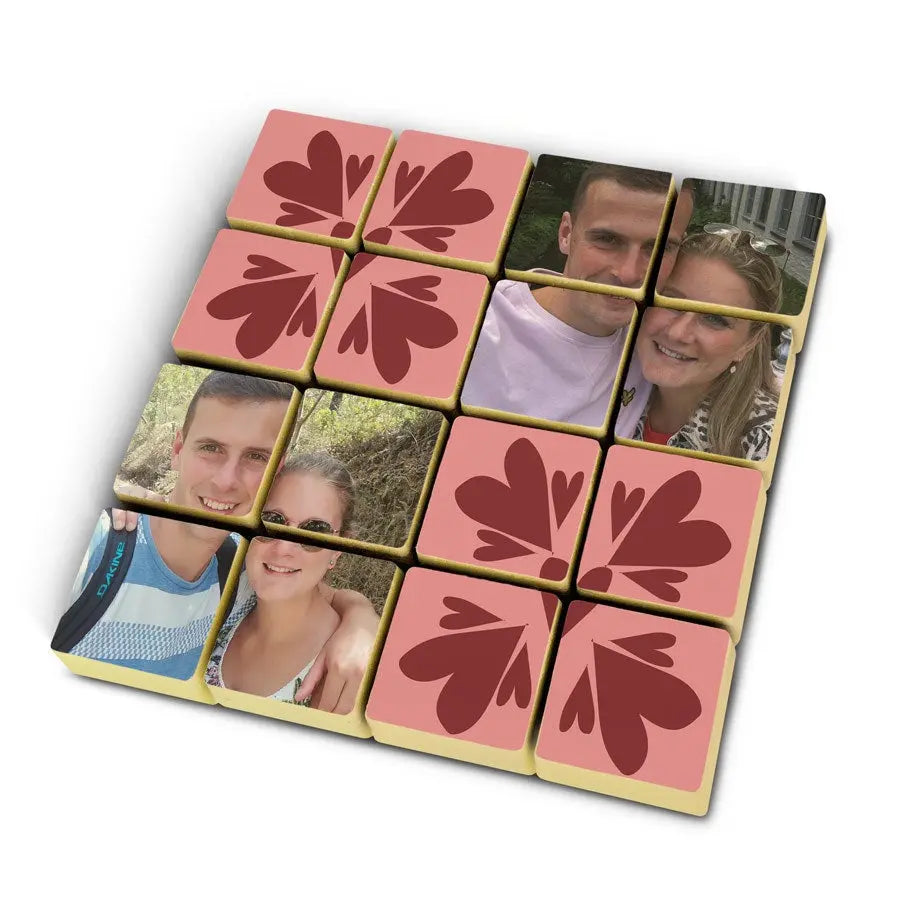 More information on the photo on chocolate pralines:Quantity: 16 chocolatesChocolate: milk chocolate with a layer of white chocolate on topFilling: pralineDimensions per chocolate: 2,6 x 2,6 x 1,2 cmDimensions per set: 23 x 18 x 2.5 cmPersonalisation: printed with photo or logoPrint: edible print in full colourWhen the outside temperature is 25 degrees Celsius or above we will not be able to guarantee the quality of the chocolate.Storage advice: Can be stored for up to 10 weeks in a cool, dark space at between 14-18°C. Allergy information: contains soy, milk and may contain traces of nuts and gluten.Ingredients:Chocolate pralines with a hazelnut filling and edible print: sugar, hazelnuts, cocoa mass, cocoa butter, full-fat powdered milk, emulsifier (soy lecithin), natural vanilla aroma.Edible print: corn starch, modified starch: E1422, potato starch, water, powdered chicken protein, skimmed milk powder, olive oil, salt, humectant E422, emulsifier: E433, colouring: E102, E110, E122: may negatively affect activity or concentration in children, E133, E151Coating: E904