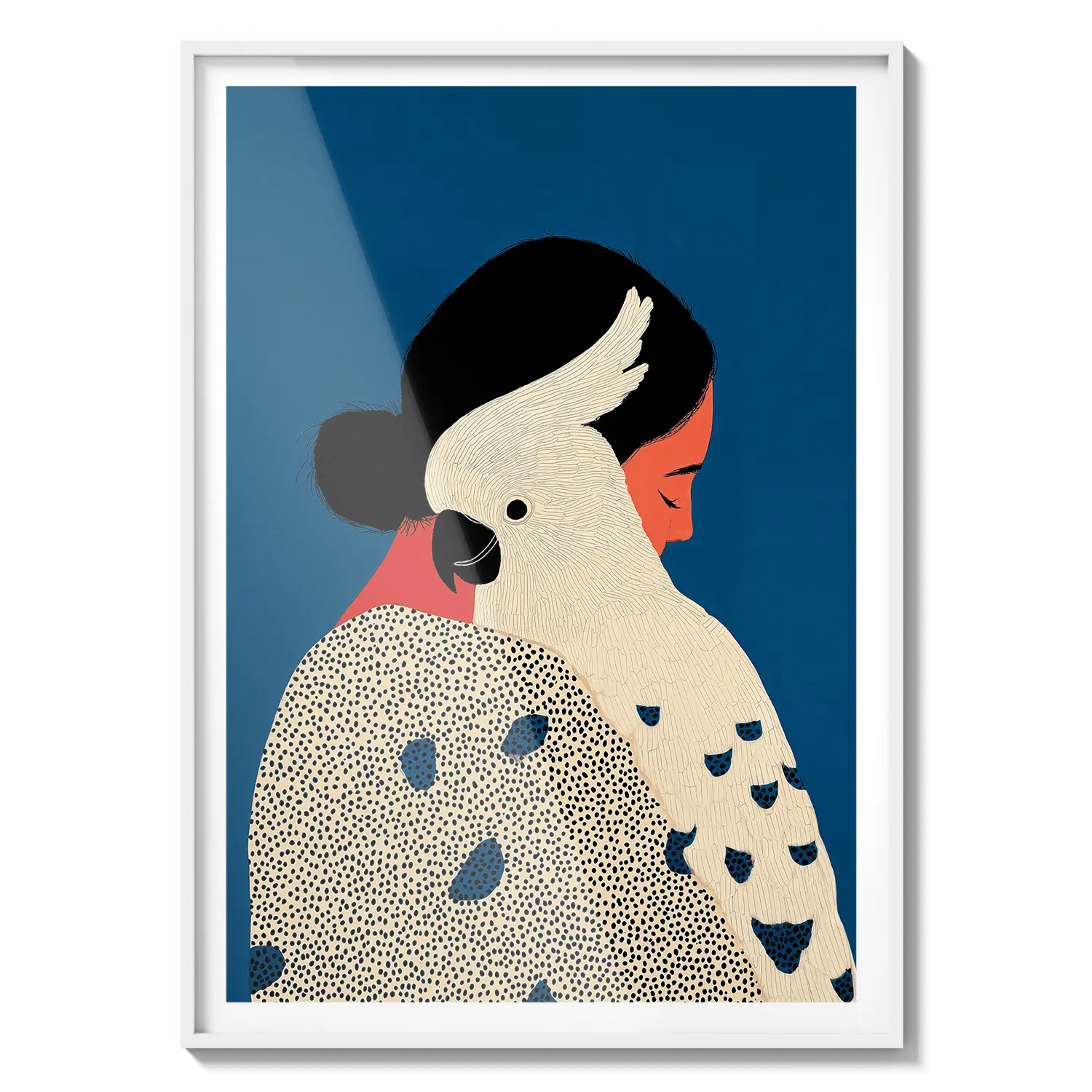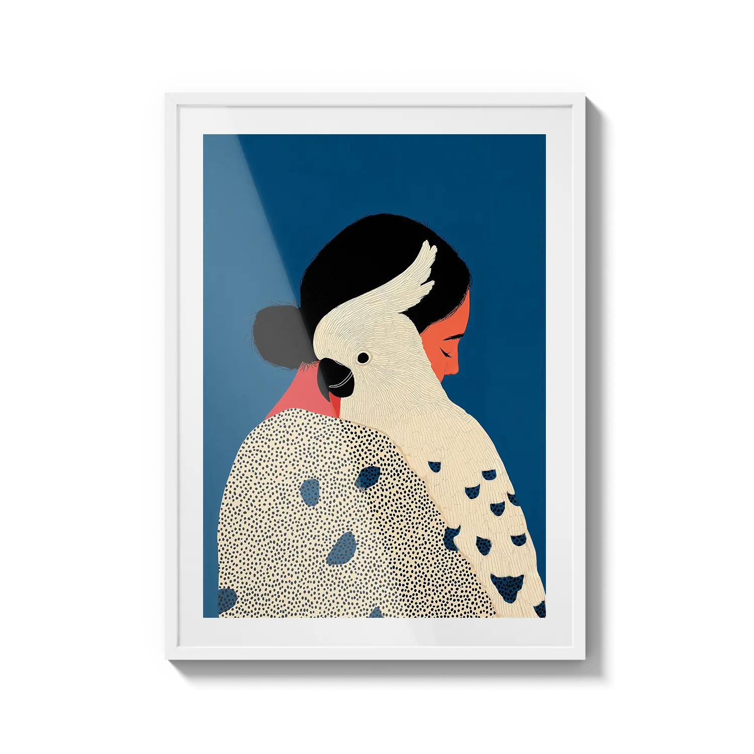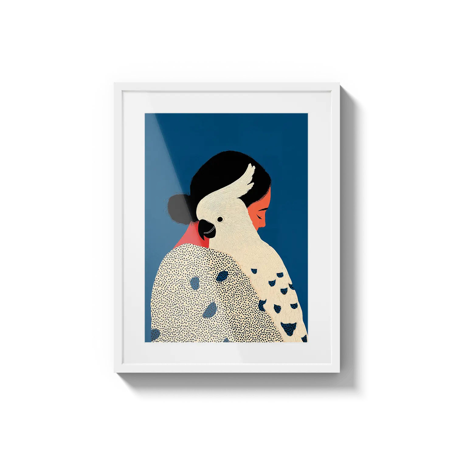 A soft illustration of a white cockatoo against gentle blue tones, radiating calm charm. A lovely, affectionate gift.