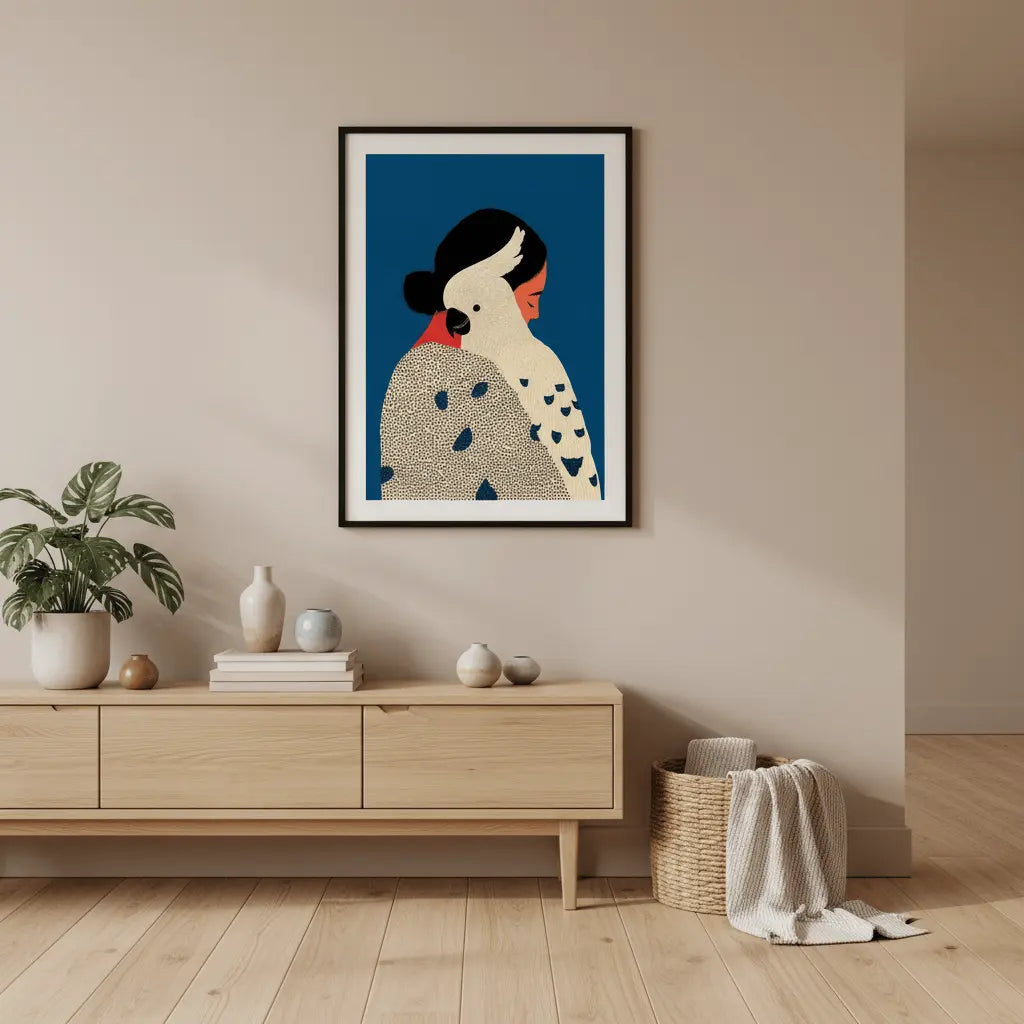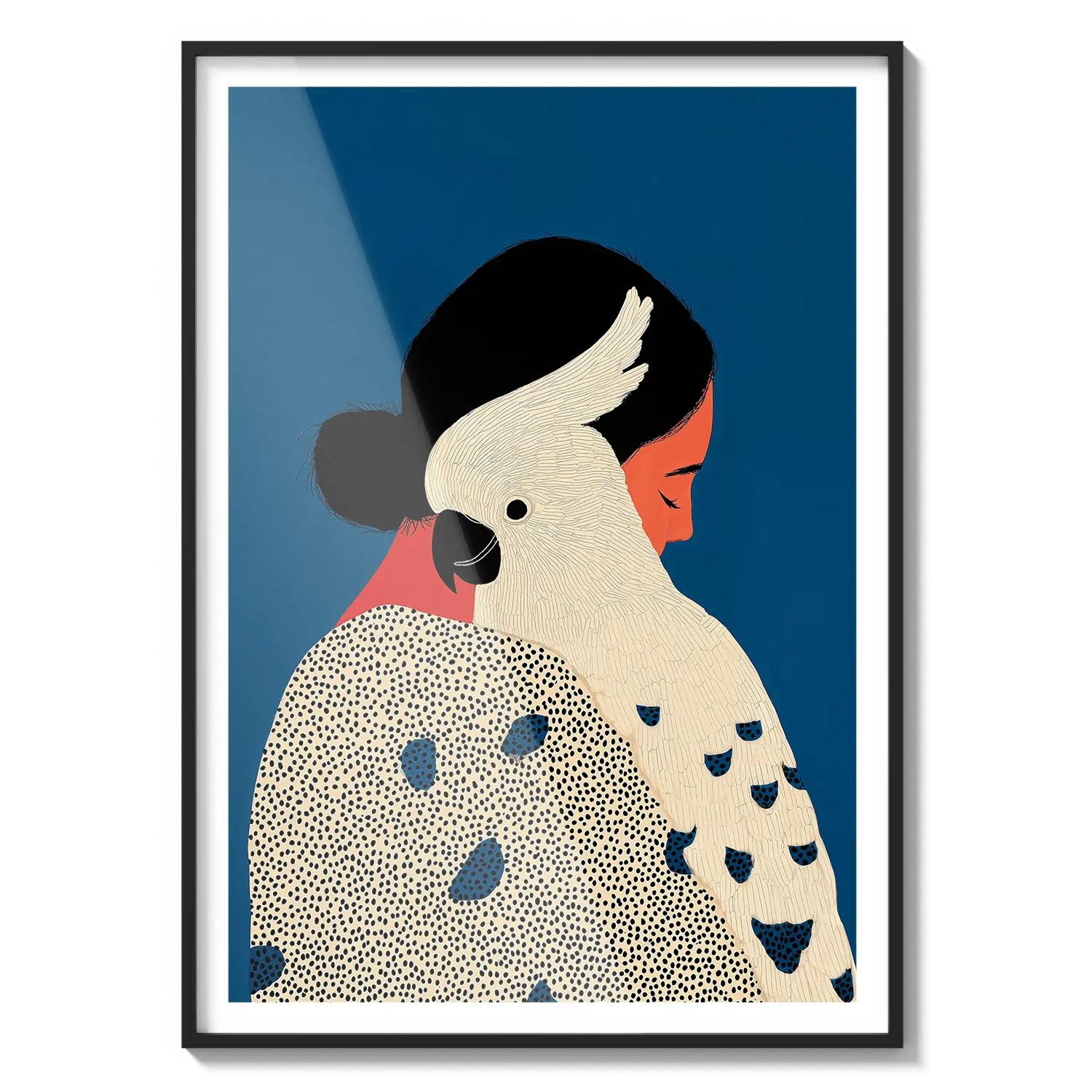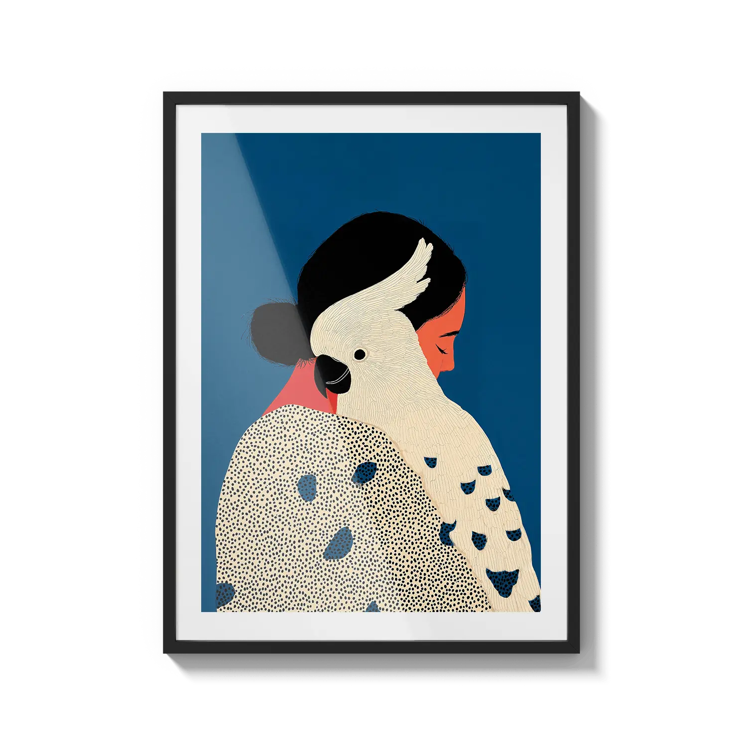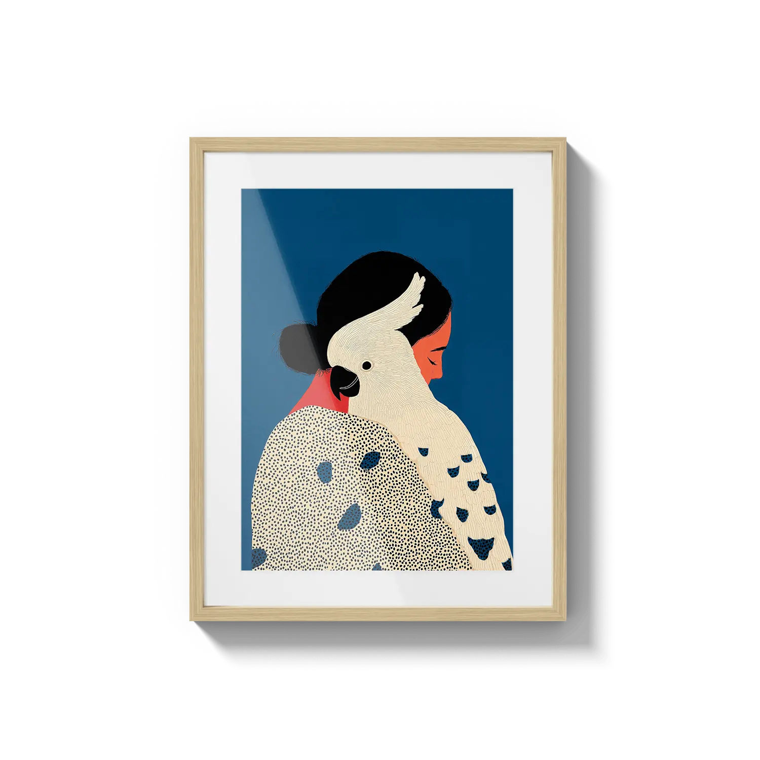 A soft illustration of a white cockatoo against gentle blue tones, radiating calm charm. A lovely, affectionate gift.