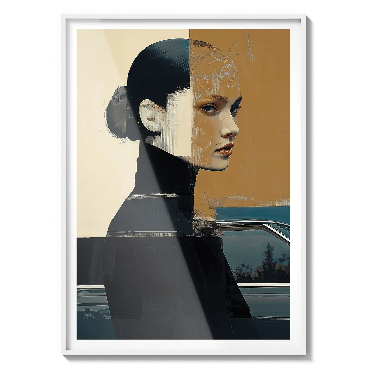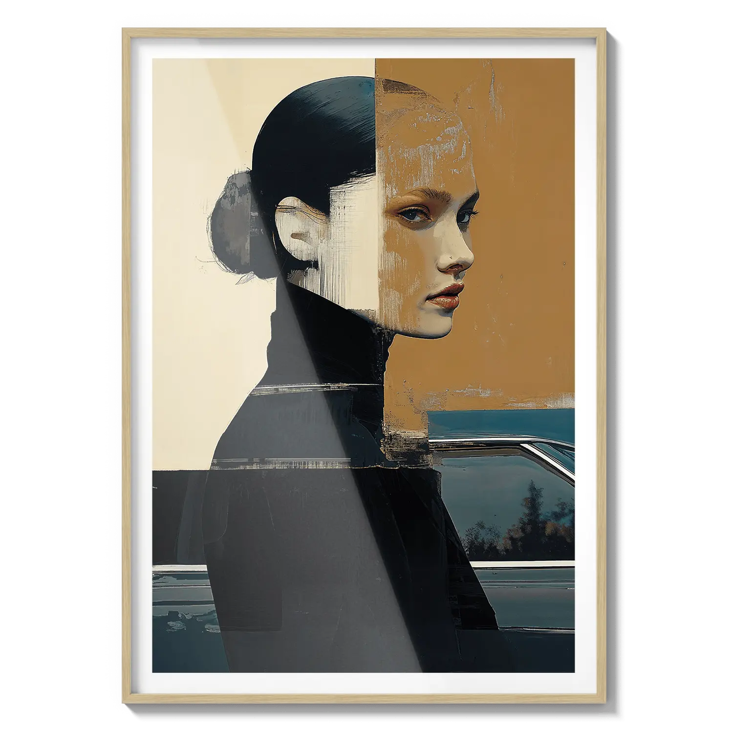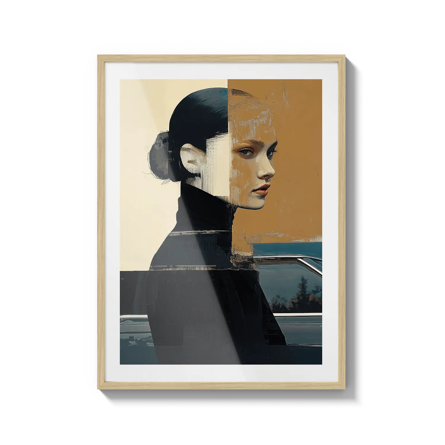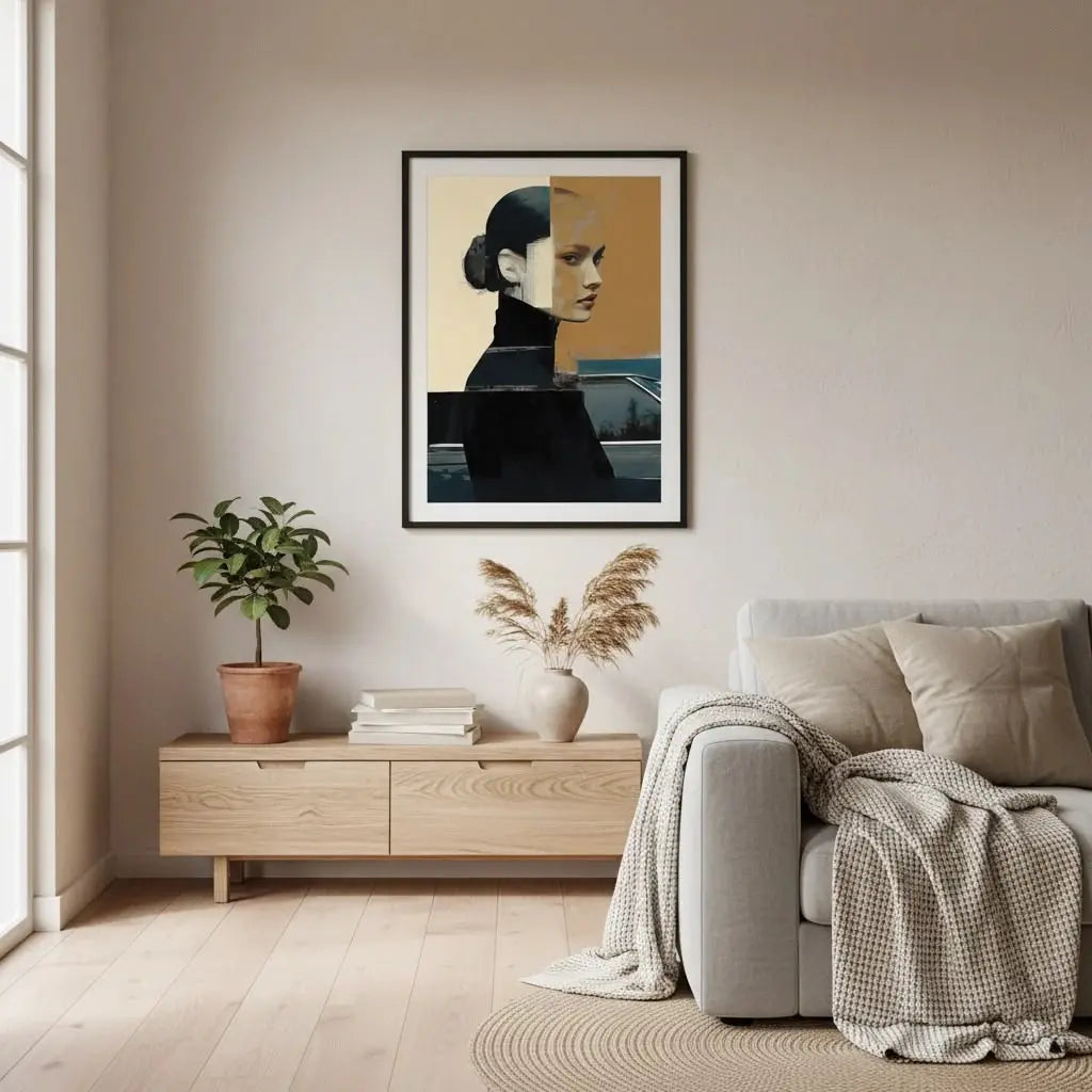 A modern portrait with bold shapes and muted tones, reflecting introspection and quiet strength. A refined and meaningful gift.