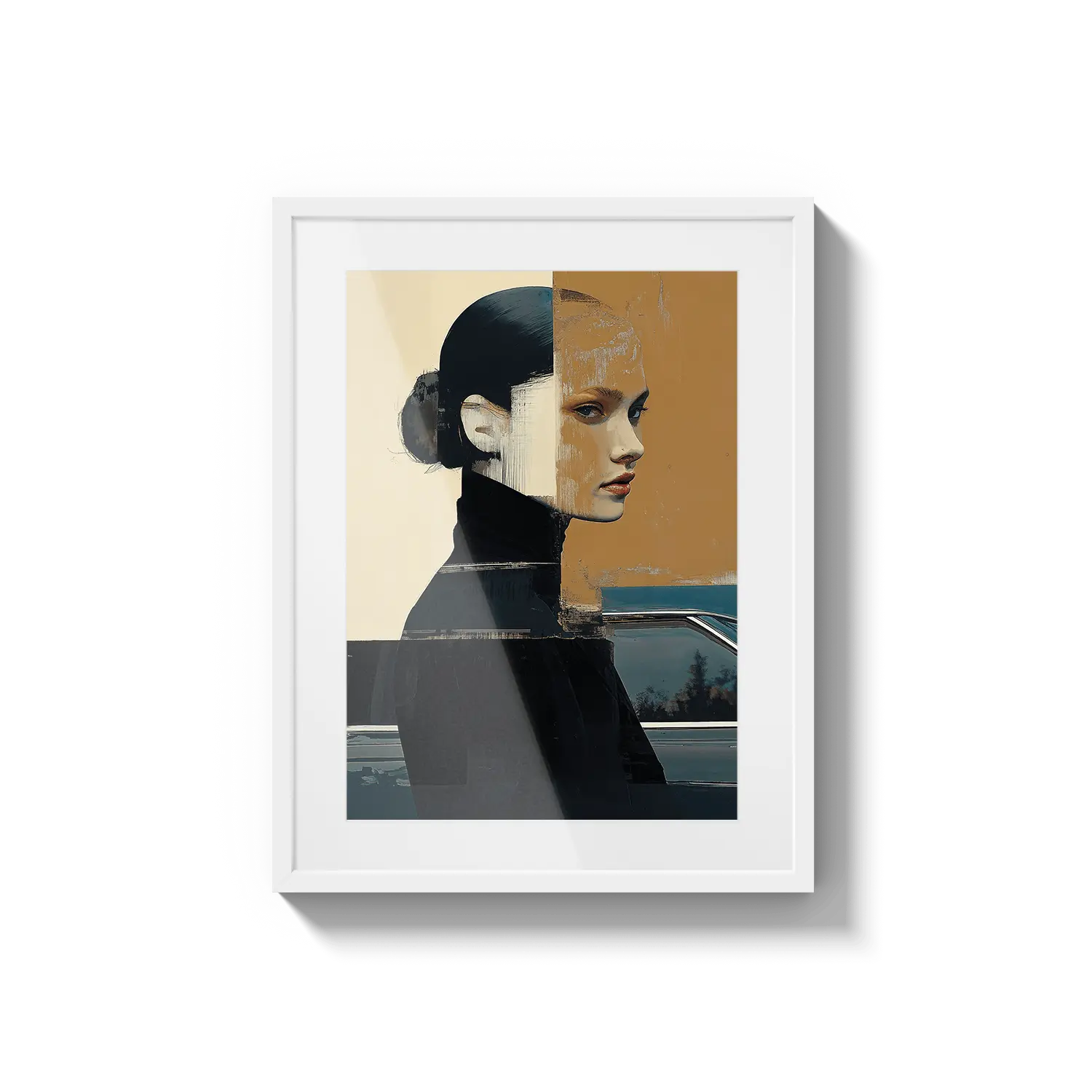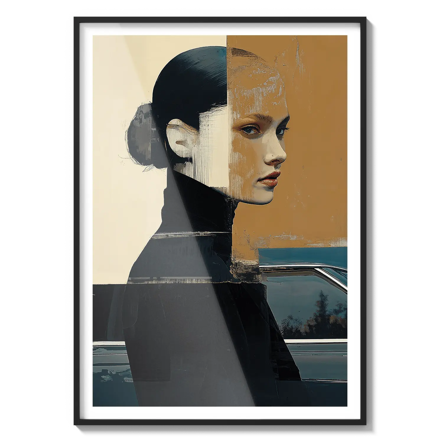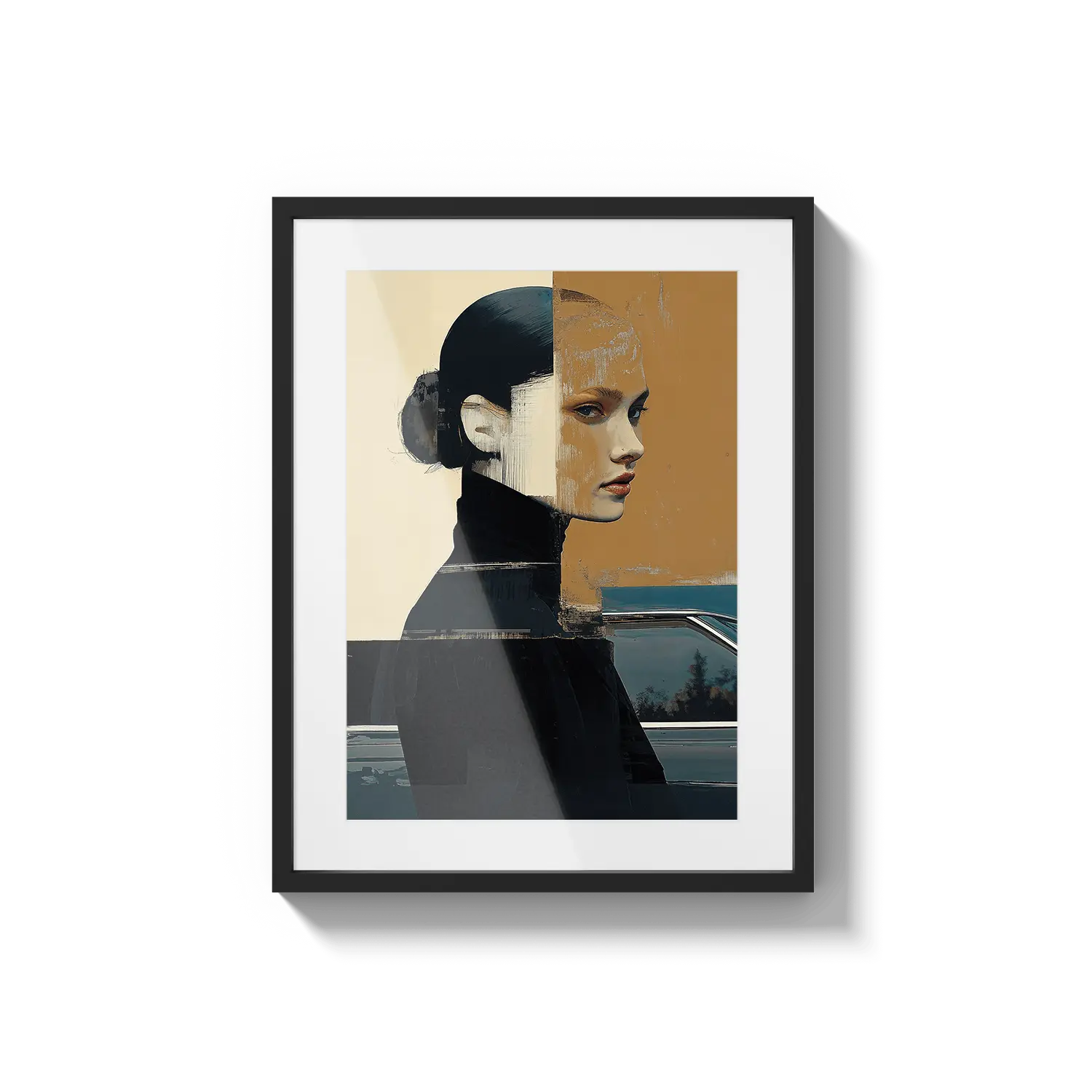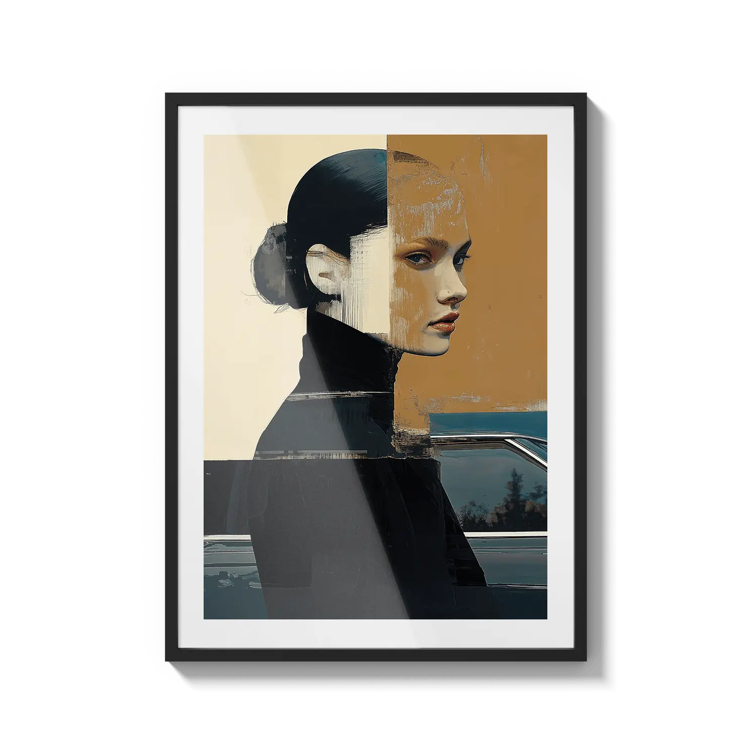 A modern portrait with bold shapes and muted tones, reflecting introspection and quiet strength. A refined and meaningful gift.