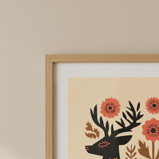 A stylized deer stands among warm floral shapes, blending folk art charm with gentle natural tones. This artwork feels thoughtful and warm, a kind gesture for someone who appreciates simplicity and quiet beauty.