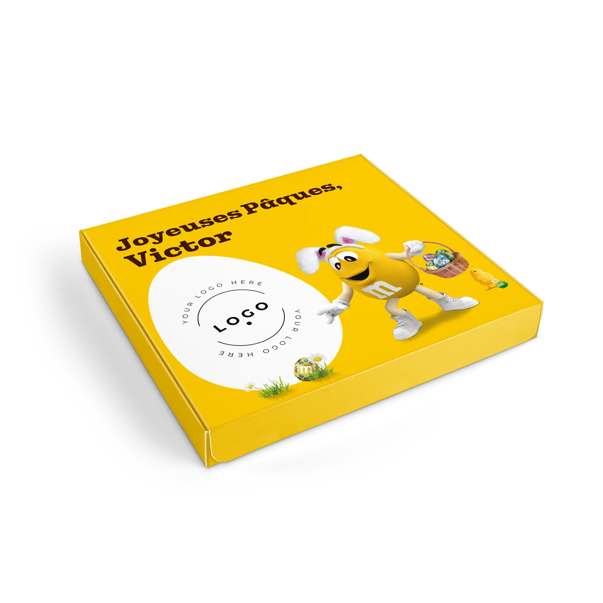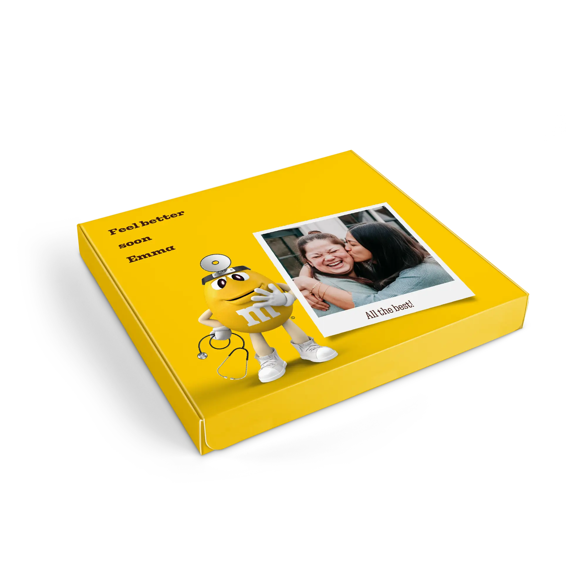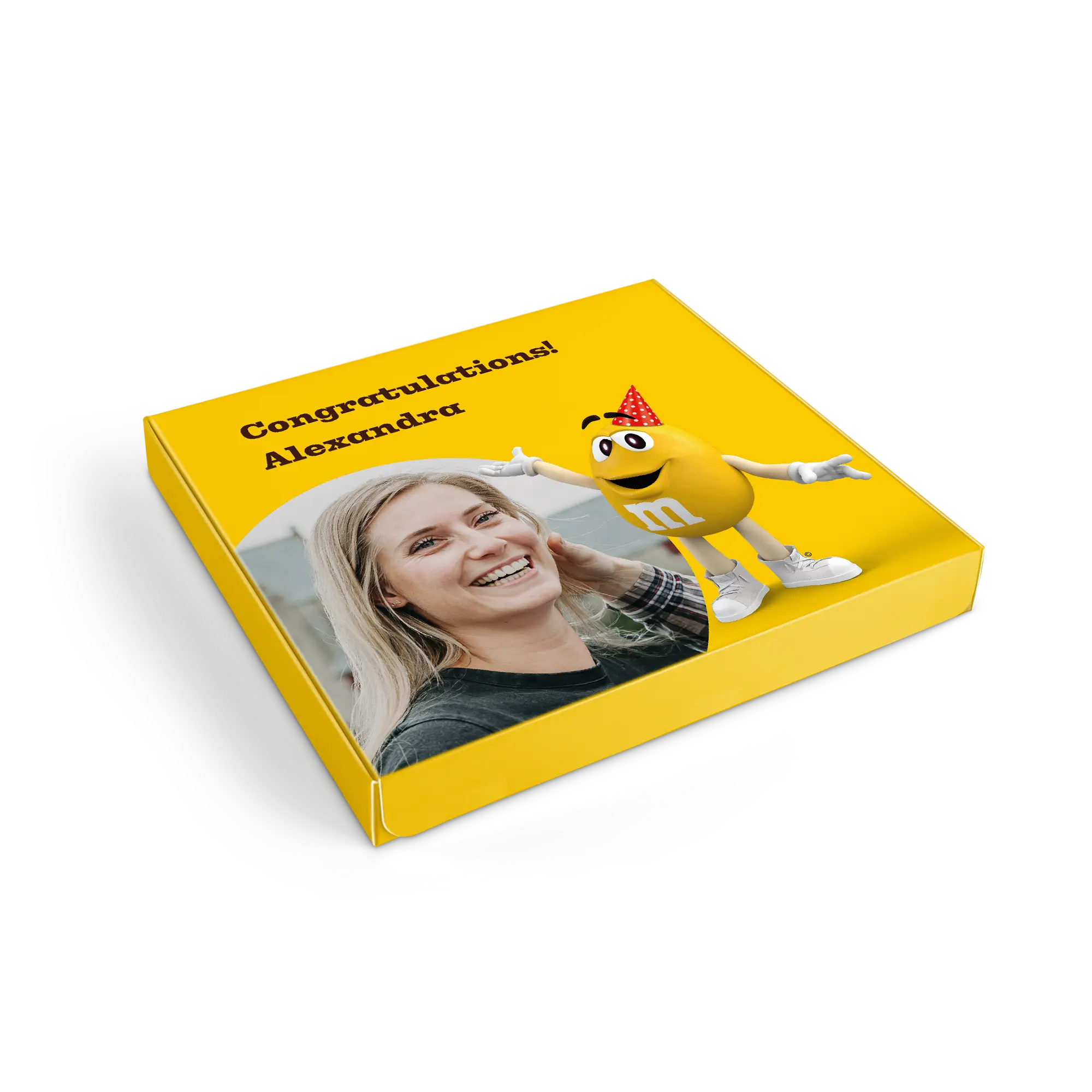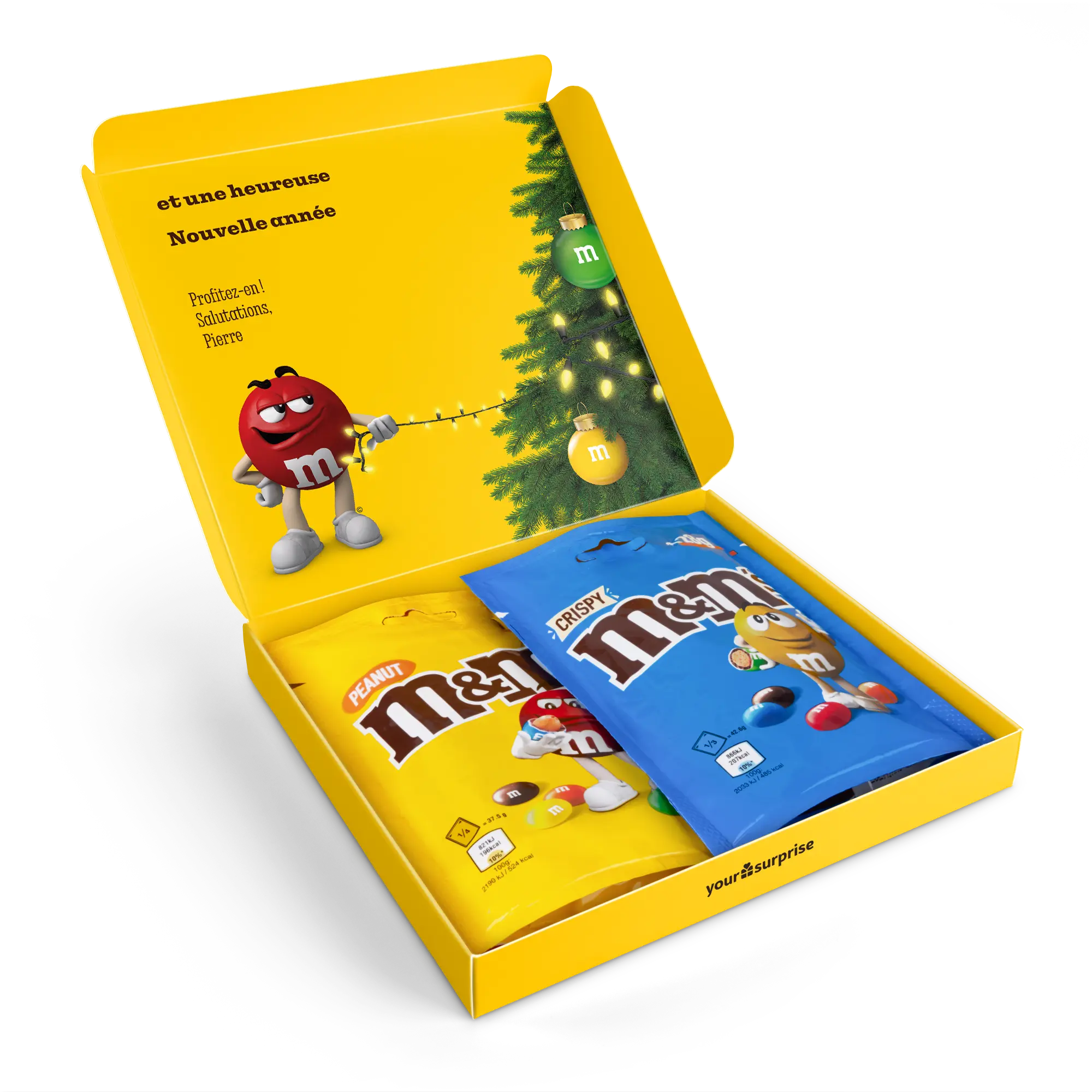 who are you going to surprise? M&M's Crispy M&M's tablets with name, photo and message in the specially designed M&M's style gift boxMore information about the M&M's gift box:Content: 2 bagsFlavours: one bag of M&M's Crispy (107 grams), one bag of M&M's Peanut (125 grams)Dimensions: 19.50 x 18 x 2 cmCustomisation: with name, photo or logo and messagePrinting: clear and full colourIngredients of M&M'S Crispy 107g: Sugar, cocoa butter, skimmed milk powder, cocoa mass, butterfat (from milk ), lactose , buttermilk powder (from milk ), rice flour, whole milk powder , whole wheat flour, emulsifier ( soya lecithin , E471), malted wheat flour, starch, palm fat, shea butter, glucose syrup, salt, rapeseed oil, stabiliser (gum arabic), colouring agents (E100, E133, E160a, E162, E170, E172), dextrin, glazing agent (carnauba wax), natural vanilla extract, palm kernel oil, flavouring.aLLERGENS: May contain traces of peanuts, hazelnuts and almonds.Ingredients of M&M'S Peanut 125g: Sugar, cocoa butter, skimmed milk powder, cocoa mass, peanuts , butterfat (from milk ), lactose , whey powder (from milk ), whole milk powder , emulsifier ( soya lecithin ), starch, palm fat, shea butter, glucose syrup, salt, stabiliser (gum arabic), colouring agents (E100, E133, E160a, E162, E170, E172), dextrin, glazing agent (carnauba wax), natural vanilla extract, palm kernel oil, flavouring.aLLERGENS: May contain traces of almond, hazelnut and wheat.Important to know: with temperatures above 25 degrees Celsius, we cannot guarantee that you will receive your chocolate gift in perfect condition. Questions? Unfortunately, for technical reasons, it is not possible to process numbers, Cyrillic, Turkish or special characters.