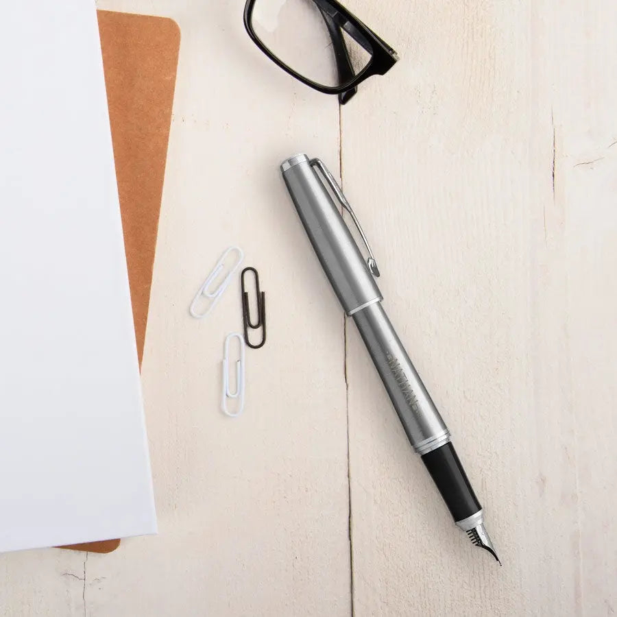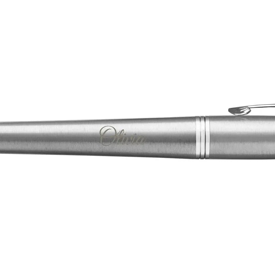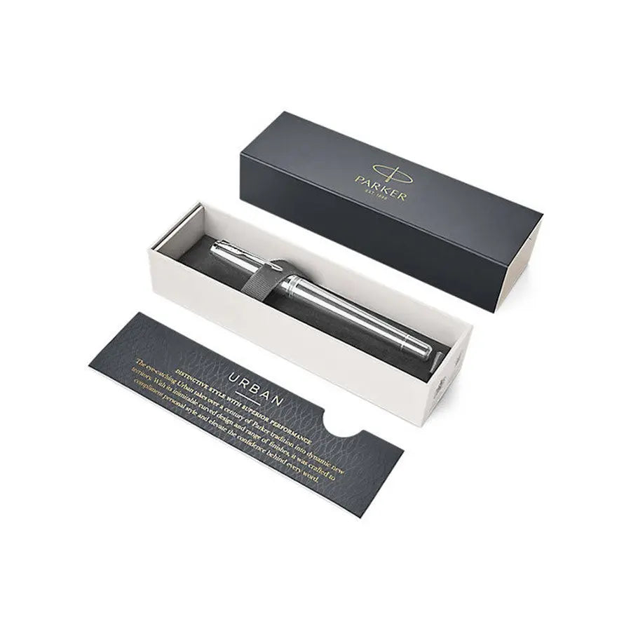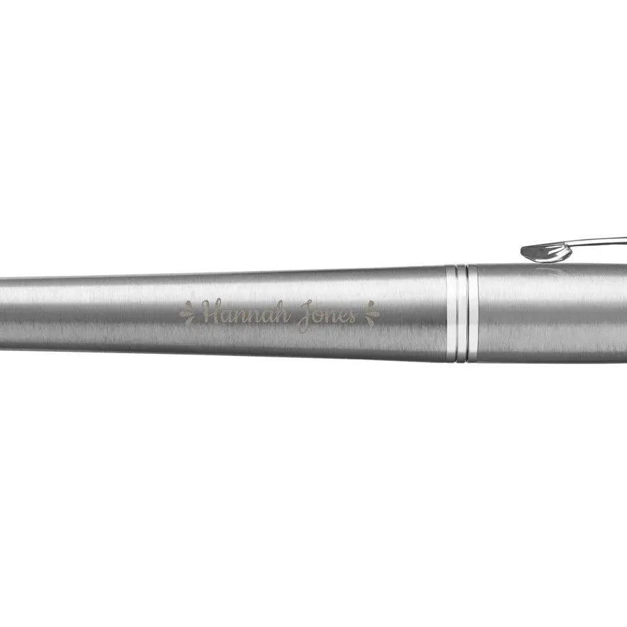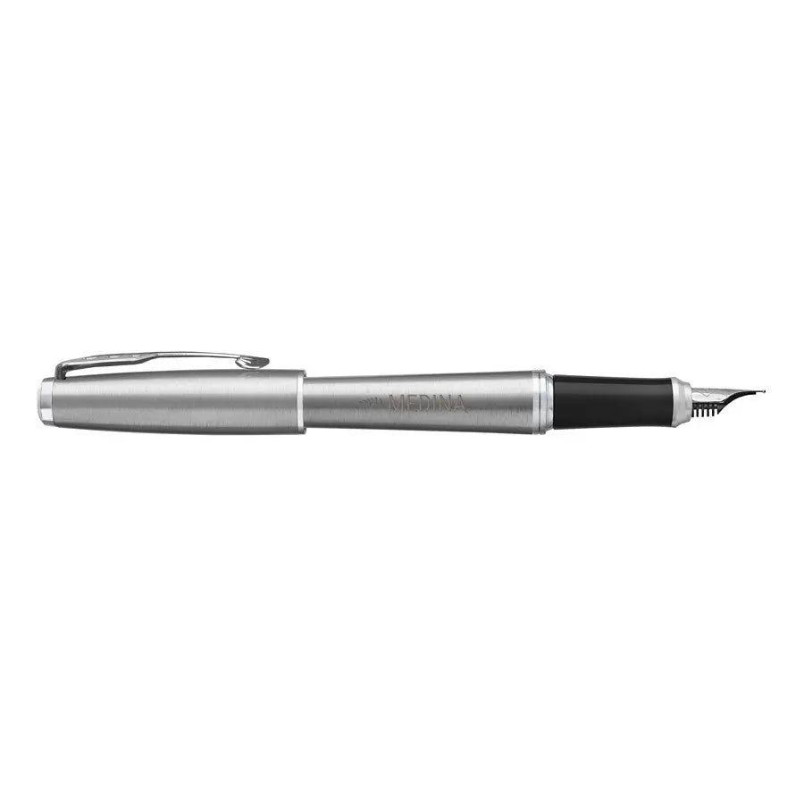 Parker pen engraved with a name or text. Parker Urban fountain pen with your design. Available in several vibrant colours. In luxury gift box!Additional information about the engraved Parker Urban pen:Brand: ParkerModel: Urban Metro Type: Fountain penColour pen: Silver-colouredInk colour: BluePersonalisation: Engraved text Engraving colour: Gold-coloured Extra: includes 1 filling and delivered in a luxurious gift box. Can be refilled with Parker fillings.Please note: this pen is suitable for left-handed people