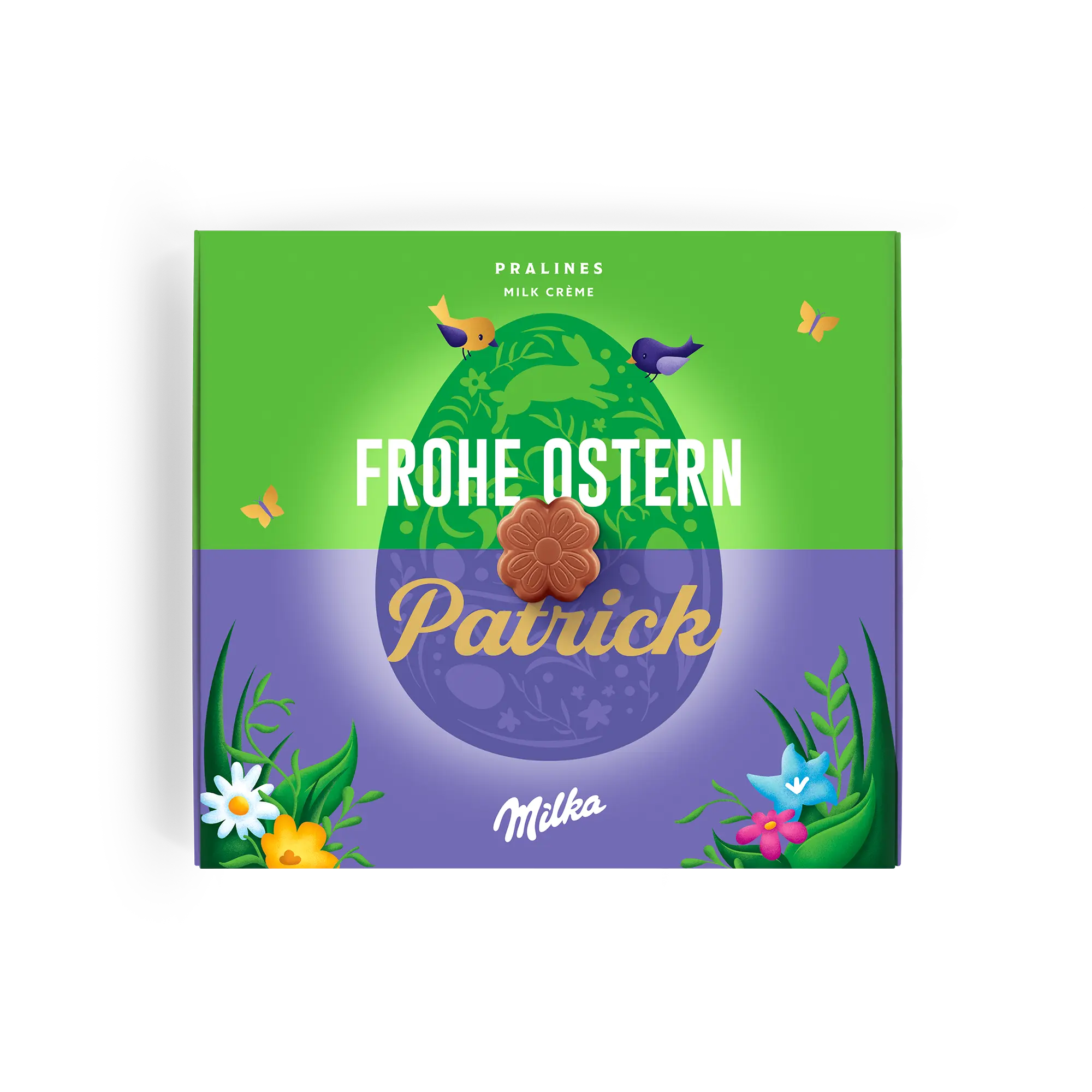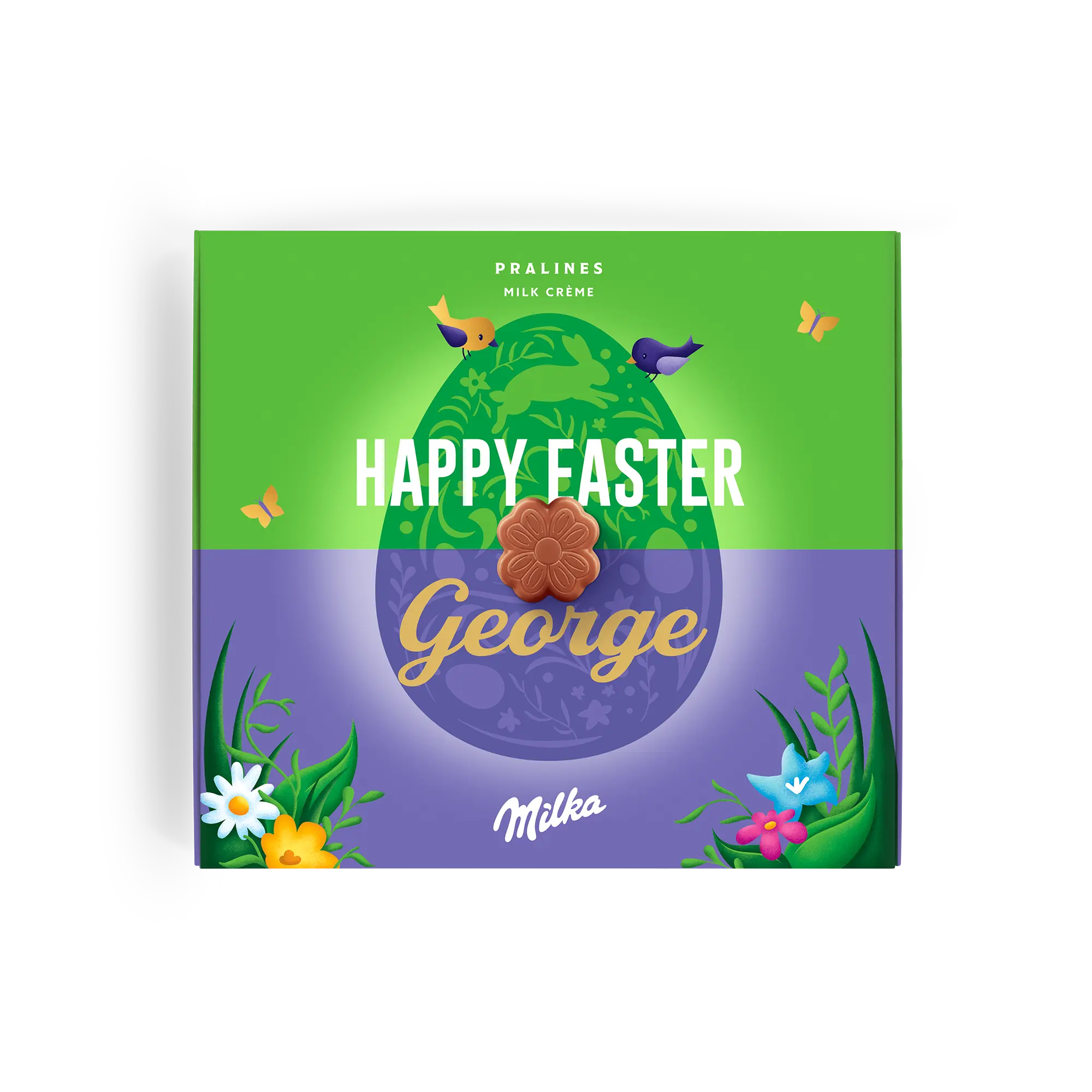 Special Say it with Milka chocolate box for Easter. Delicious pralines with name, photo and a personal message. Surprise your loved ones!More information on the Milka Easter gift:Chocolate: Alpine milk chocolate with cream fillingPraline shape: flowersAmount of pralines: 20Weight: 110 gramsDimensions: 19.50 x 18 x 2 cmPersonalisation: photo, name and personal messagePrint: picture perfect and in full colourIngredients: Sugar, palm oil, cocoa butter, skimmed MILK POWDER, whey powder (from MILK), cocoa mass, MILK FAT, emulsifiers (SOY lecithin, E476), HAZELNUT PASTE, flavourings. 7% skimmed milk powder in the milk cream filling.Allergens: Contains hazelnuts, milk and soy. May contain other nuts and gluten.Good to know:When the outside temperature is 25 degrees Celsius or above we will not be able to guarantee the quality of the chocolate. If you have any questions regarding your chocolate orders please contact our customer service team.For technical reasons, it is not possible to process Cyrillic, Turkish, Arabic, Asian or special characters.
