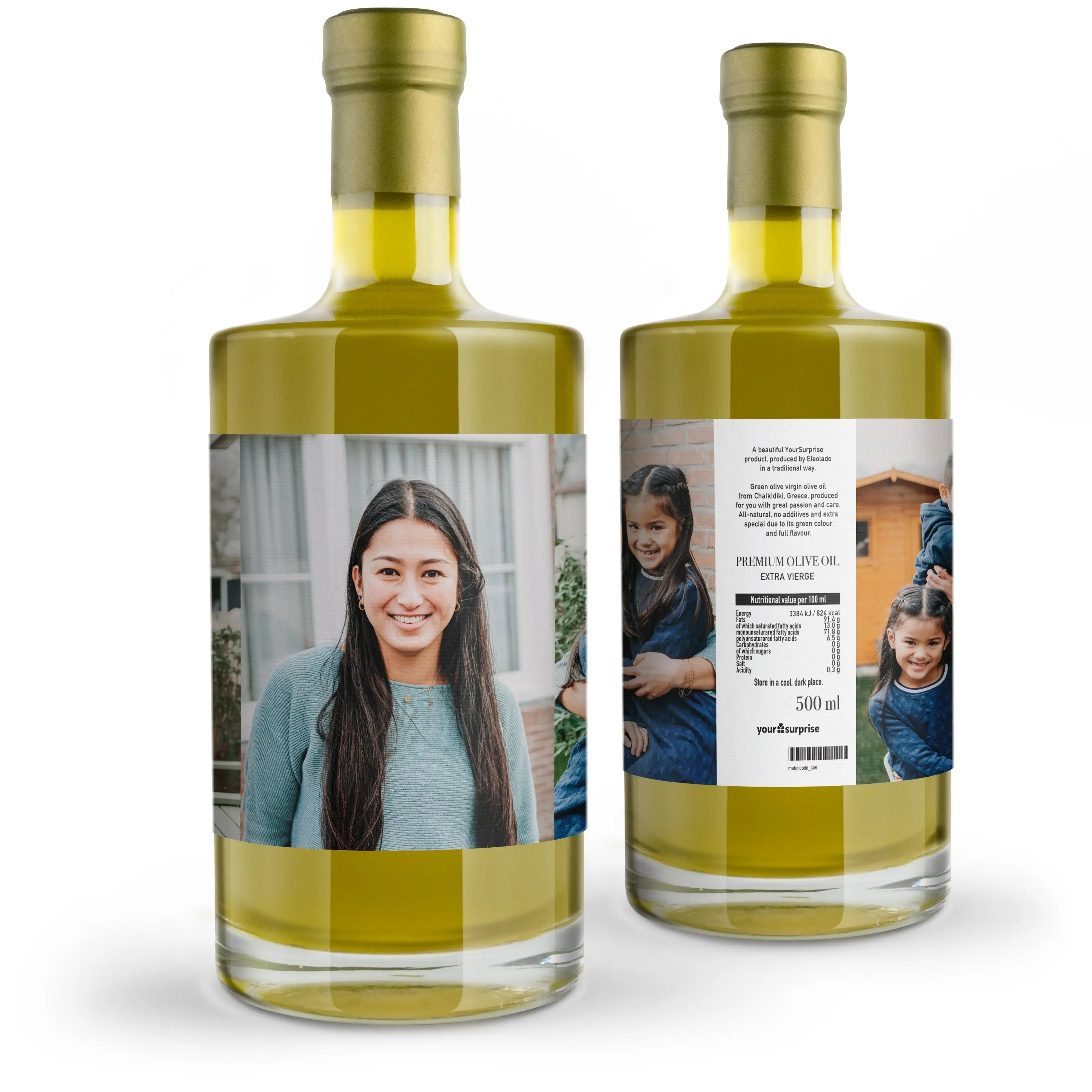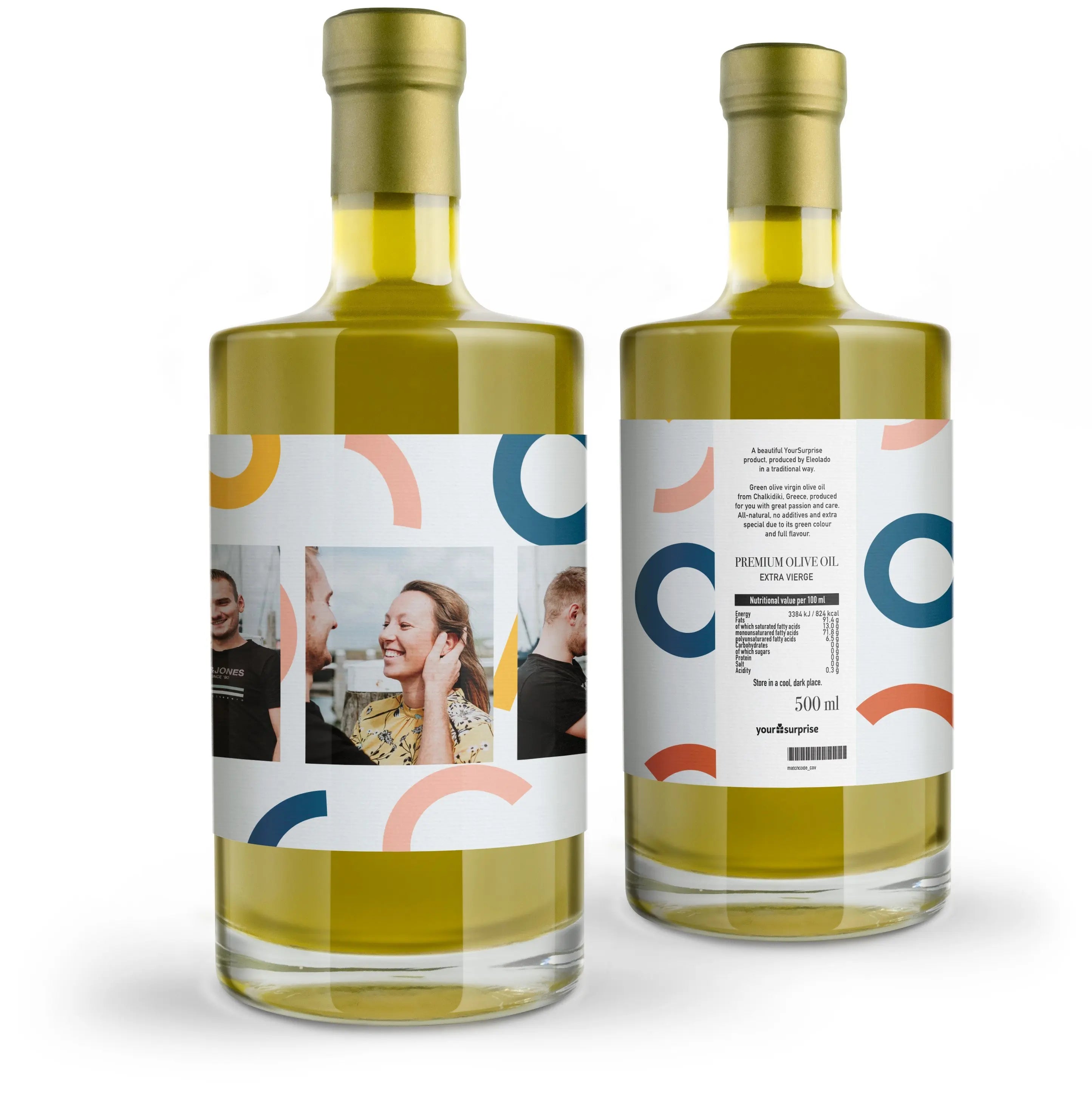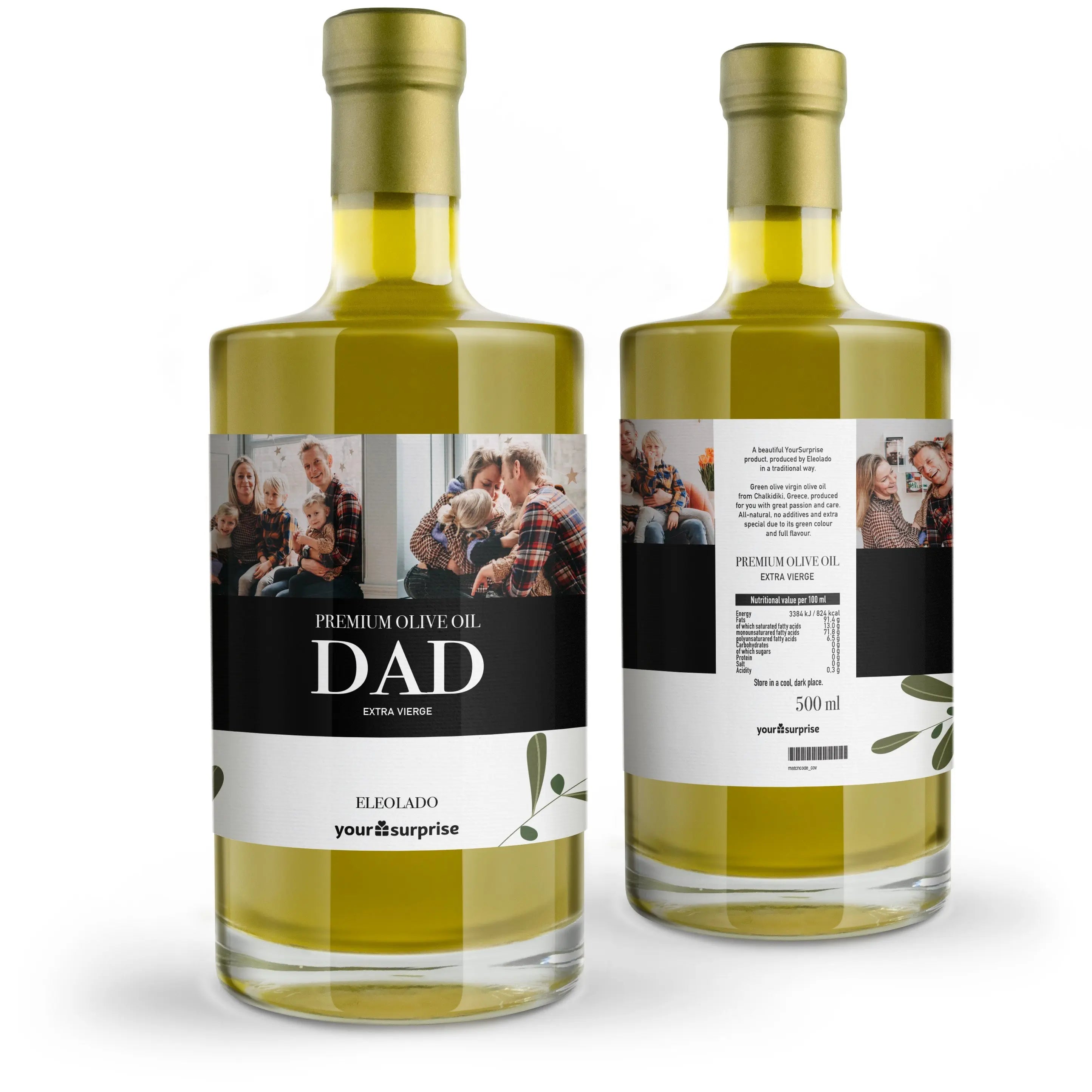 Surprise your loved one with a personalised bottle of Eleolado olive oil featuring the photo and/or text of your choice. Perfect housewarming gift!More information on the Eleolade olive oil: Personalisation: with photo and/or textPrint: picture-perfect and in full colourContents: 500 ml Label dimensions: 24 x 9 cmExtra: Excluding wooden case, though this can be added separately.