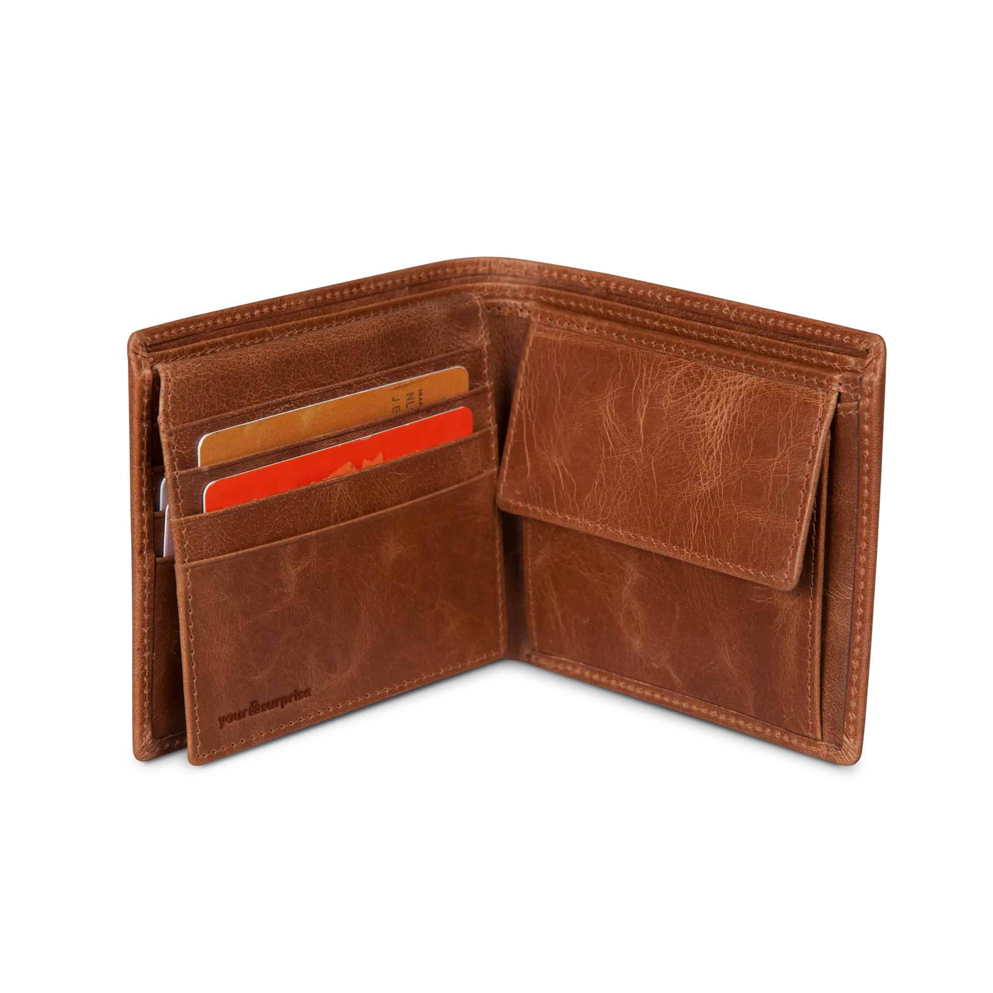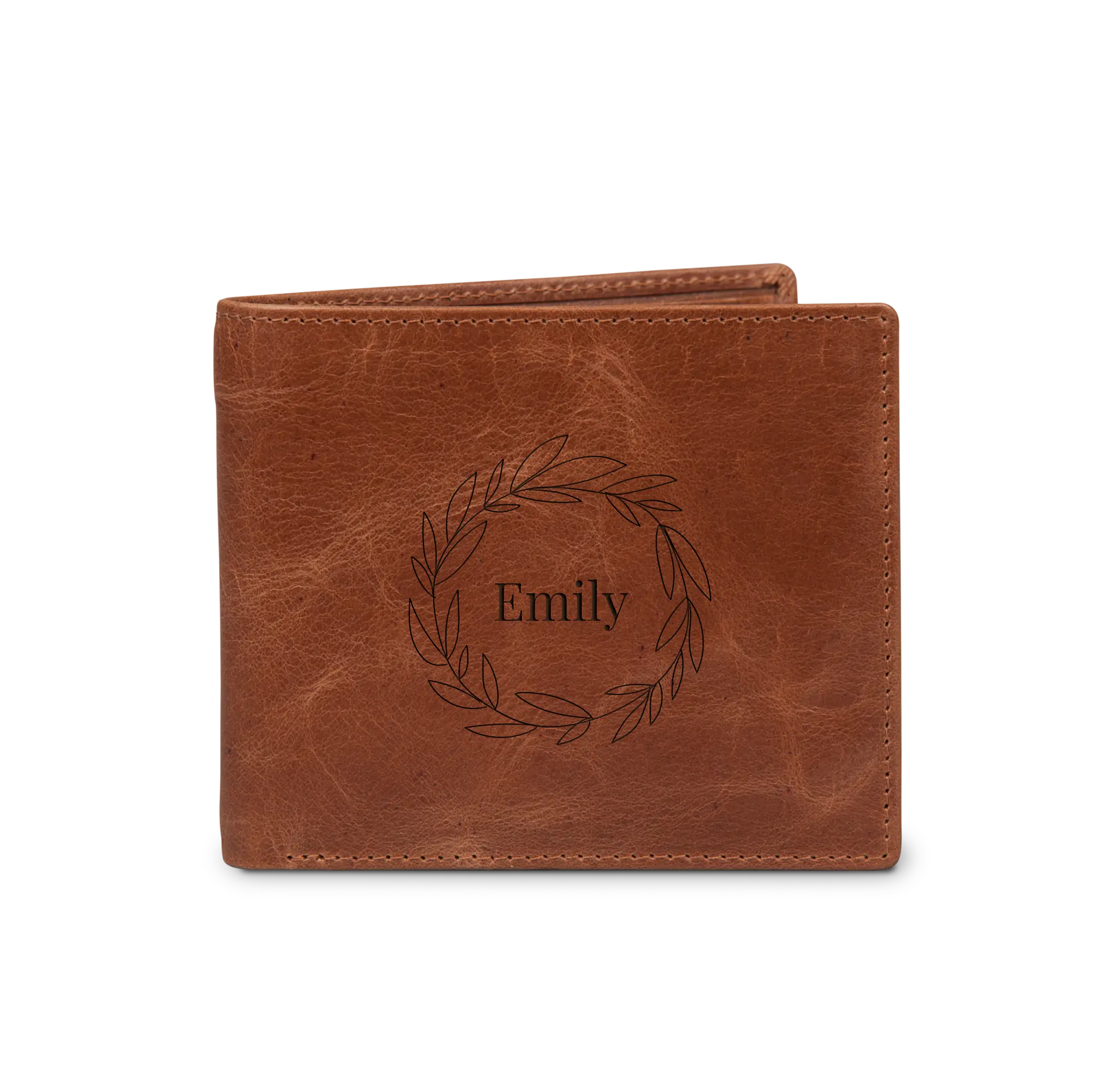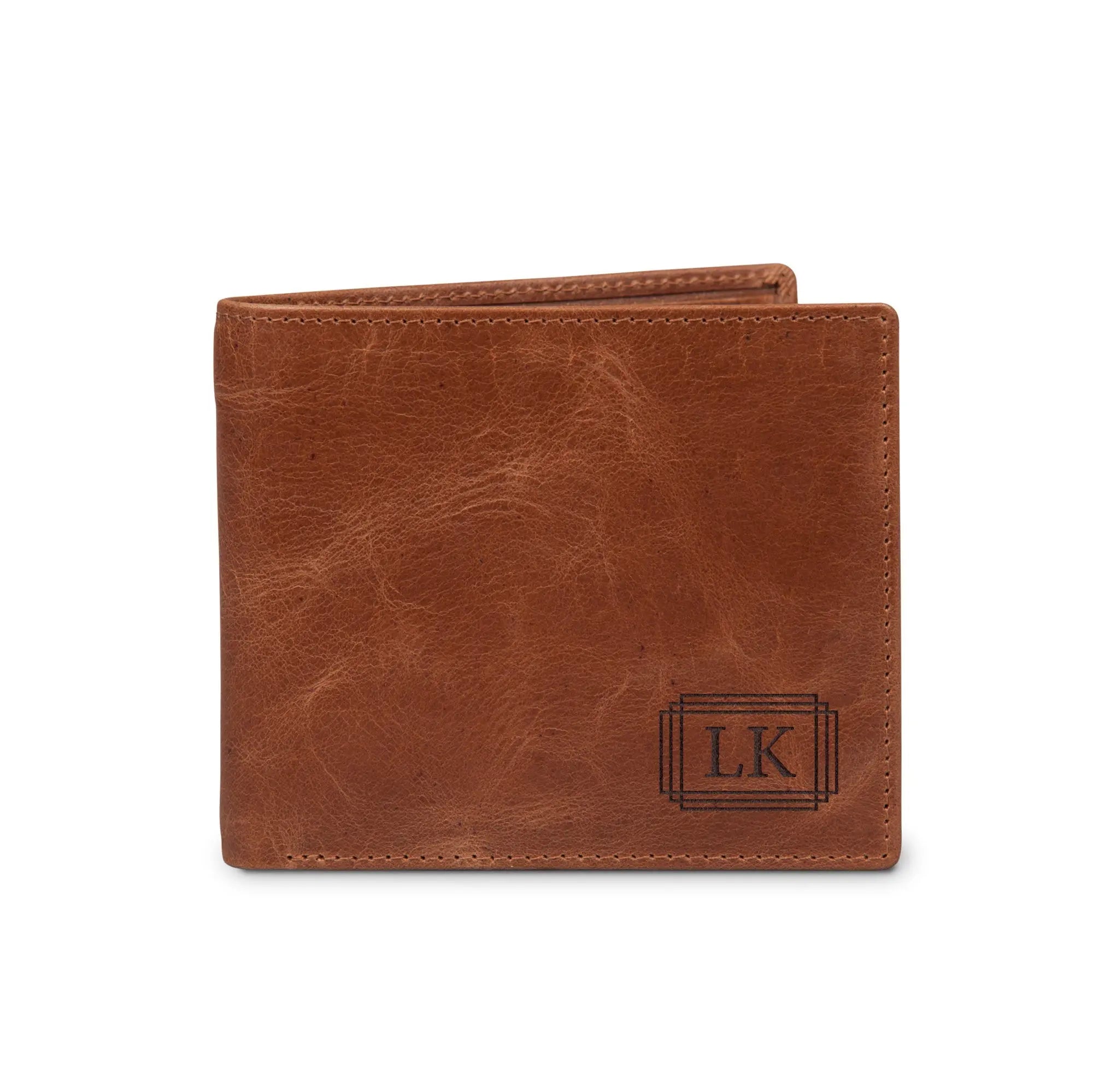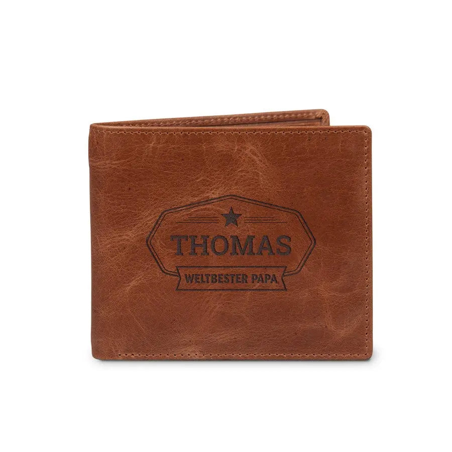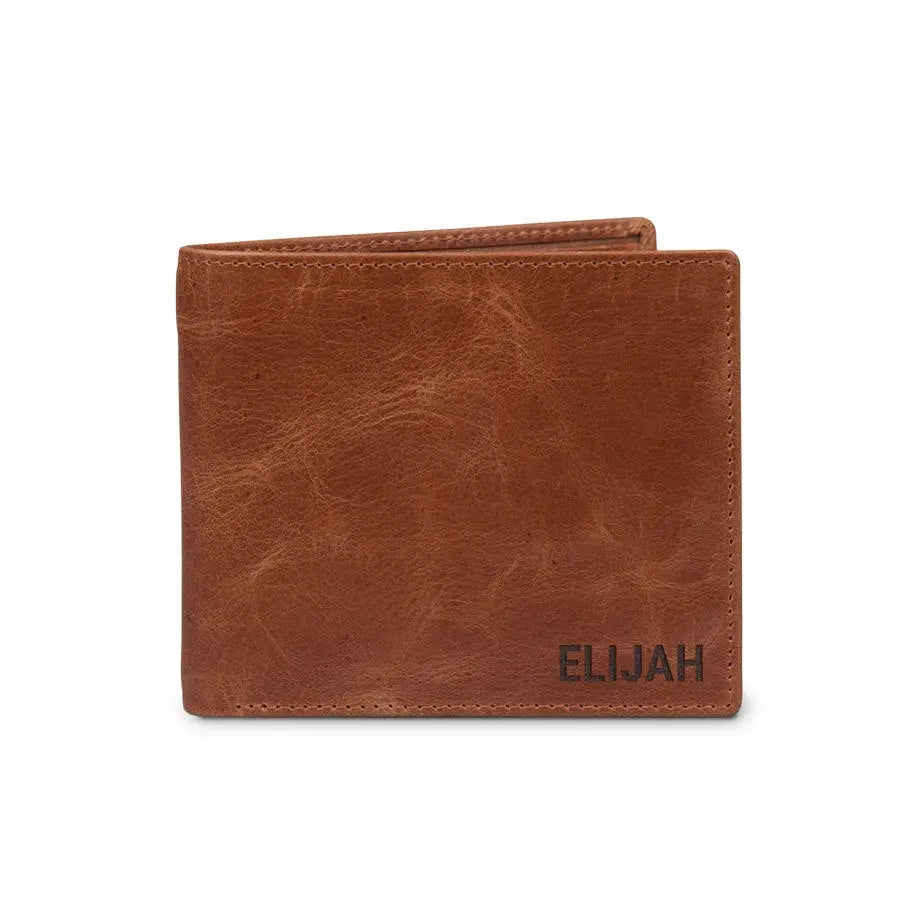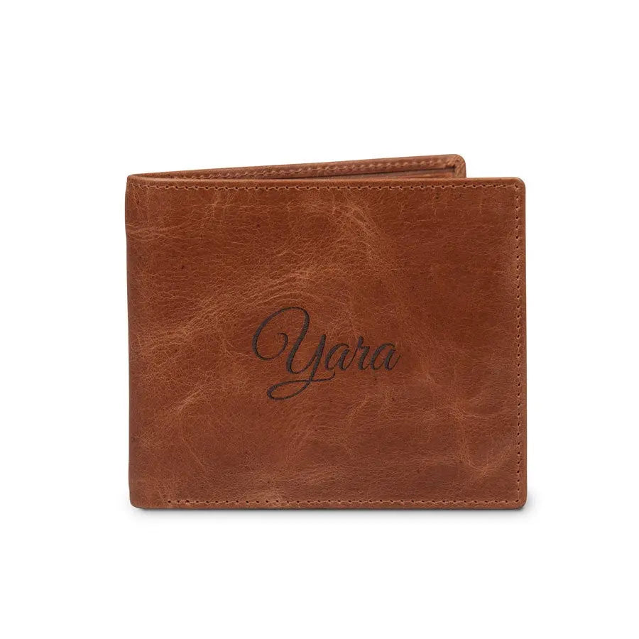 A unique leather wallet with engraved name and/or text. Made of vegetable tanned full grained buffalo leather The most beautiful gift for everyone!More information on the engraved leather wallet:Model: bill fold Material: Vegetable tanned full grained buffalo leather Dimensions: 11.5 x 9.5 x 2.3 cm Color: brown (brandy) Content: space for cards, photos, banknotes and coins Finish: high-quality laser engraving Personalisation: With a name and/or text Extra: Leather is a natural product. This means your gift may differ slightly from the example photo.