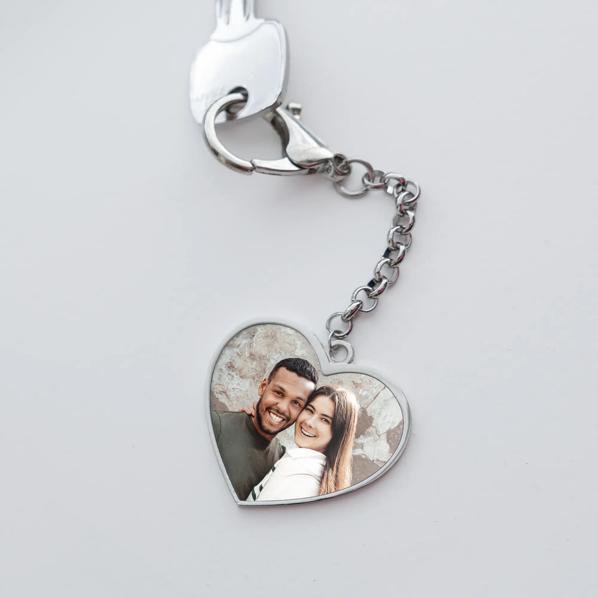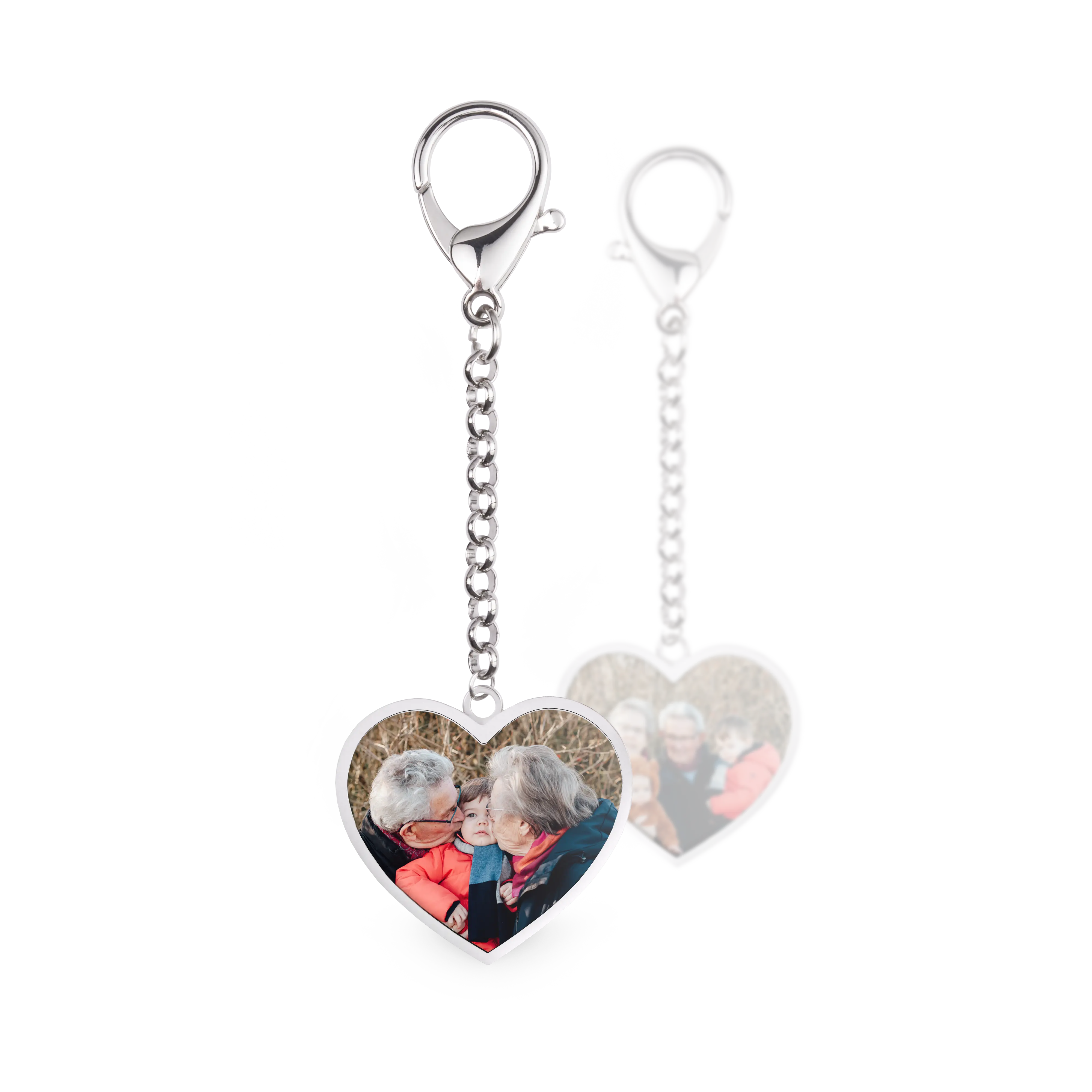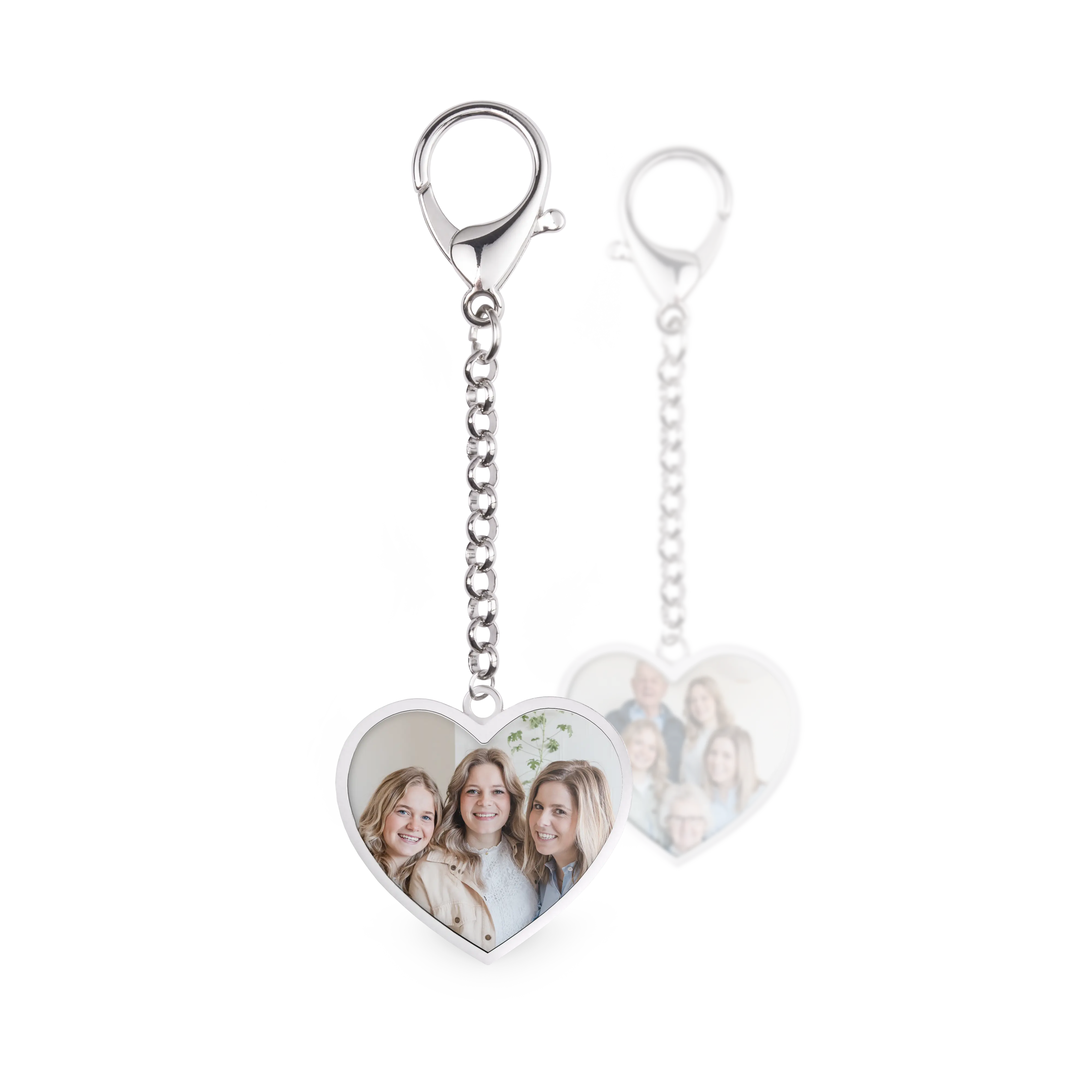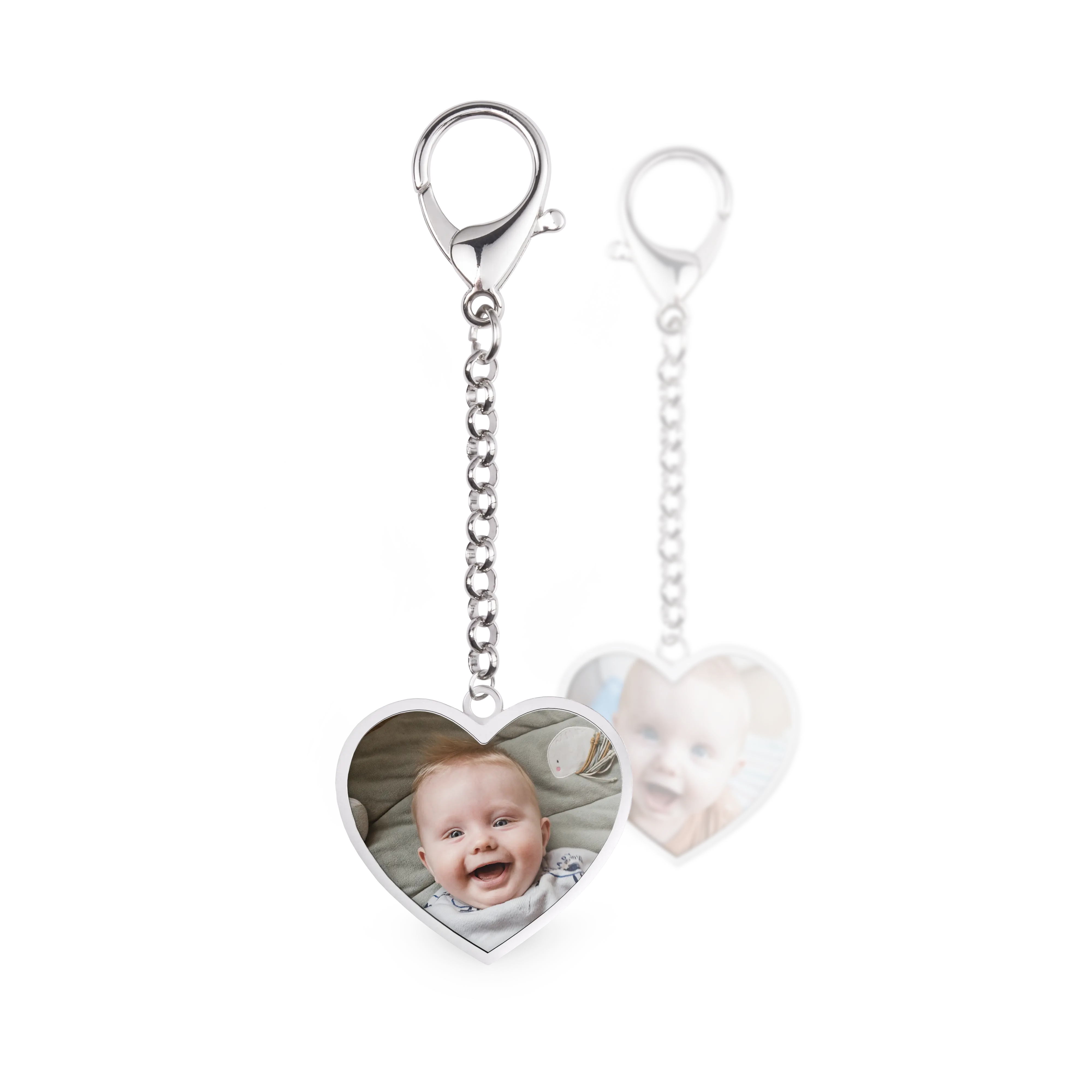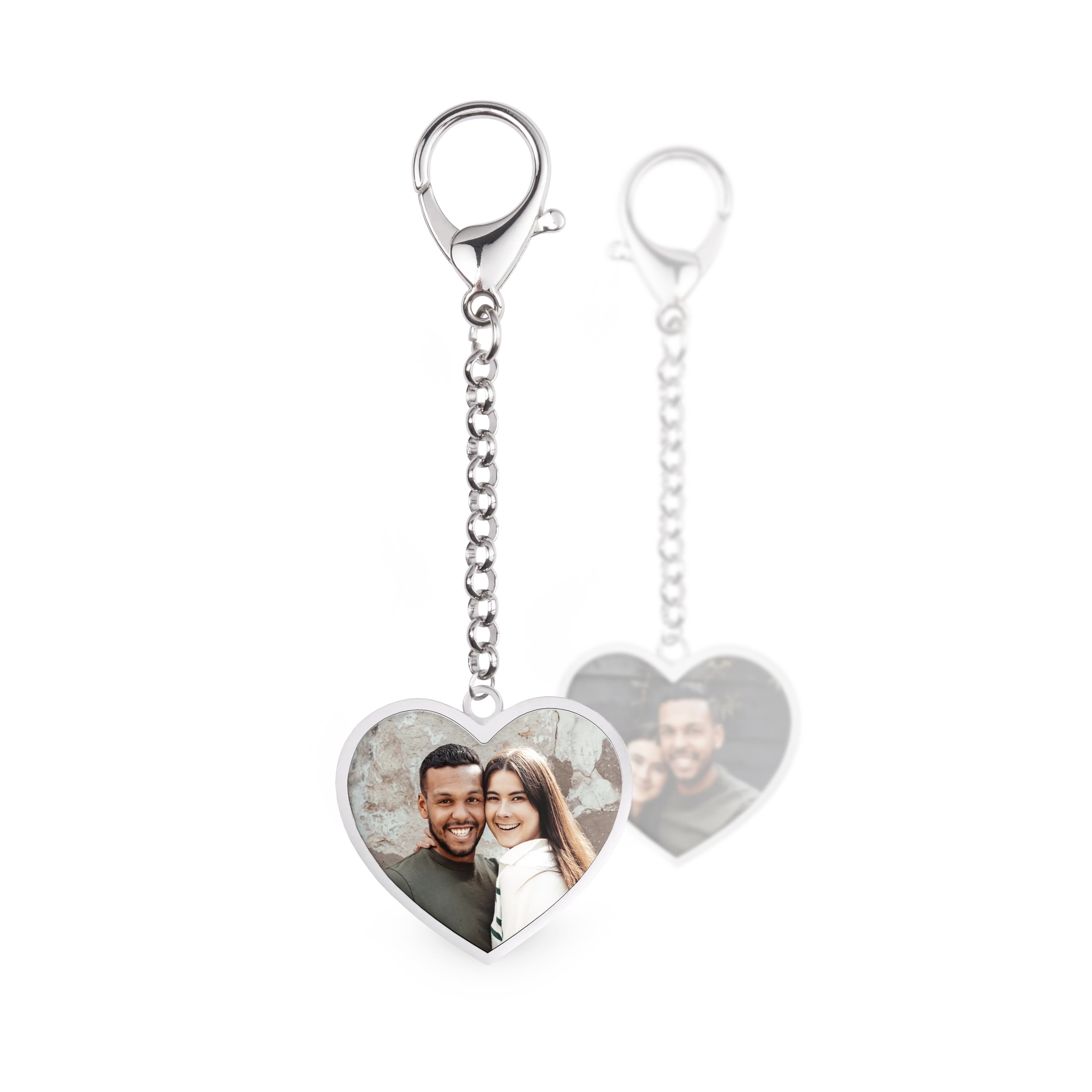 A lovely heart-shaped keyring with your own photo, name or text printed on both sides.More information about the heart-shaped keyring:Material: stainless steelColour: silver Size: 4.6x4cm