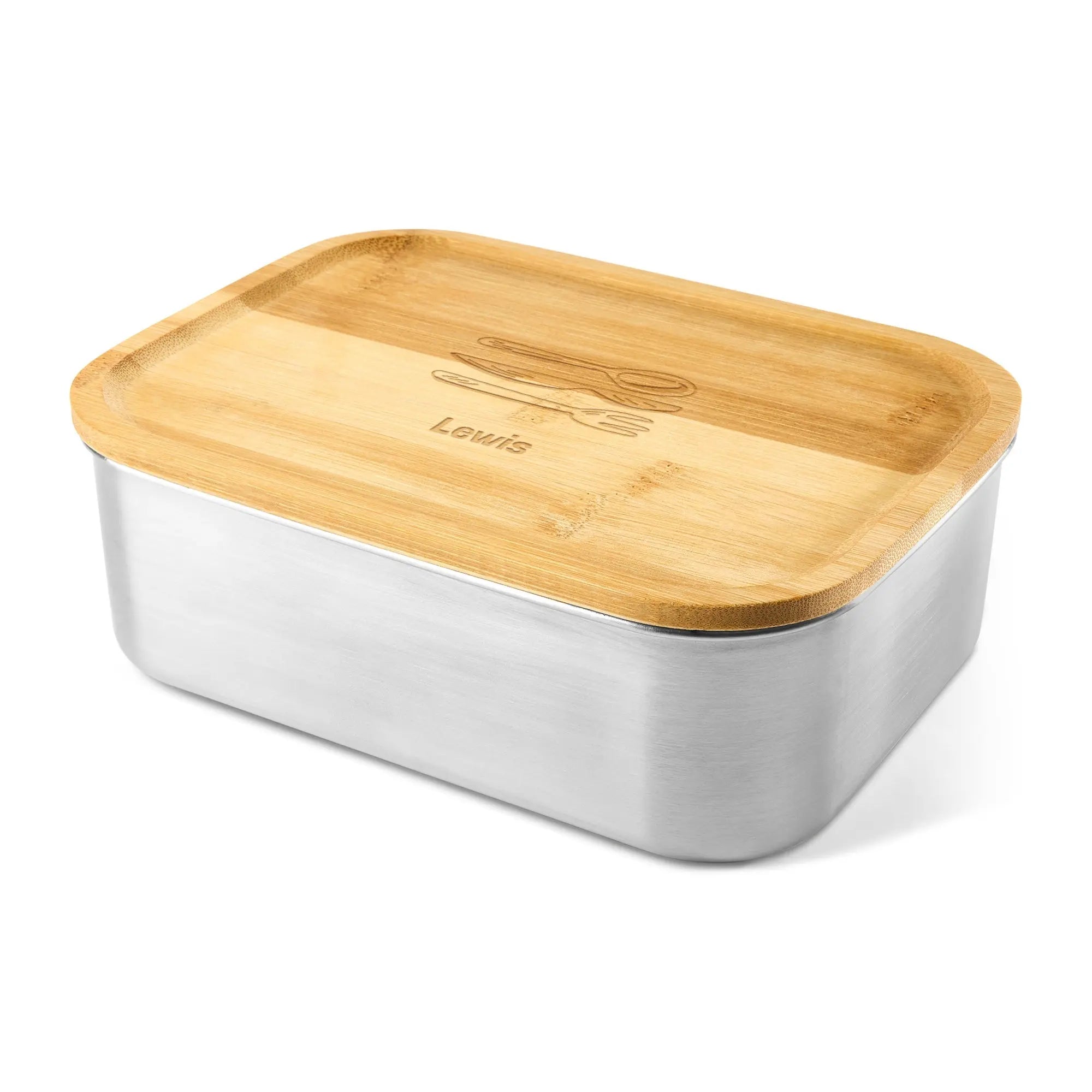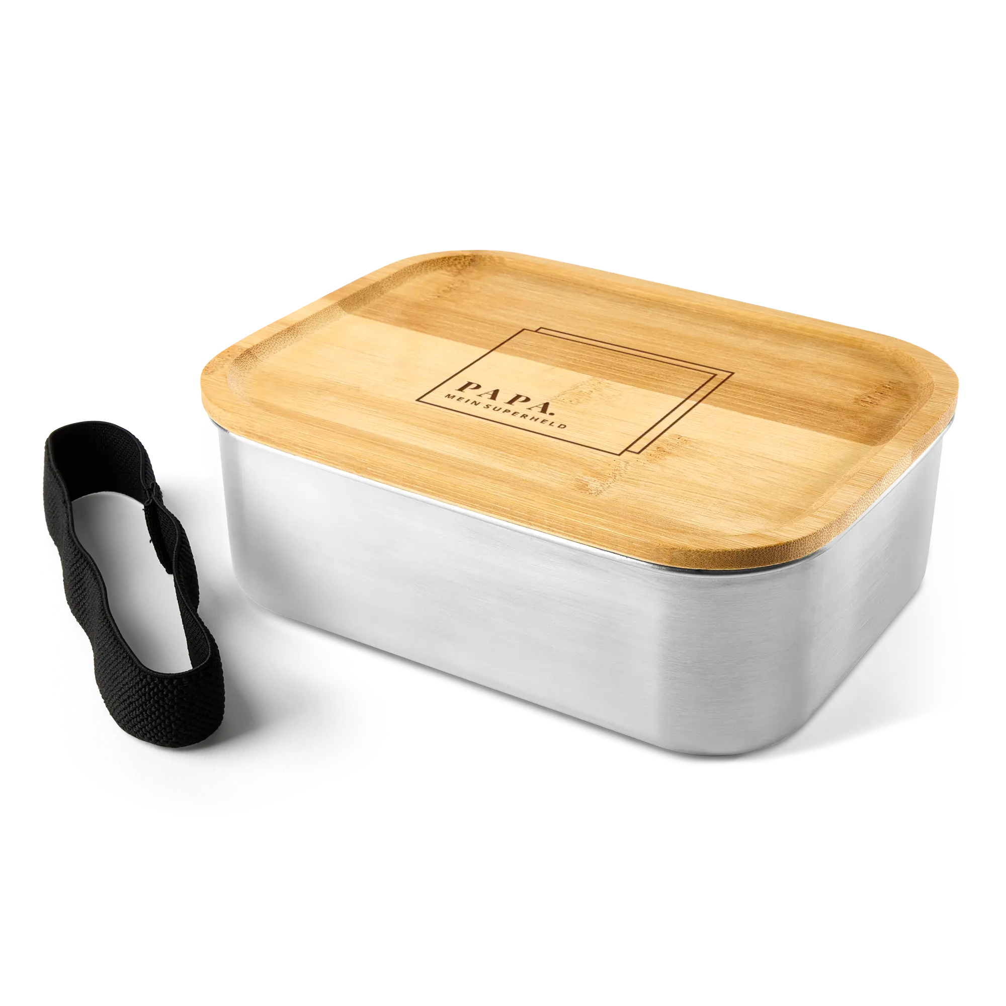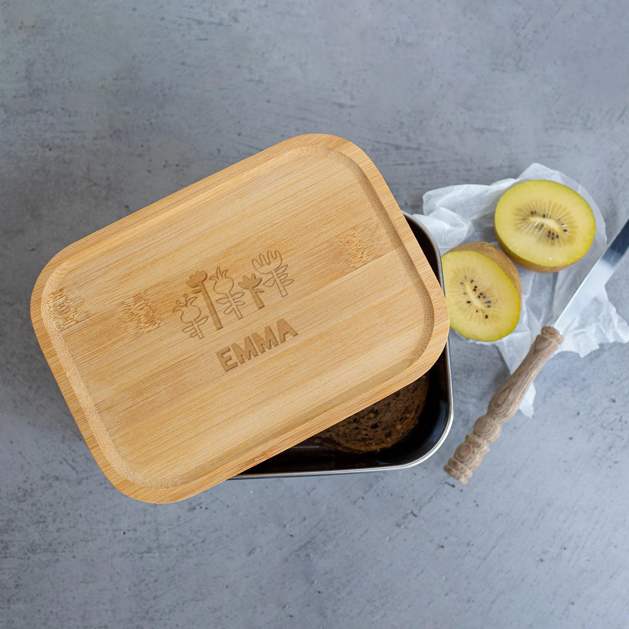 A personalised lunch box with name or text. Stainless steel with bamboo lid.More information on the lunch box:Lid material: bambooBox material: stainless steelDimensions: 19 x 14 x 6.5 cmPersonalisation: with name or textPersonalisation method: high-quality engravingEngraving colour: woodAdditional information: FSC-certified wood, hand-wash onlyPlease note that wood is a natural product, which means your gift may look different than shown in the preview images. For technical reasons, it is not possible to add Cyrillic, Asian, Arabic, Greek, Turkish or special characters.