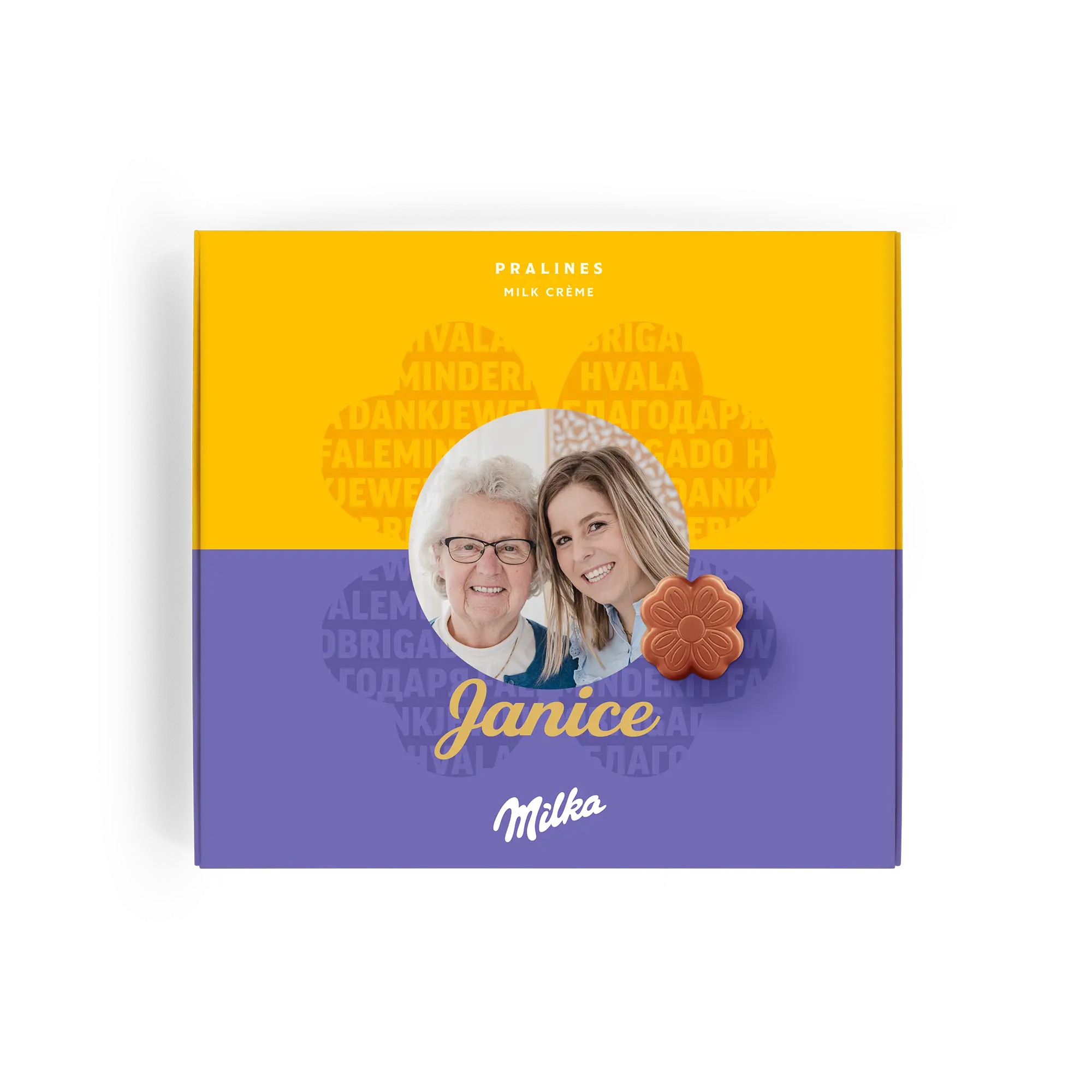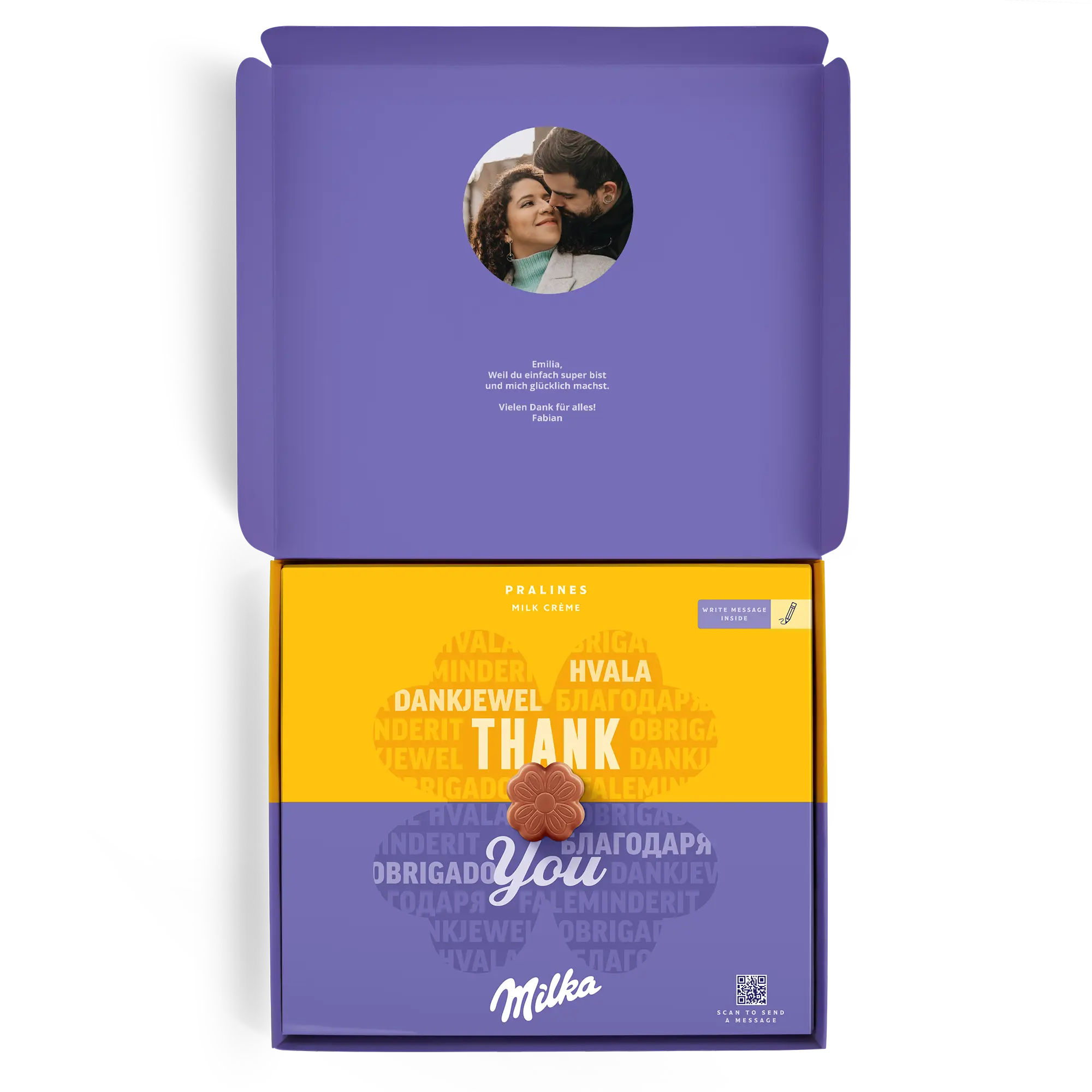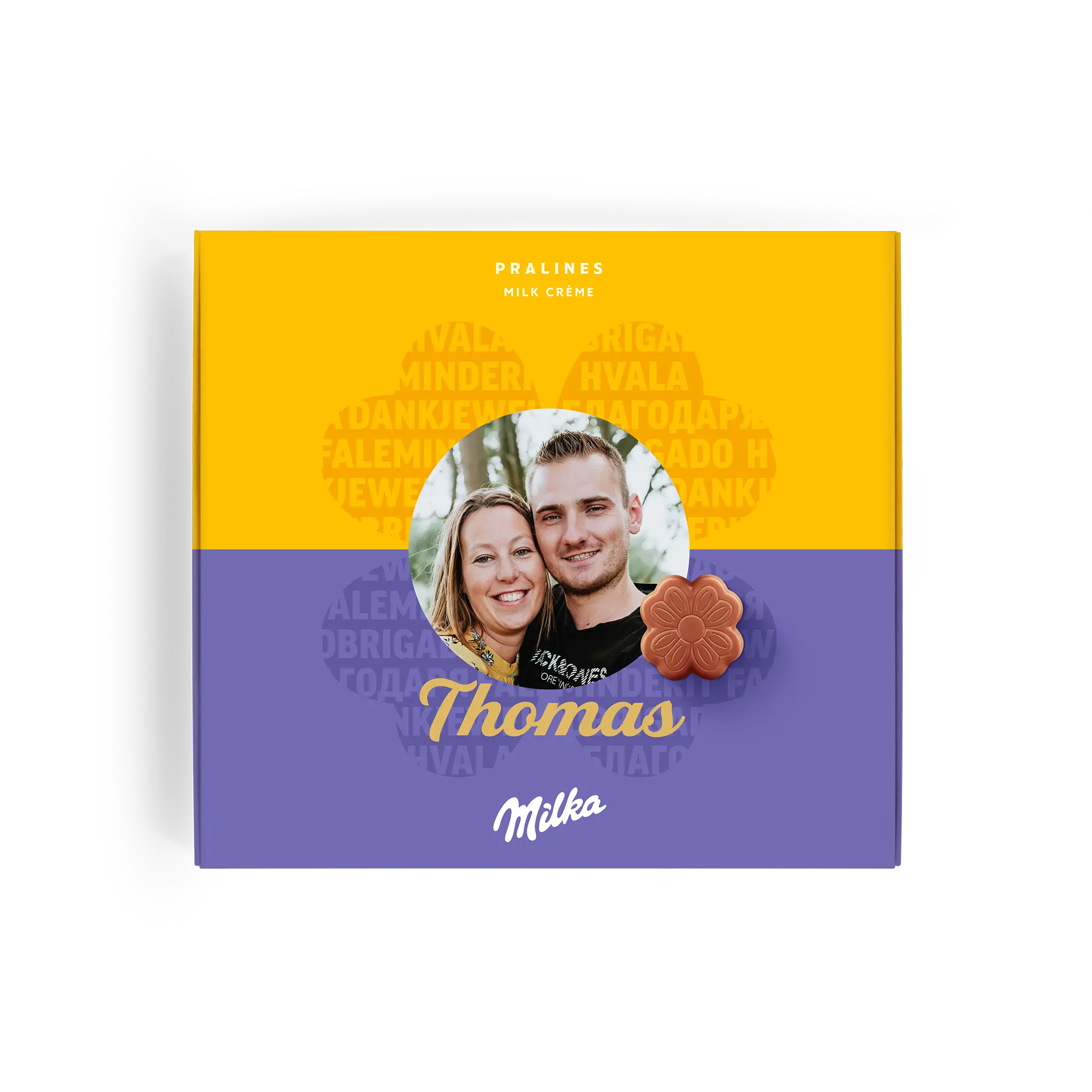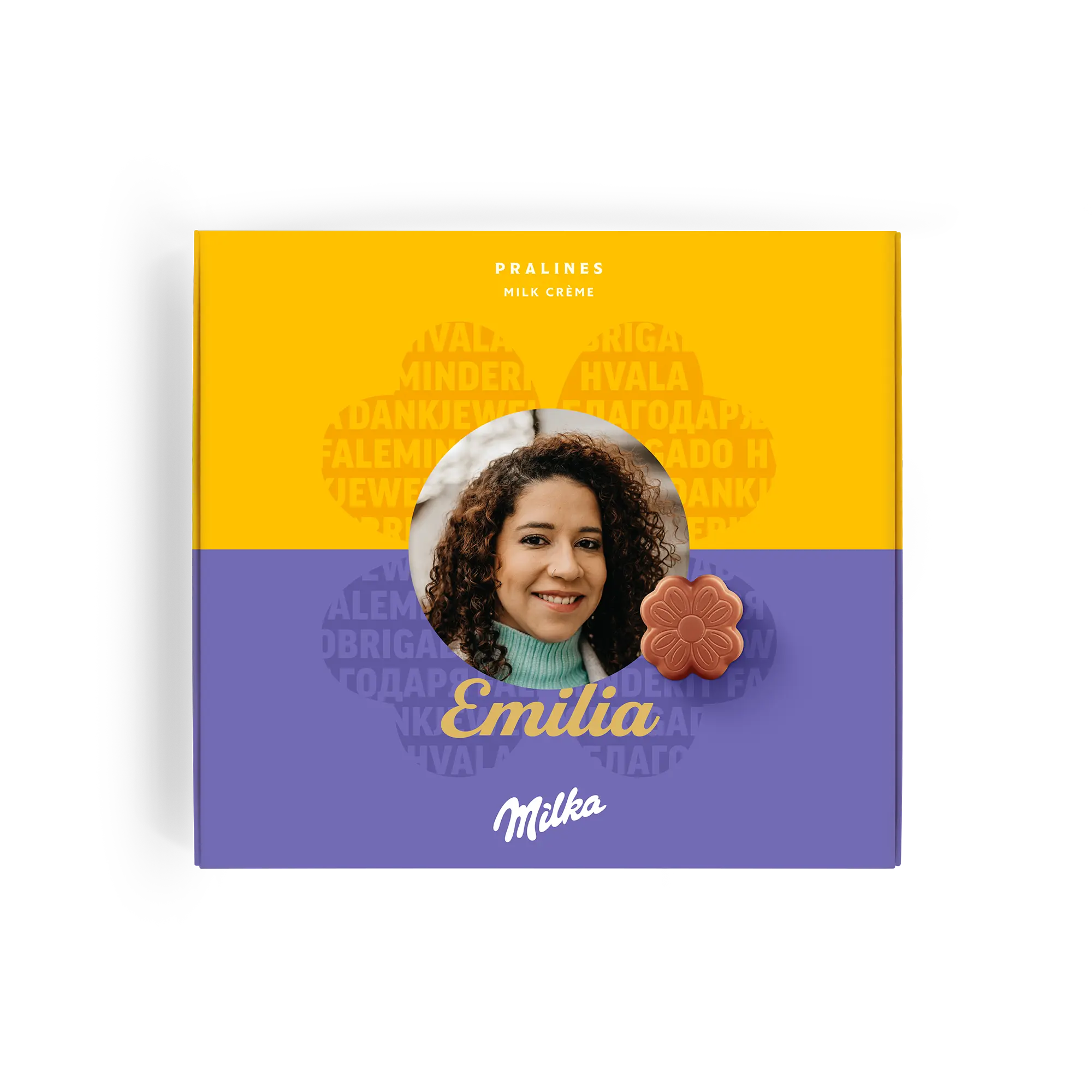 A personalised 'Say it with Milka' gift box makes the most delicious thank you. A personalised chocolate gift with name, photo and message.More information on the Milka thank you gift:Chocolate: Alpine milk chocolate with cream fillingPraline shape: flowersAmount of pralines: 20Weight: 110 gramsDimensions: 19.50 x 18 x 2 cmPersonalisation: photo, name and personal messagePrint: picture perfect and in full colourIngredients: Sugar, palm oil, cocoa butter, skimmed milk powder, whey (milk) powder, cocoa mass, milk fat, emulsifiers (soy lecithin, E476), hazelnut paste, flavourings. 7% skimmed milk powder in the milk cream filling.Allergens: Contains hazelnuts, milk and soy. May contain other nuts and gluten.Good to know:When the outside temperature is 25 degrees Celsius or above we will not be able to guarantee the quality of the chocolate. If you have any questions regarding your chocolate orders please contact our customer service team.For technical reasons, it is not possible to process Cyrillic, Turkish, Arabic, Asian or special characters.
